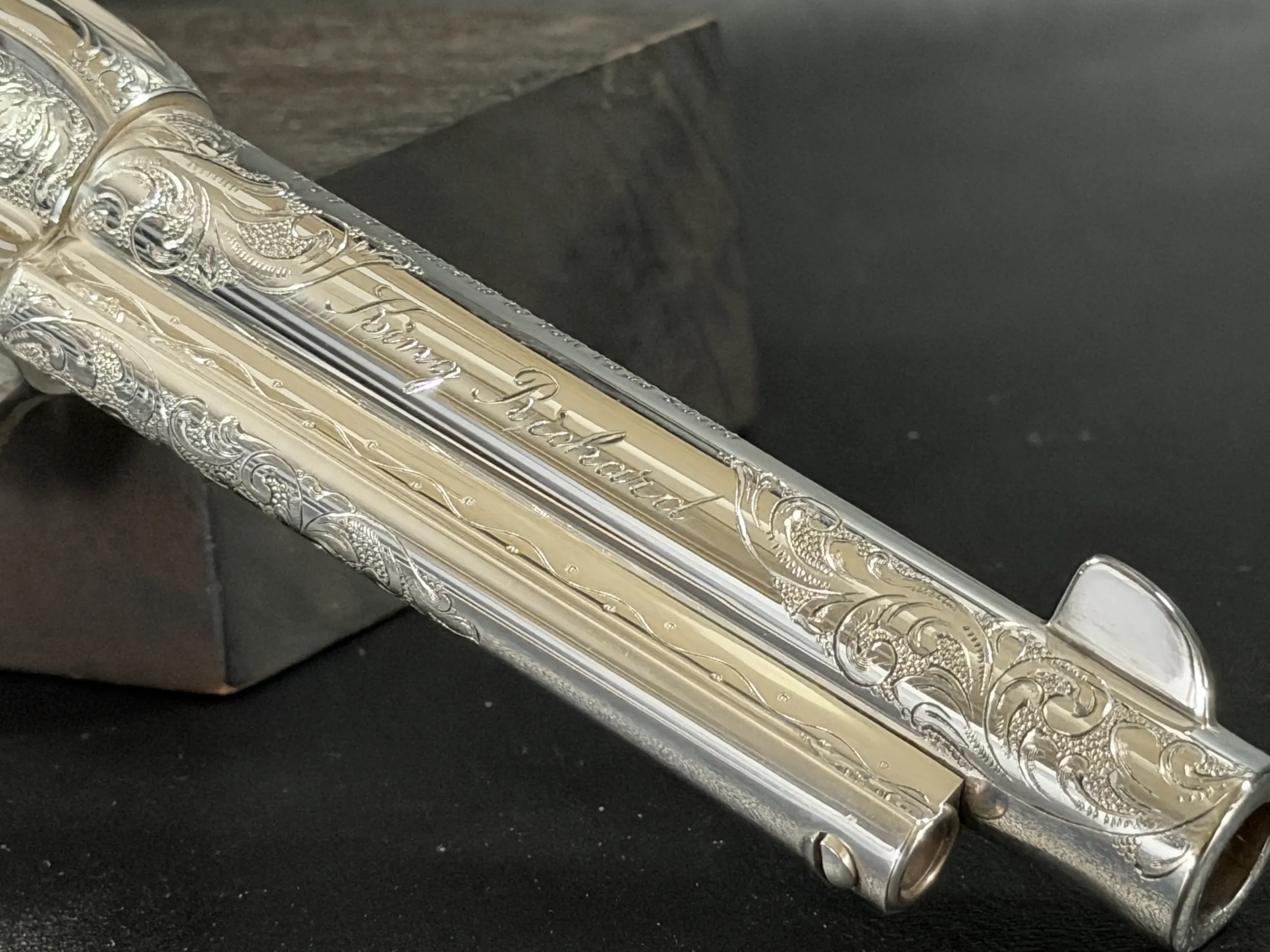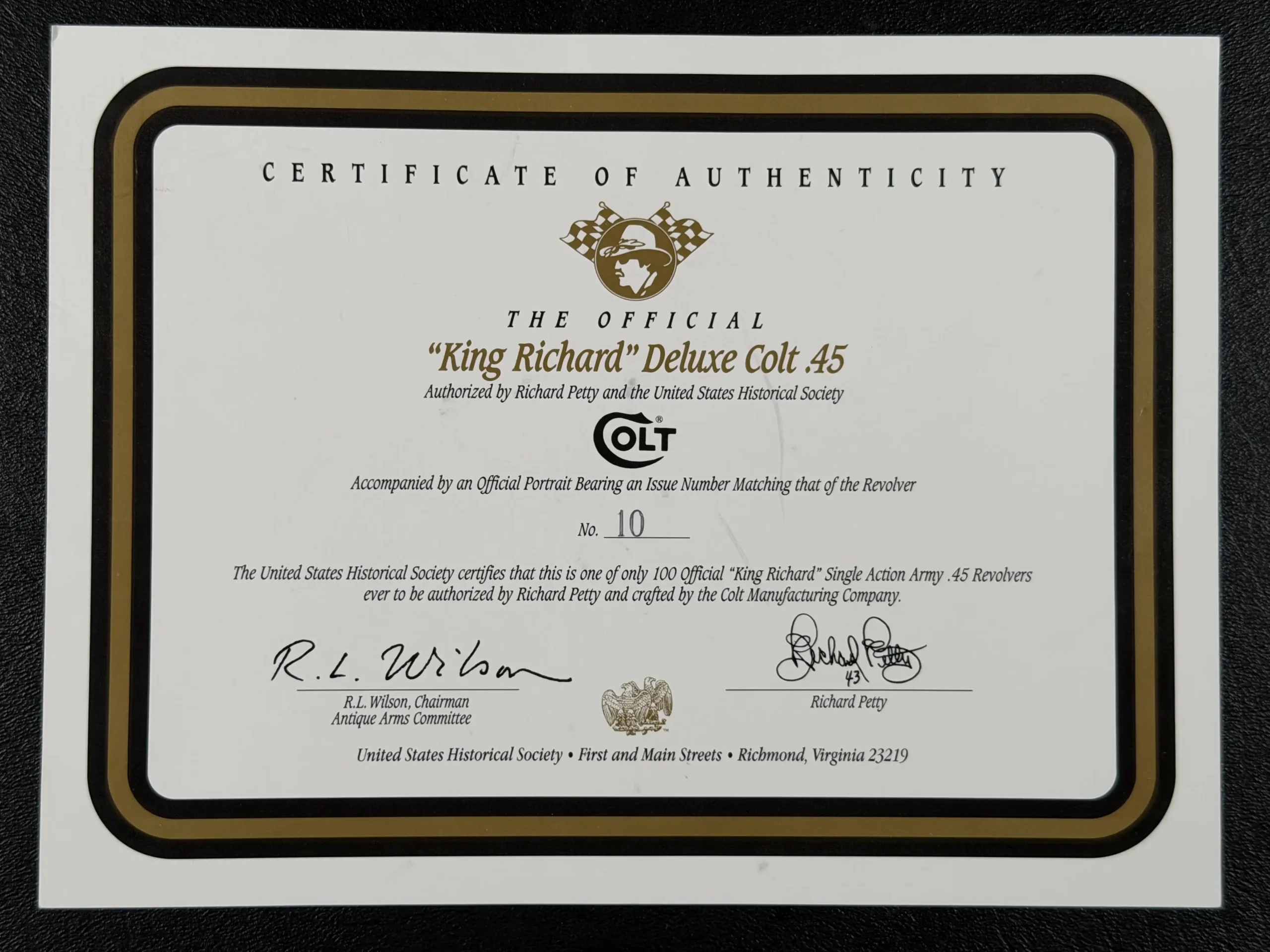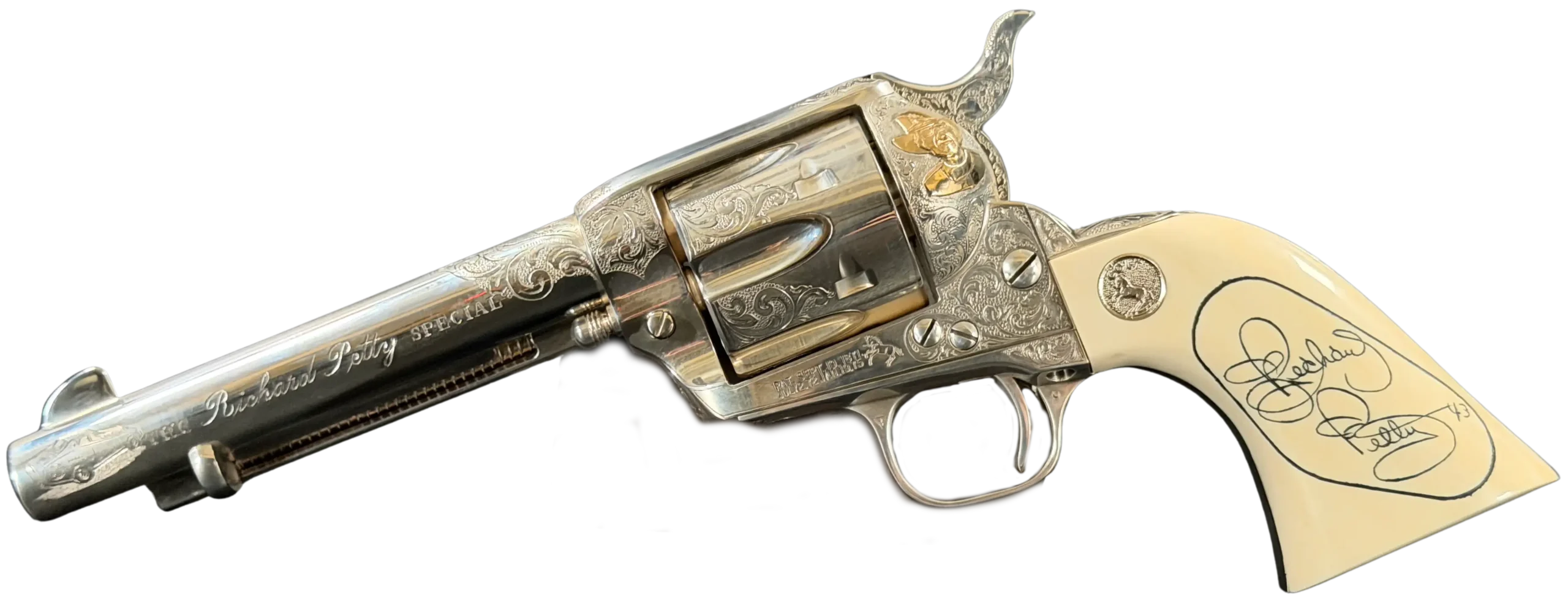 The Colt Single Action Army Richard Petty Edition is a commemorative revolver chambered in .45 Colt, bringing together the classic SAA profile with design elements inspired by Richard Petty. This example features a high-polish finish with factory engraving across the frame, cylinder, and barrel in a traditional scroll pattern.