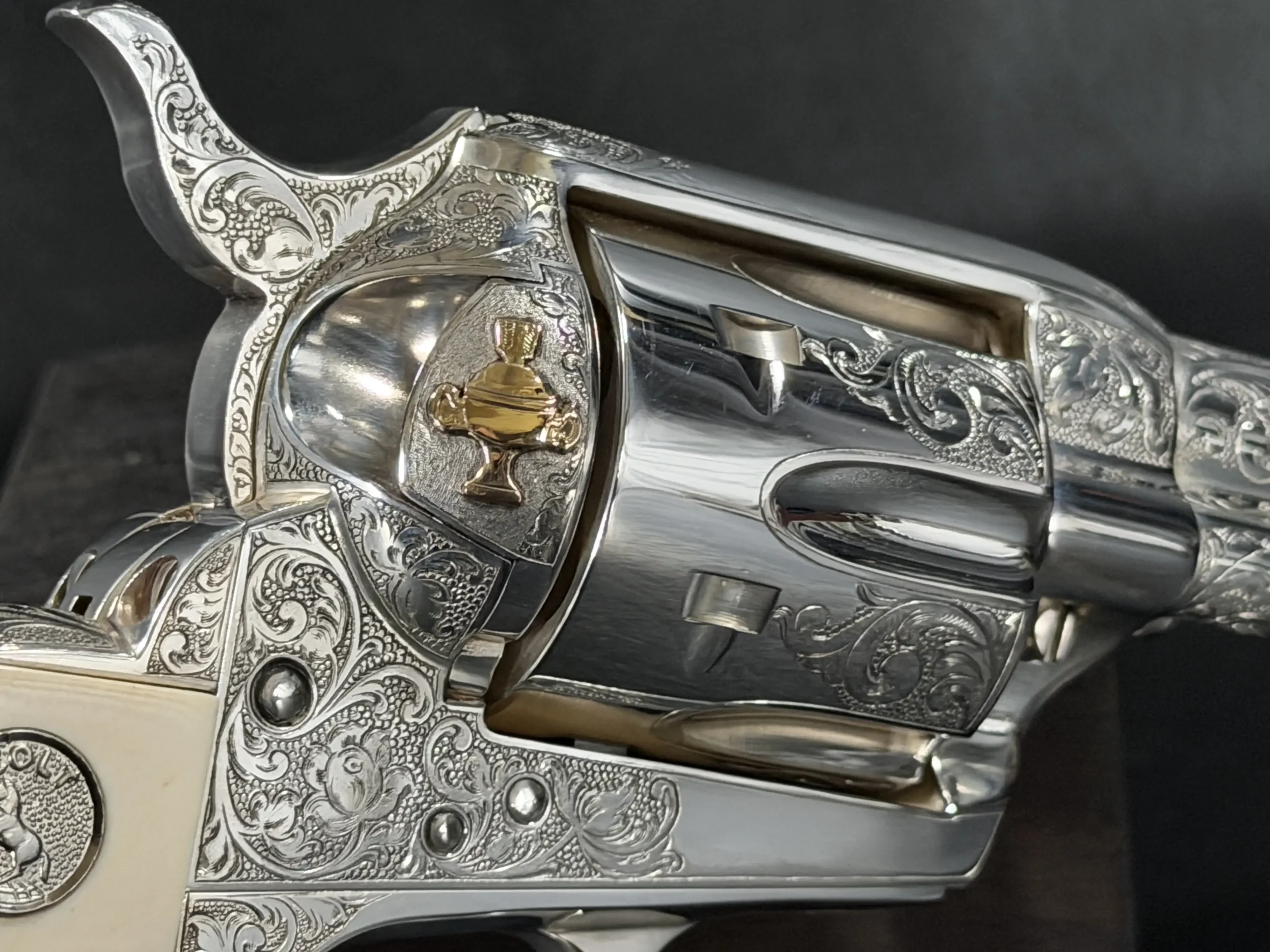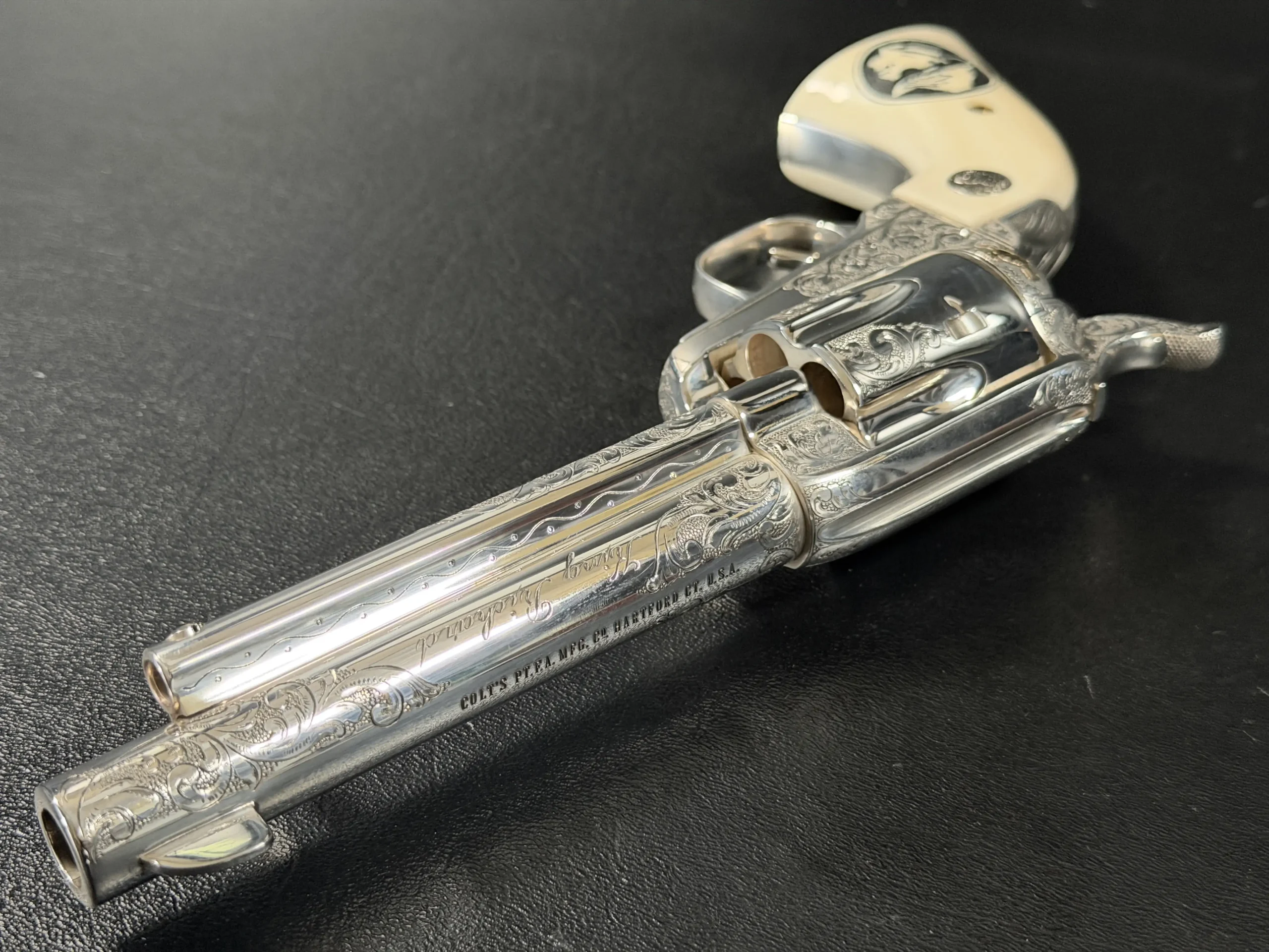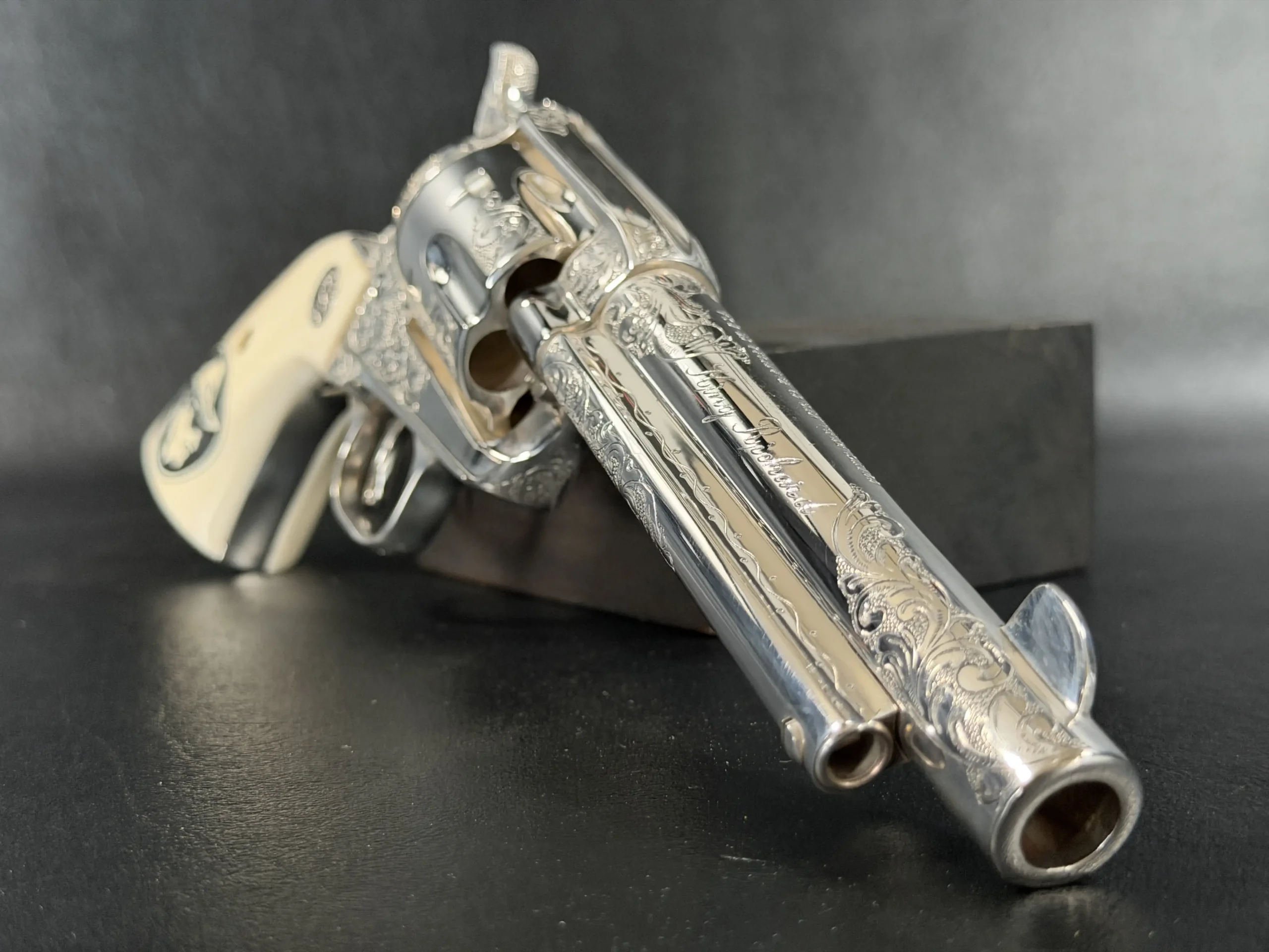 The Colt Single Action Army Richard Petty Edition is a commemorative revolver chambered in .45 Colt, bringing together the classic SAA profile with design elements inspired by Richard Petty. This example features a high-polish finish with factory engraving across the frame, cylinder, and barrel in a traditional scroll pattern.