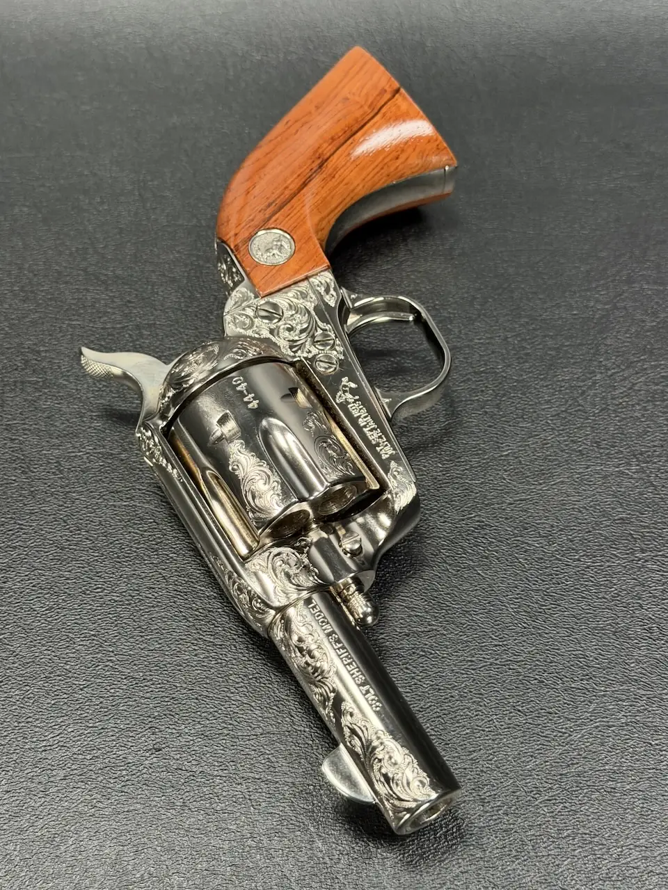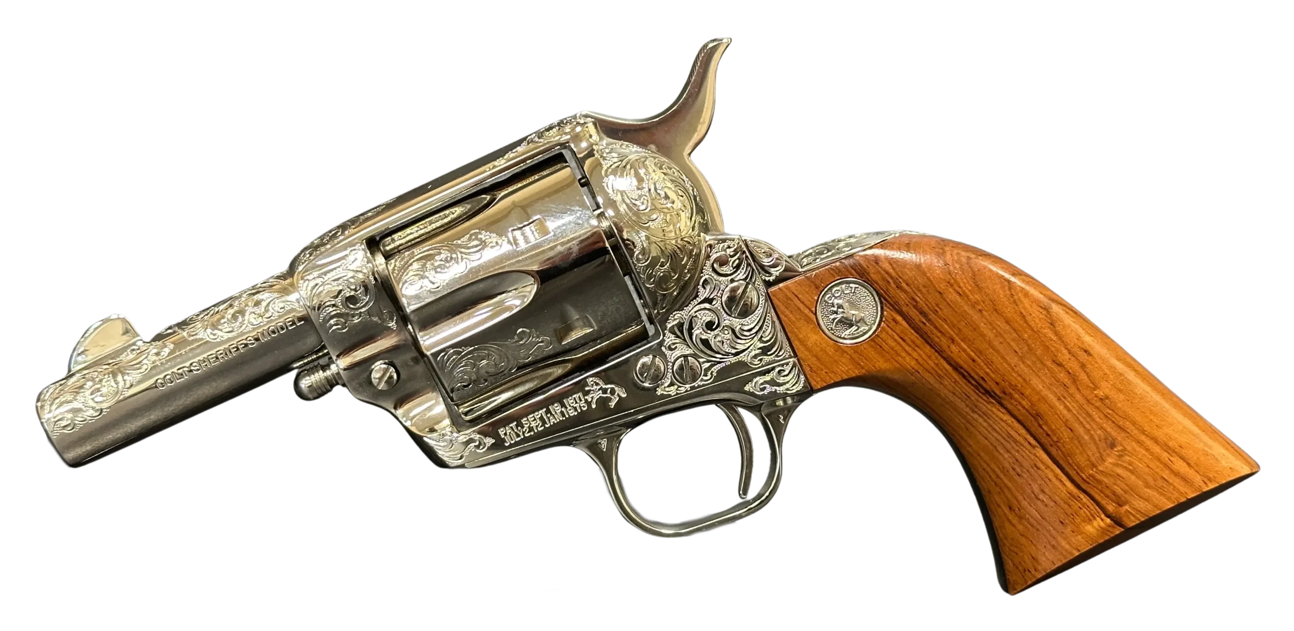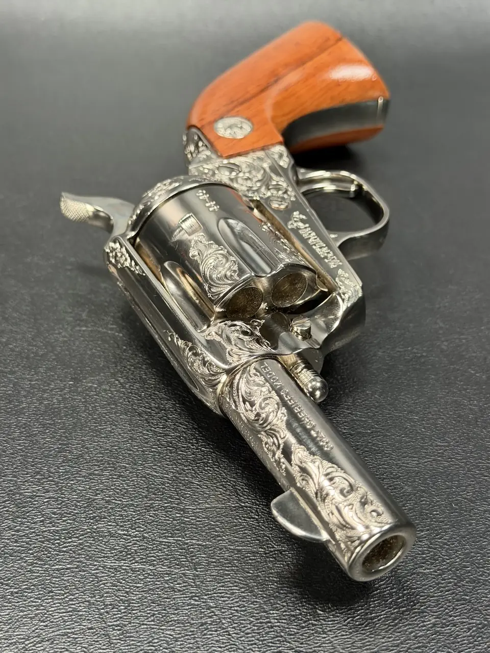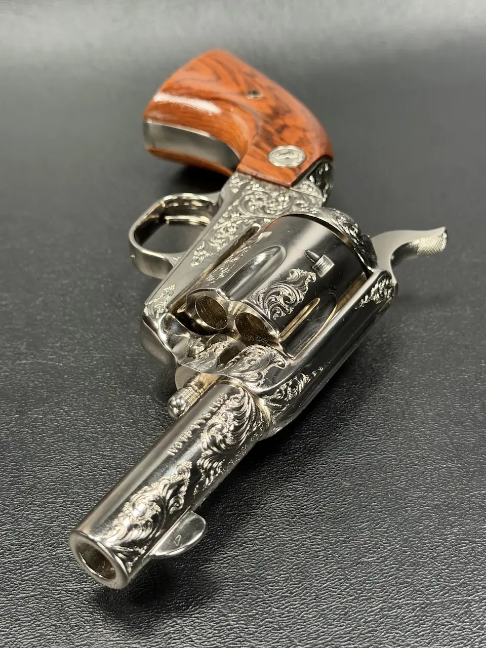 The factory engraving is executed with balance and restraint, complementing the revolver’s lines without overpowering the Sheriff’s Model form. Its shortened barrel and ejector-less configuration give it the distinctive silhouette associated with this variation, while smooth rosewood stocks add warm contrast to the bright metal finish.