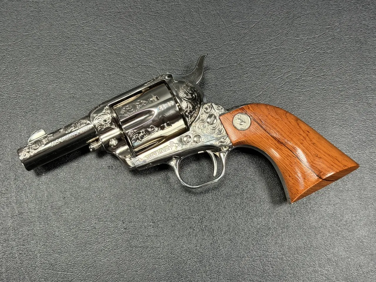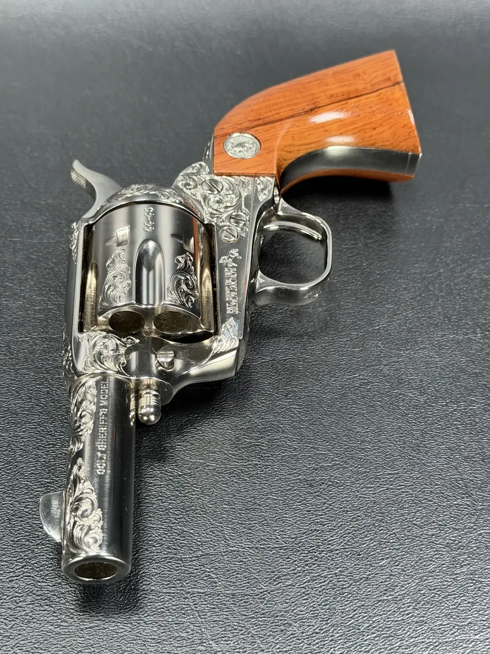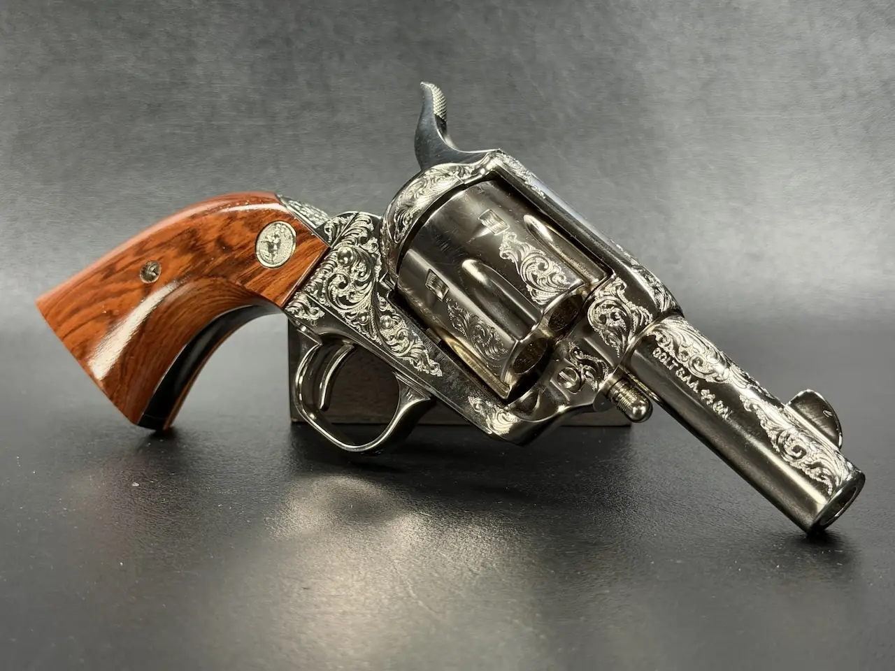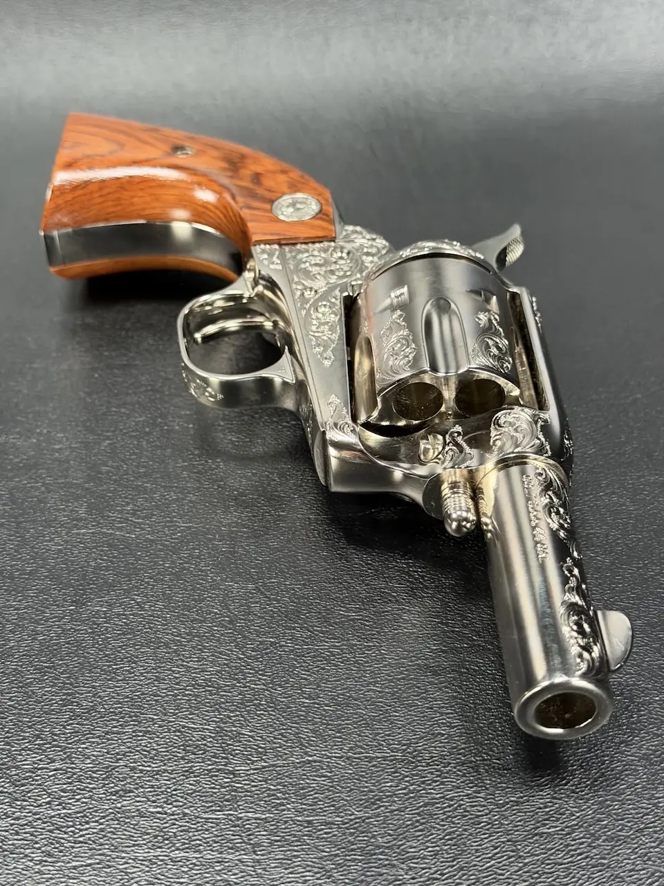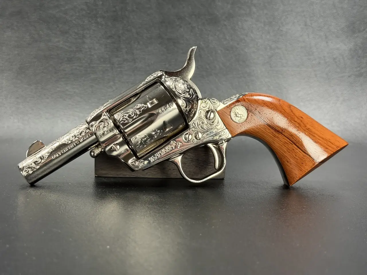 The factory engraving is executed with balance and restraint, complementing the revolver’s lines without overpowering the Sheriff’s Model form. Its shortened barrel and ejector-less configuration give it the distinctive silhouette associated with this variation, while smooth rosewood stocks add warm contrast to the bright metal finish.