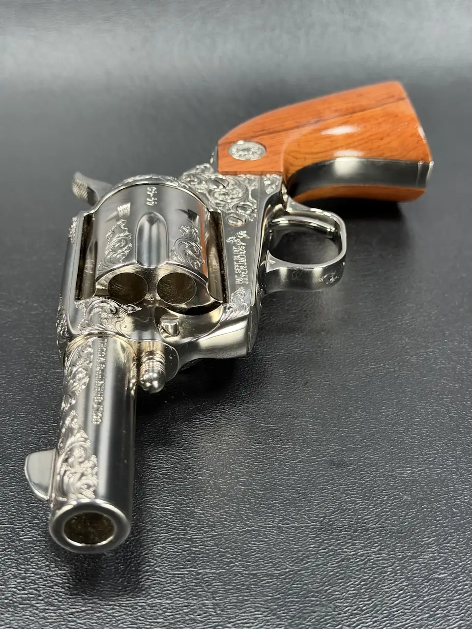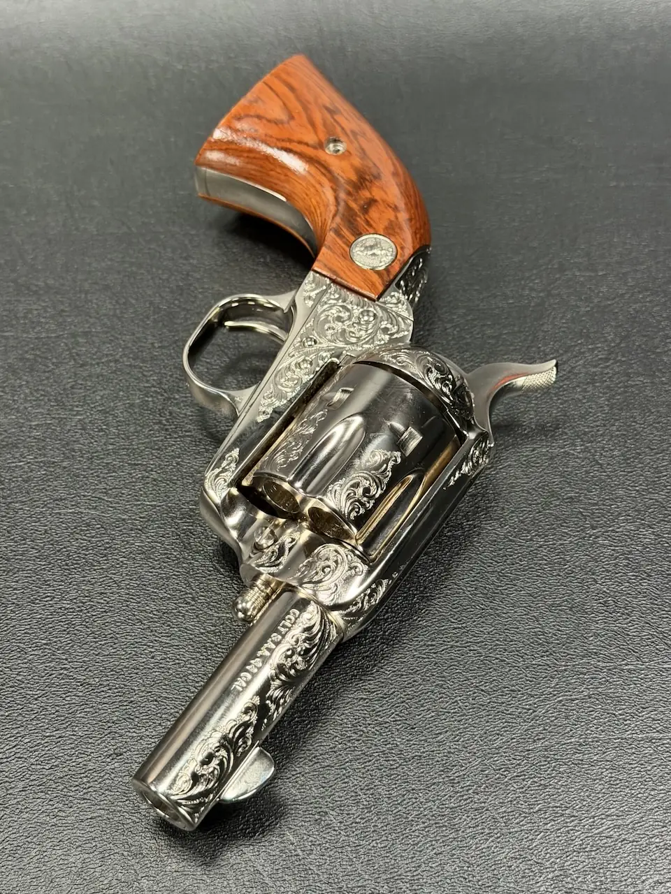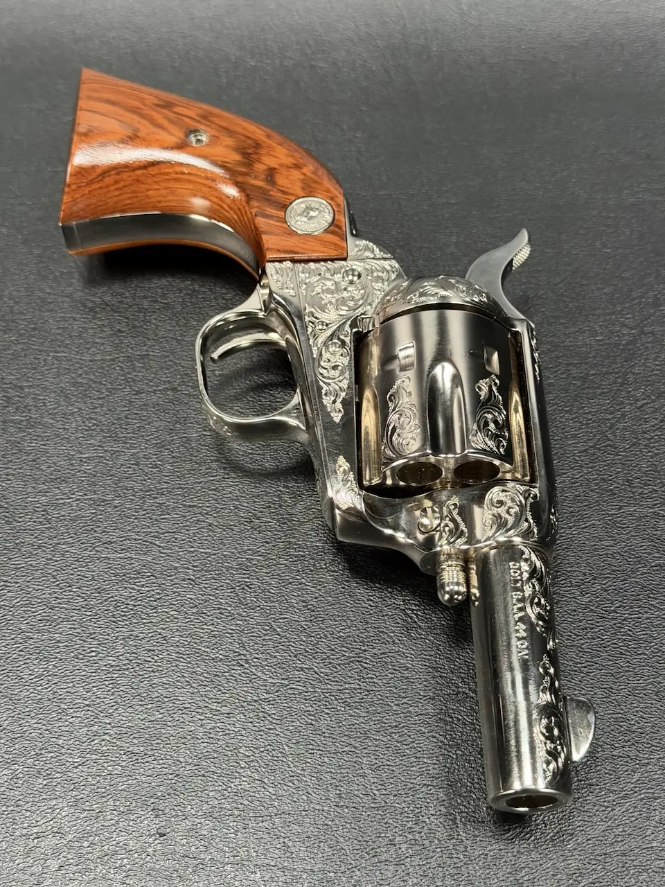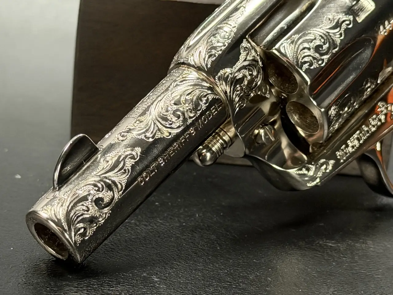 The factory engraving is executed with balance and restraint, complementing the revolver’s lines without overpowering the Sheriff’s Model form. Its shortened barrel and ejector-less configuration give it the distinctive silhouette associated with this variation, while smooth rosewood stocks add warm contrast to the bright metal finish.