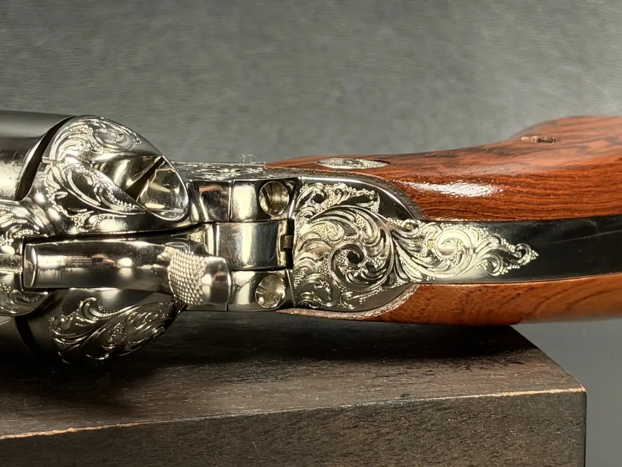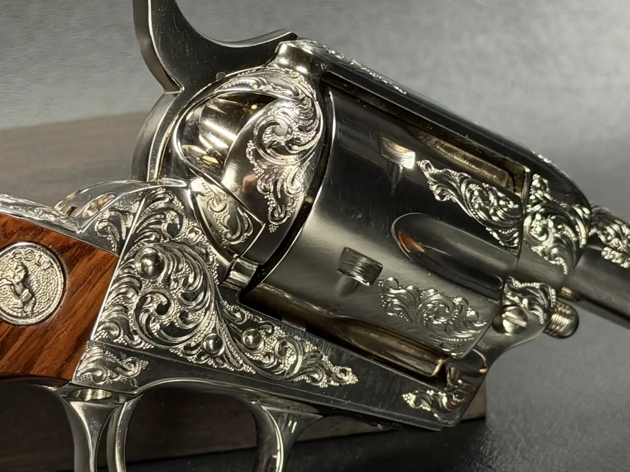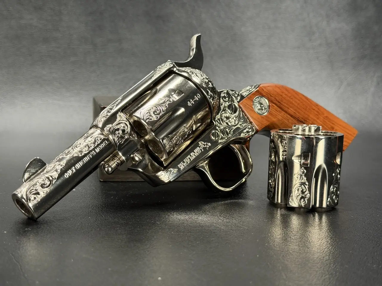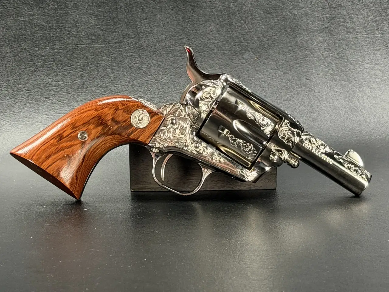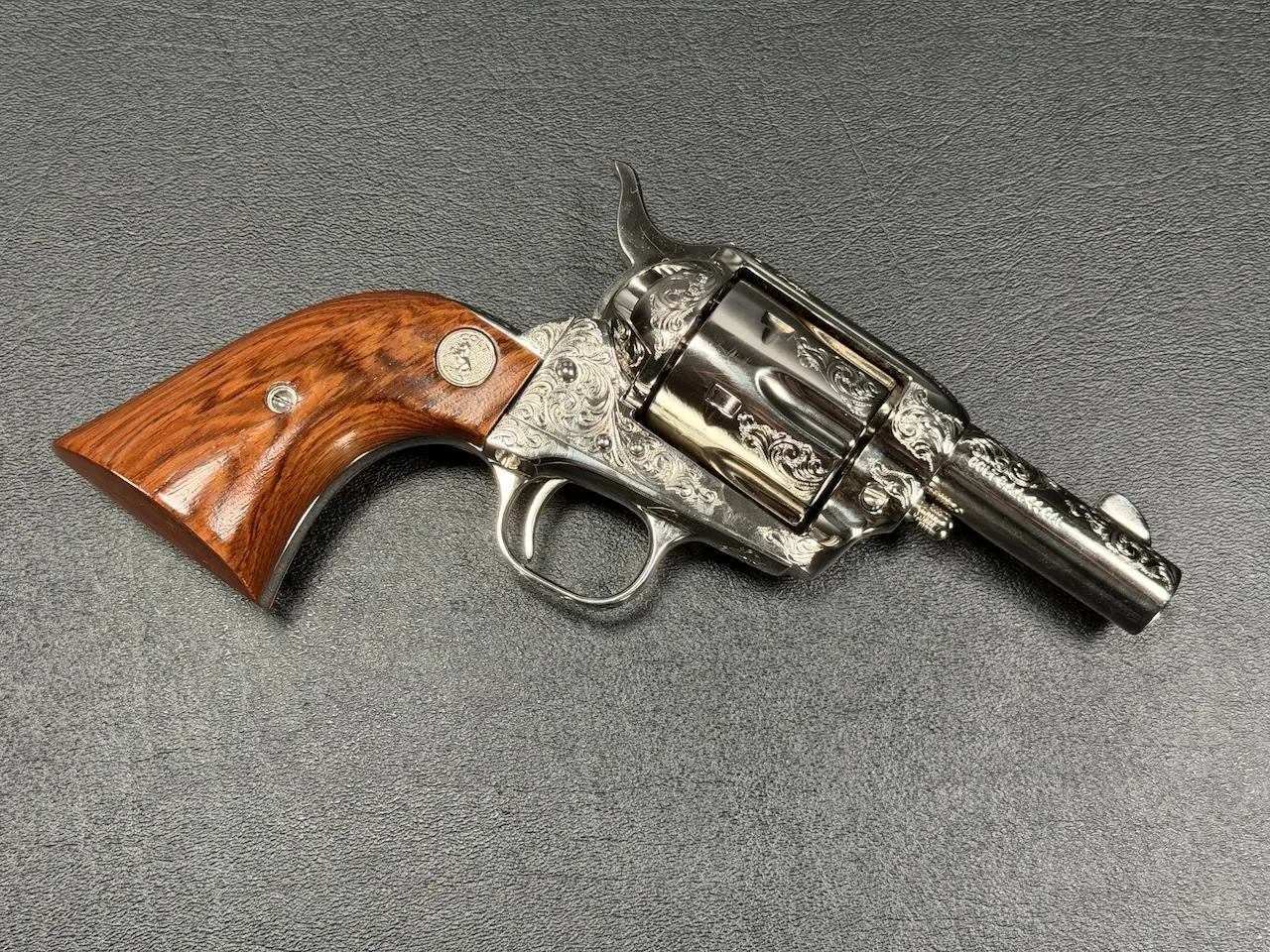 The factory engraving is executed with balance and restraint, complementing the revolver’s lines without overpowering the Sheriff’s Model form. Its shortened barrel and ejector-less configuration give it the distinctive silhouette associated with this variation, while smooth rosewood stocks add warm contrast to the bright metal finish.