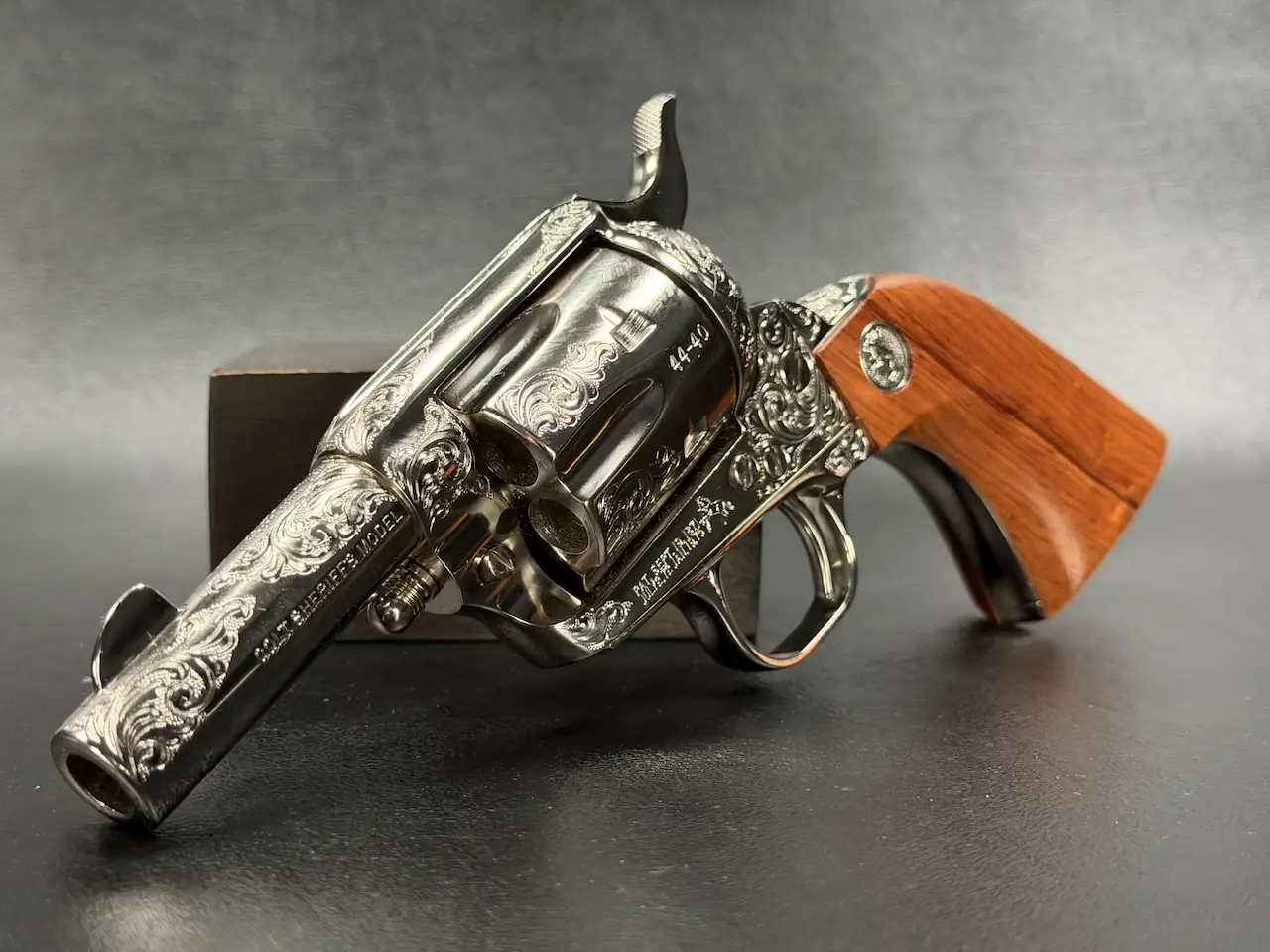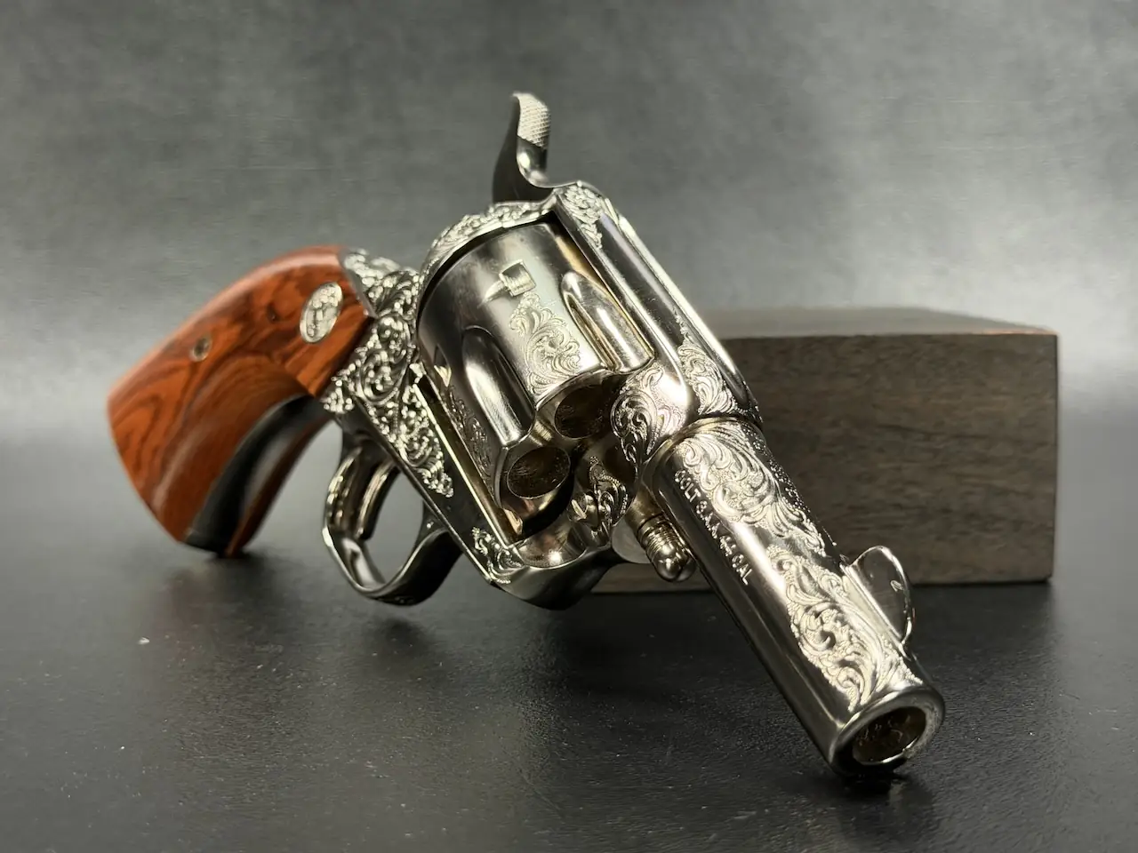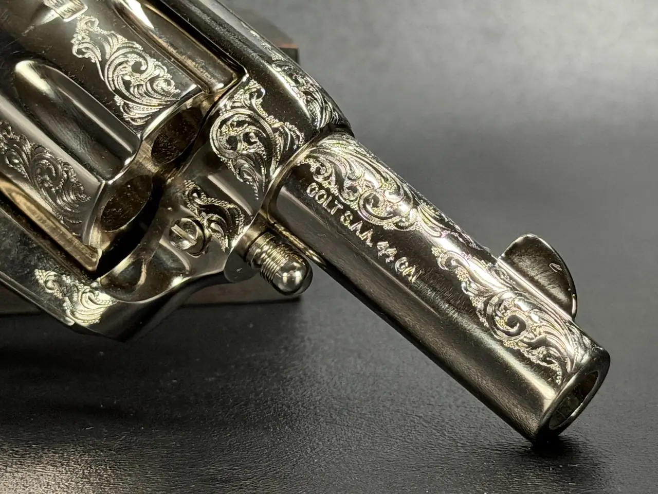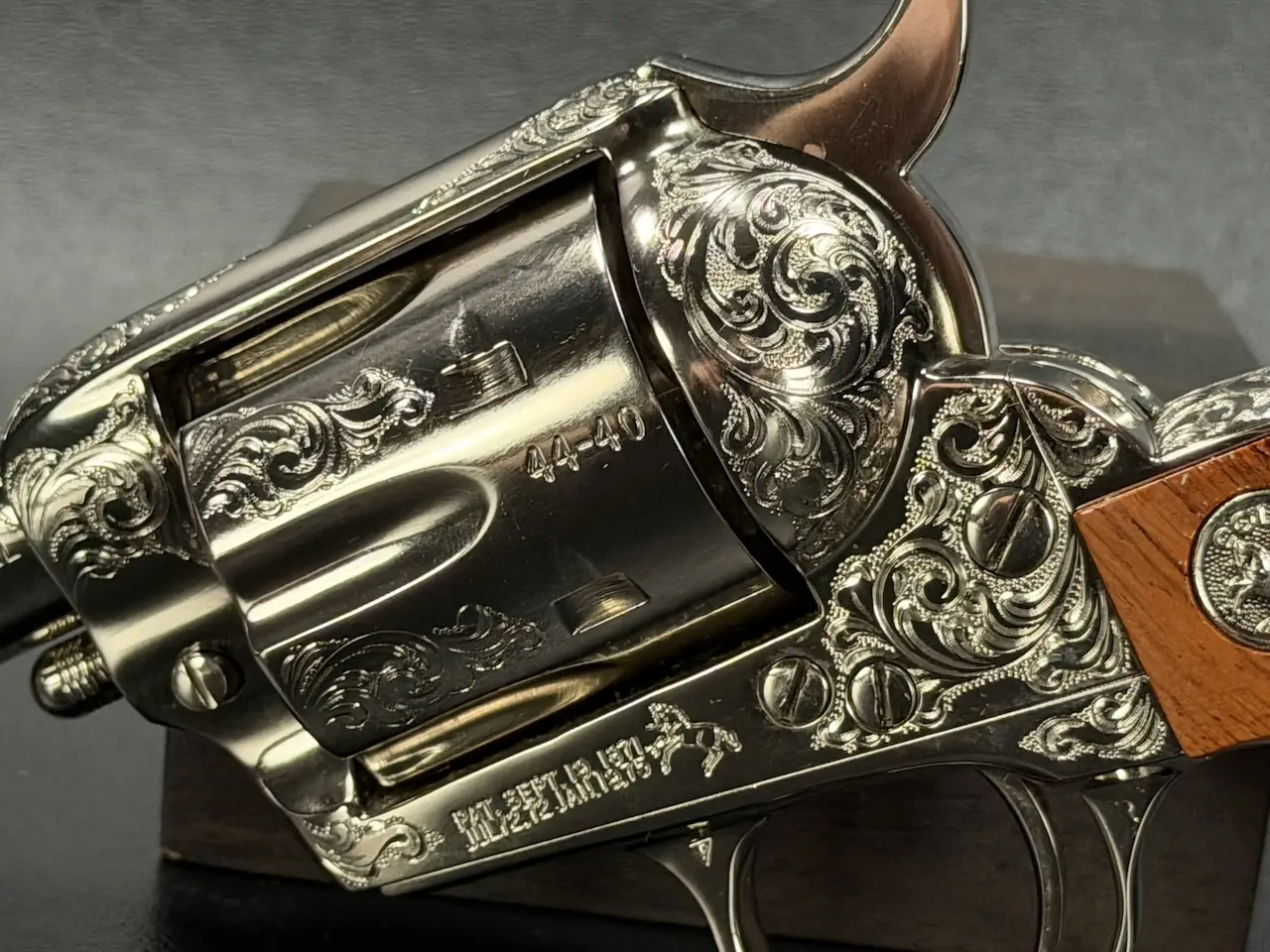 The factory engraving is executed with balance and restraint, complementing the revolver’s lines without overpowering the Sheriff’s Model form. Its shortened barrel and ejector-less configuration give it the distinctive silhouette associated with this variation, while smooth rosewood stocks add warm contrast to the bright metal finish.