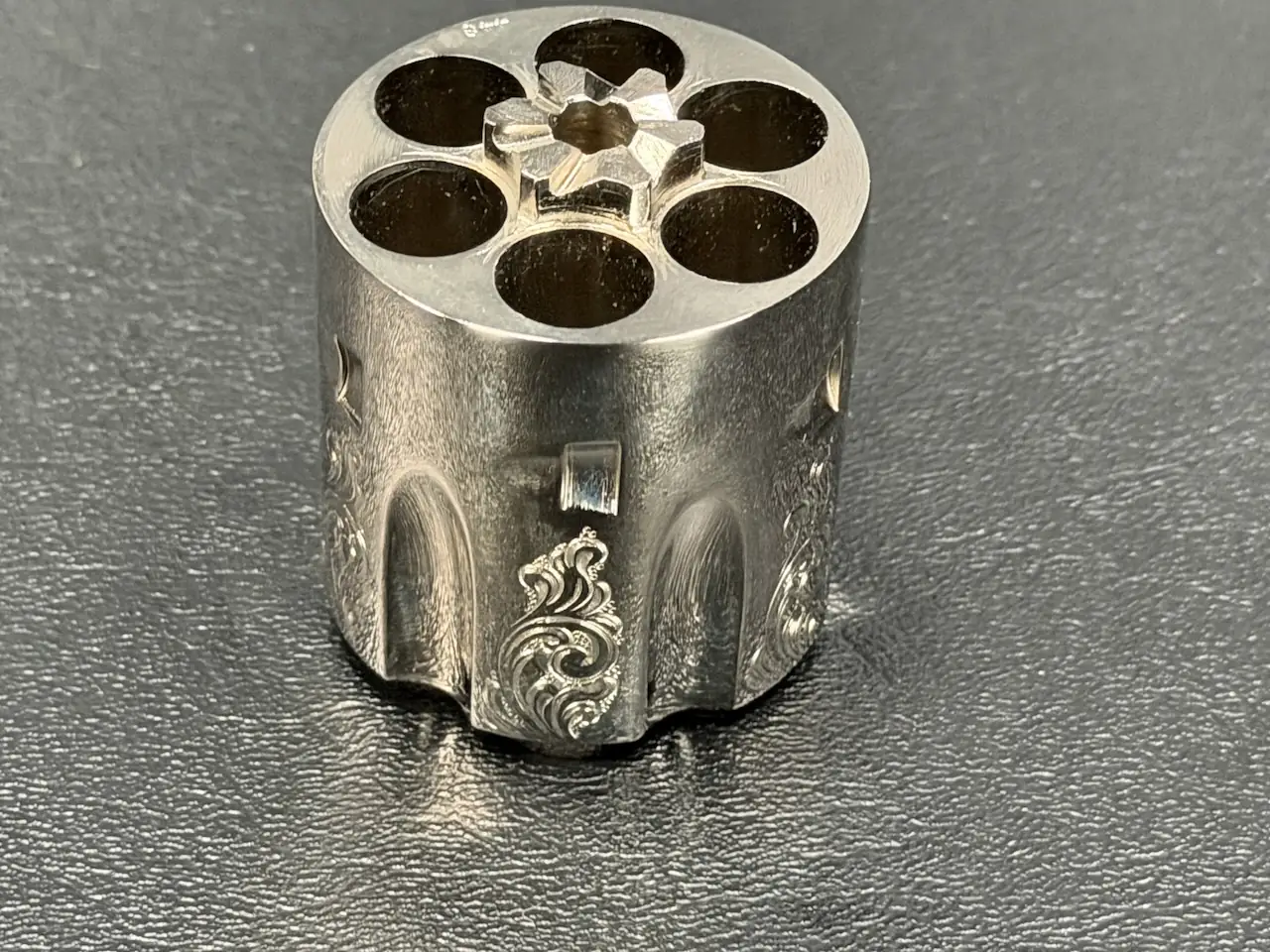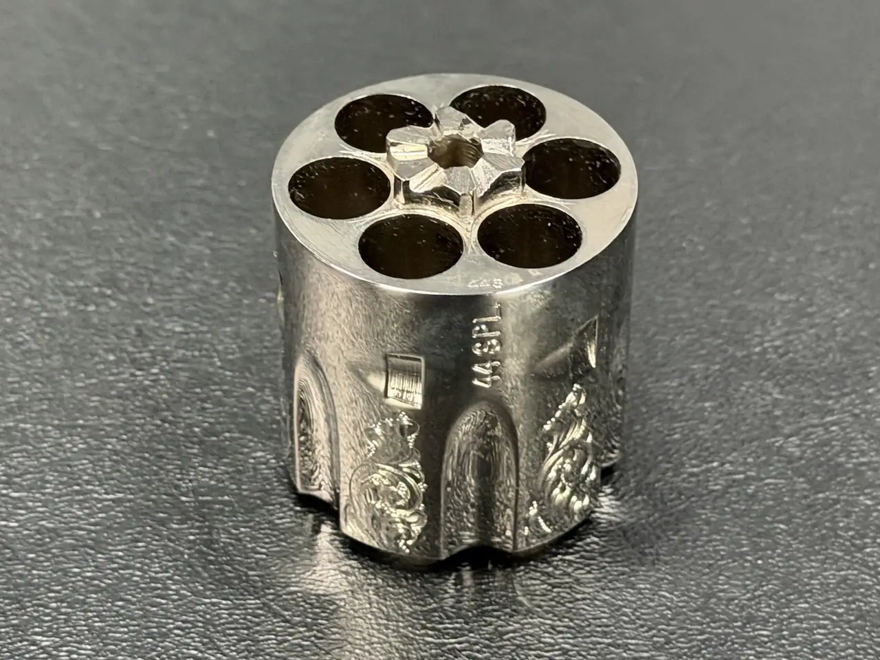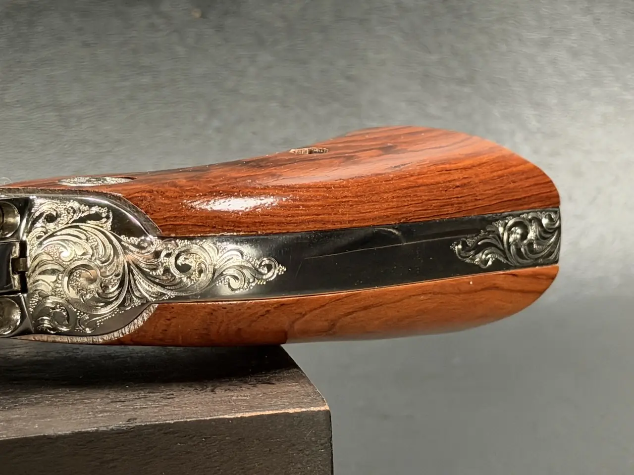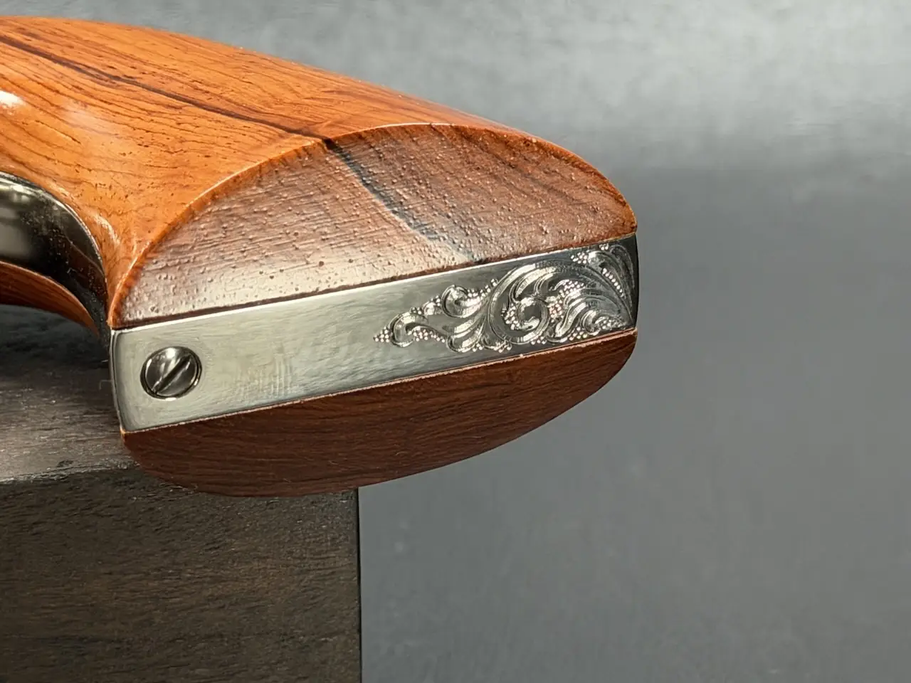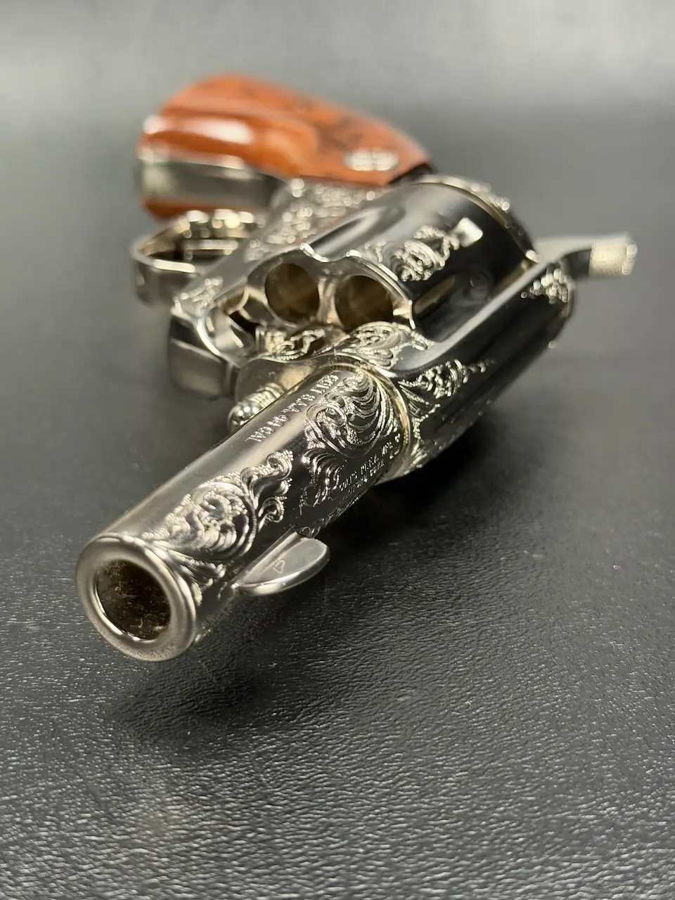 The factory engraving is executed with balance and restraint, complementing the revolver’s lines without overpowering the Sheriff’s Model form. Its shortened barrel and ejector-less configuration give it the distinctive silhouette associated with this variation, while smooth rosewood stocks add warm contrast to the bright metal finish.