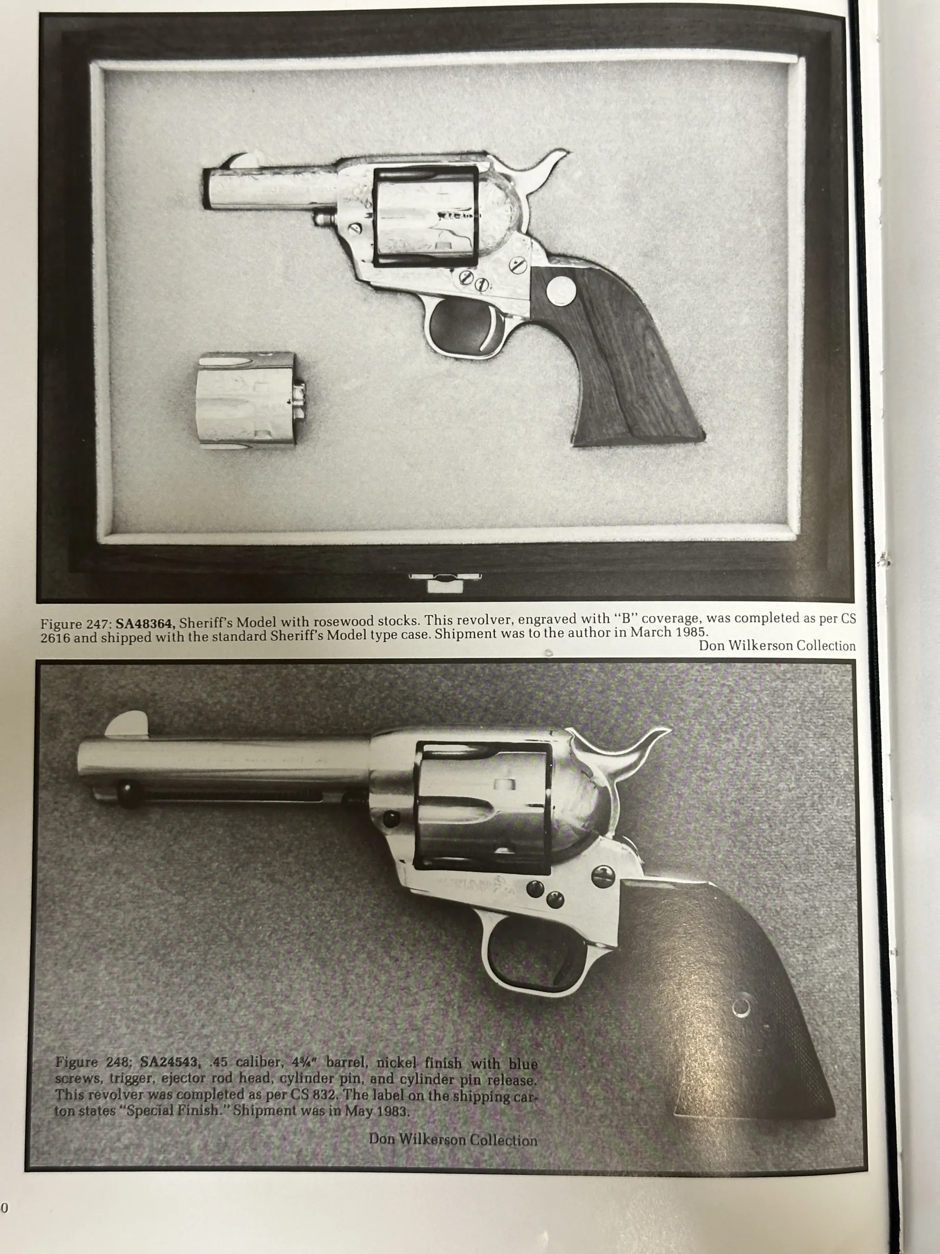 Colt Single Action Army Sheriff’s Model in .45 Colt with nickel finish, factory engraving, smooth rosewood stocks, and a matching auxiliary cylinder. Also associated with Don Wilkerson, this is a well-presented factory set with strong Colt Custom Shop character.