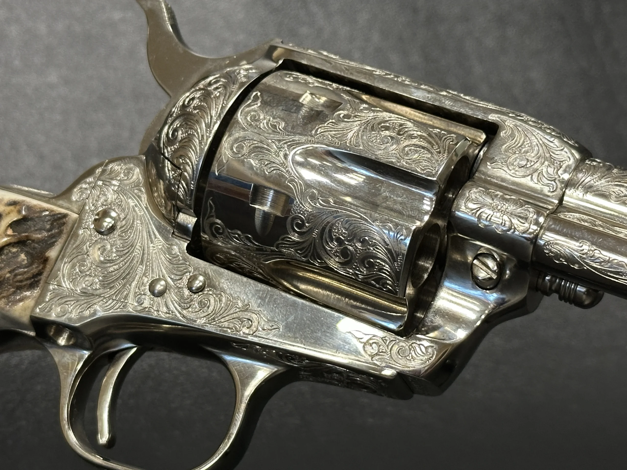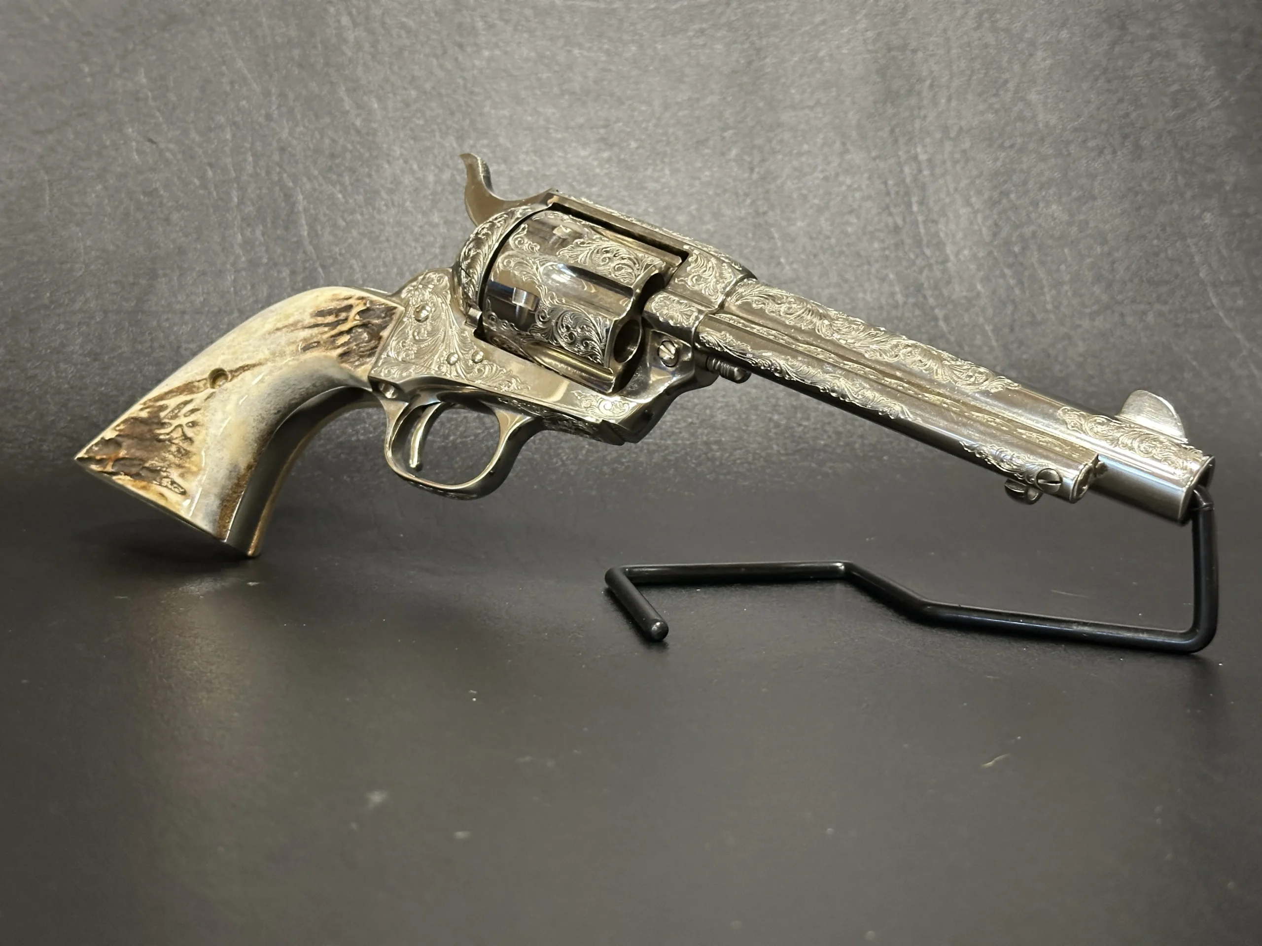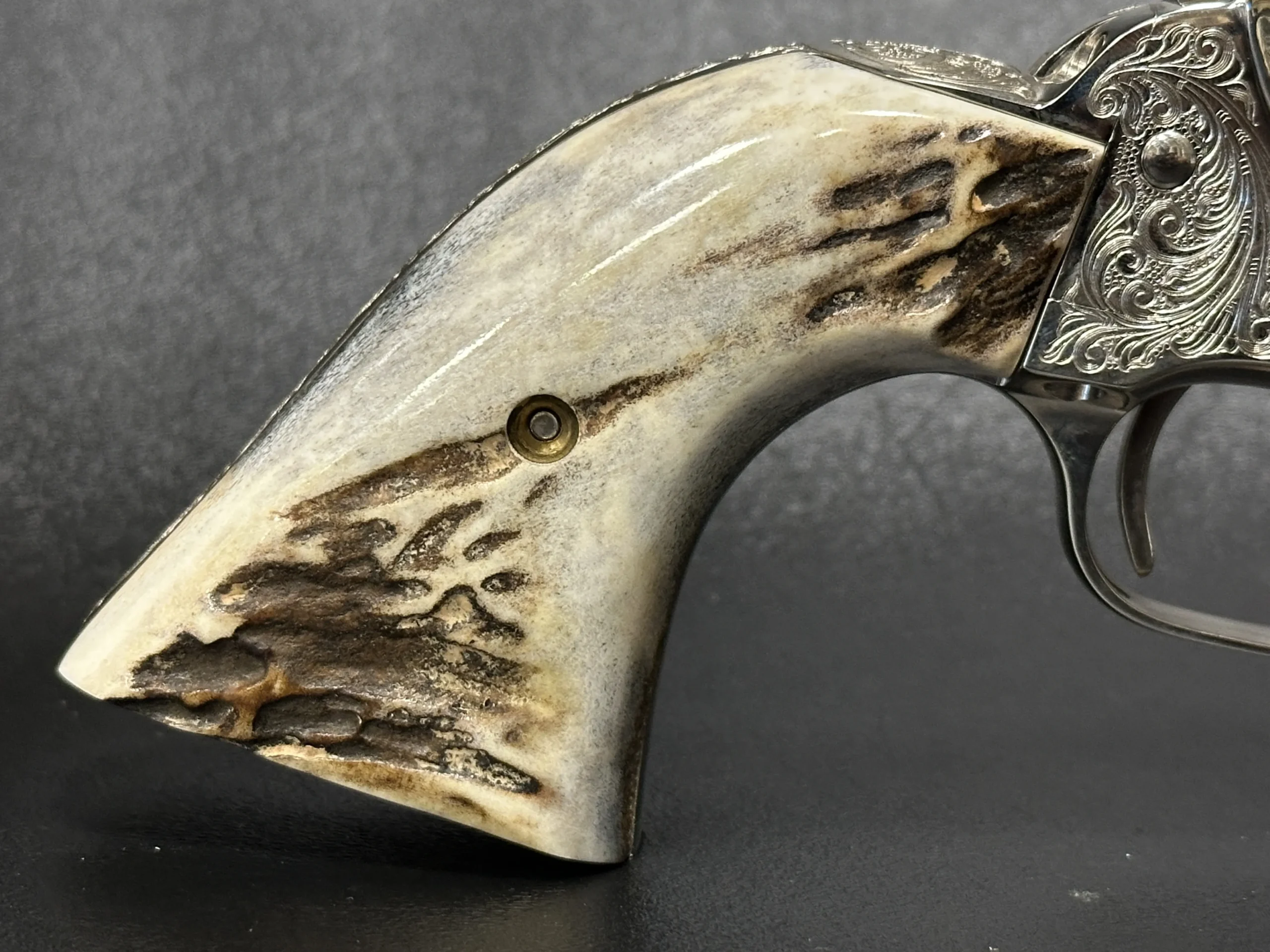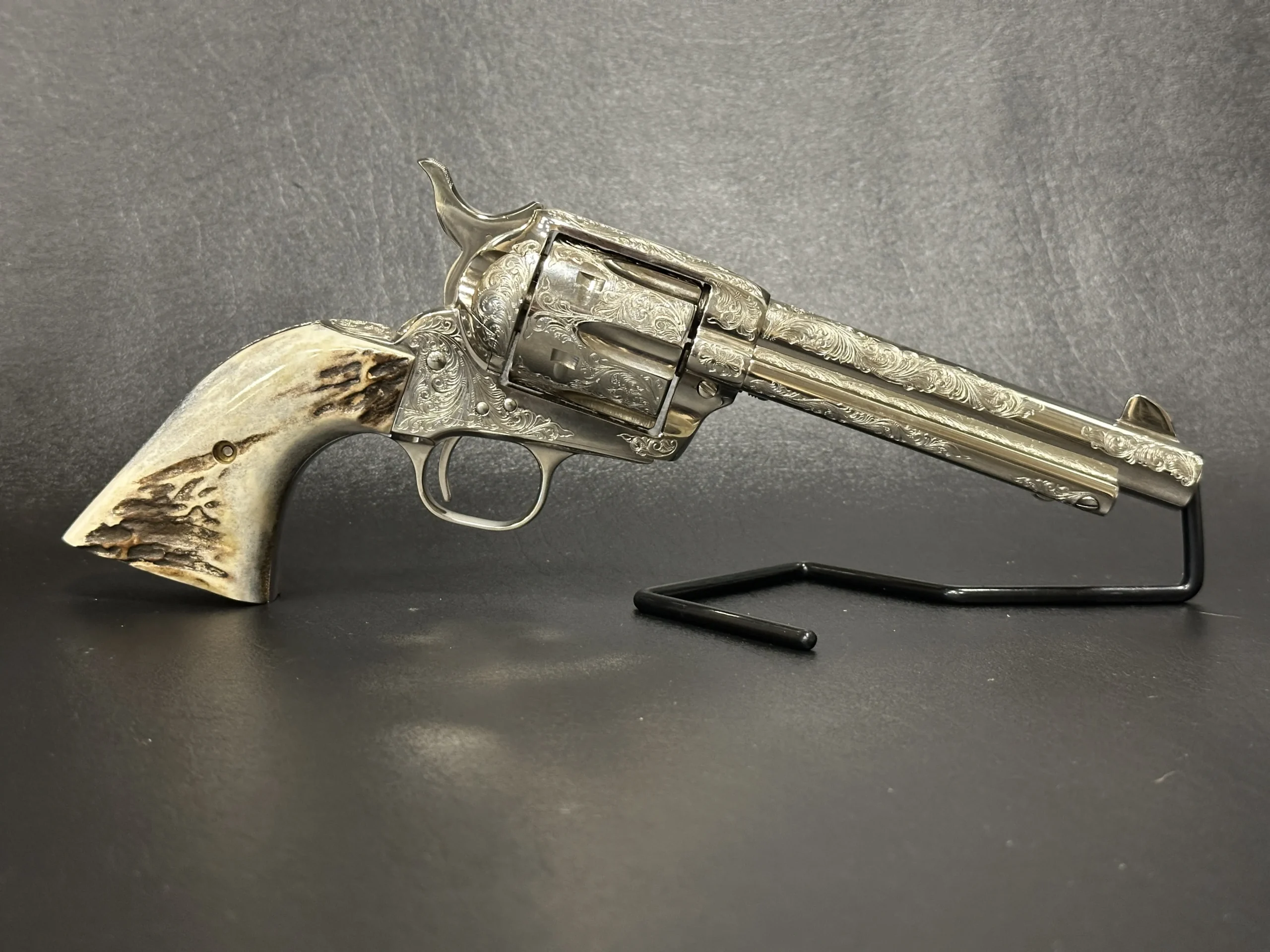 Fitted with genuine stag grips, this revolver pairs natural texture and character with the polished look of the nickel surface. The 5.5-inch barrel offers a balanced profile that presents well in hand and on display.