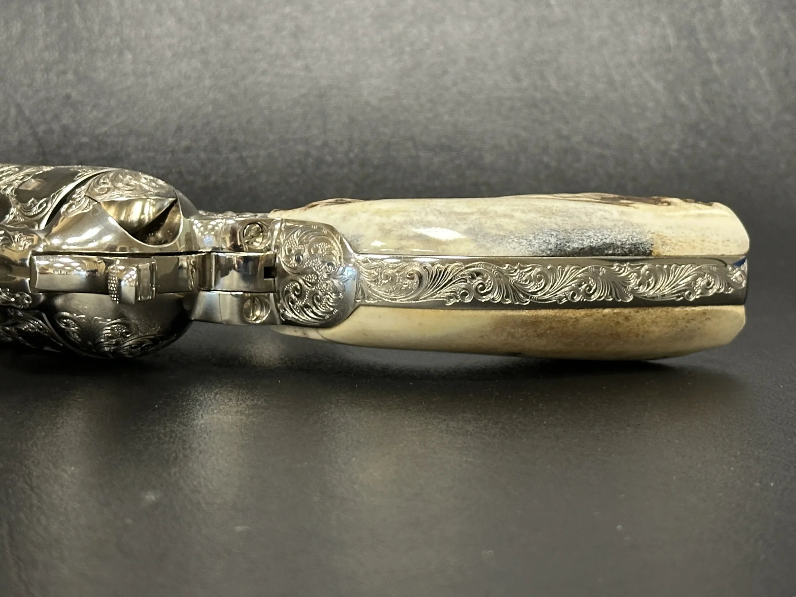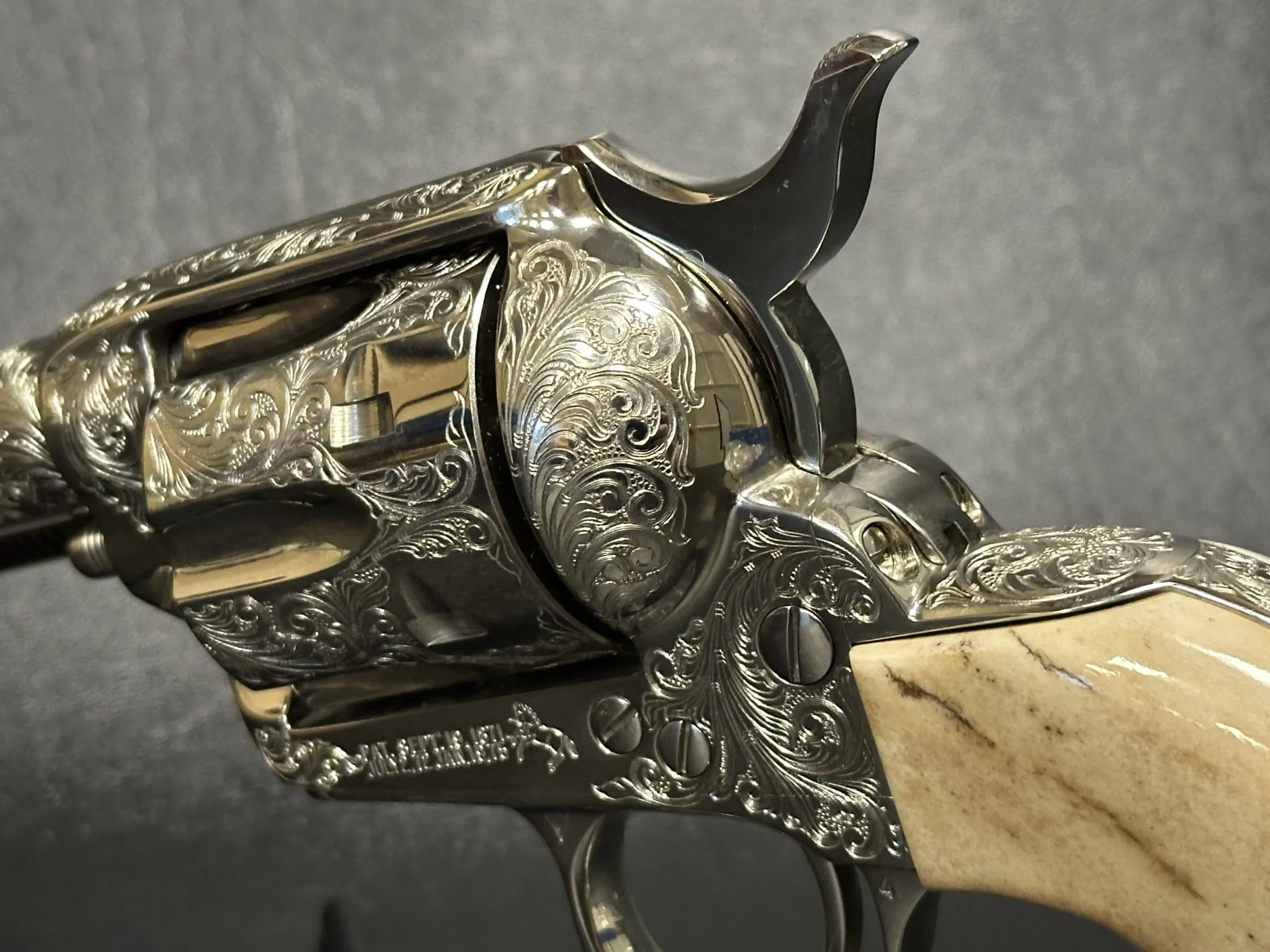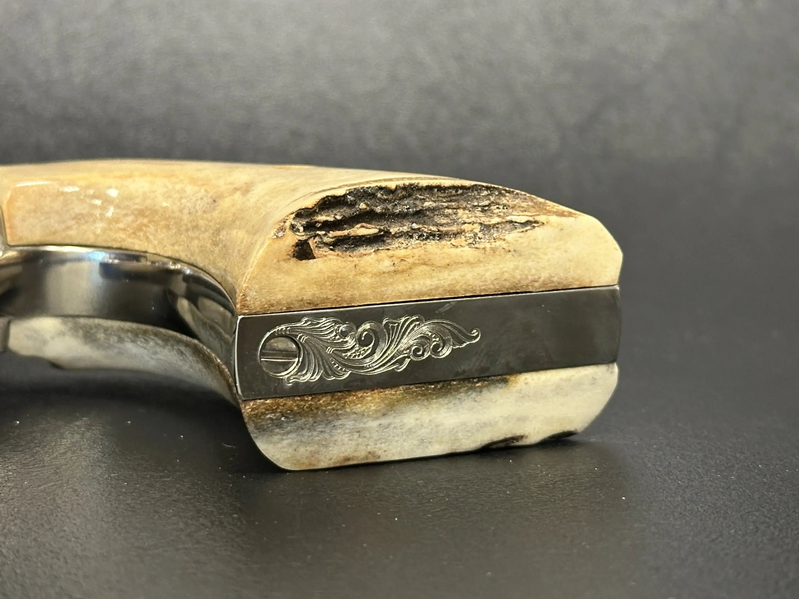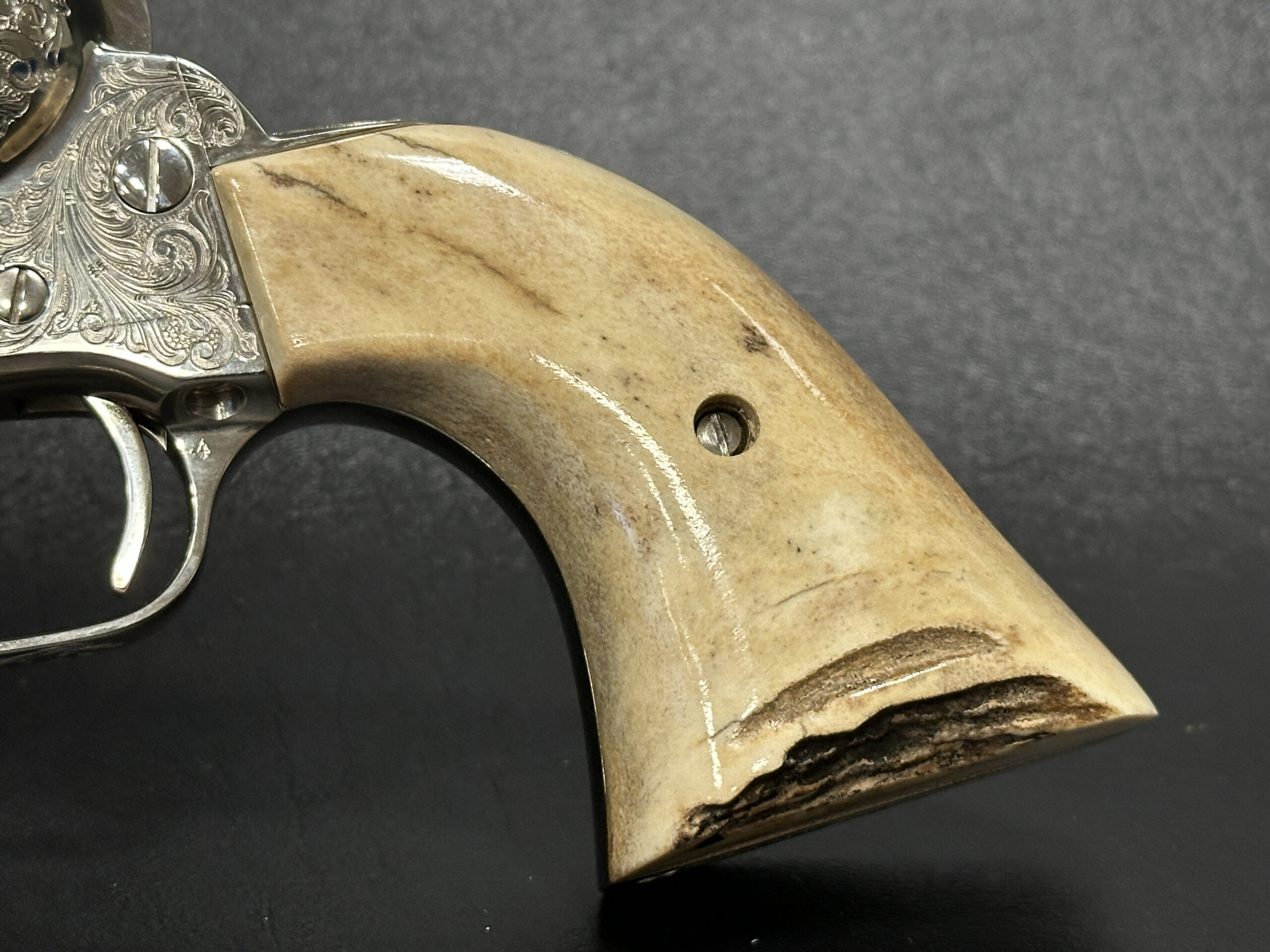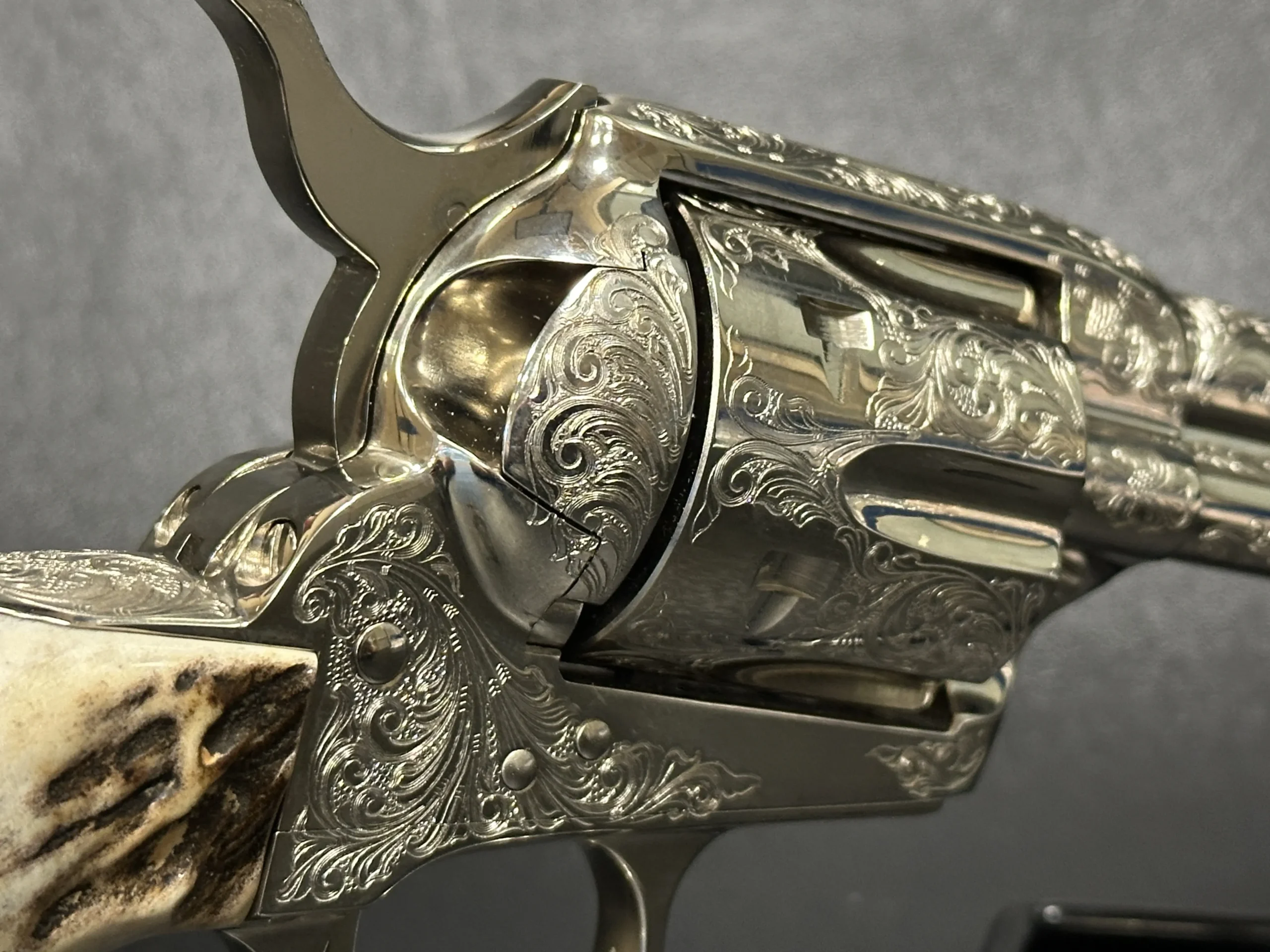 Fitted with genuine stag grips, this revolver pairs natural texture and character with the polished look of the nickel surface. The 5.5-inch barrel offers a balanced profile that presents well in hand and on display.