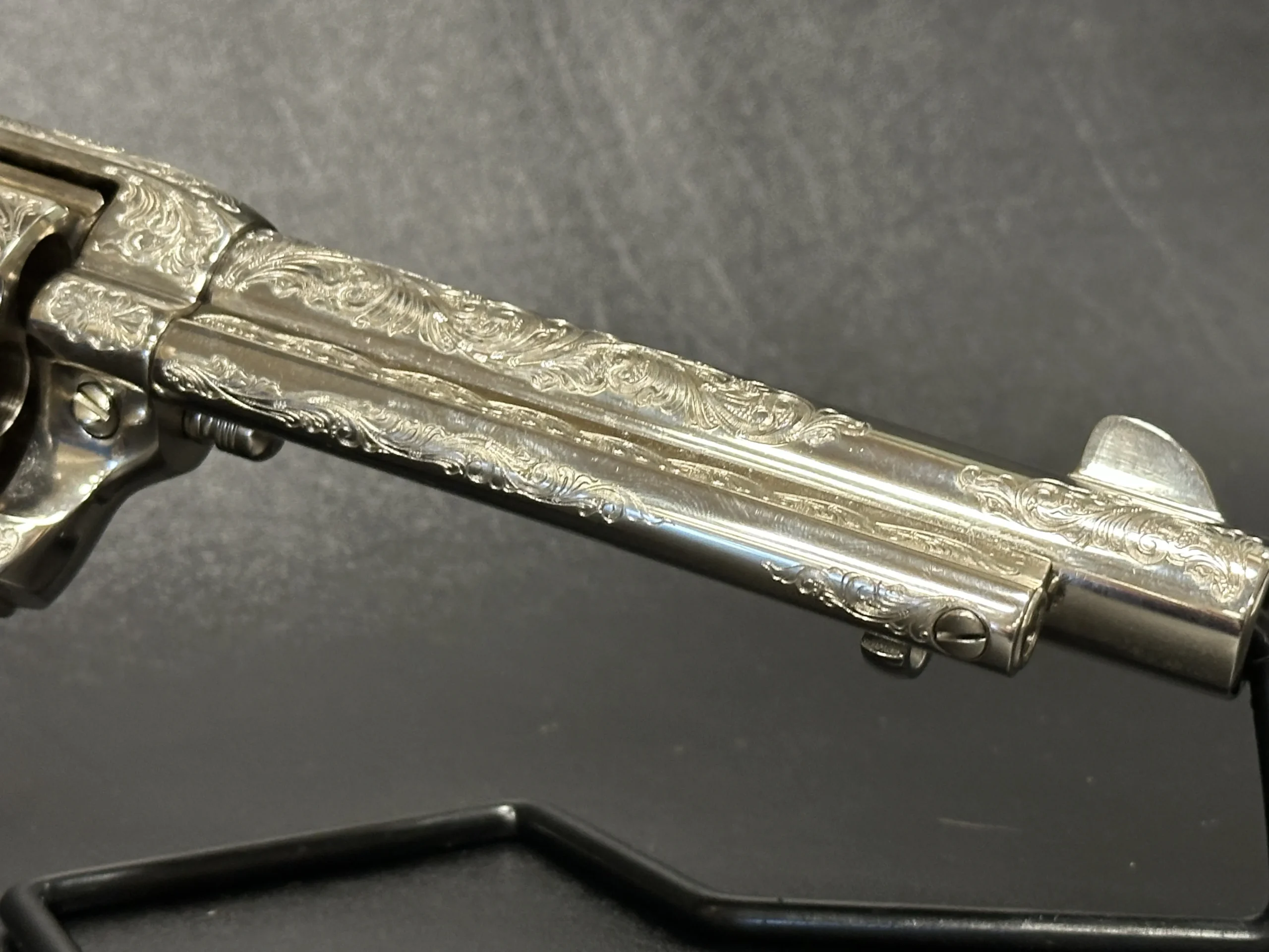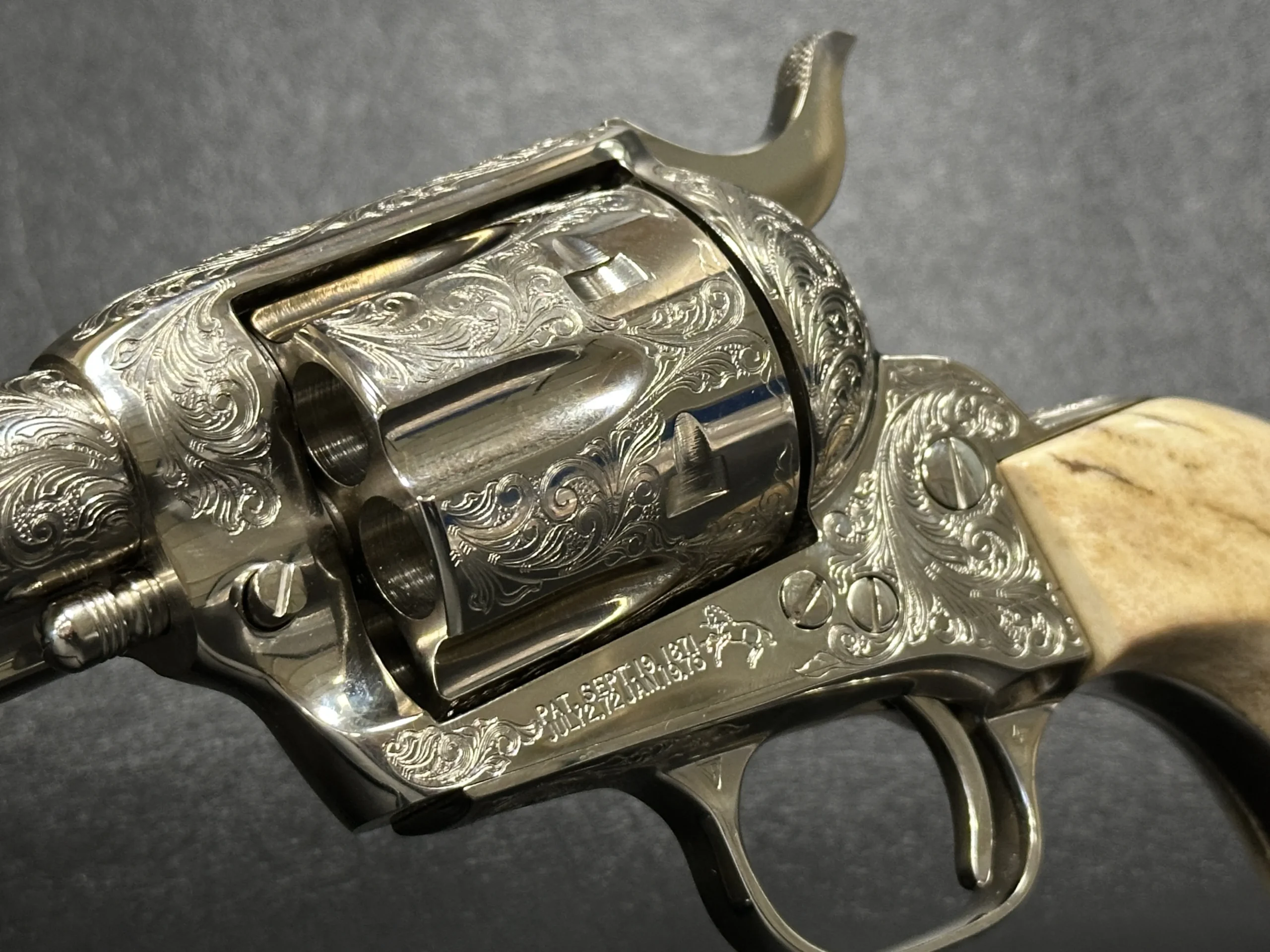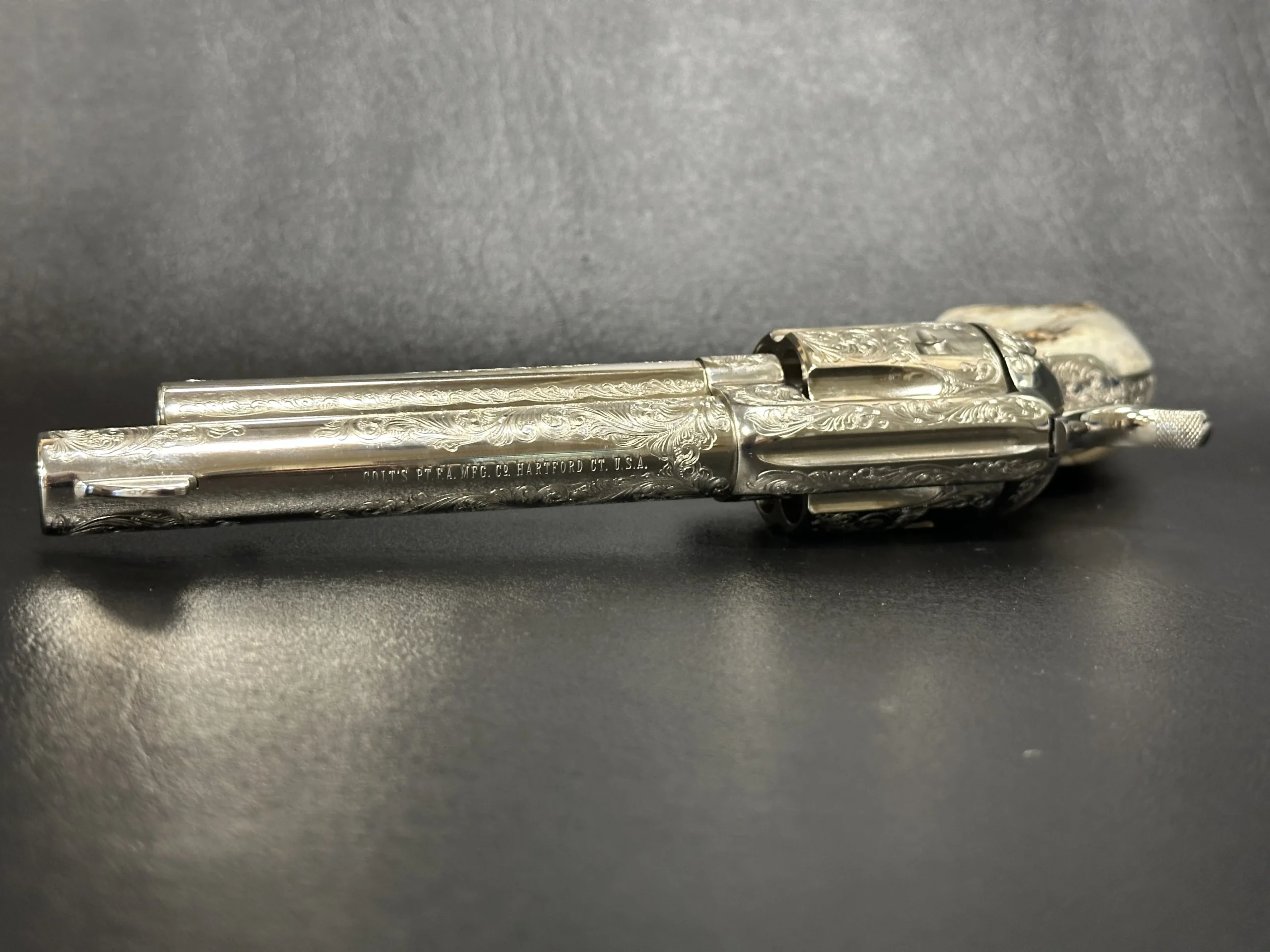 Colt Single Action Army 3rd Generation revolver with factory Class C engraving and a bright nickel finish. The engraved scrollwork covers the frame with detailed, flowing lines that stand out beautifully against the reflective finish.