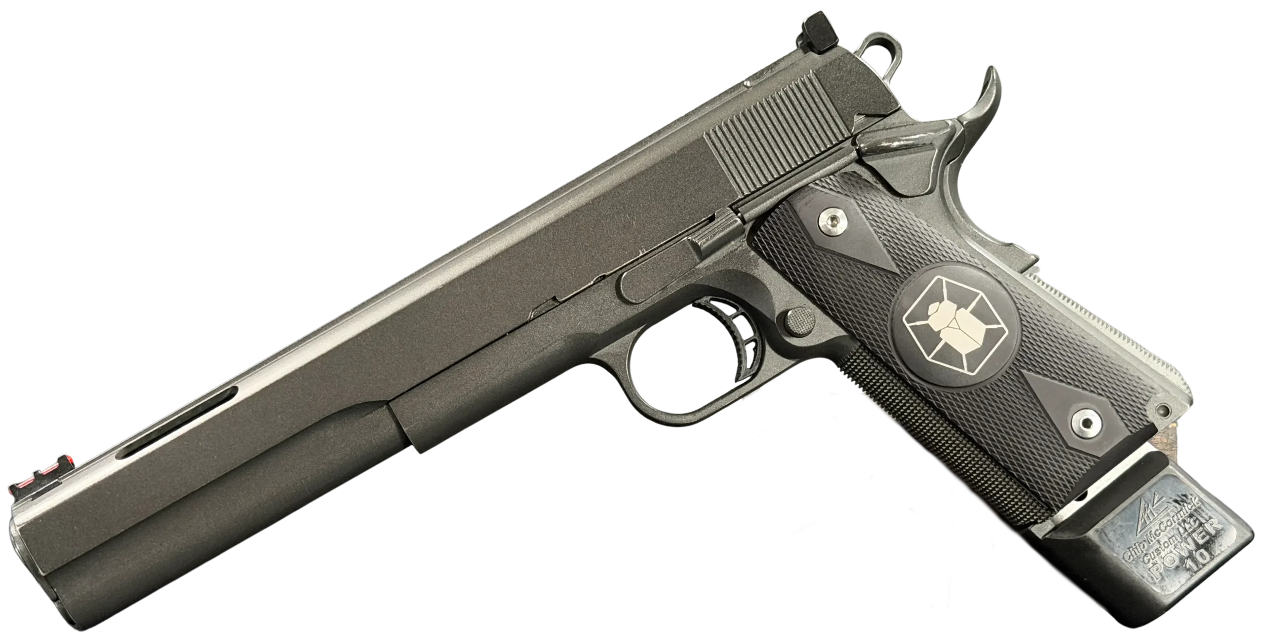 The pistol is finished in a muted tactical tone with clean cocking serrations and custom grip panels featuring a bold emblem. An extended magazine base pad adds to the overall competition-influenced configuration and complements the build’s purposeful look.