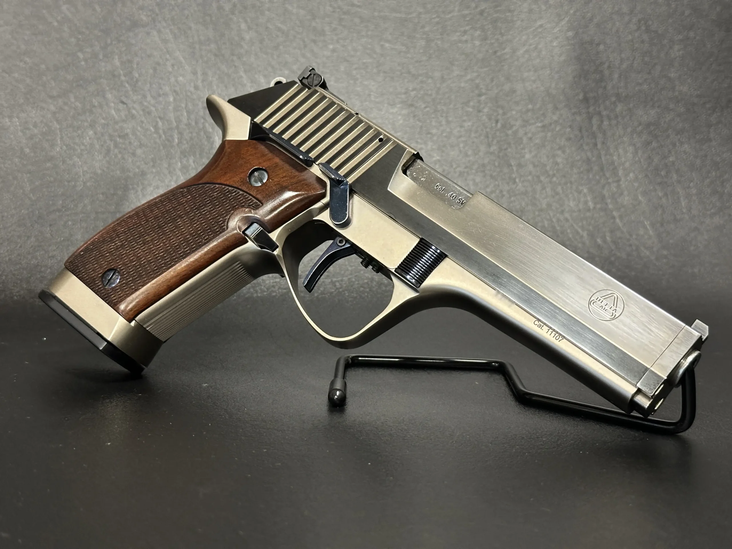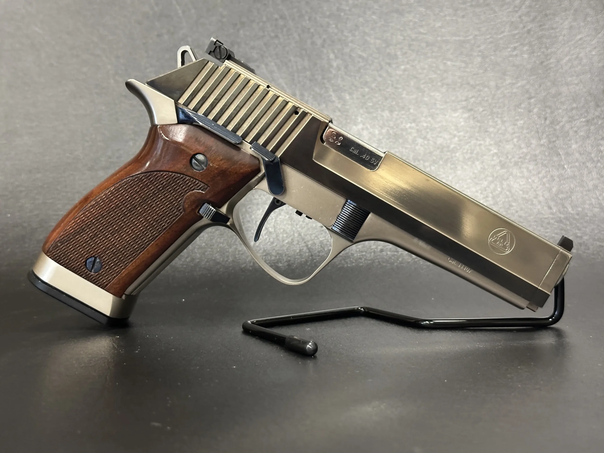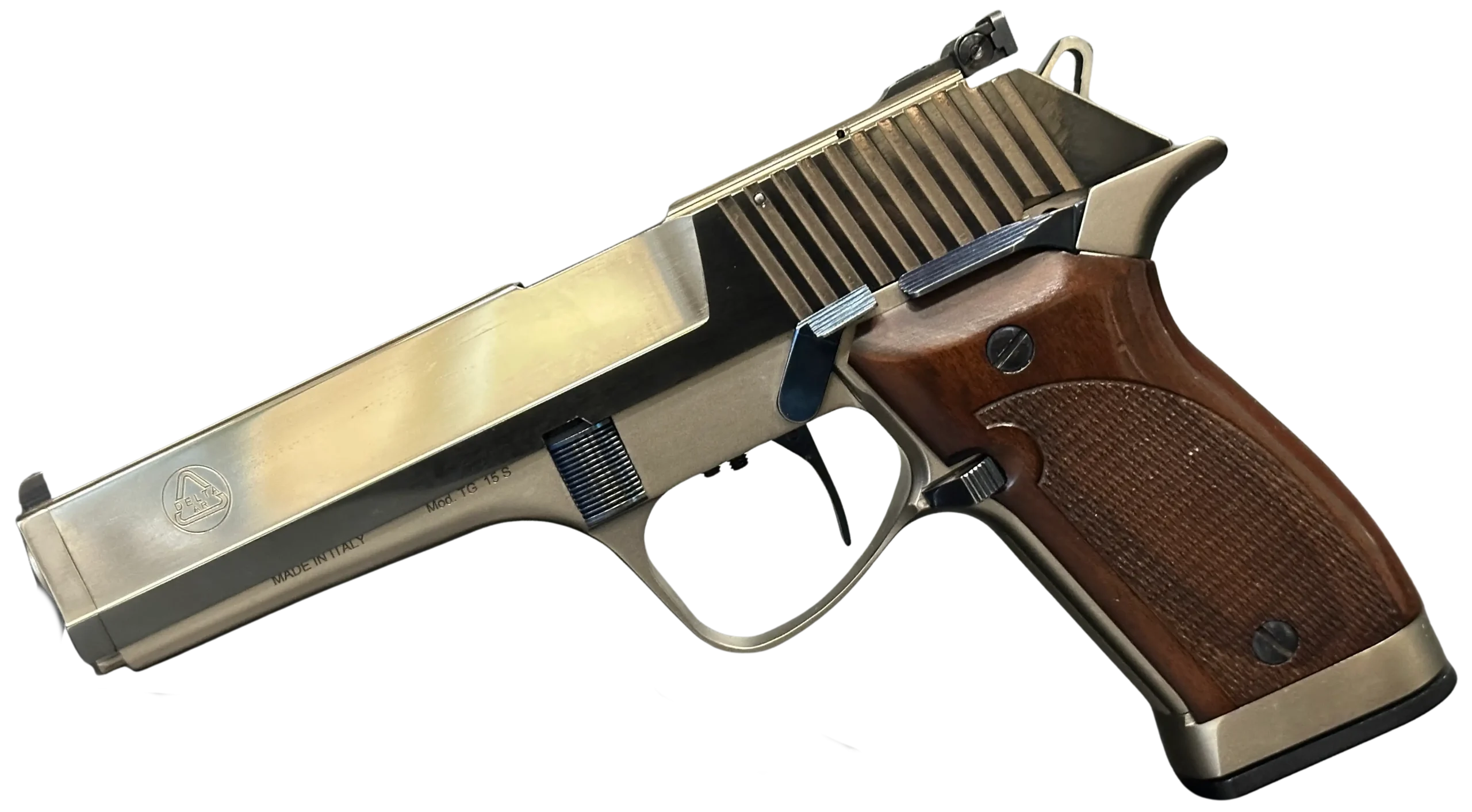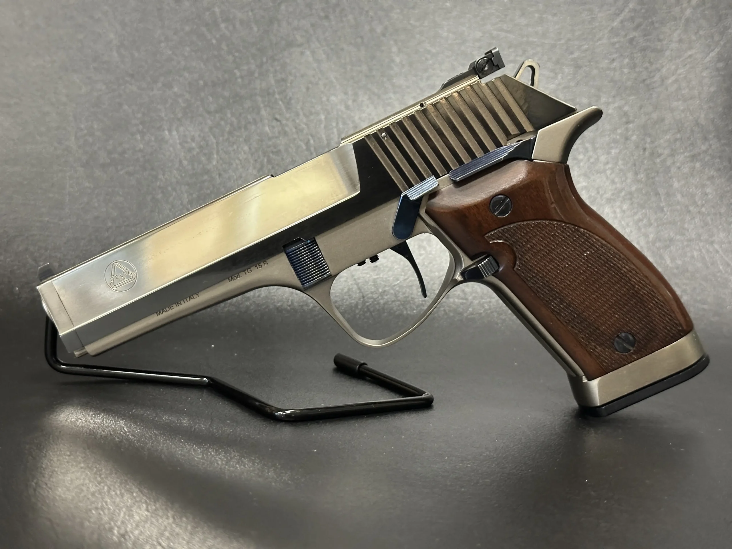 The Delta AR TG 15S is an Italian-made semi-automatic pistol with distinctive late-20th-century styling and a competition-oriented design. Chambered in .40 S&W, it pairs a long, sculpted slide with a two-tone finish that contrasts satin flats and matte contours for a sharp, purposeful look.