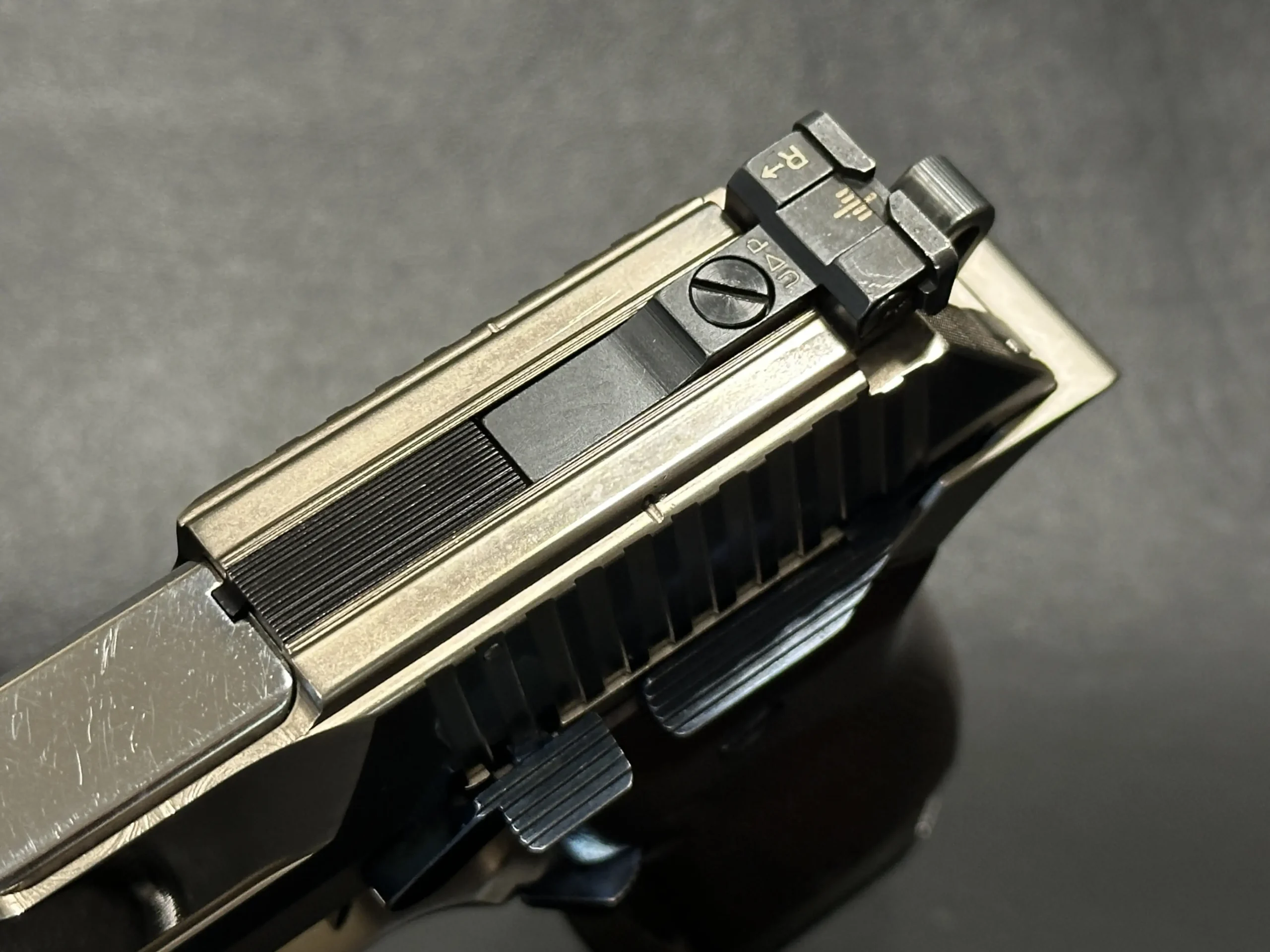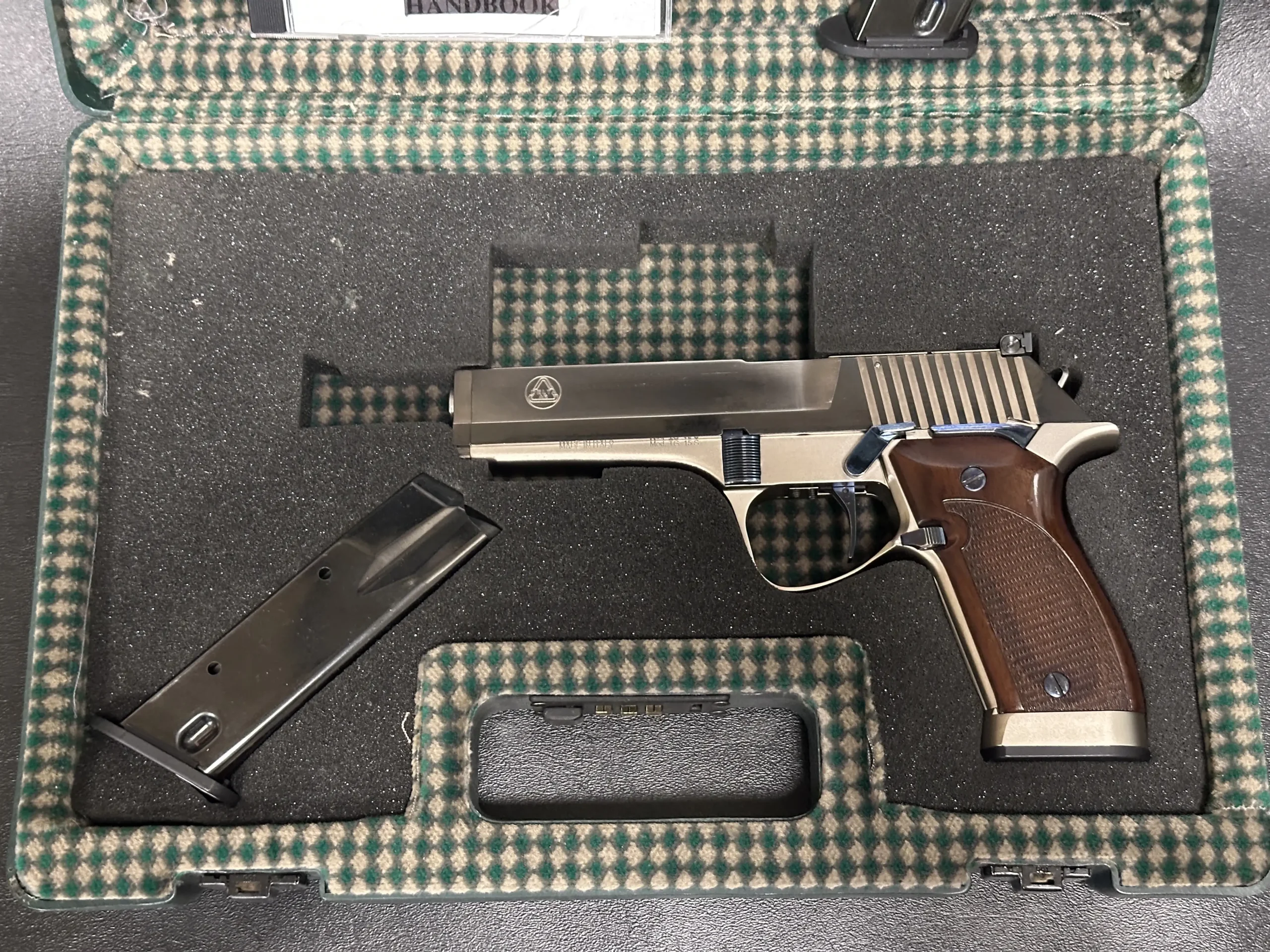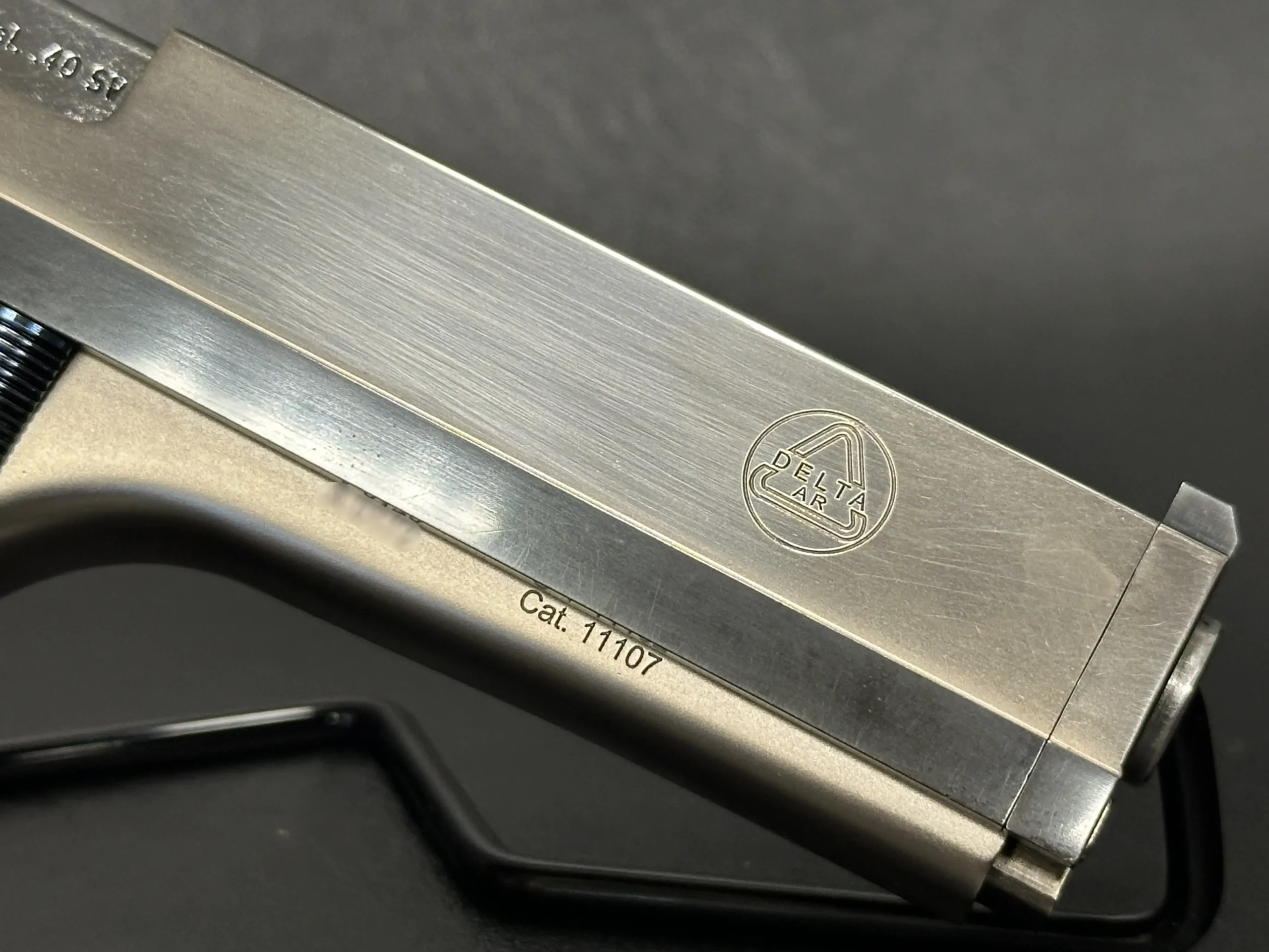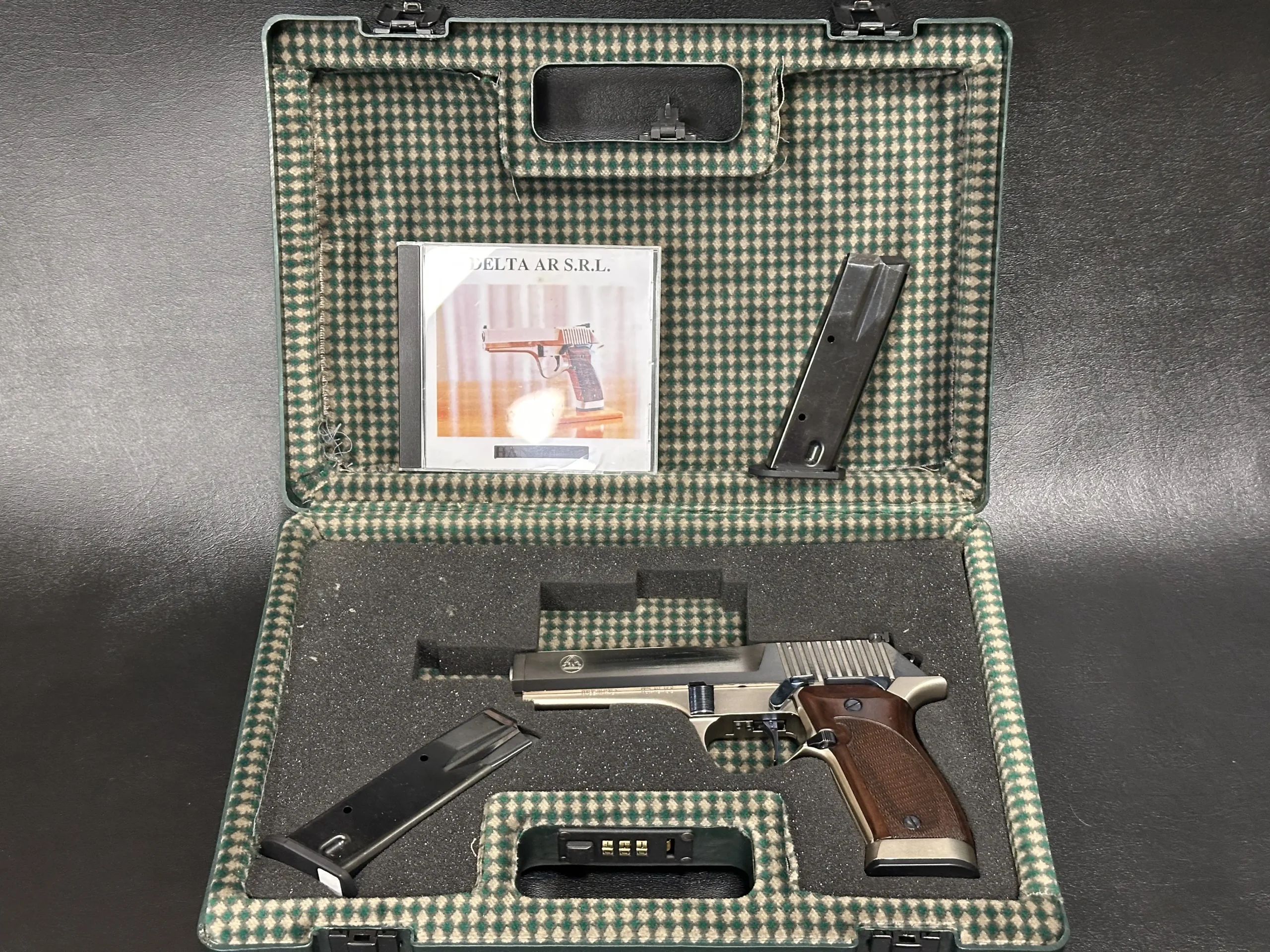 The Delta AR TG 15S is an Italian-made semi-automatic pistol with distinctive late-20th-century styling and a competition-oriented design. Chambered in .40 S&W, it pairs a long, sculpted slide with a two-tone finish that contrasts satin flats and matte contours for a sharp, purposeful look.