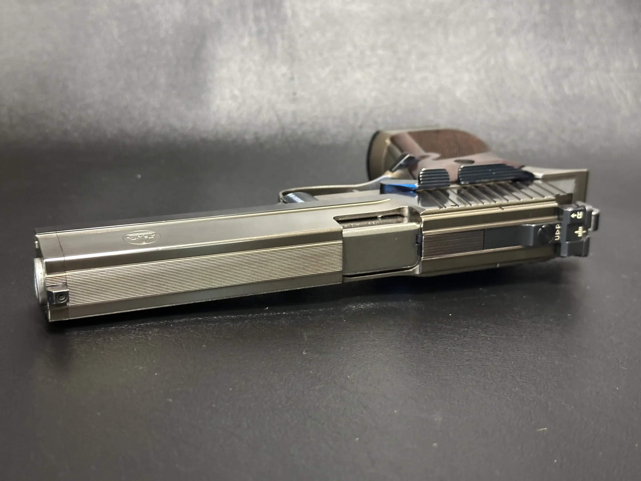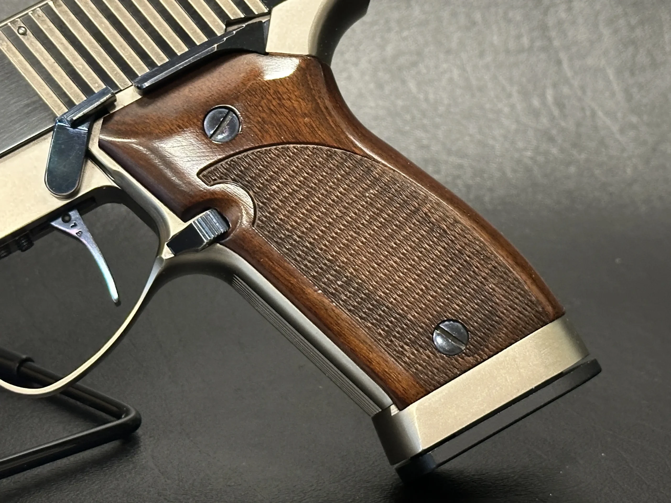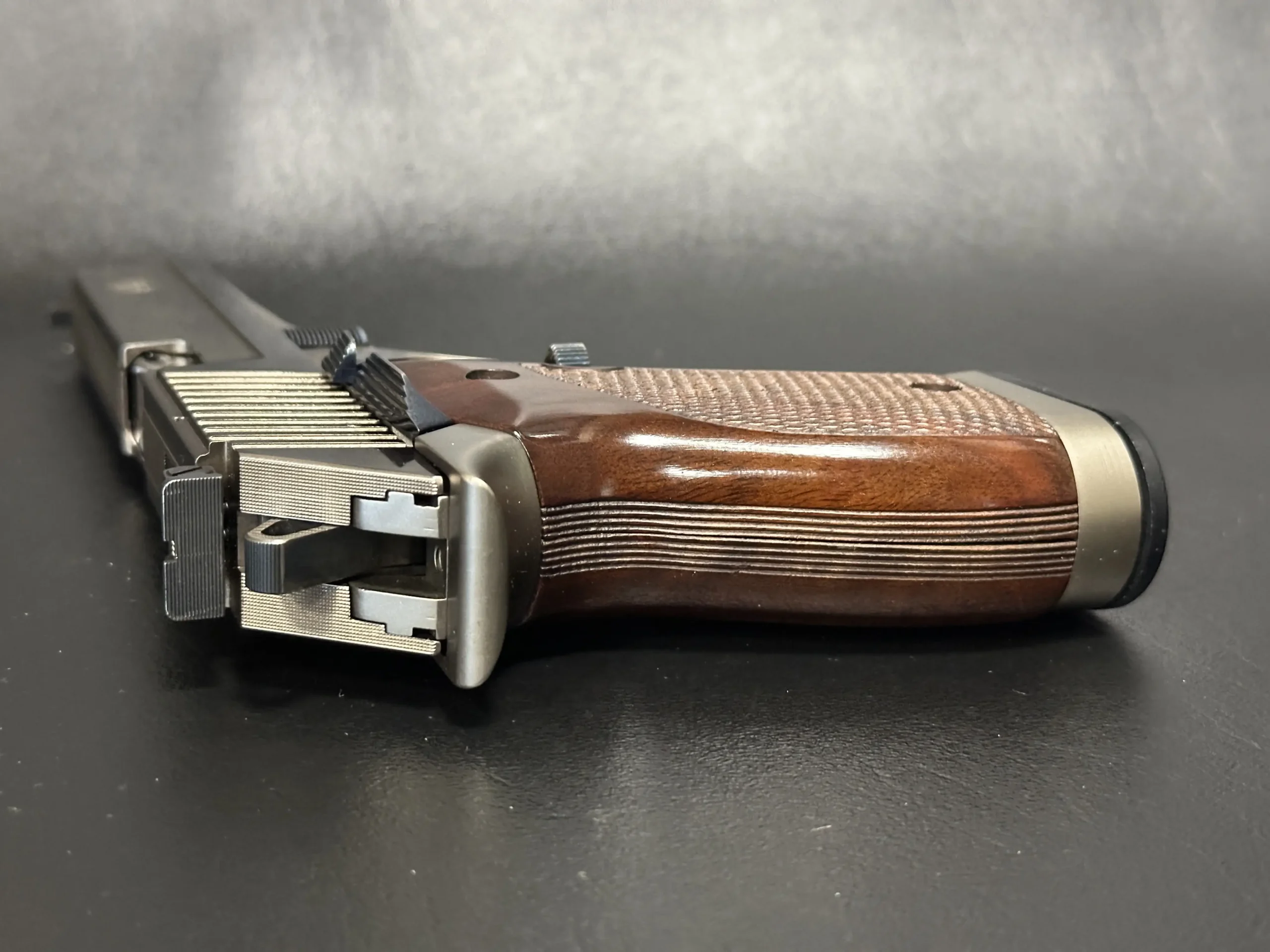 Deep vertical rear serrations support confident handling, while the extended sight radius and adjustable rear sight reflect the pistol’s target-focused layout. The frame shows precise machining and ergonomic contouring, complemented by finely checkered walnut grips with subtle palm swells and texturing.