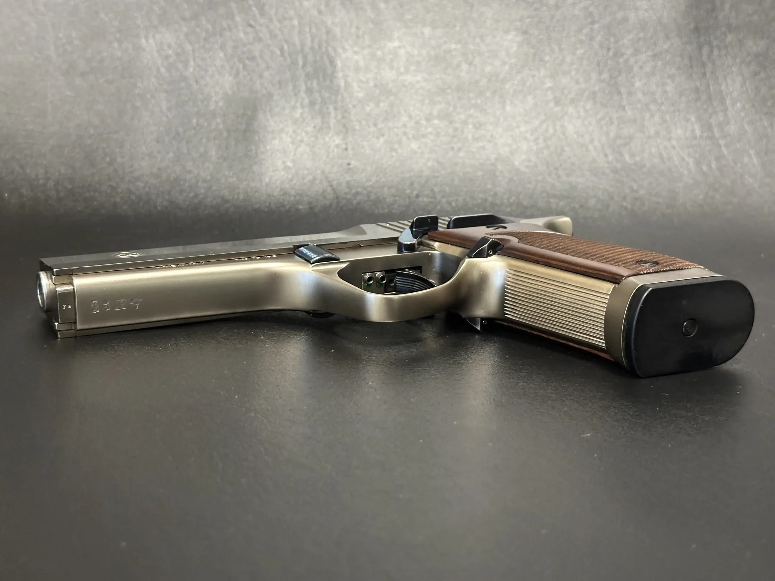 Extended controls, including the safety and slide release, round out the TG 15S’s practical feature set. This example is accompanied by its original factory case and accessories, offering a complete presentation of a lesser-seen Italian sport pistol.