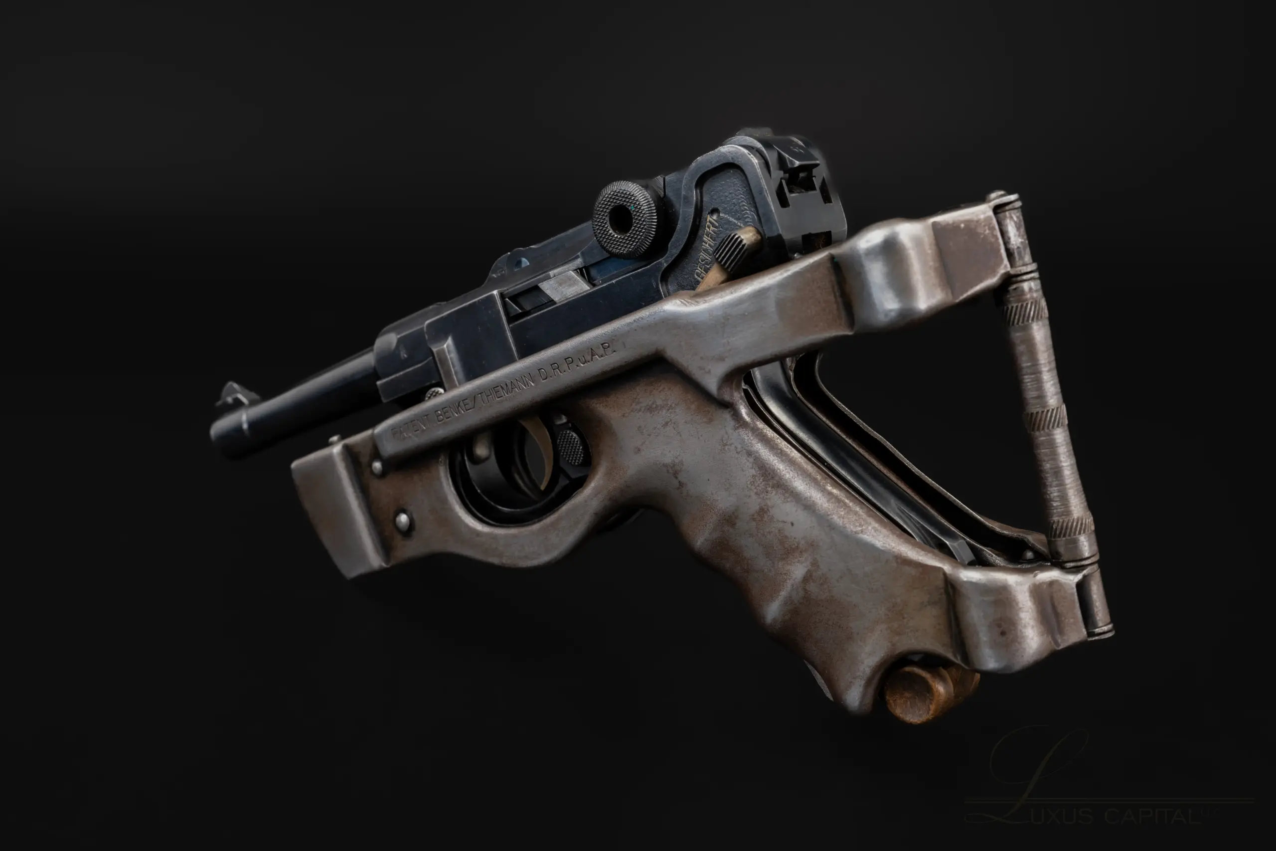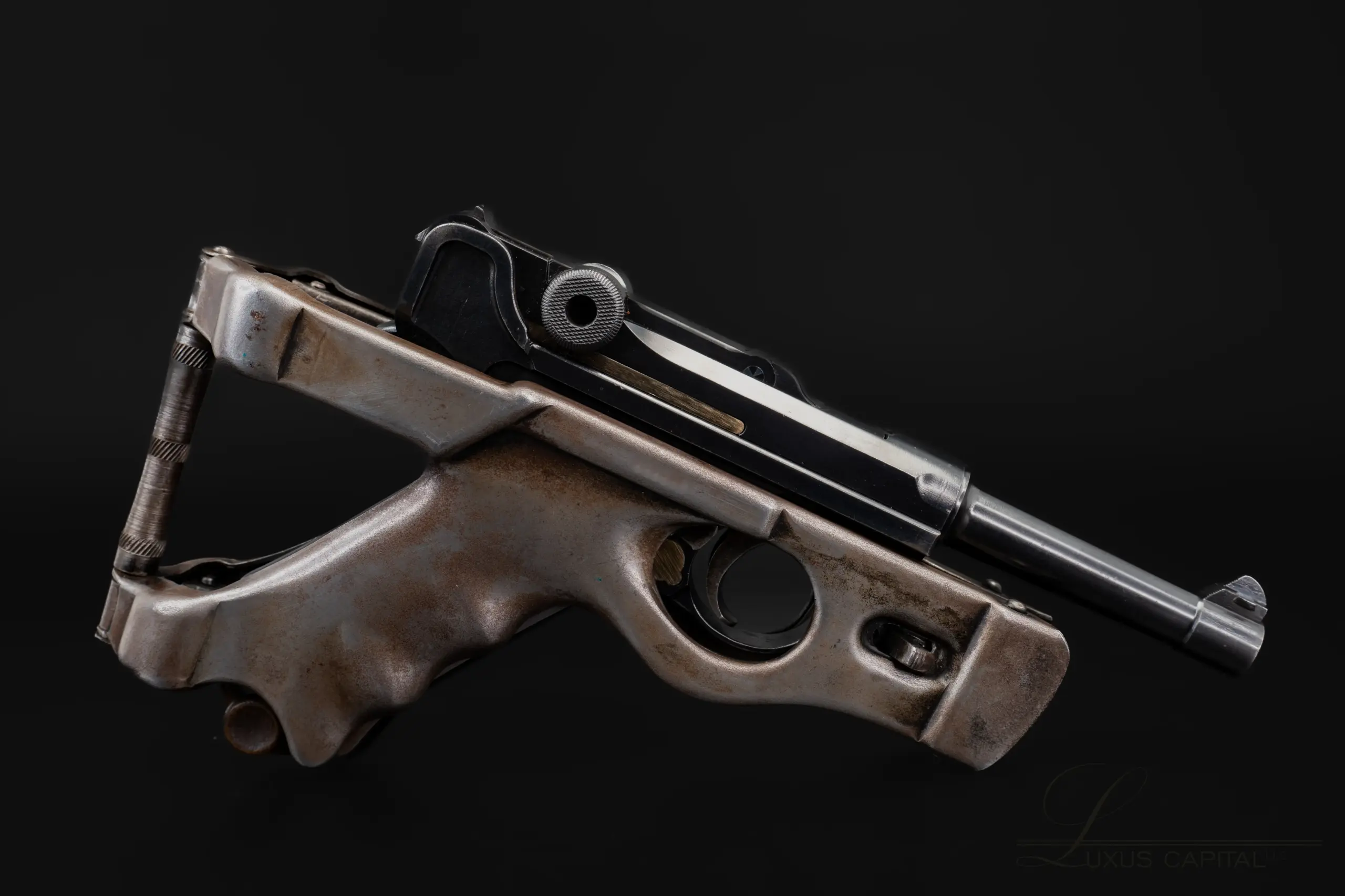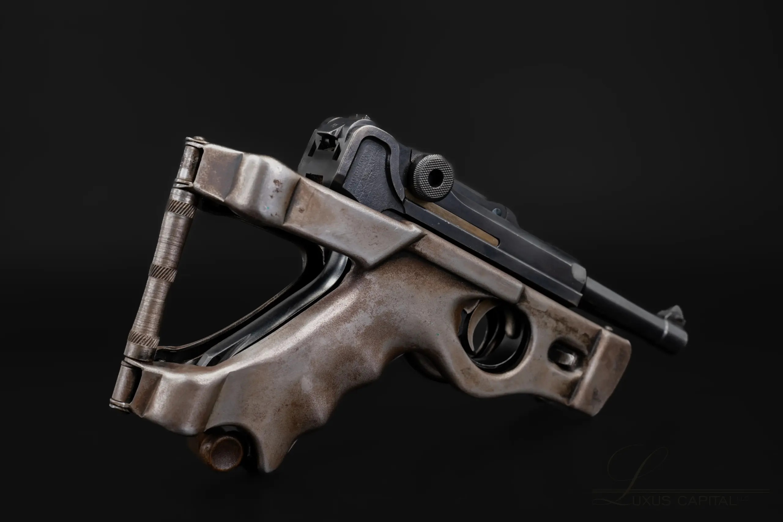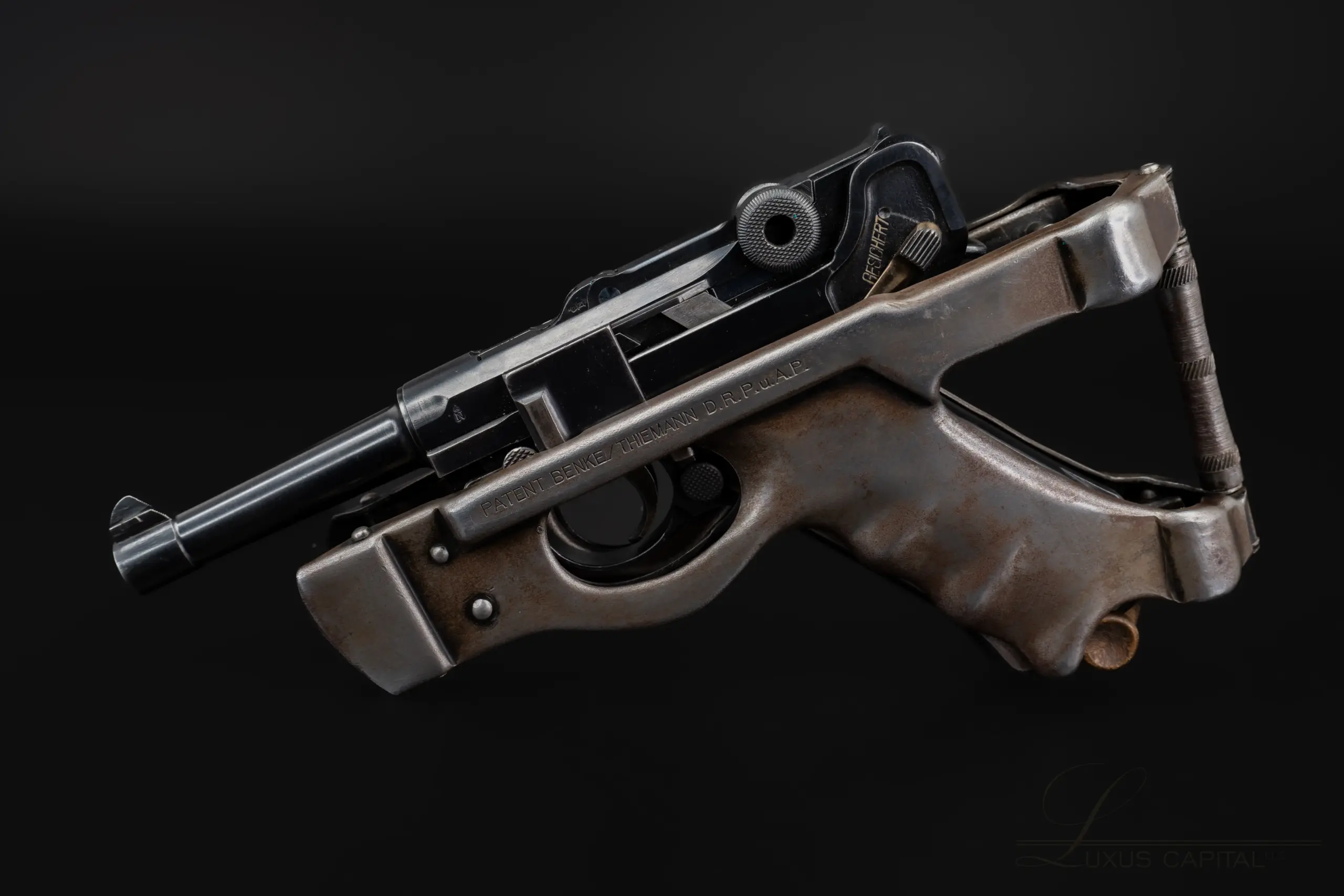 DWM 1920 Luger with Benke–Thiemann folding stock, chambered in 7.65mm (.30 Luger). The stamped-metal folding stock gives this pistol a distinctive profile and locks in both the open and closed positions.
