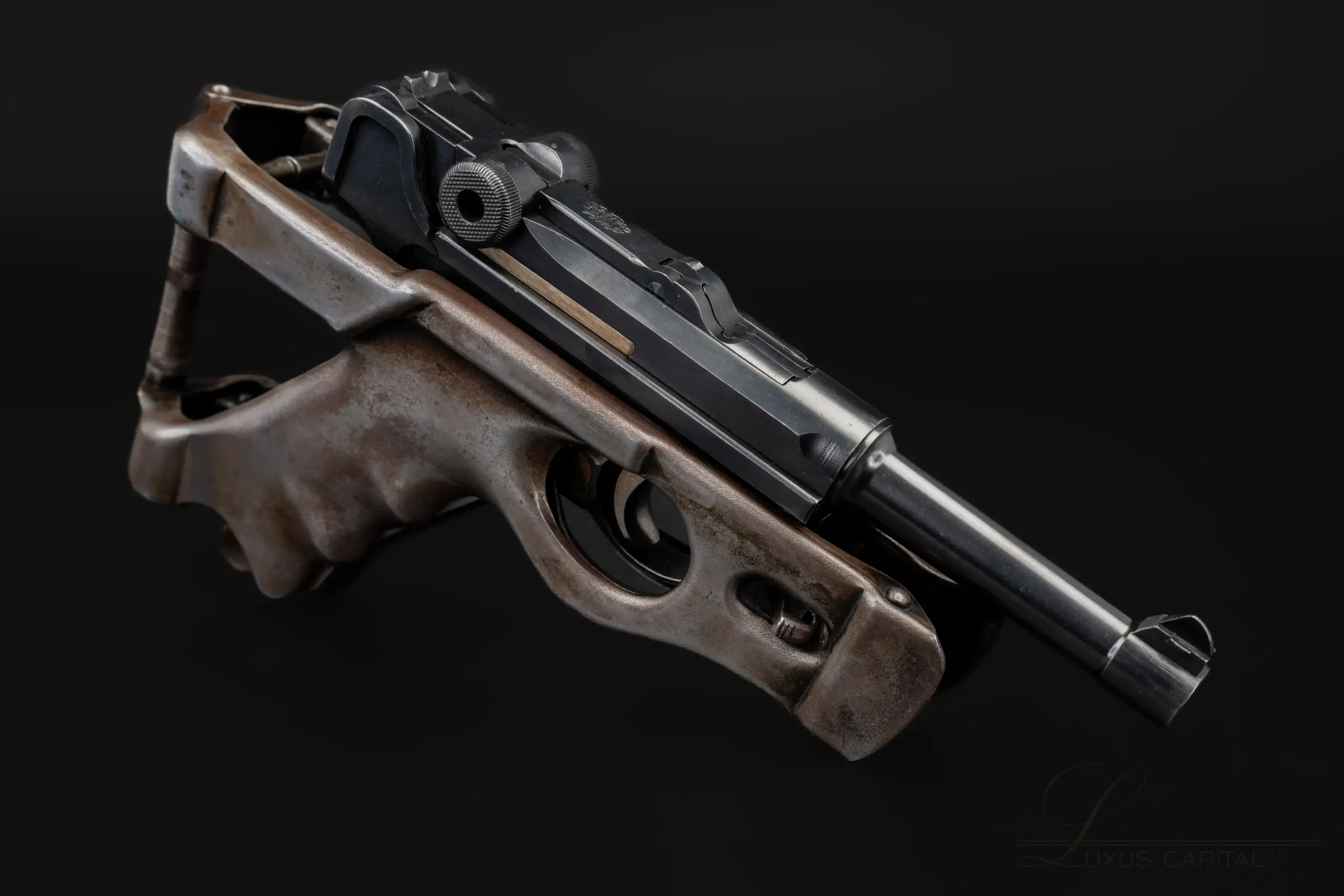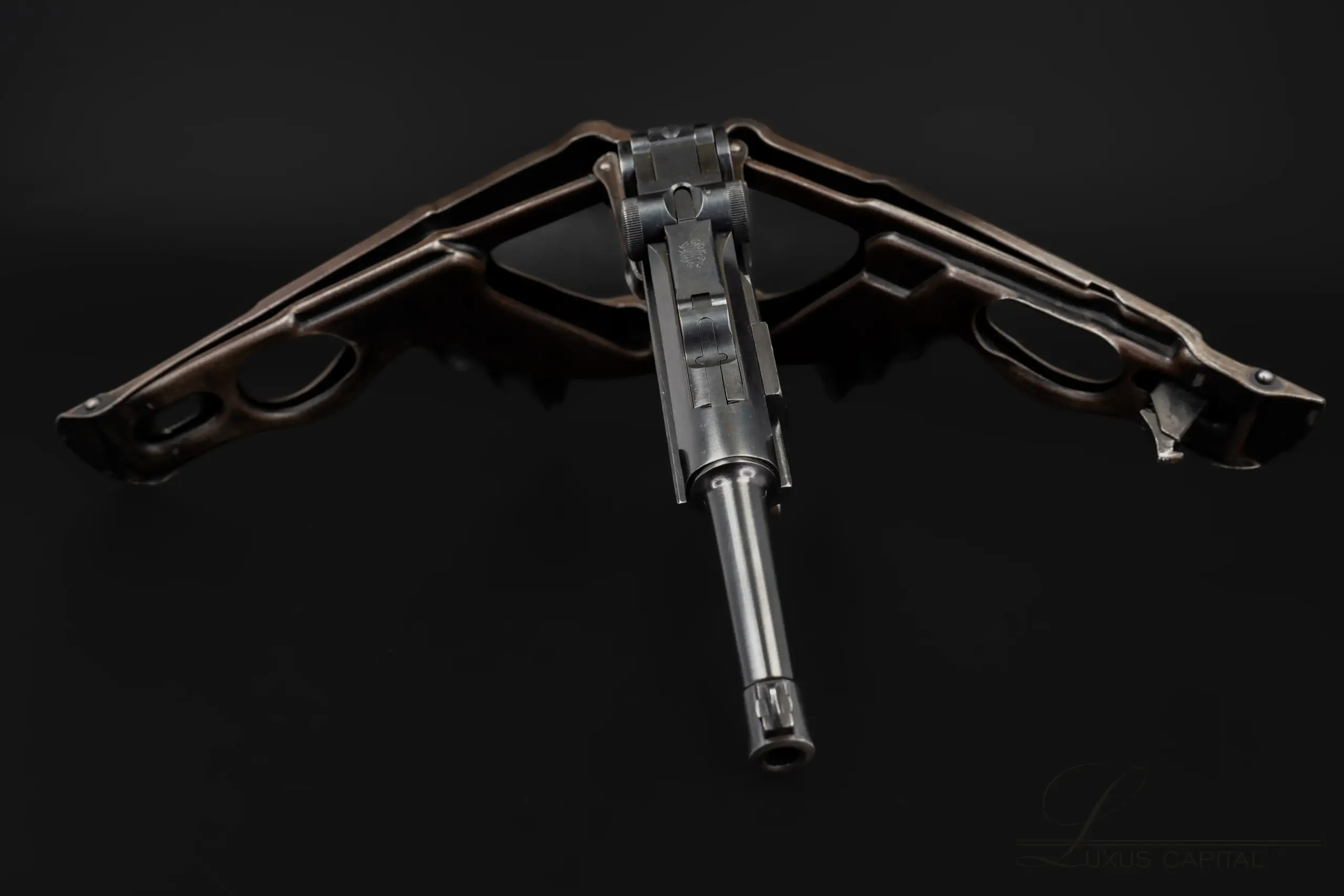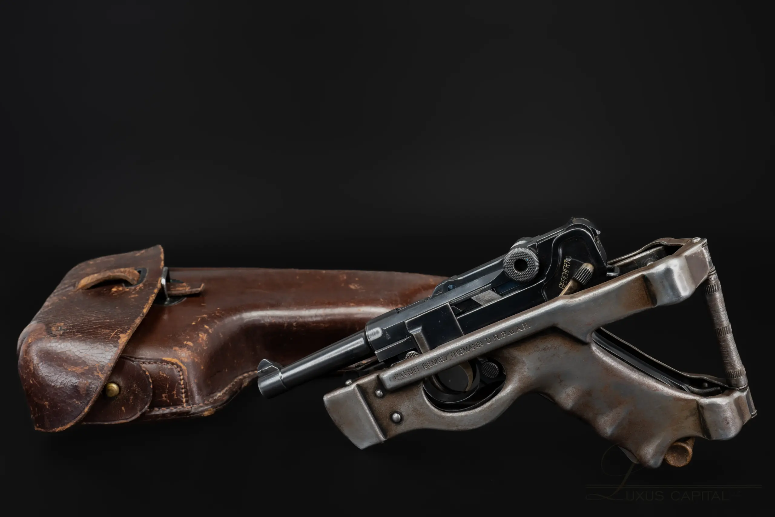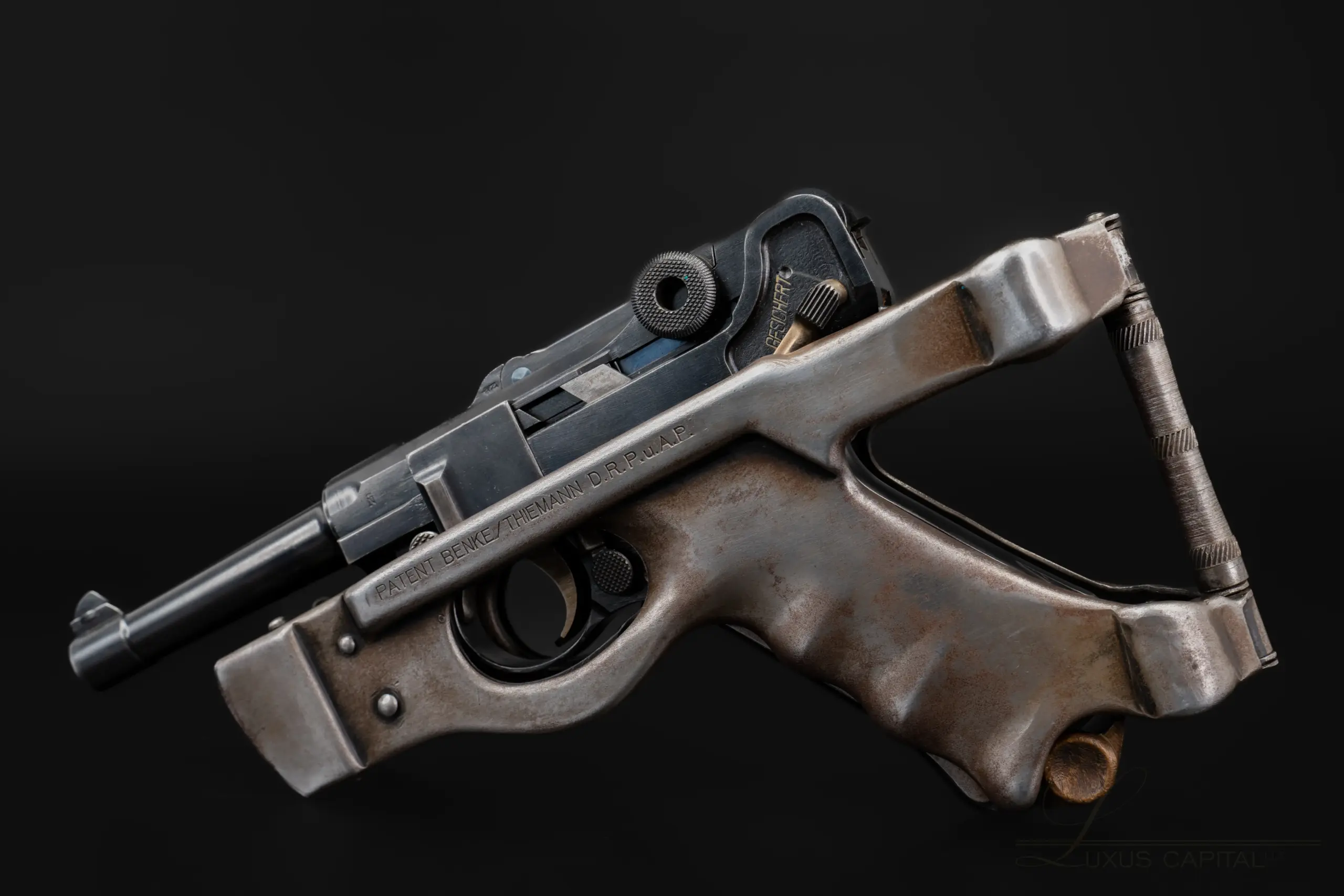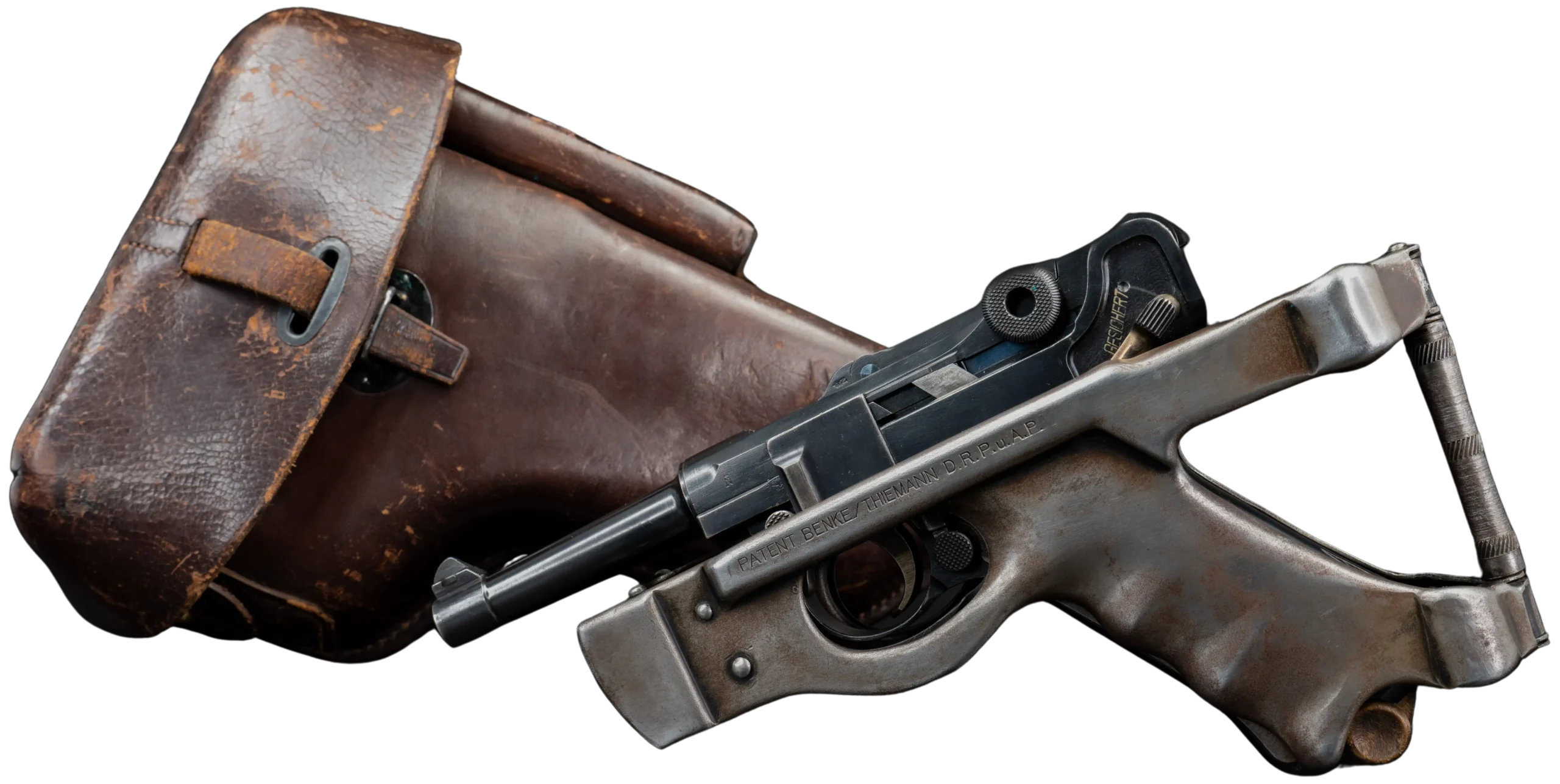 DWM 1920 Luger with Benke–Thiemann folding stock, chambered in 7.65mm (.30 Luger). The stamped-metal folding stock gives this pistol a distinctive profile and locks in both the open and closed positions.