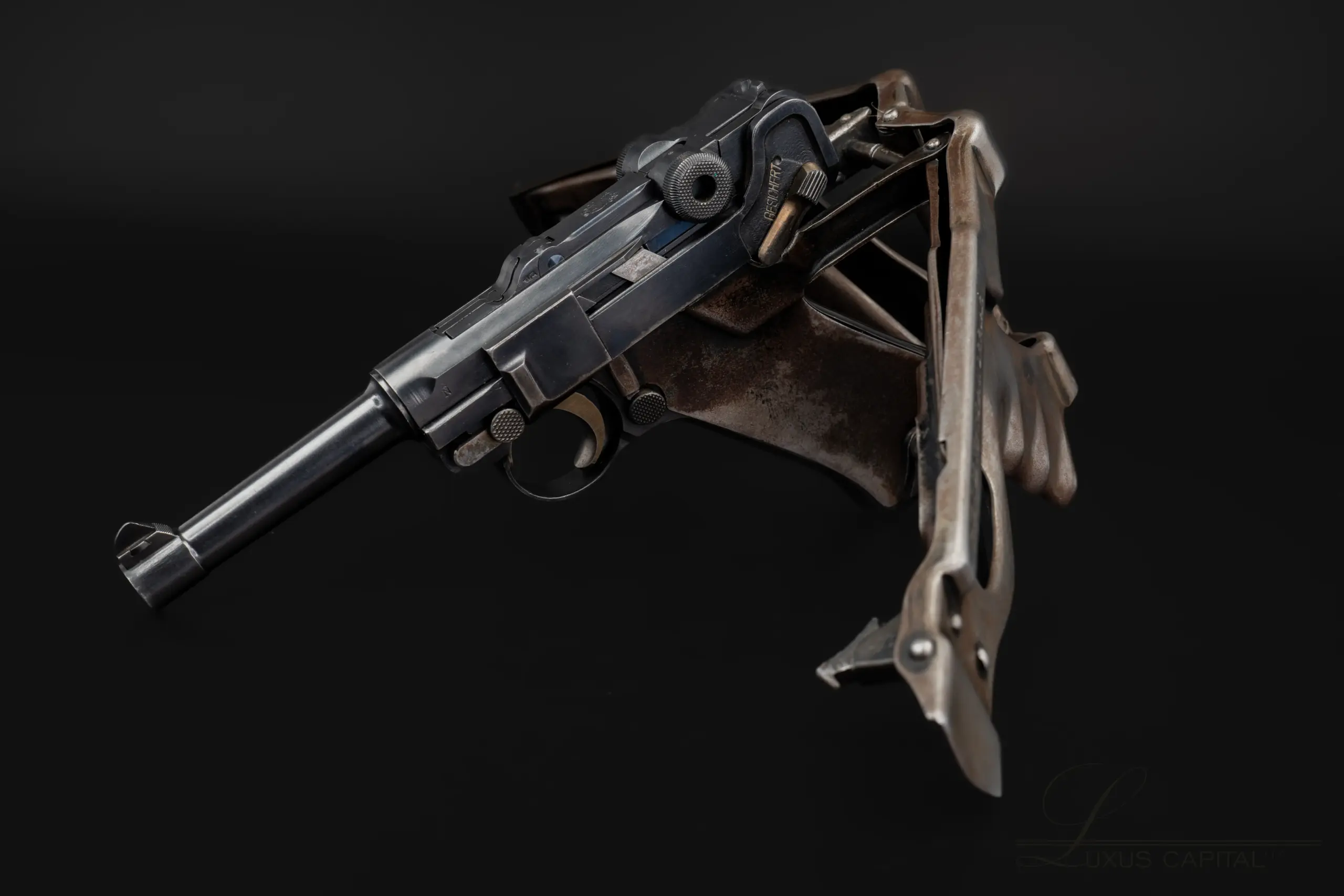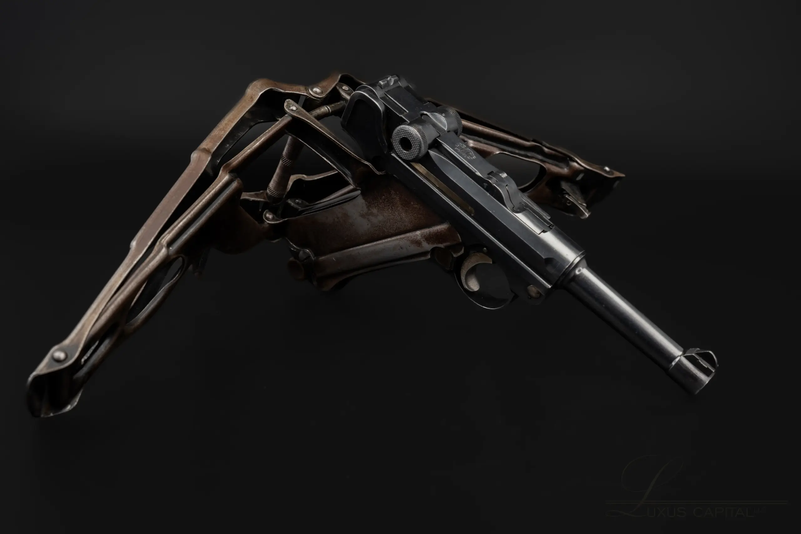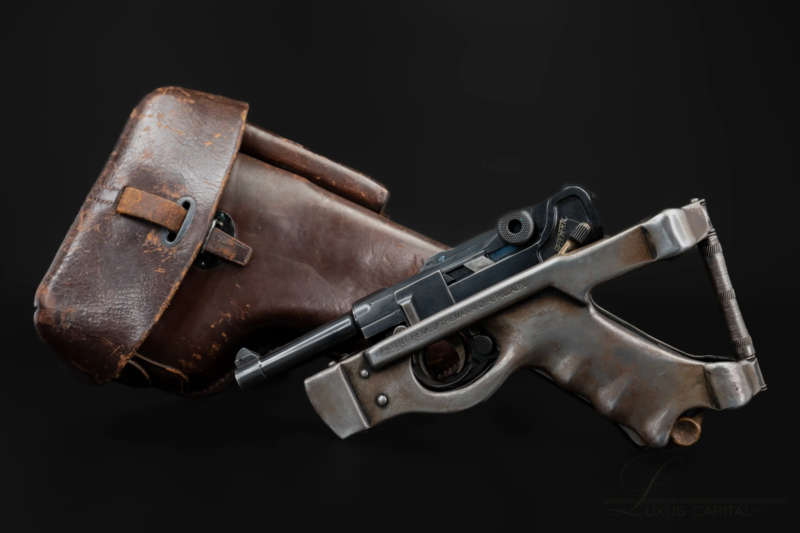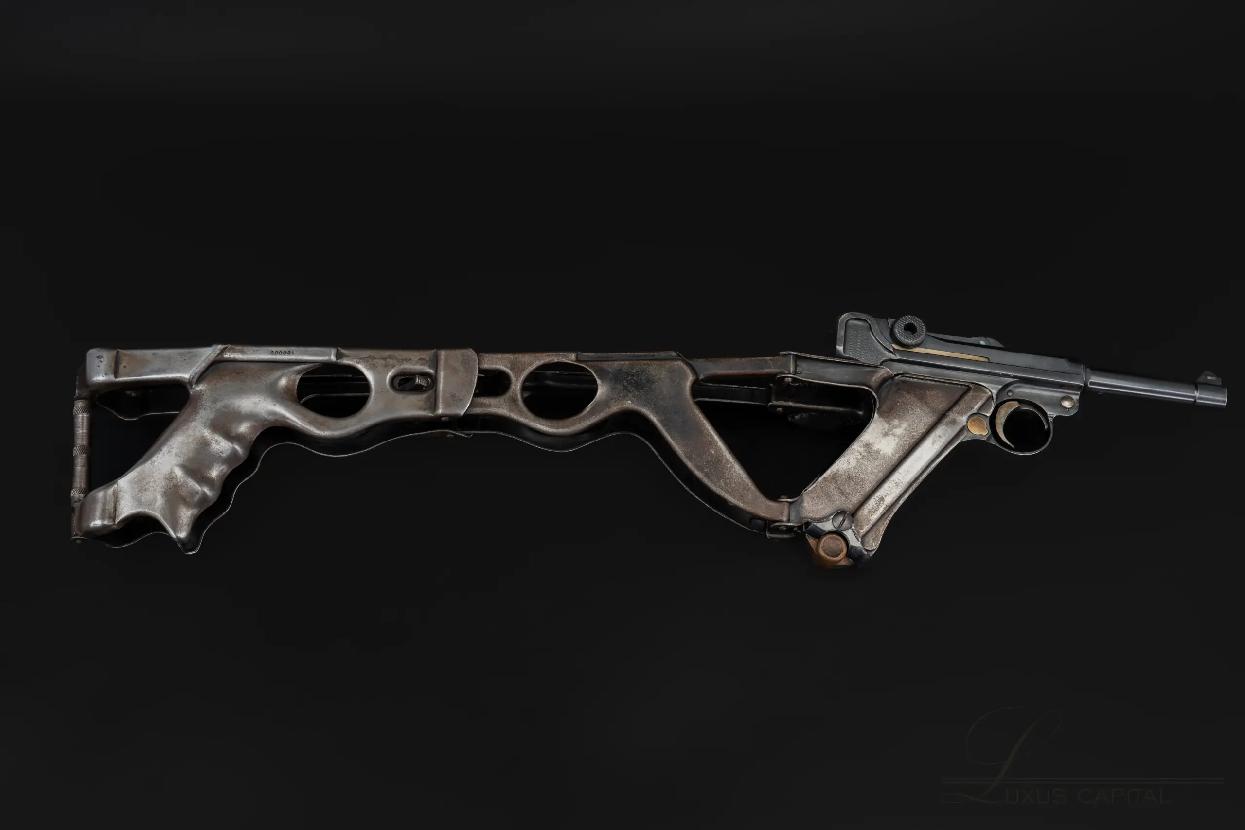 DWM 1920 Luger with Benke–Thiemann folding stock, chambered in 7.65mm (.30 Luger). The stamped-metal folding stock gives this pistol a distinctive profile and locks in both the open and closed positions.