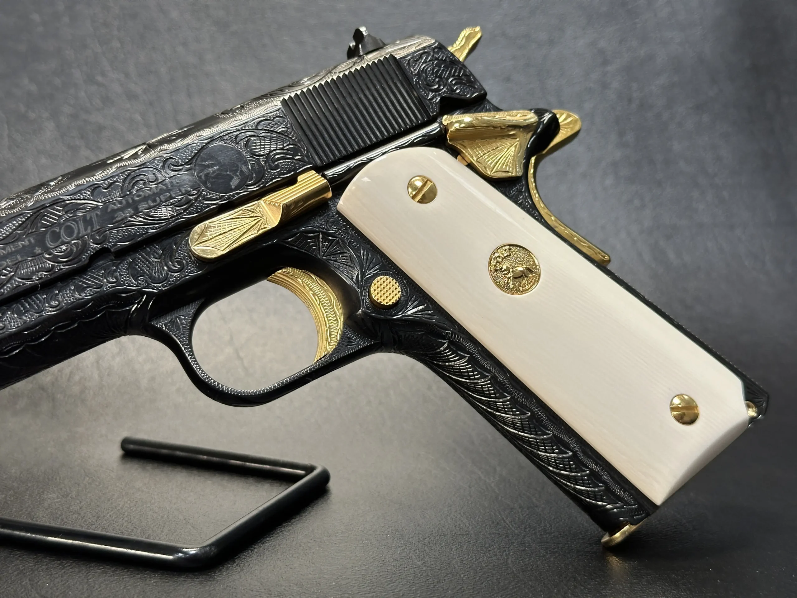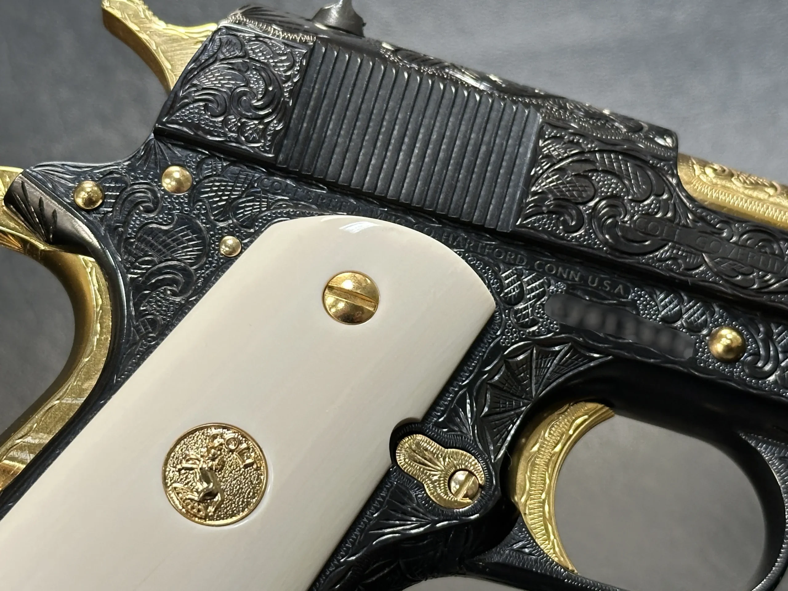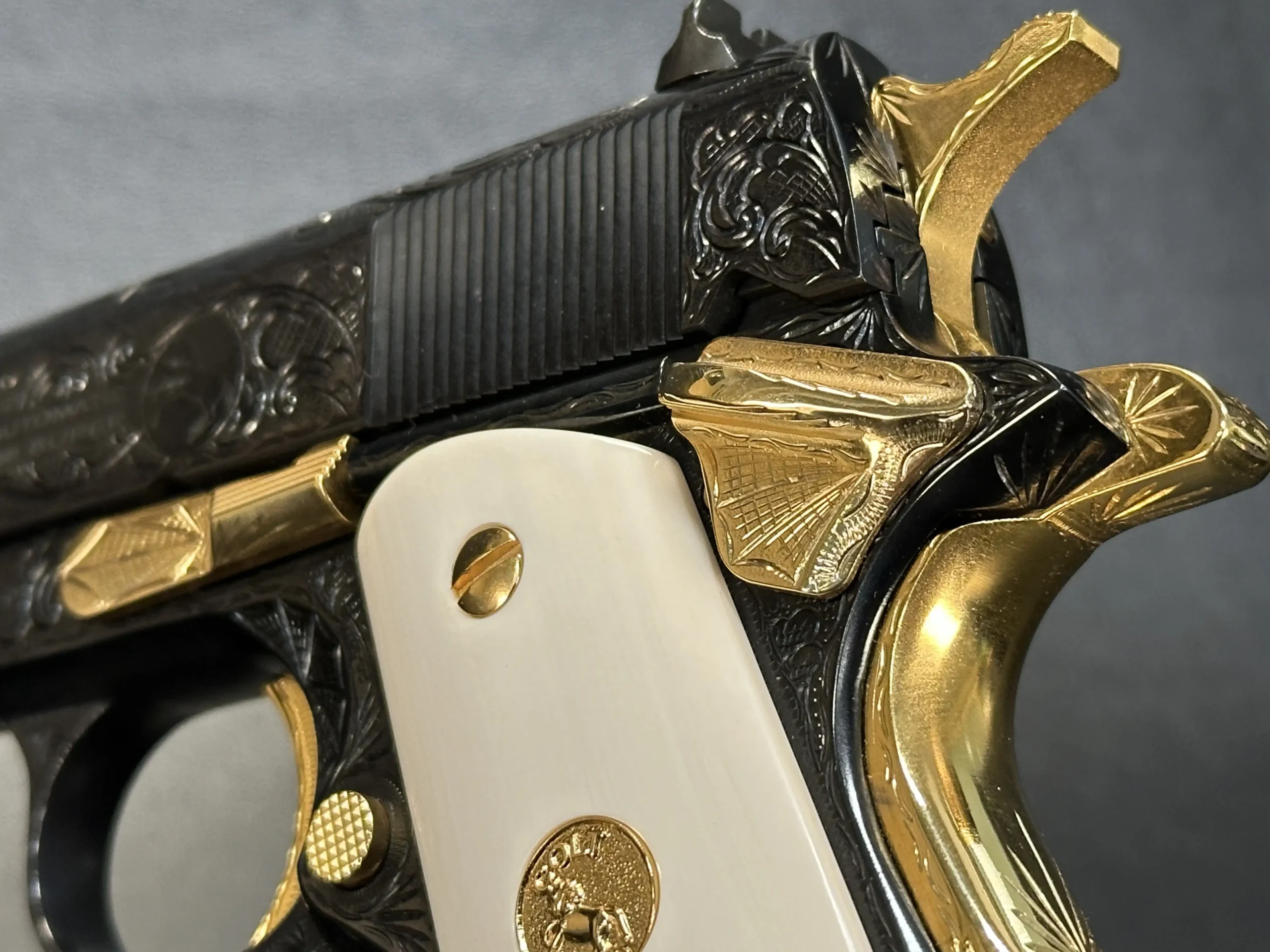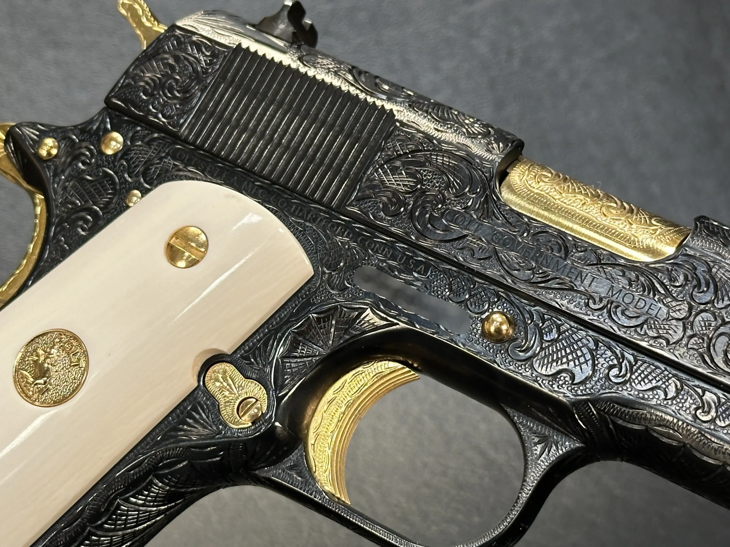 The pistol is fitted with ivory-toned grip panels, polished smooth and secured with gold screws, with a gold Colt medallion on each panel. It is also accompanied by a Certificate of Engraving documenting the decorative work. Built on the Series 70 configuration, it retains the traditional Government Model character while presenting a distinctly embellished finish.