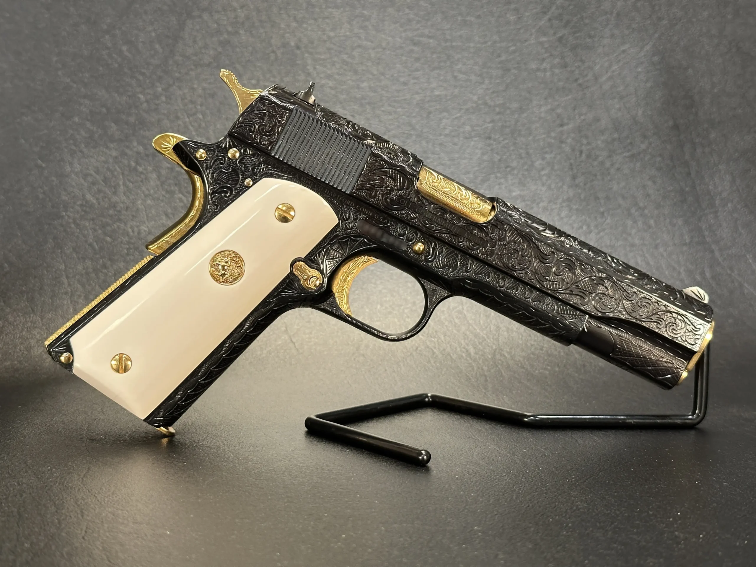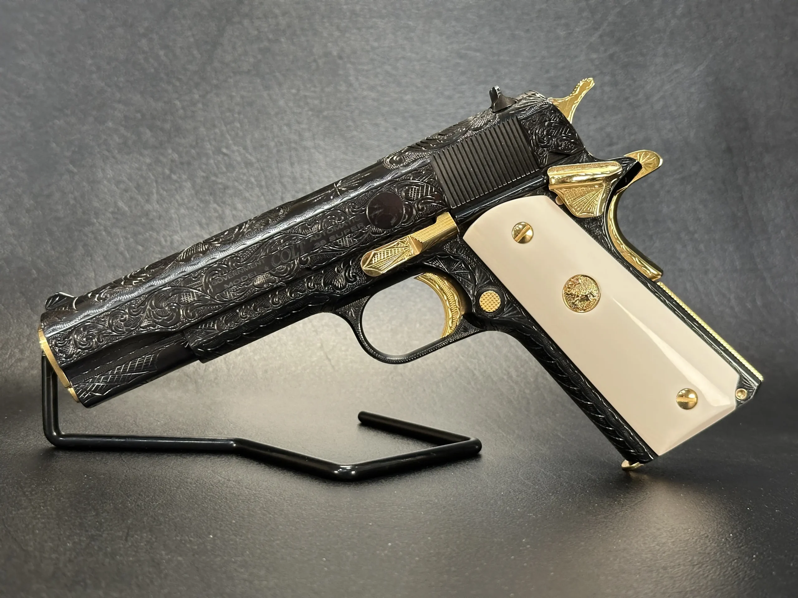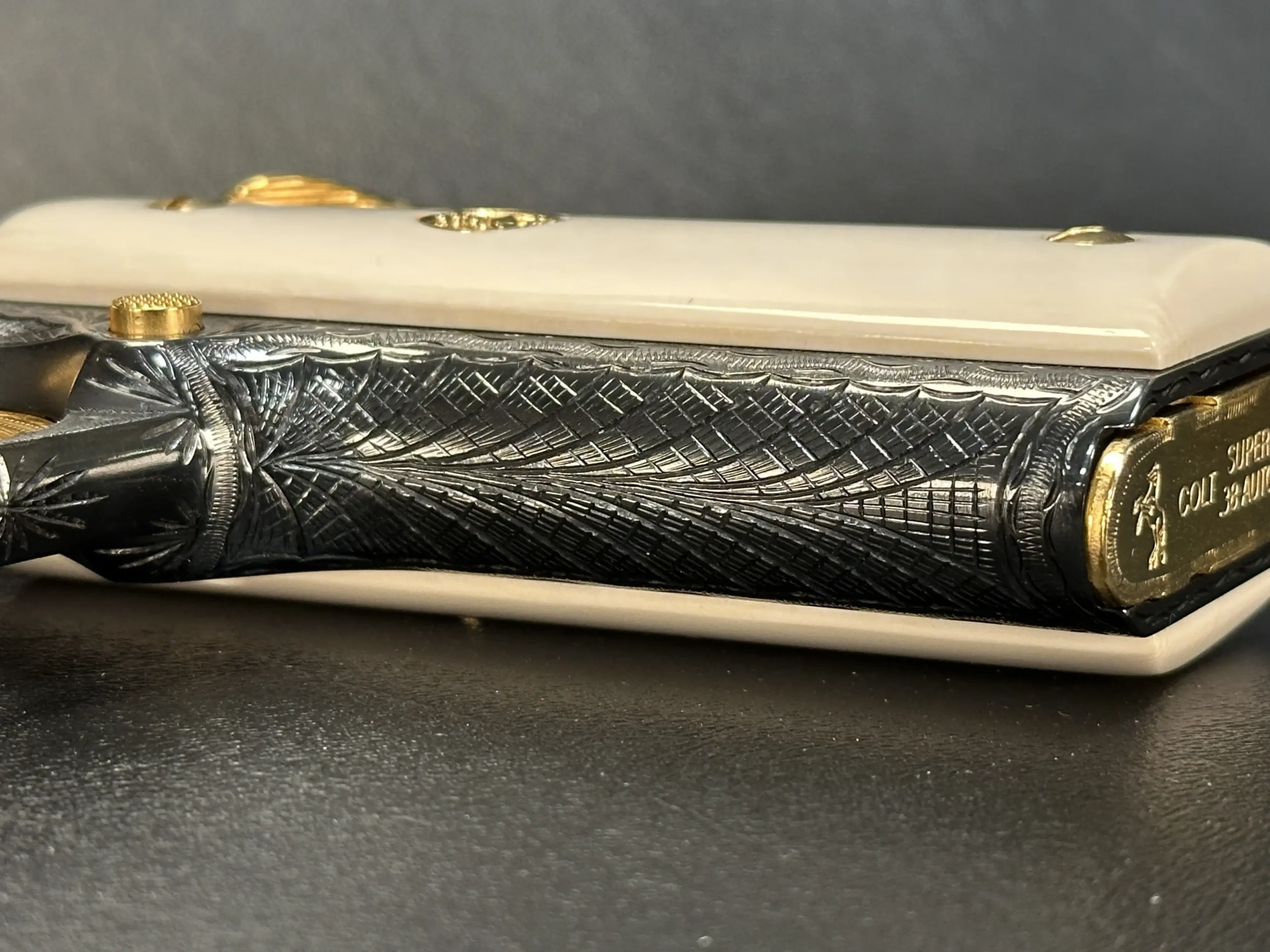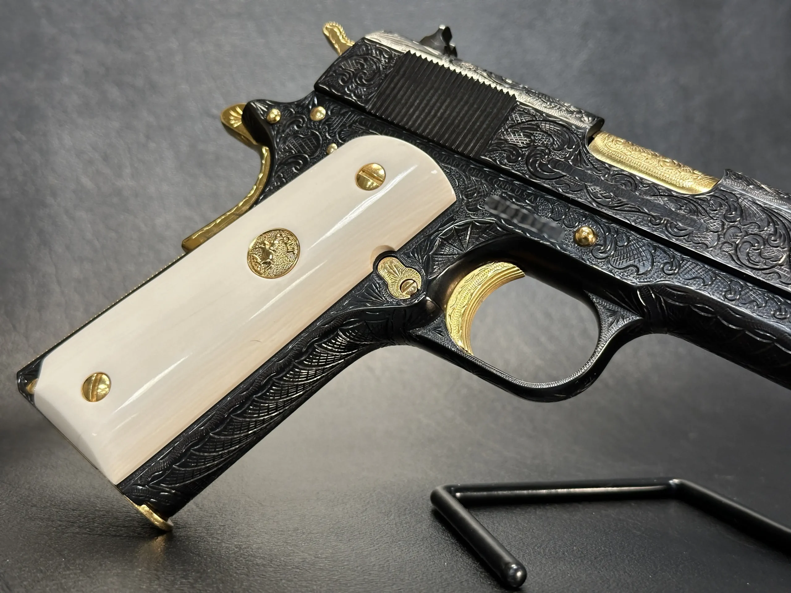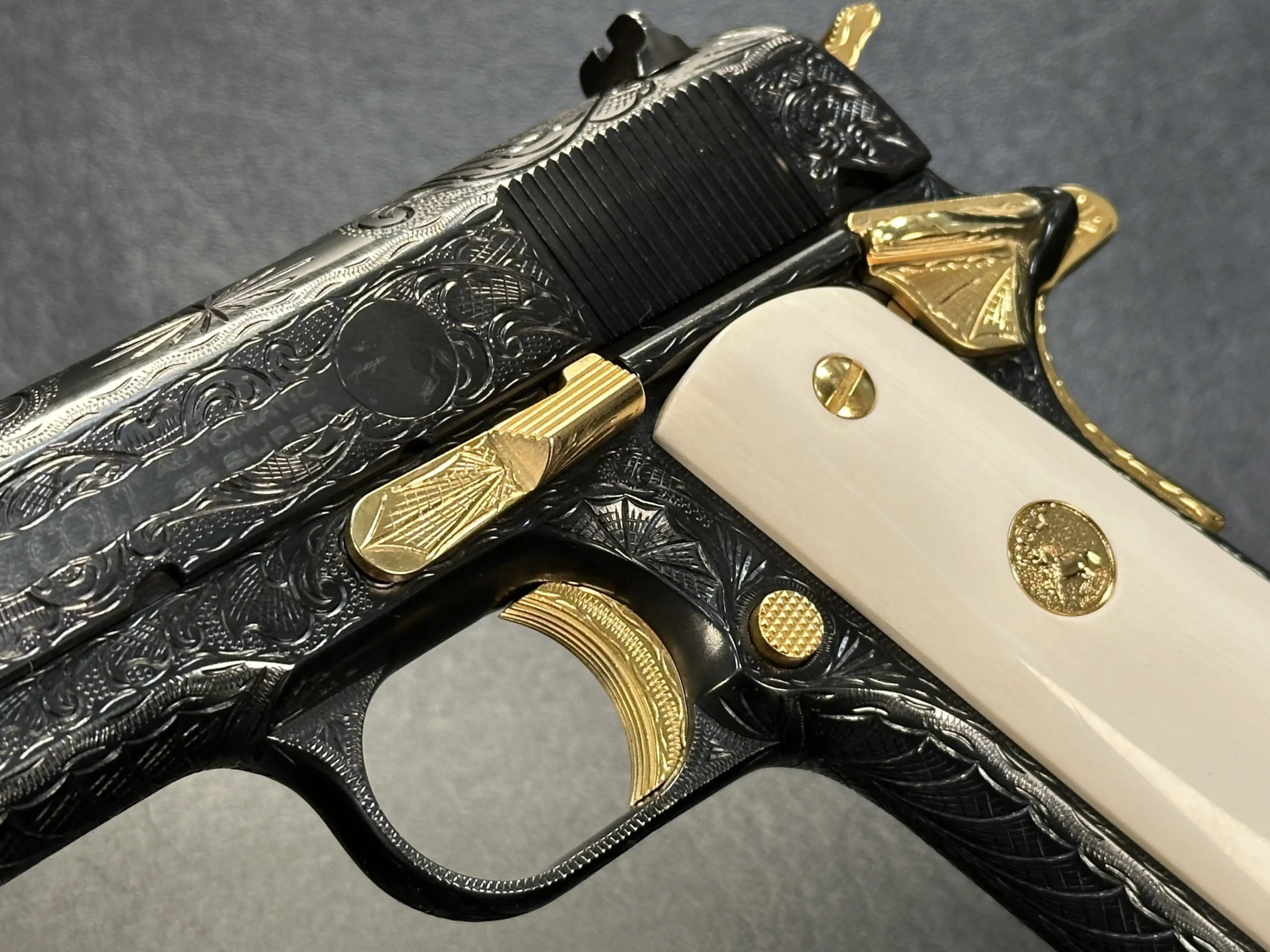 The pistol is fitted with ivory-toned grip panels, polished smooth and secured with gold screws, with a gold Colt medallion on each panel. It is also accompanied by a Certificate of Engraving documenting the decorative work. Built on the Series 70 configuration, it retains the traditional Government Model character while presenting a distinctly embellished finish.