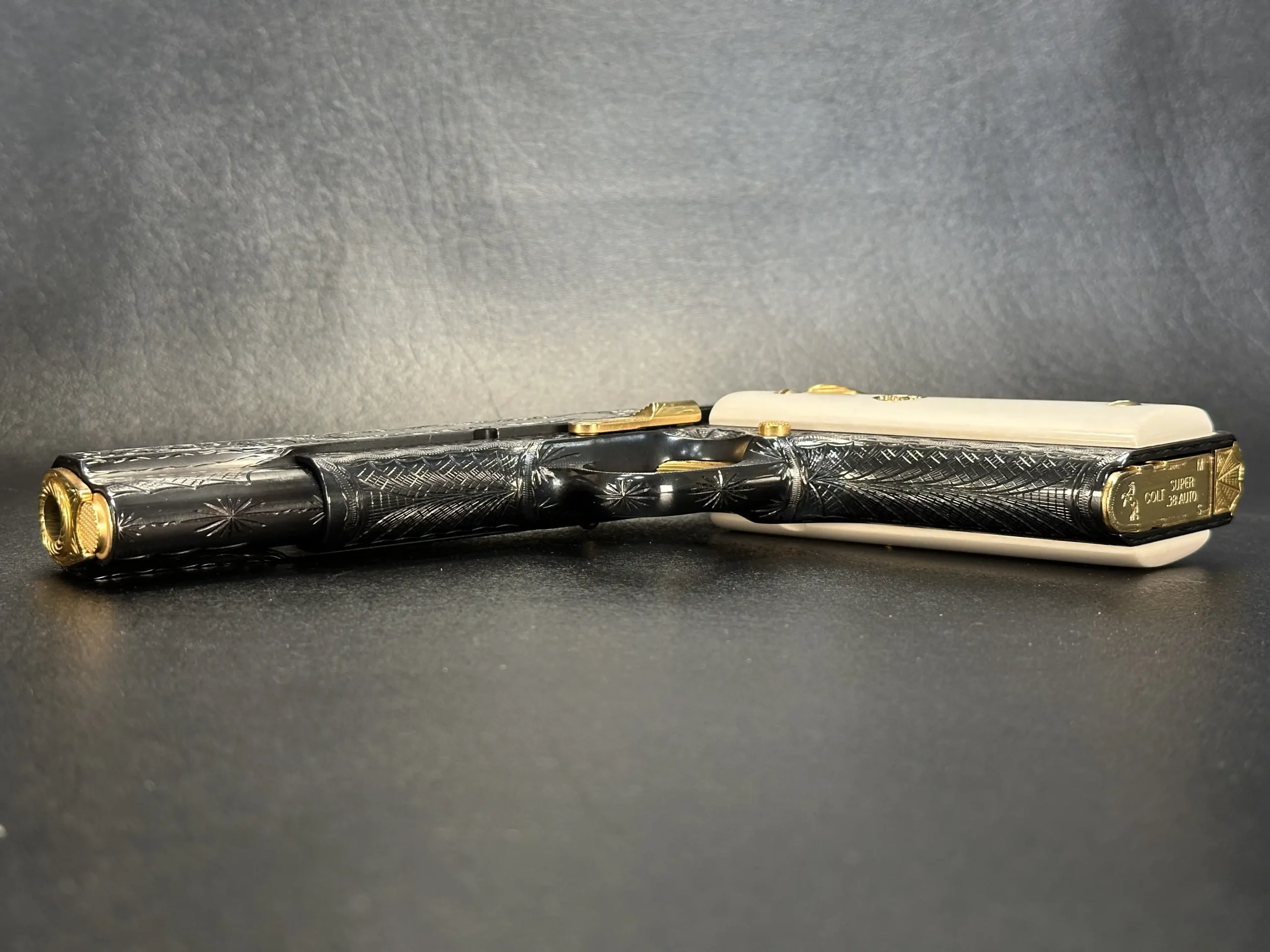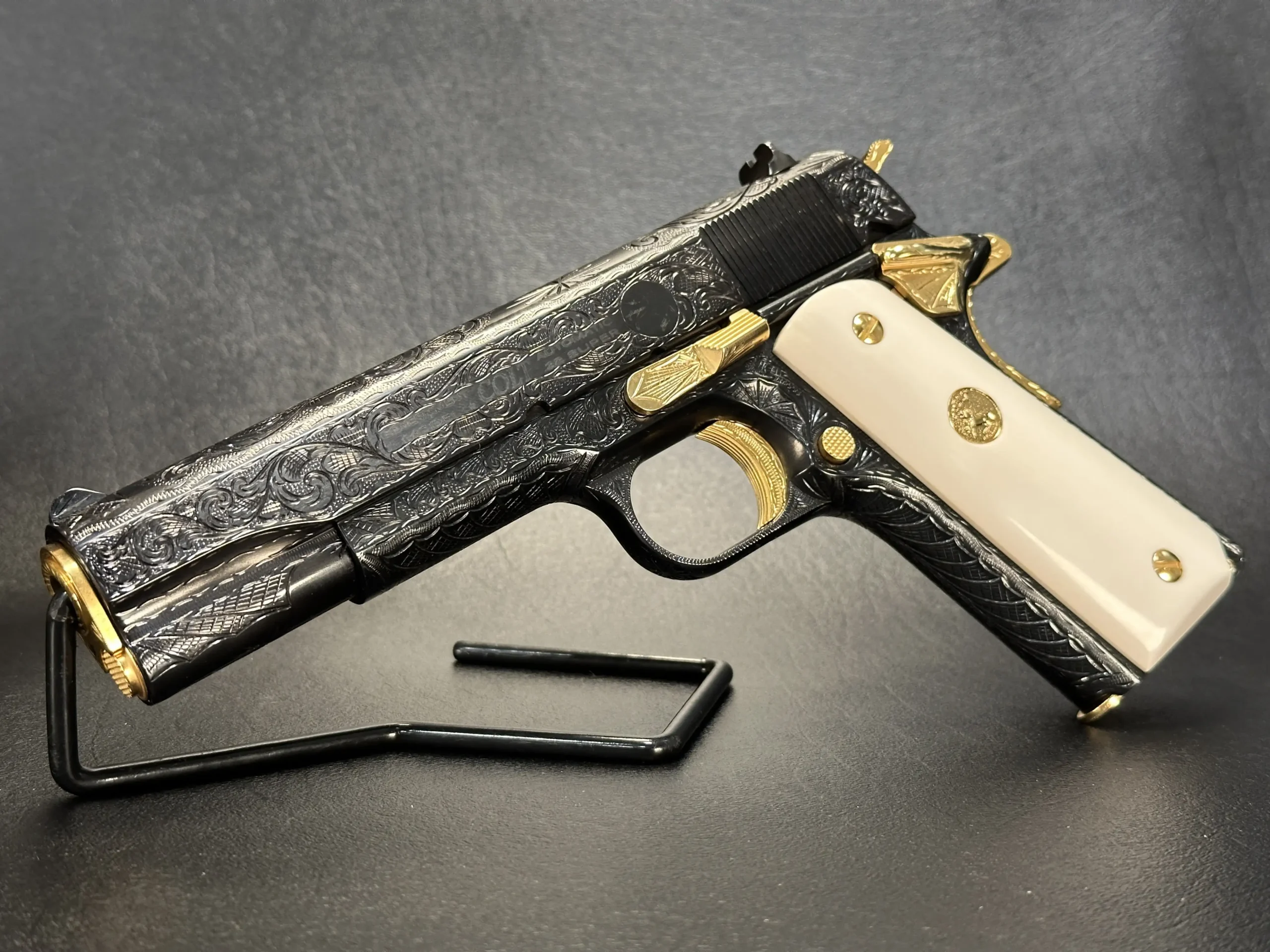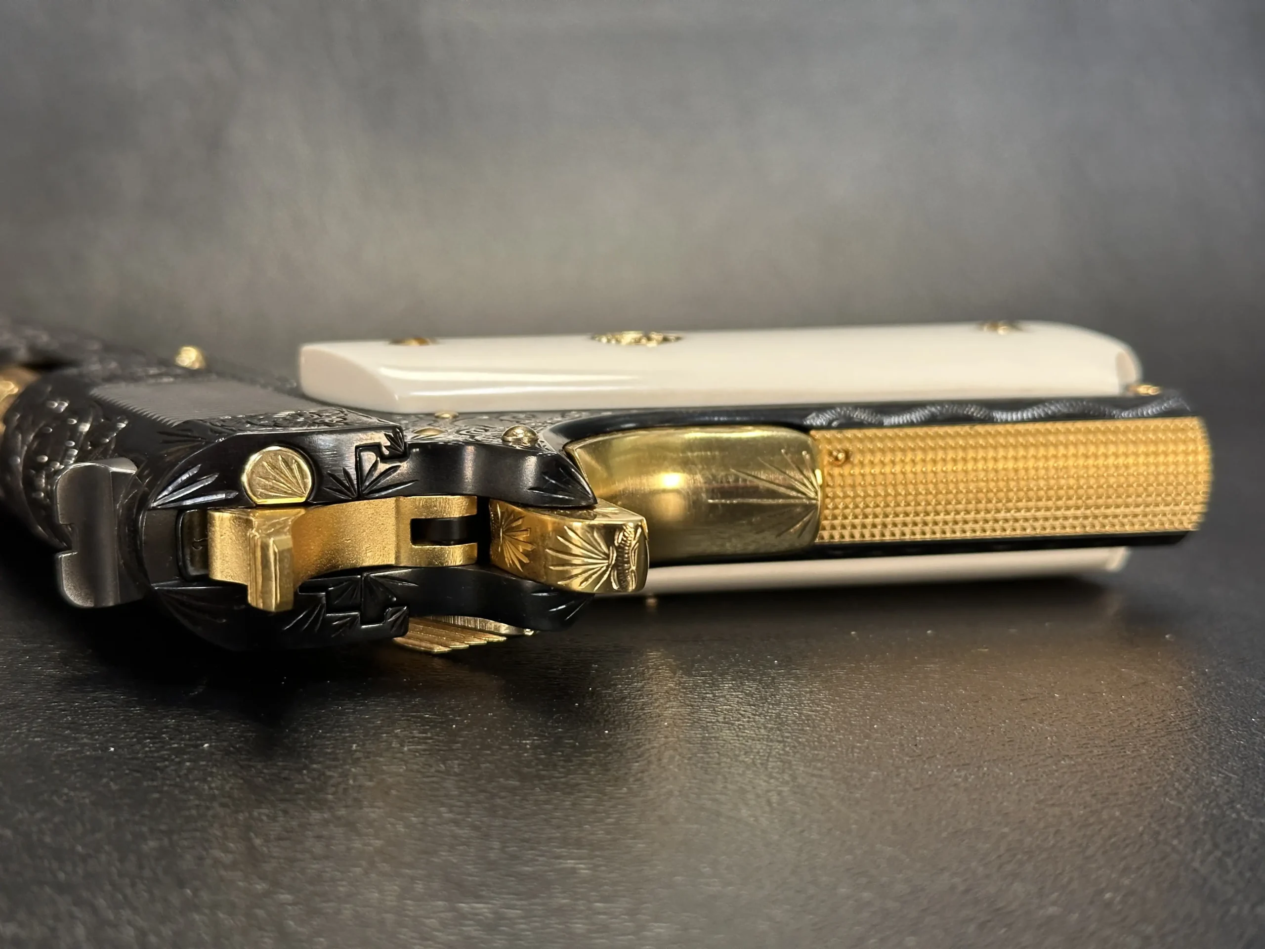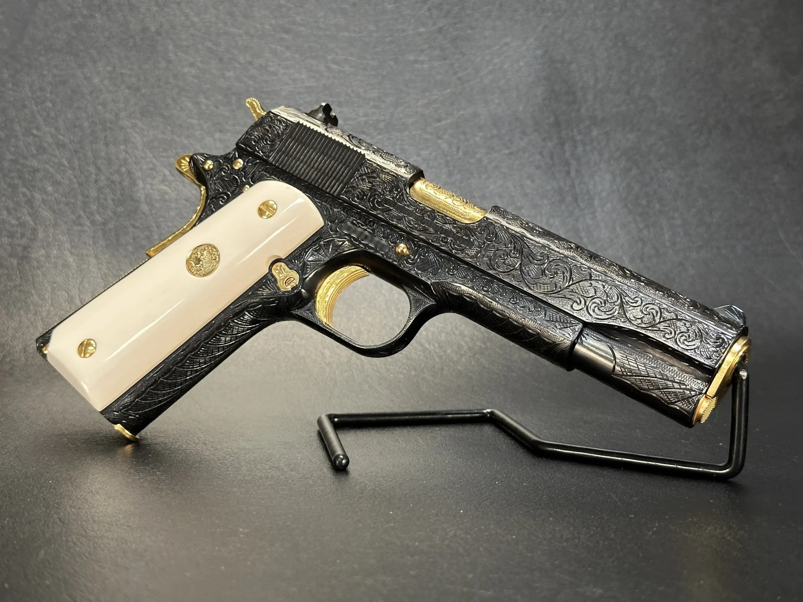 The pistol is fitted with ivory-toned grip panels, polished smooth and secured with gold screws, with a gold Colt medallion on each panel. It is also accompanied by a Certificate of Engraving documenting the decorative work. Built on the Series 70 configuration, it retains the traditional Government Model character while presenting a distinctly embellished finish.