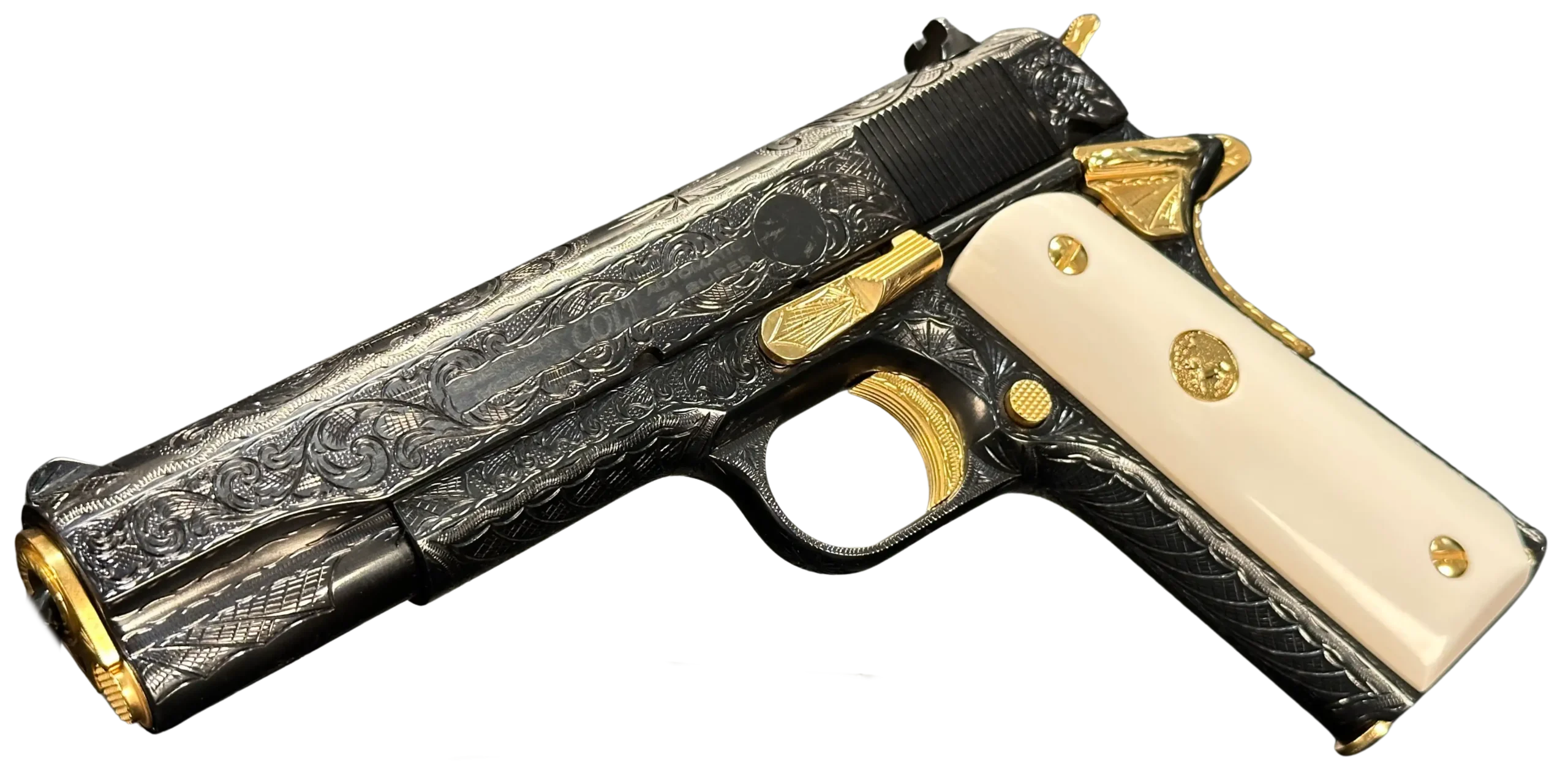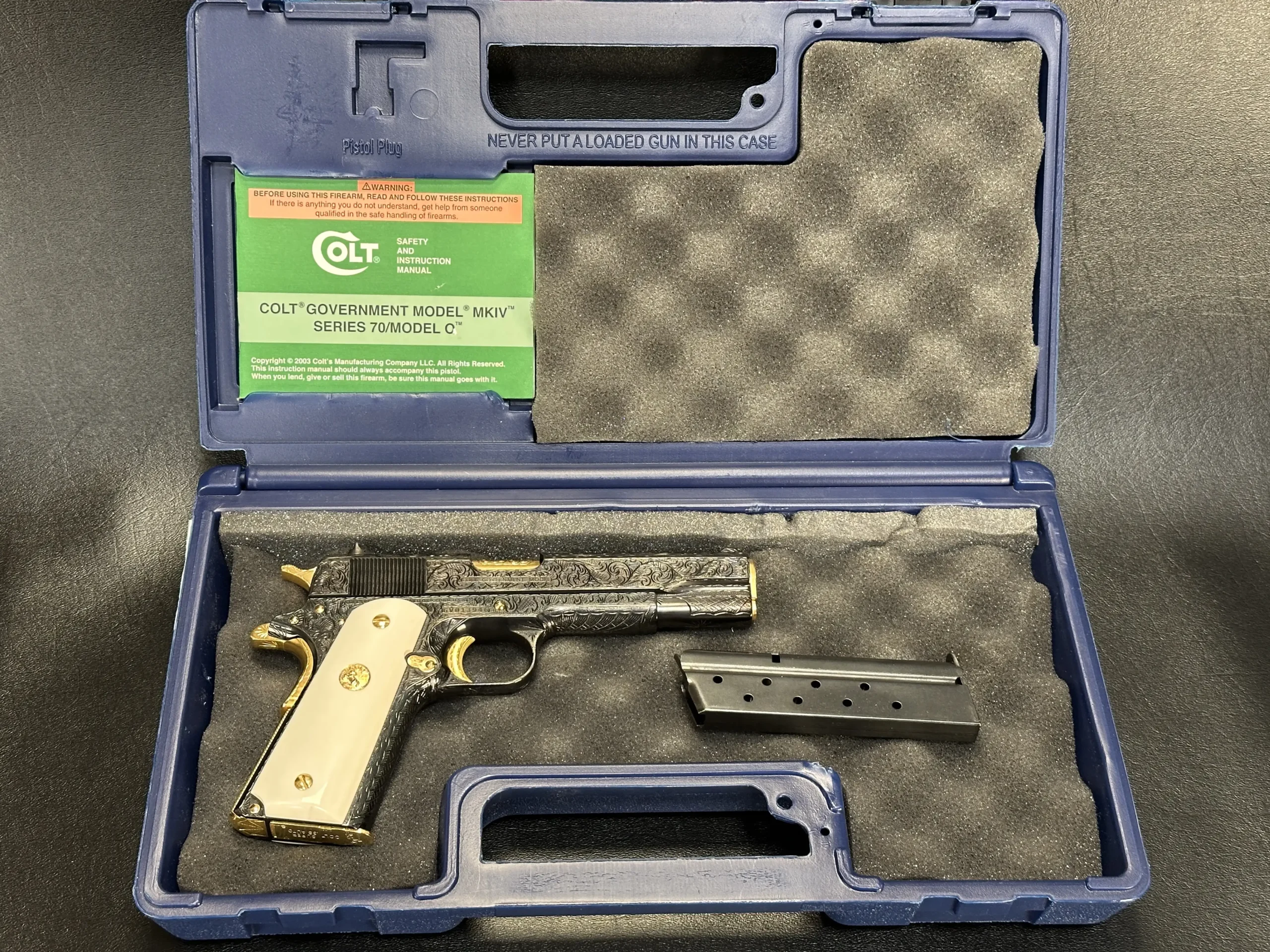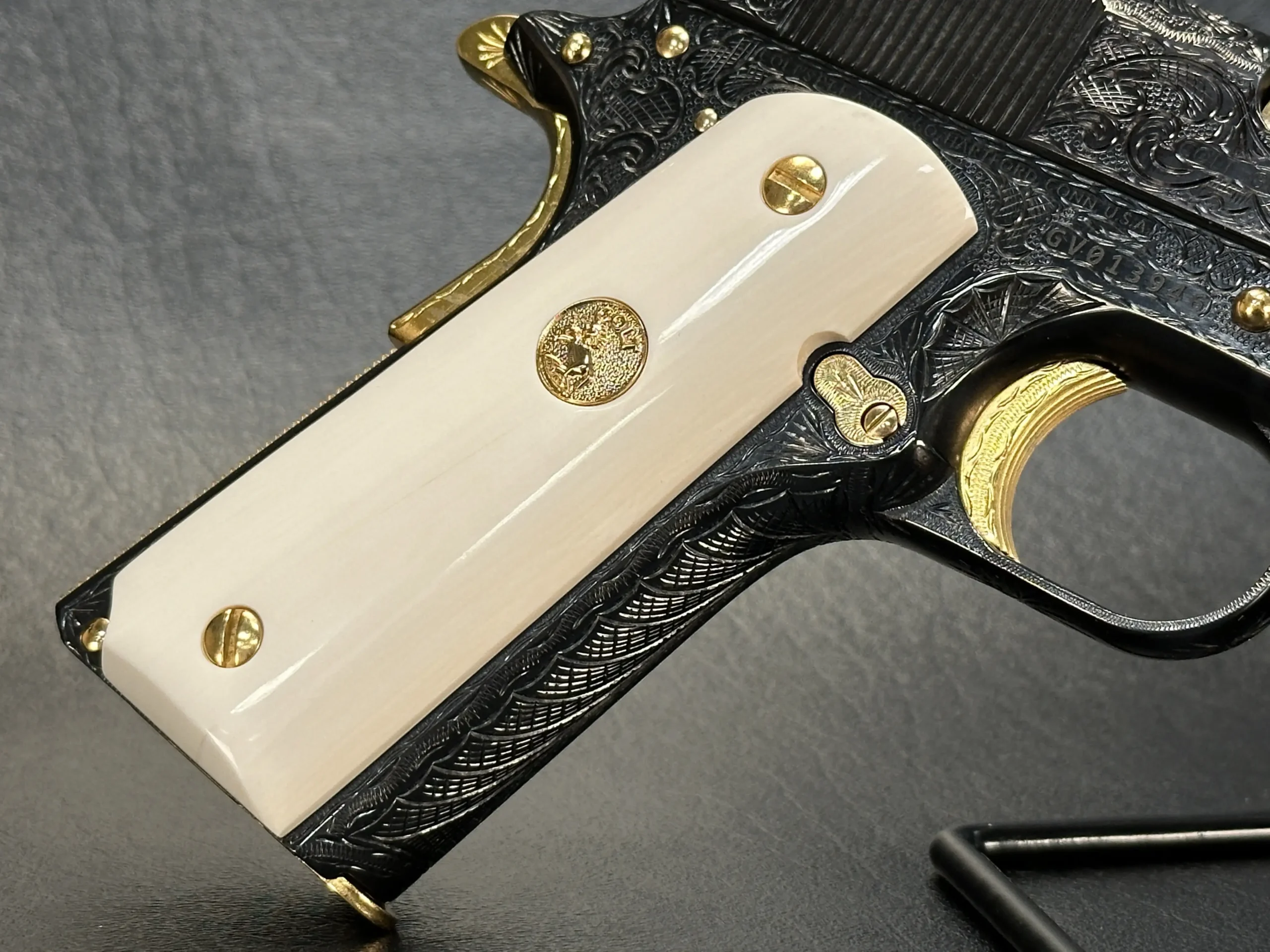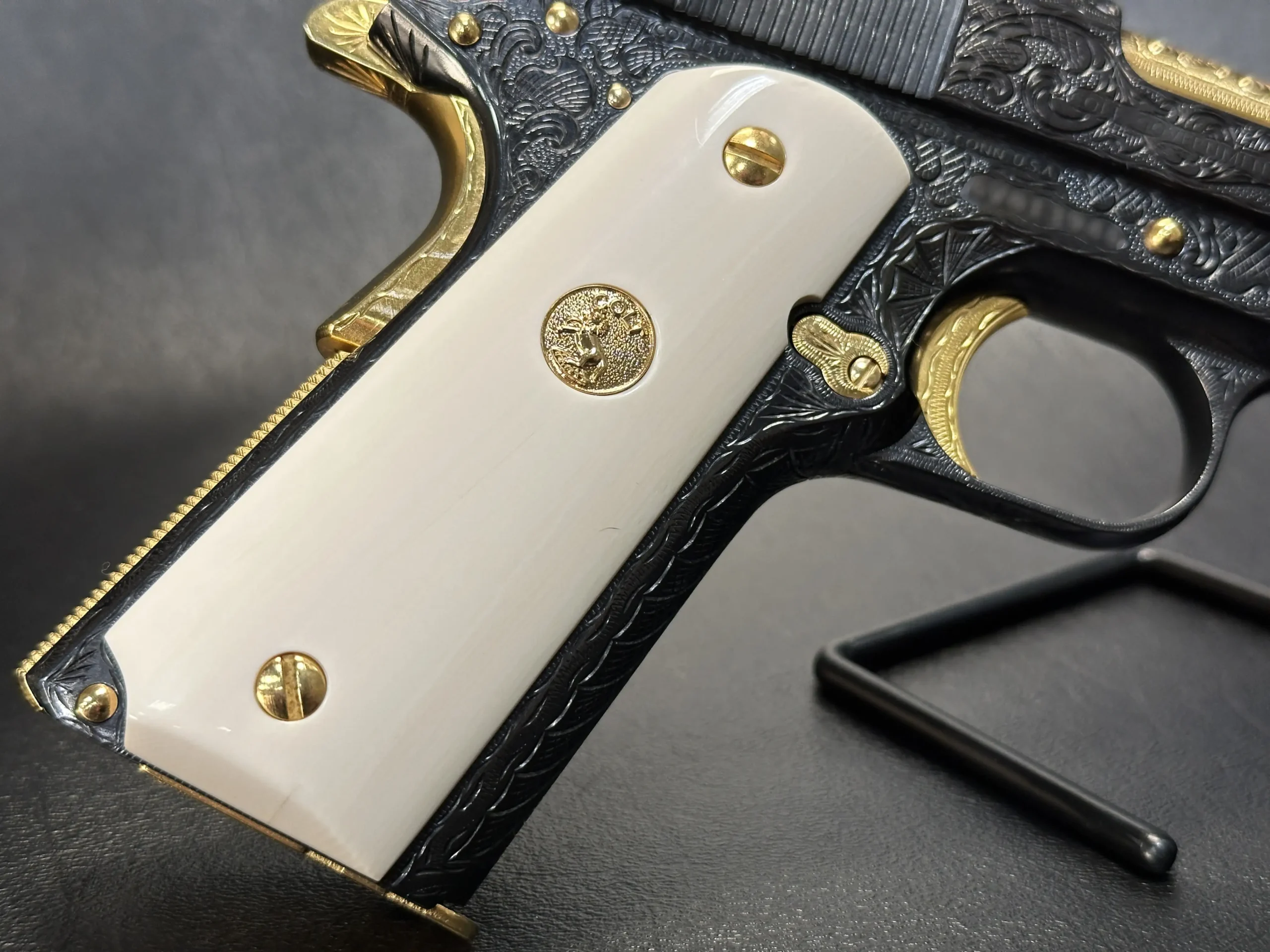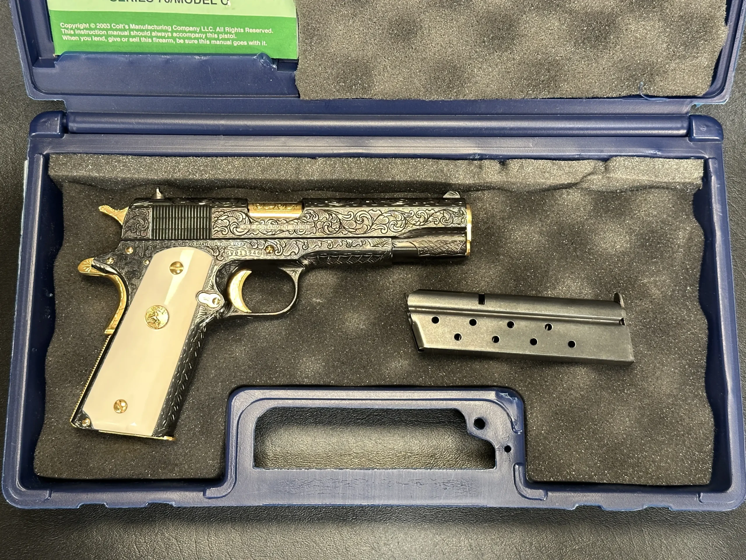 The pistol is fitted with ivory-toned grip panels, polished smooth and secured with gold screws, with a gold Colt medallion on each panel. It is also accompanied by a Certificate of Engraving documenting the decorative work. Built on the Series 70 configuration, it retains the traditional Government Model character while presenting a distinctly embellished finish.