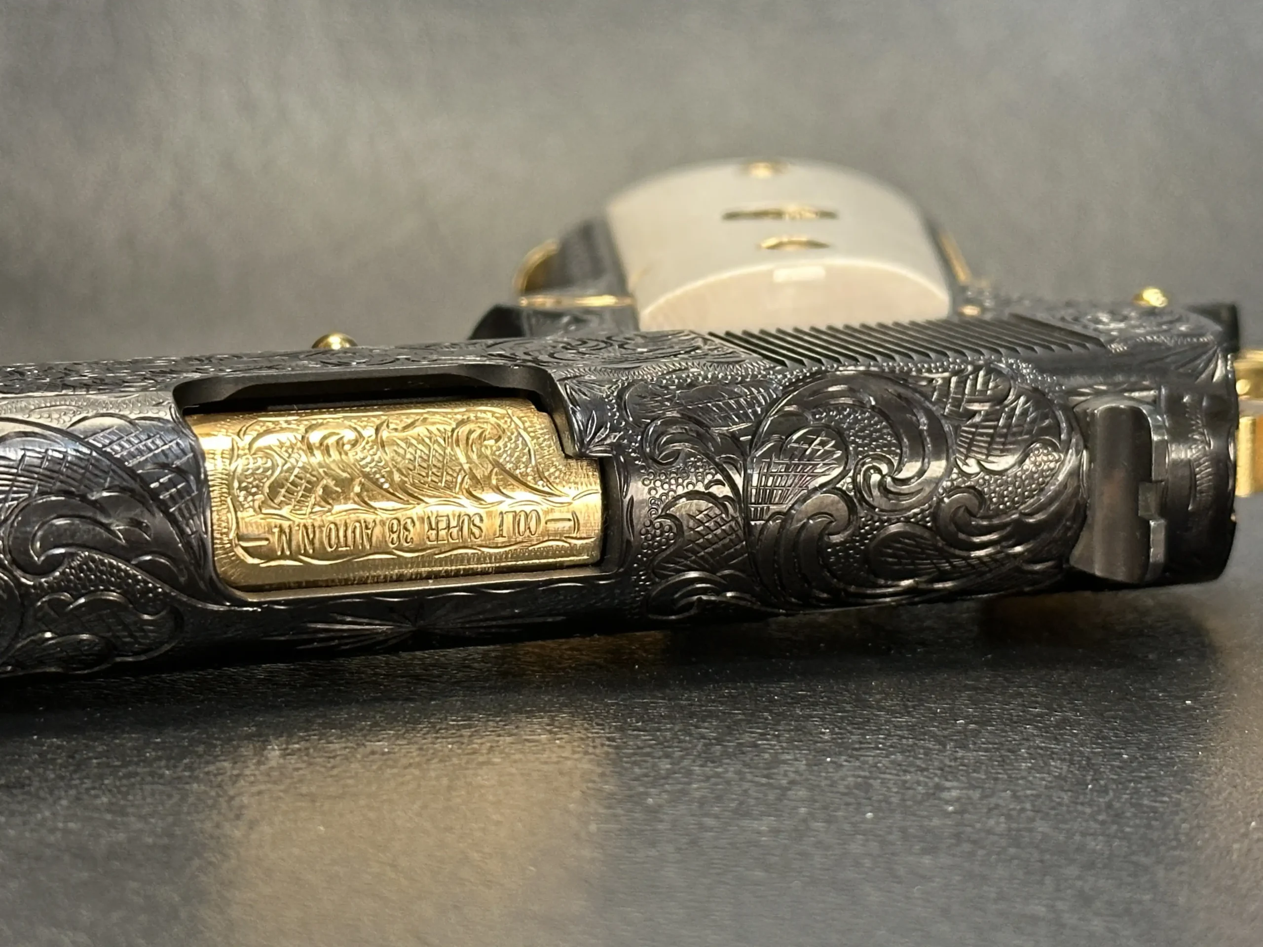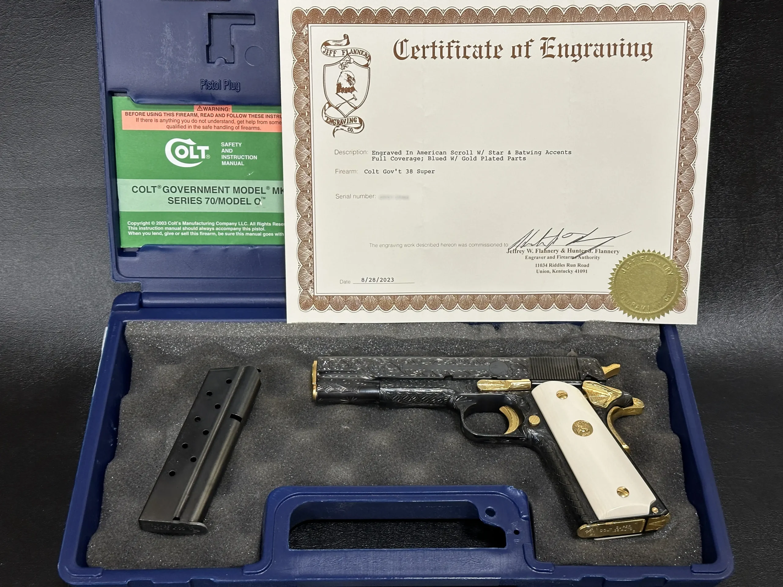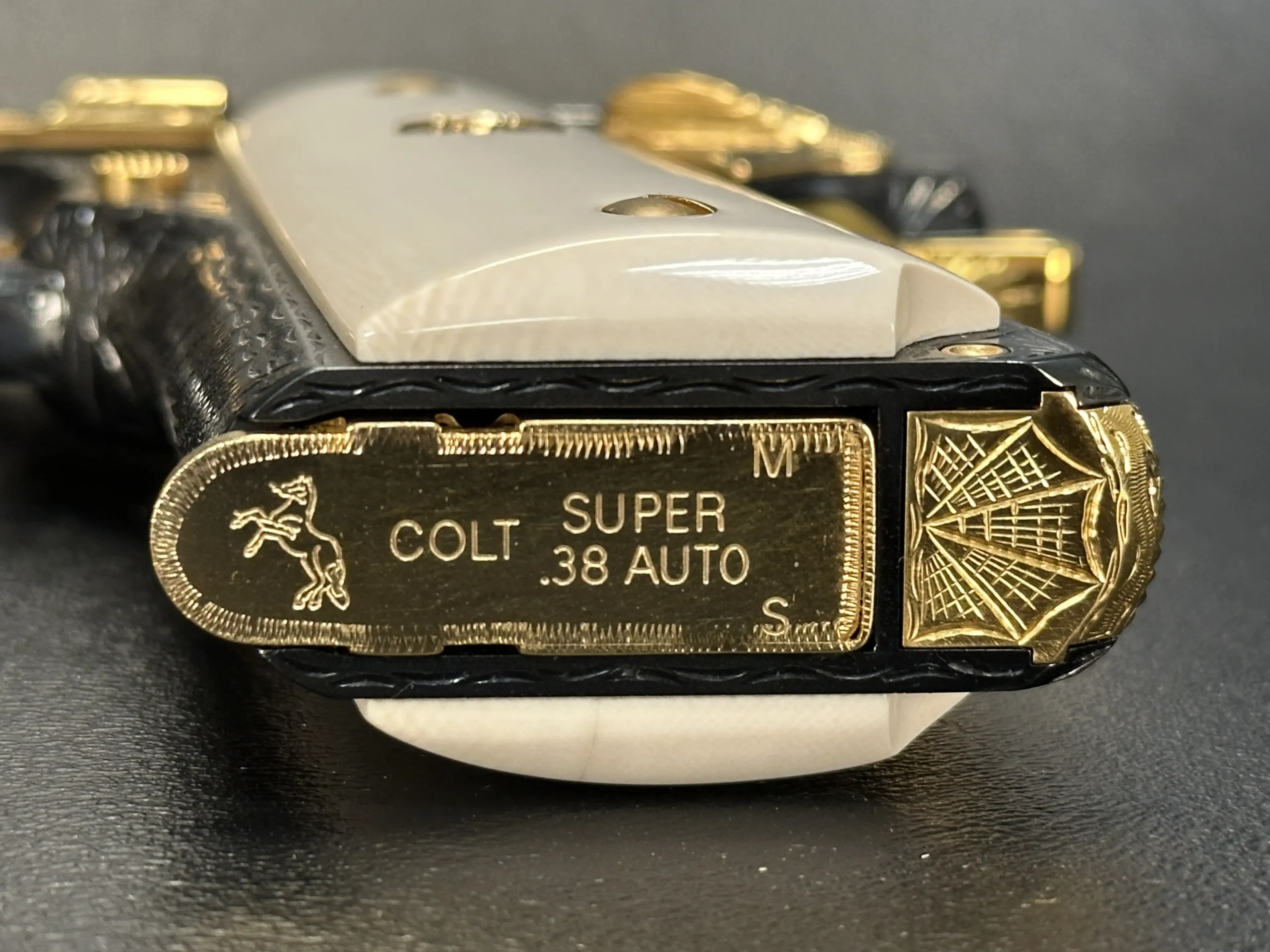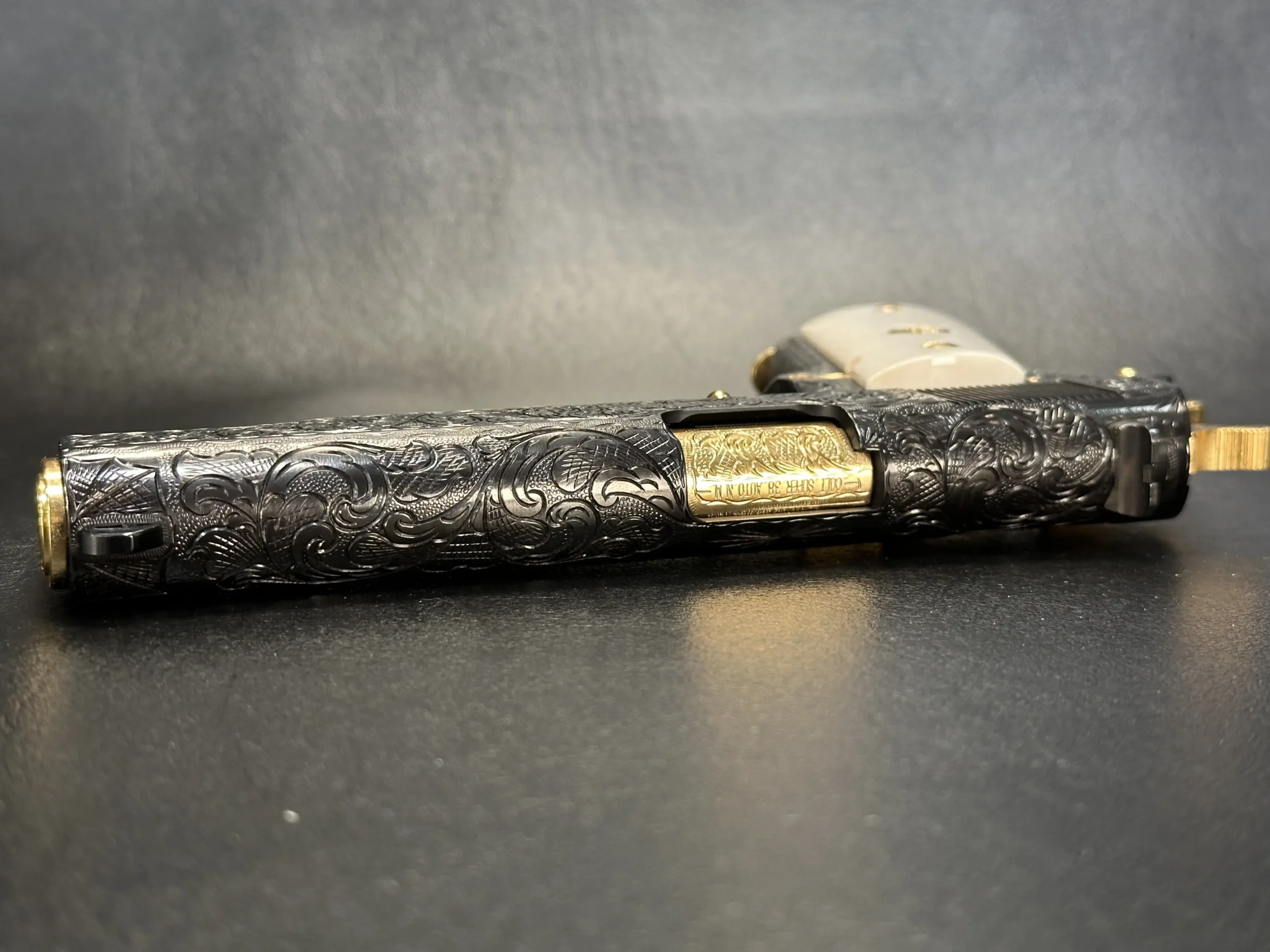 The pistol is fitted with ivory-toned grip panels, polished smooth and secured with gold screws, with a gold Colt medallion on each panel. It is also accompanied by a Certificate of Engraving documenting the decorative work. Built on the Series 70 configuration, it retains the traditional Government Model character while presenting a distinctly embellished finish.