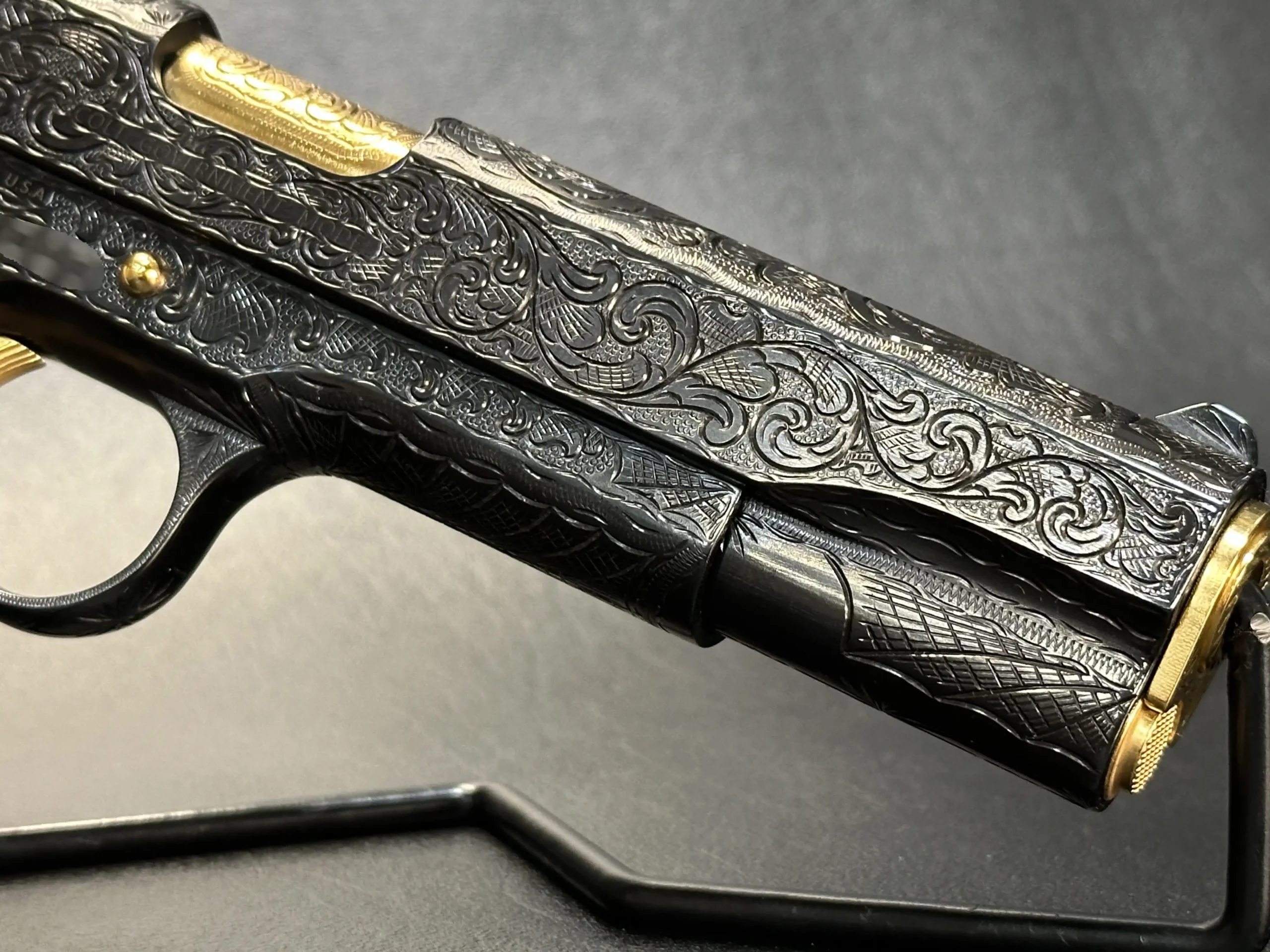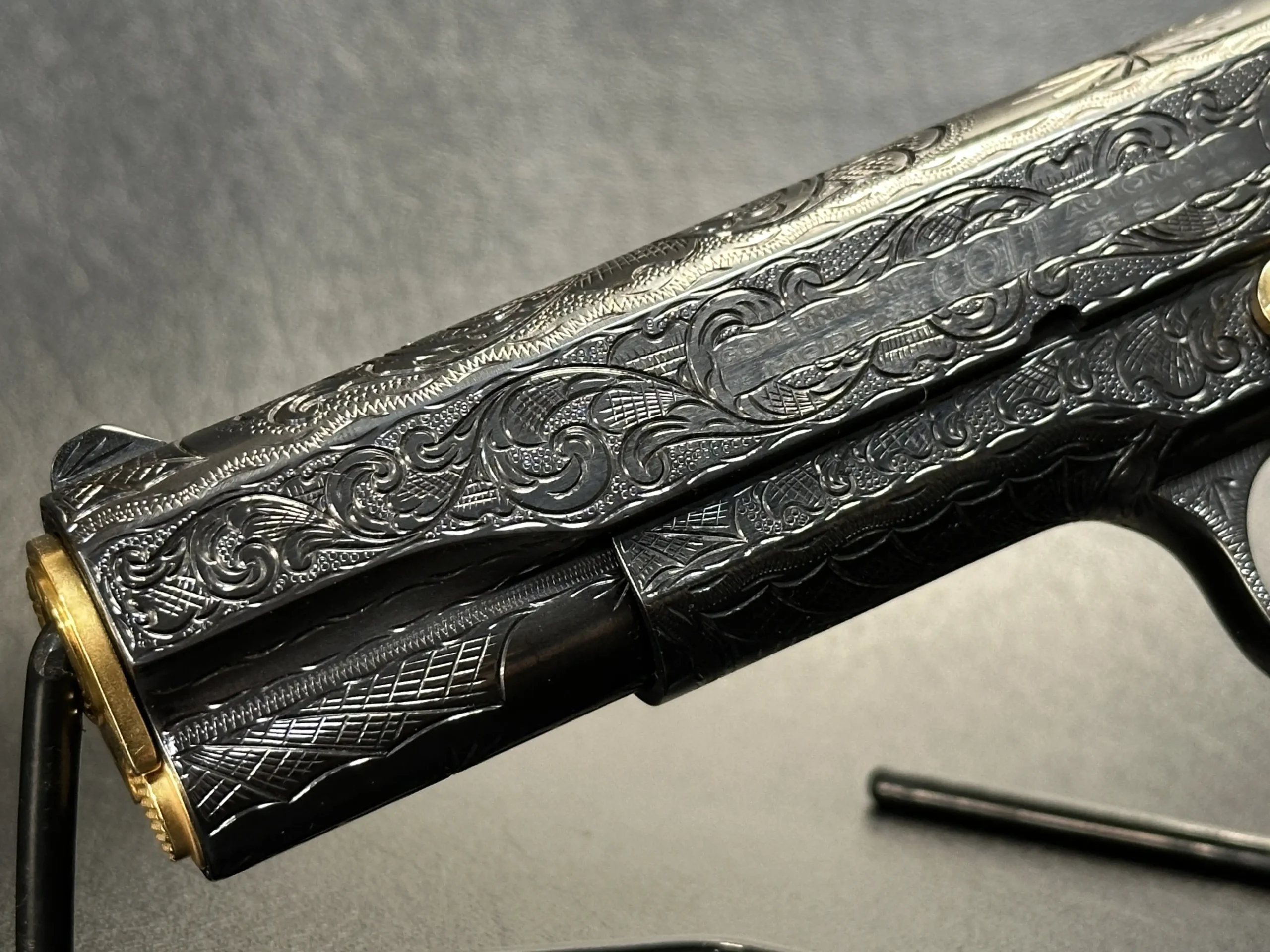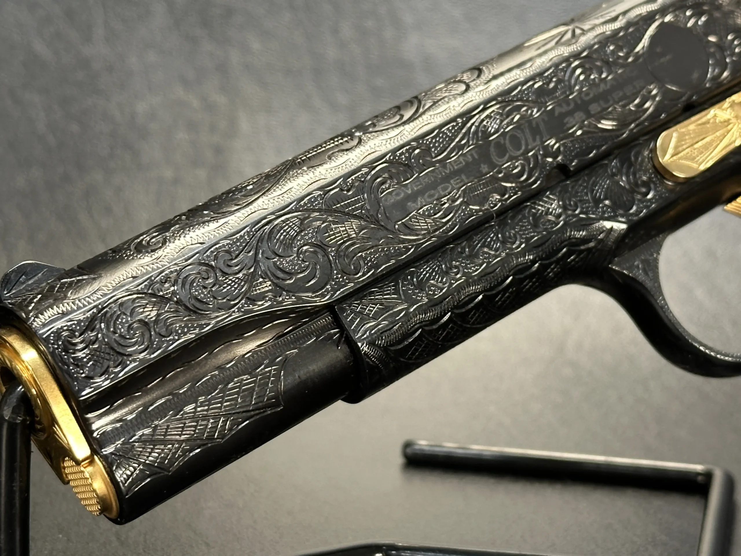 The Colt Government Model Series 70 brings together the classic profile of Colt’s flagship semi-automatic pistol with extensive decorative work. This example is chambered in .45 Colt and features full-coverage American scroll engraving across the slide and frame, with star and batwing accent motifs worked into the design.