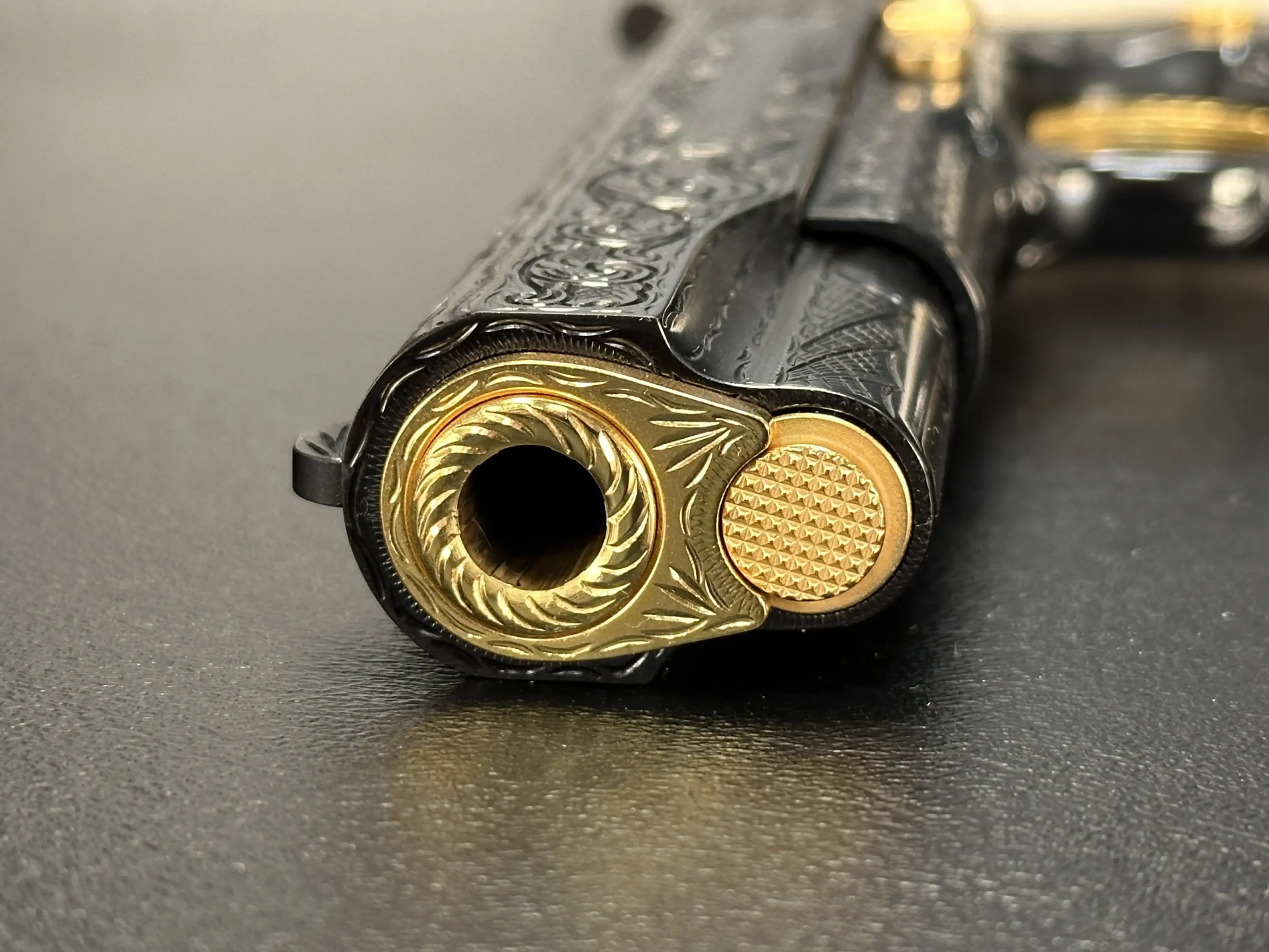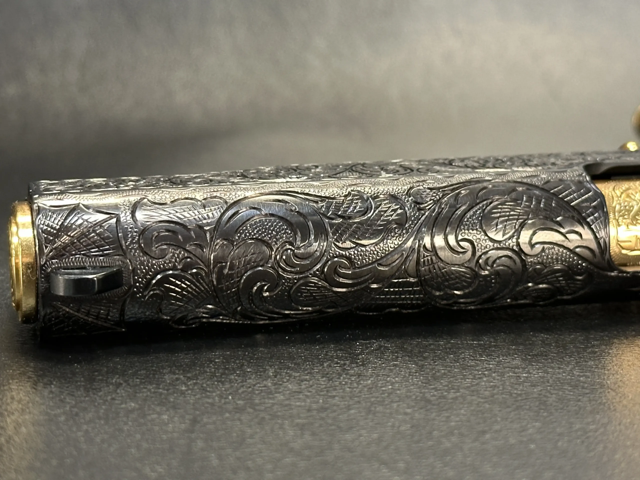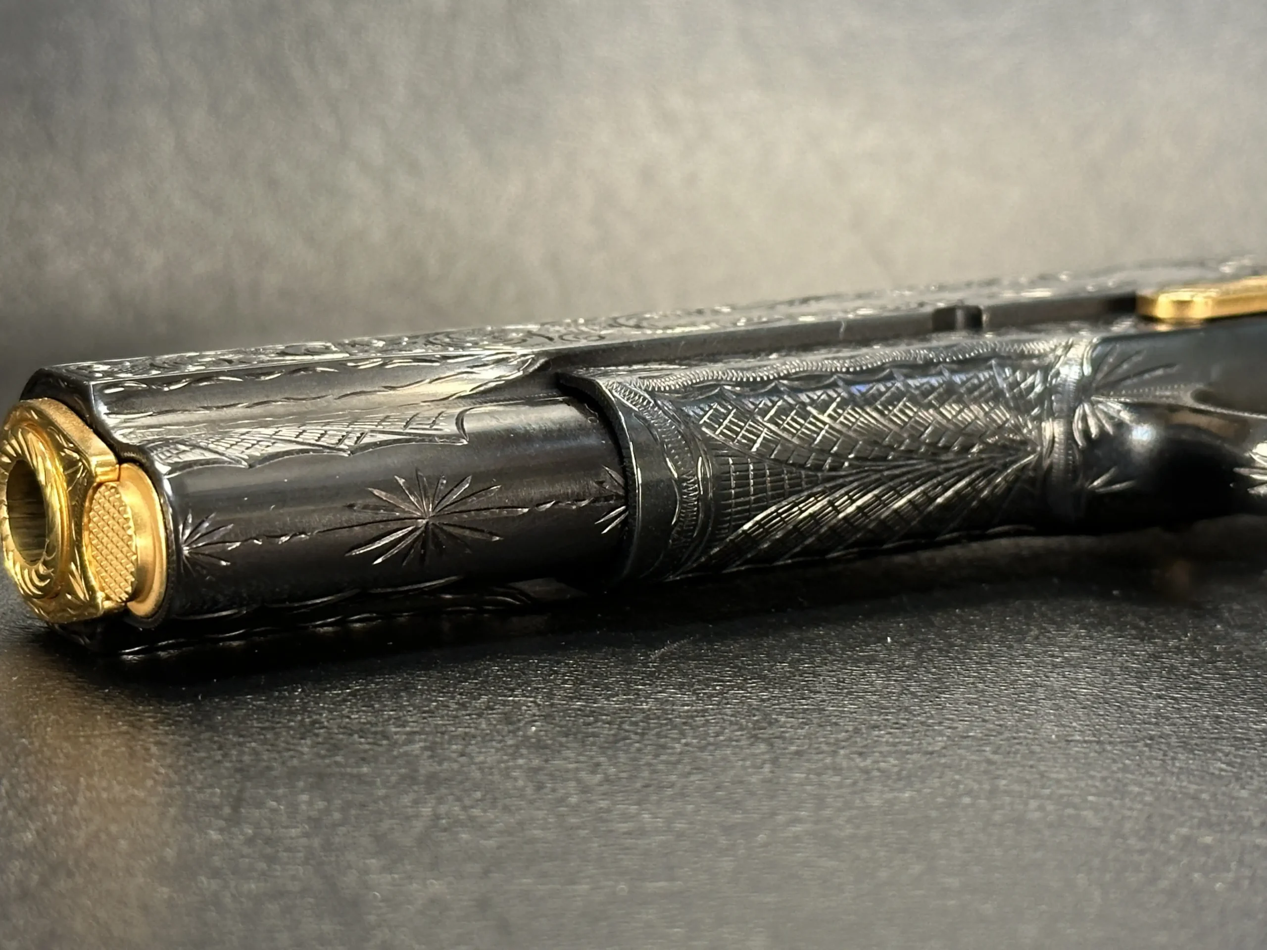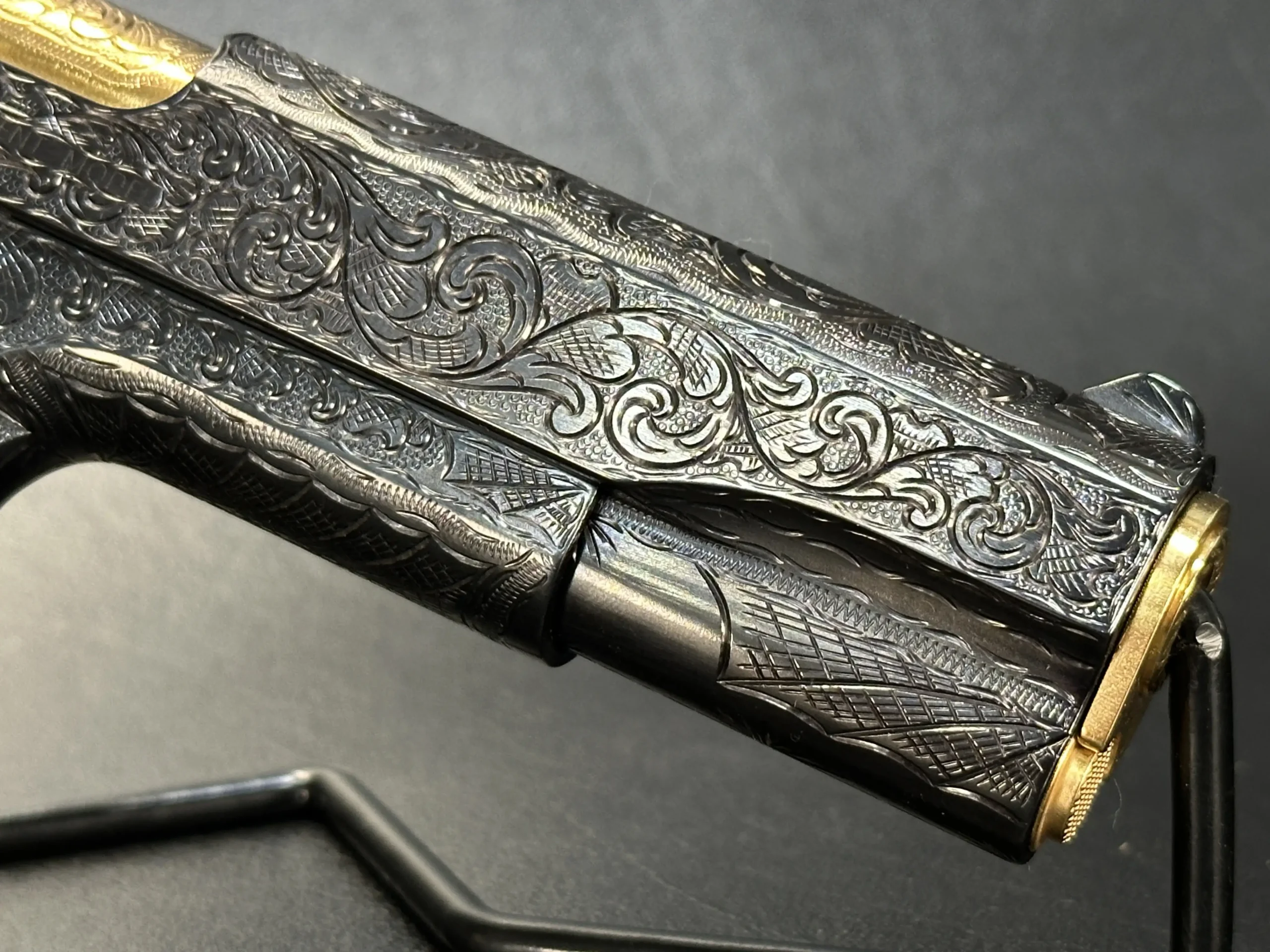 The Colt Government Model Series 70 brings together the classic profile of Colt’s flagship semi-automatic pistol with extensive decorative work. This example is chambered in .45 Colt and features full-coverage American scroll engraving across the slide and frame, with star and batwing accent motifs worked into the design.