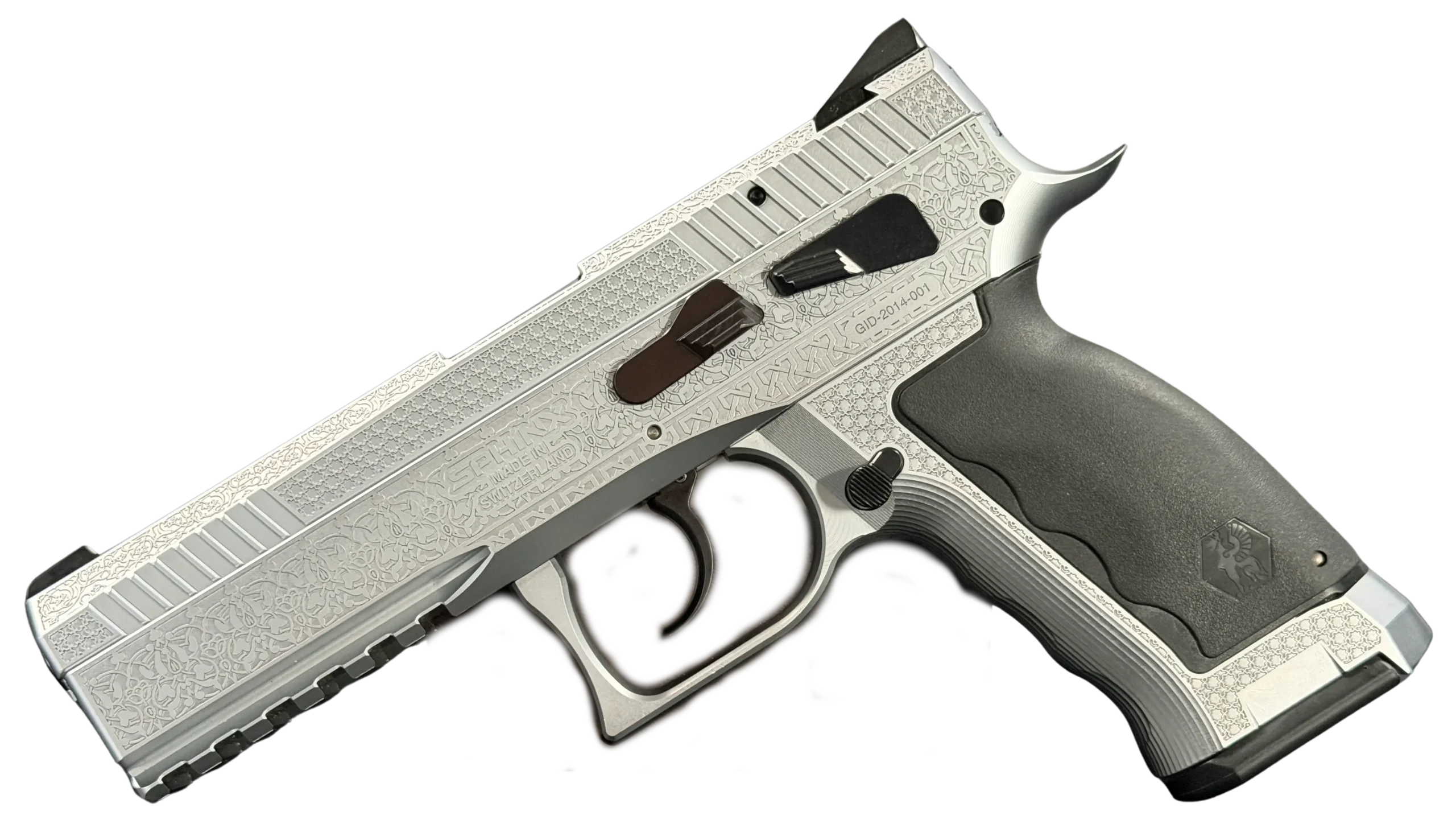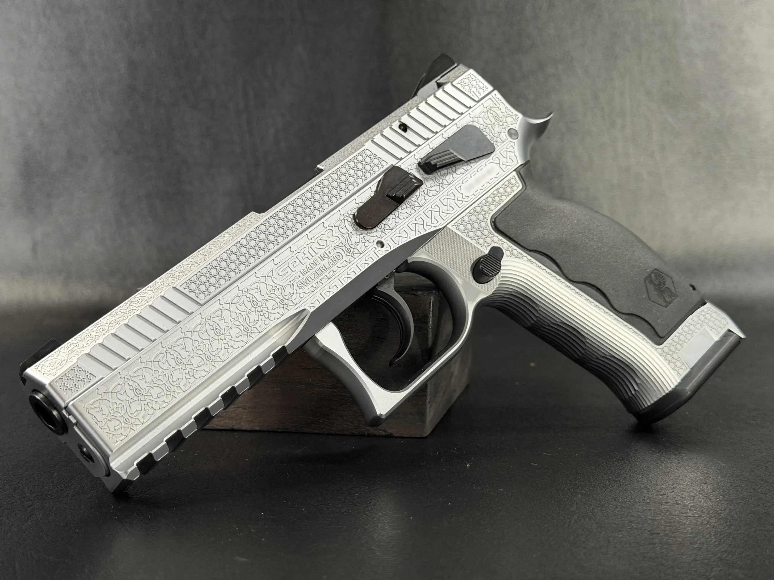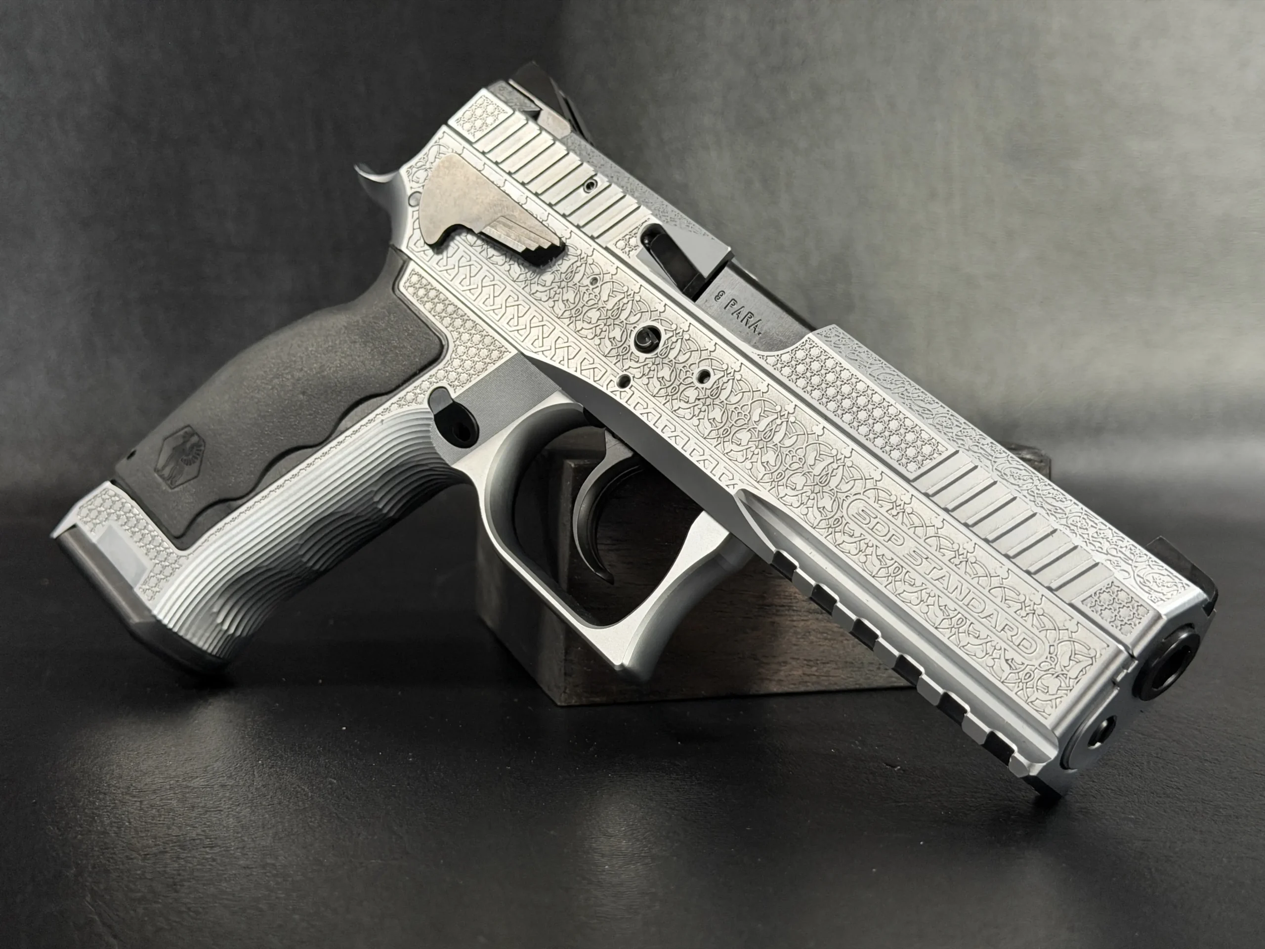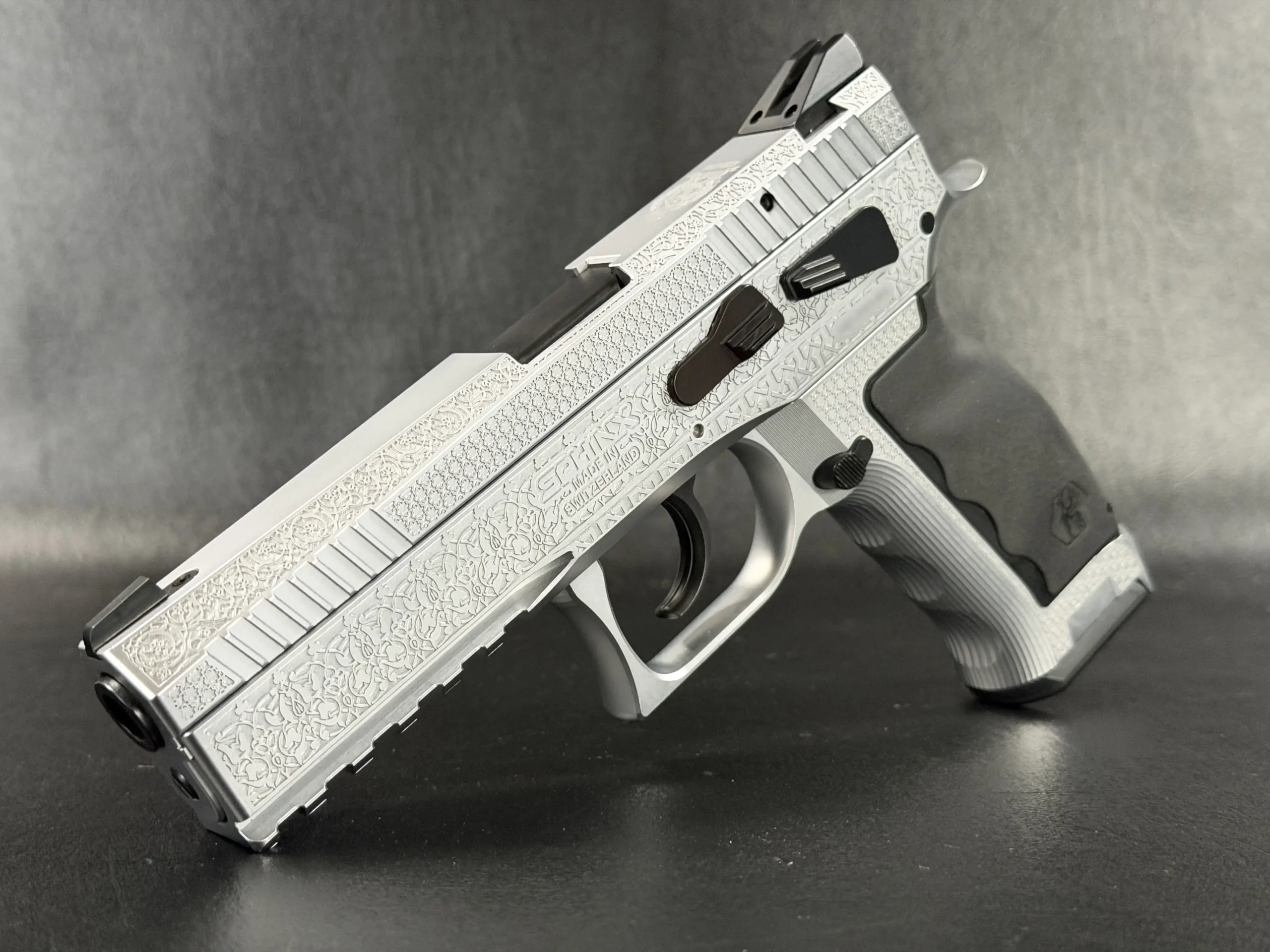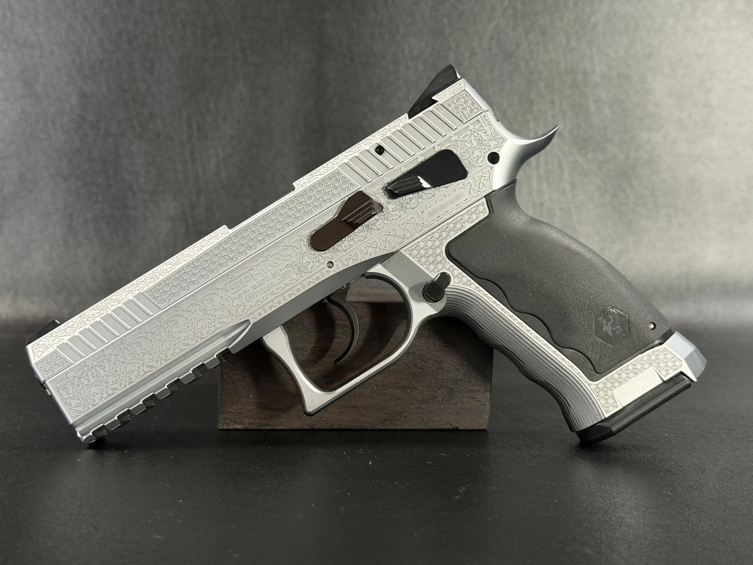 The Engraved Sphinx SDP Standard Inox is a stainless steel pre-series presentation example built on the SDP platform and chambered in 9mm Parabellum. Developed for the Jordanian Intelligence Service and intended for presentation to King Abdullah II of Jordan, this pistol reflects the refined mechanical design and visual restraint associated with Sphinx.