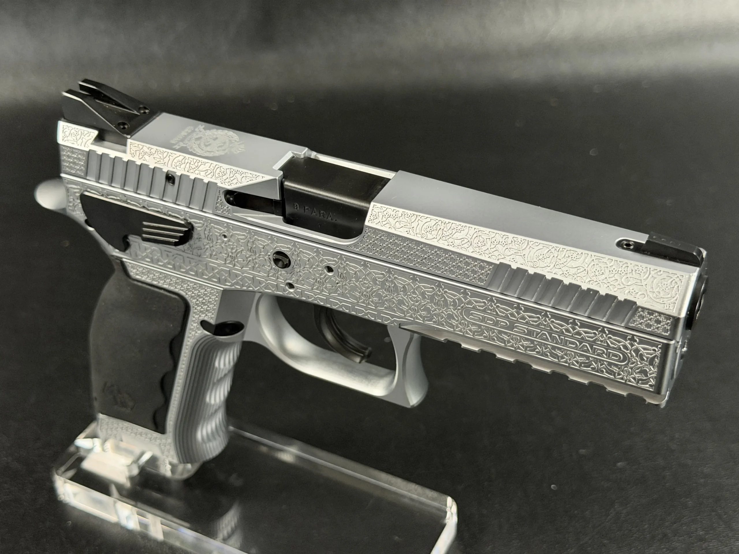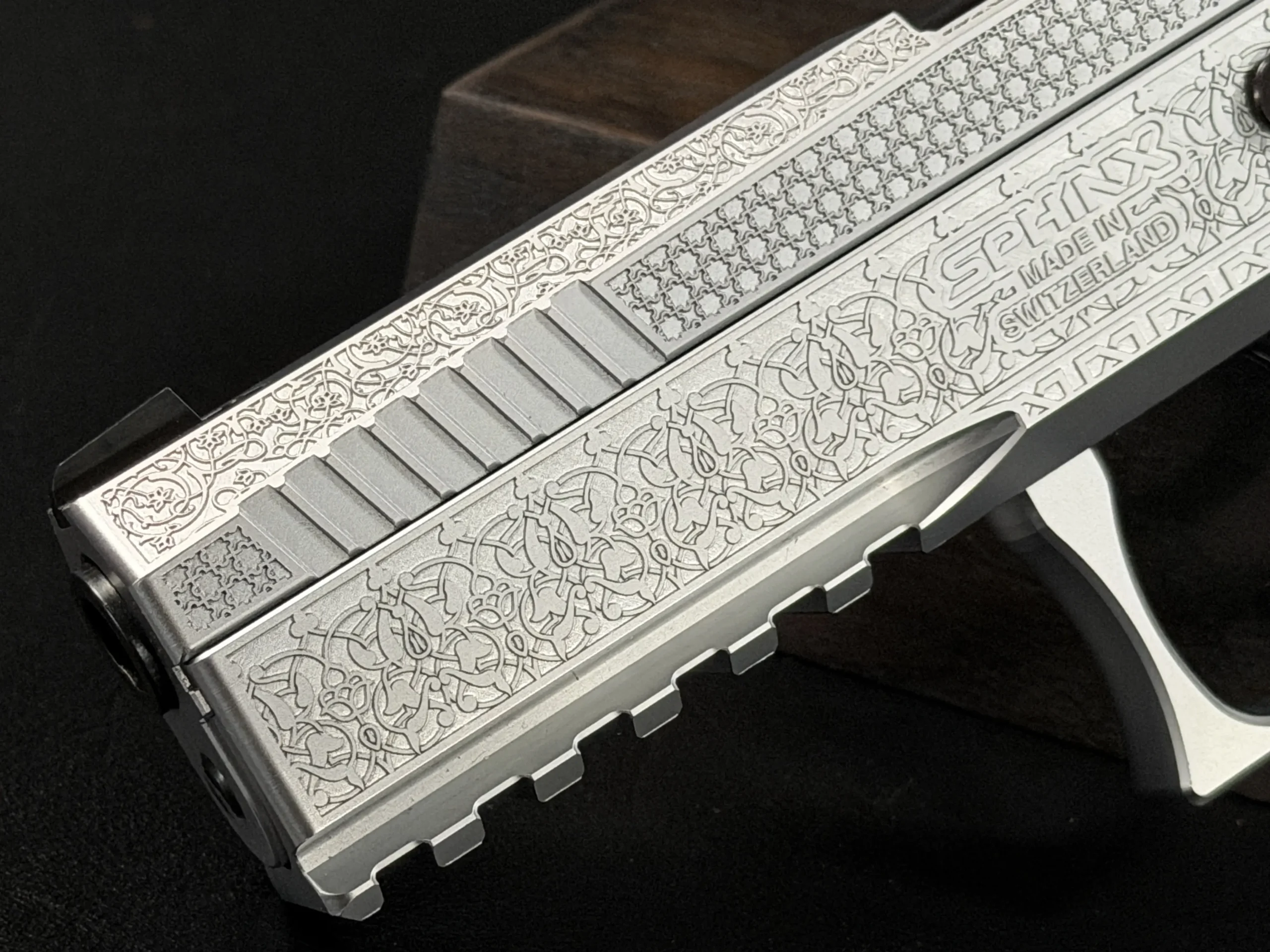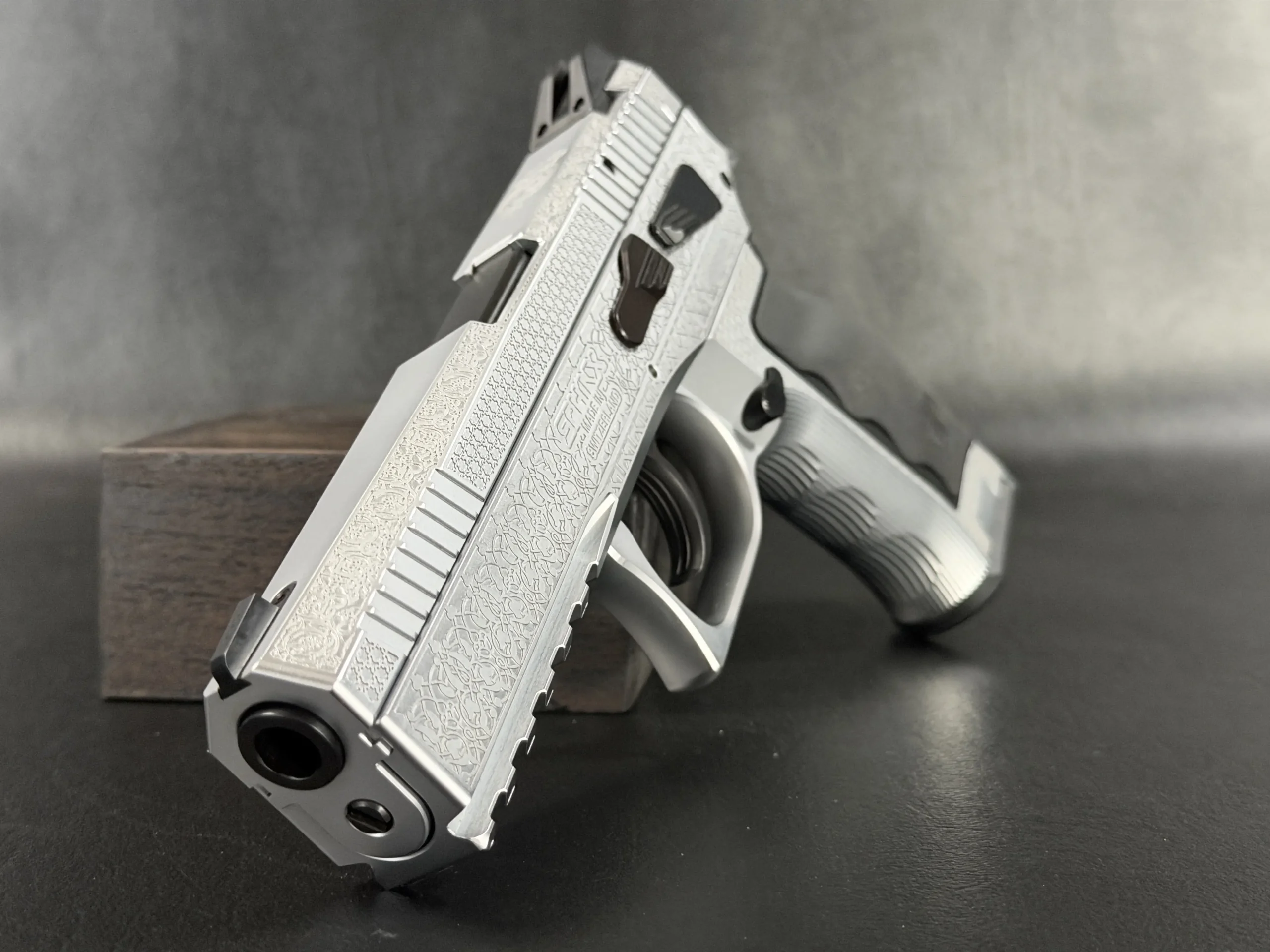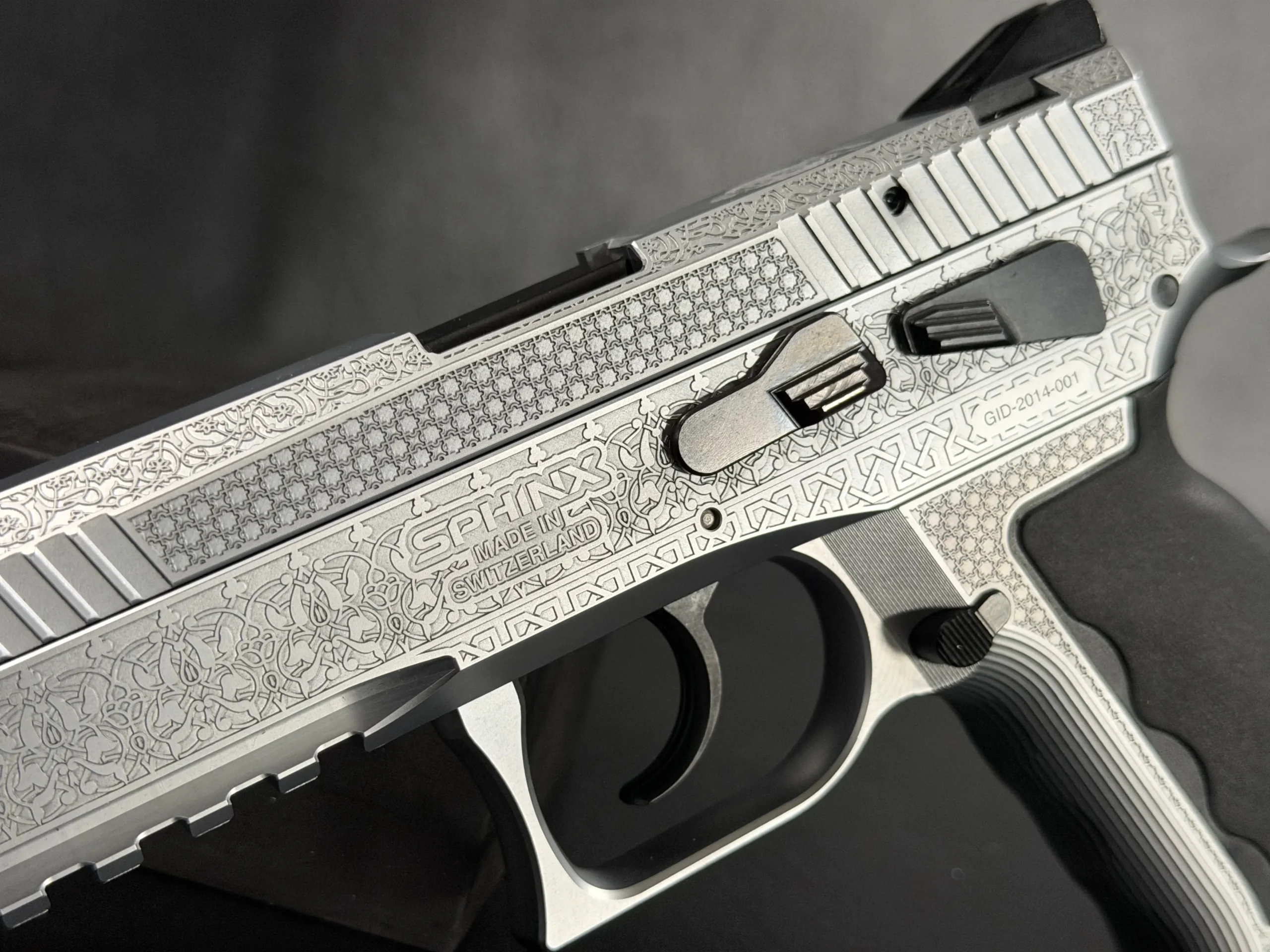 The Engraved Sphinx SDP Standard Inox is a stainless steel pre-series presentation example built on the SDP platform and chambered in 9mm Parabellum. Developed for the Jordanian Intelligence Service and intended for presentation to King Abdullah II of Jordan, this pistol reflects the refined mechanical design and visual restraint associated with Sphinx.