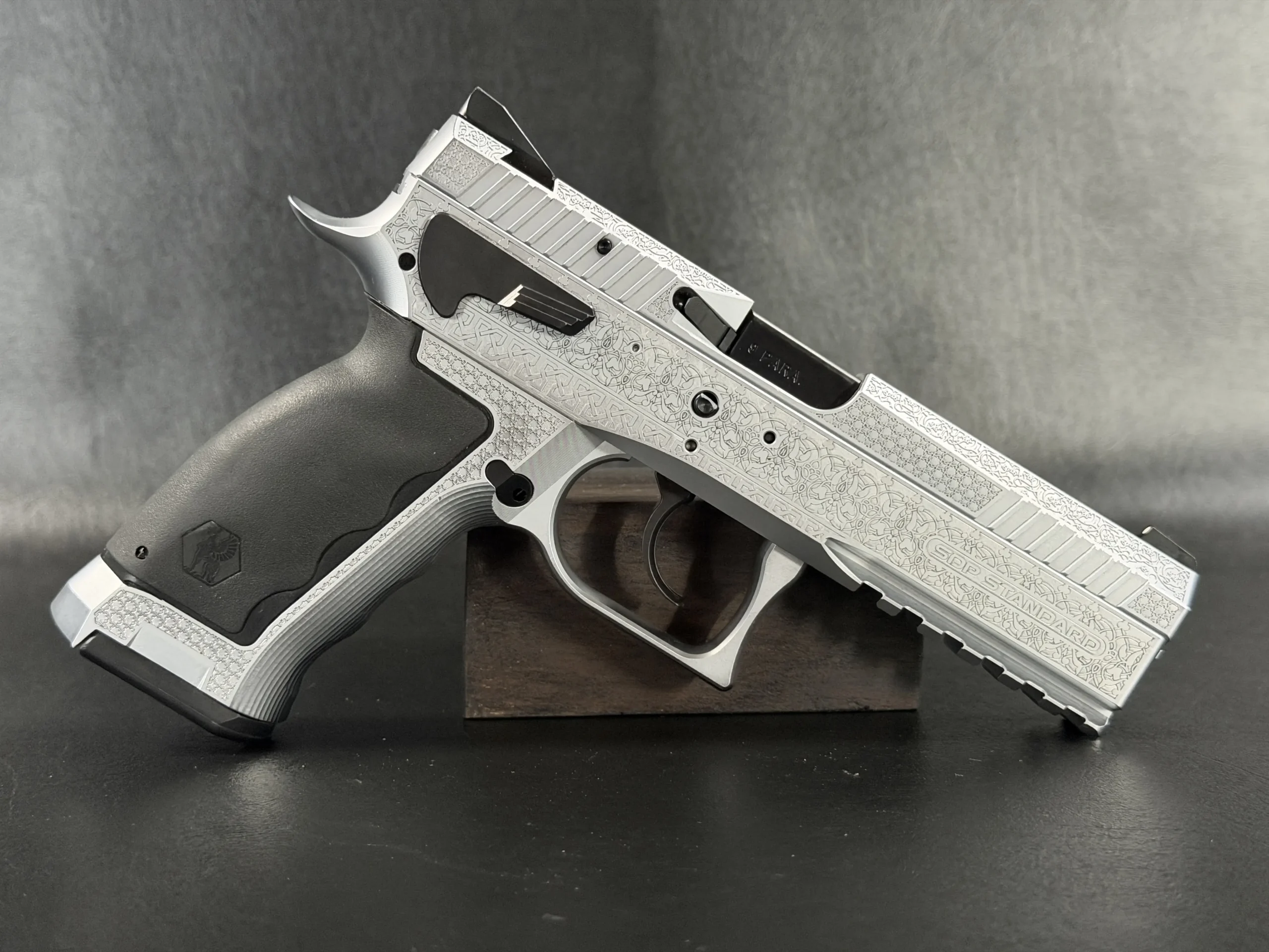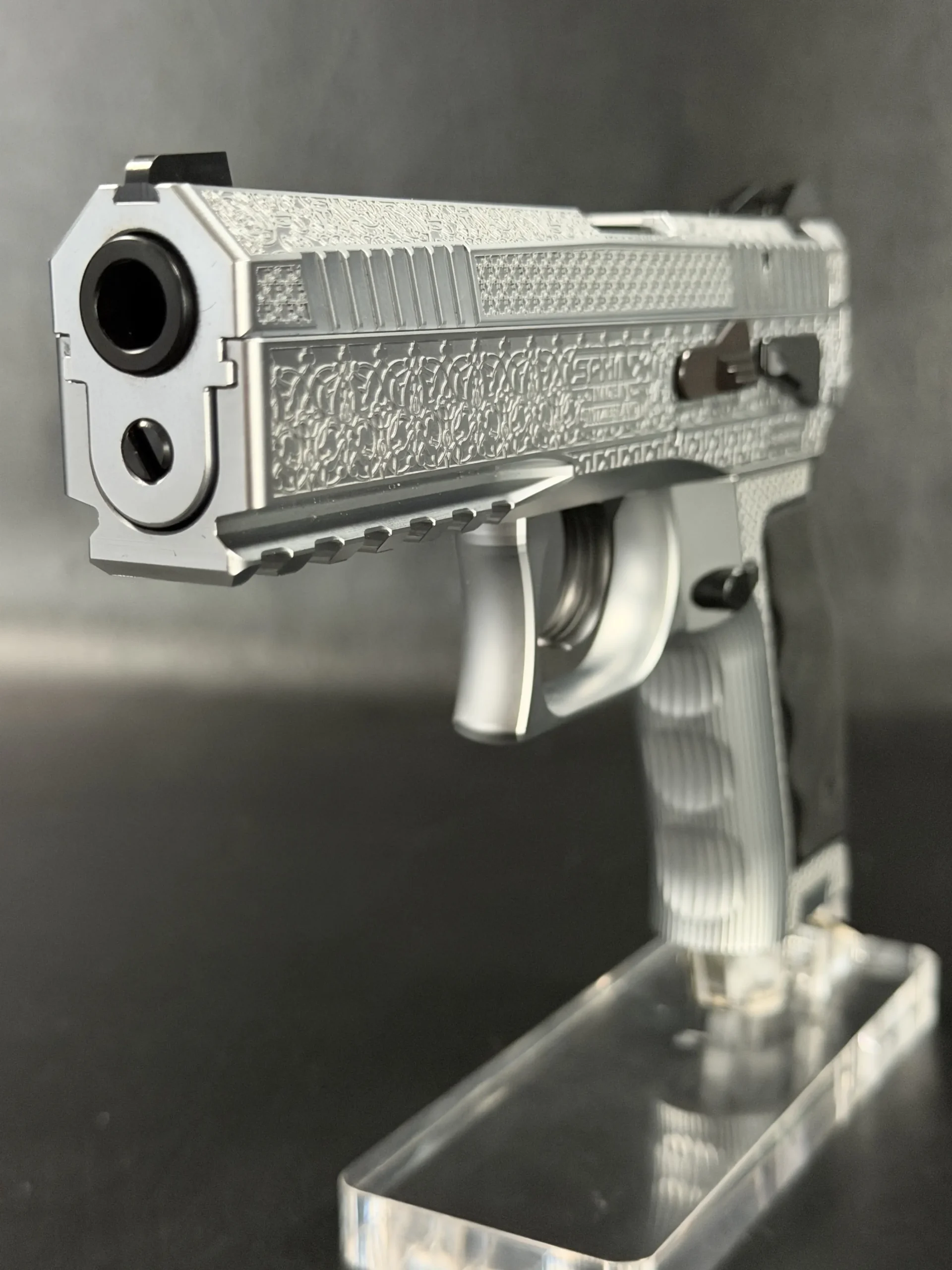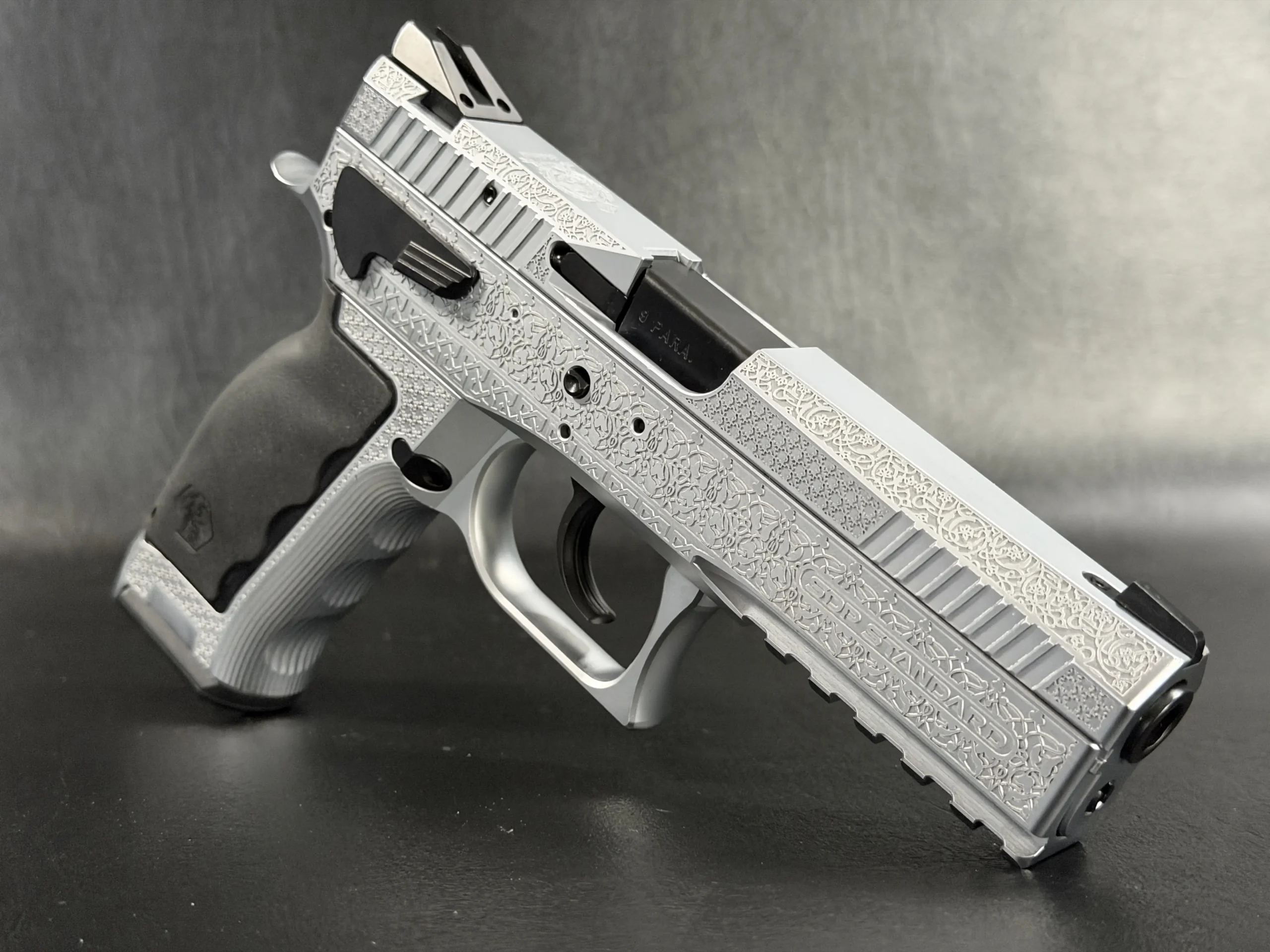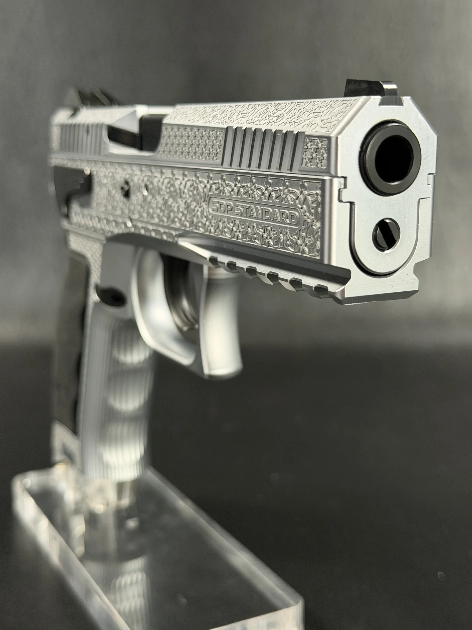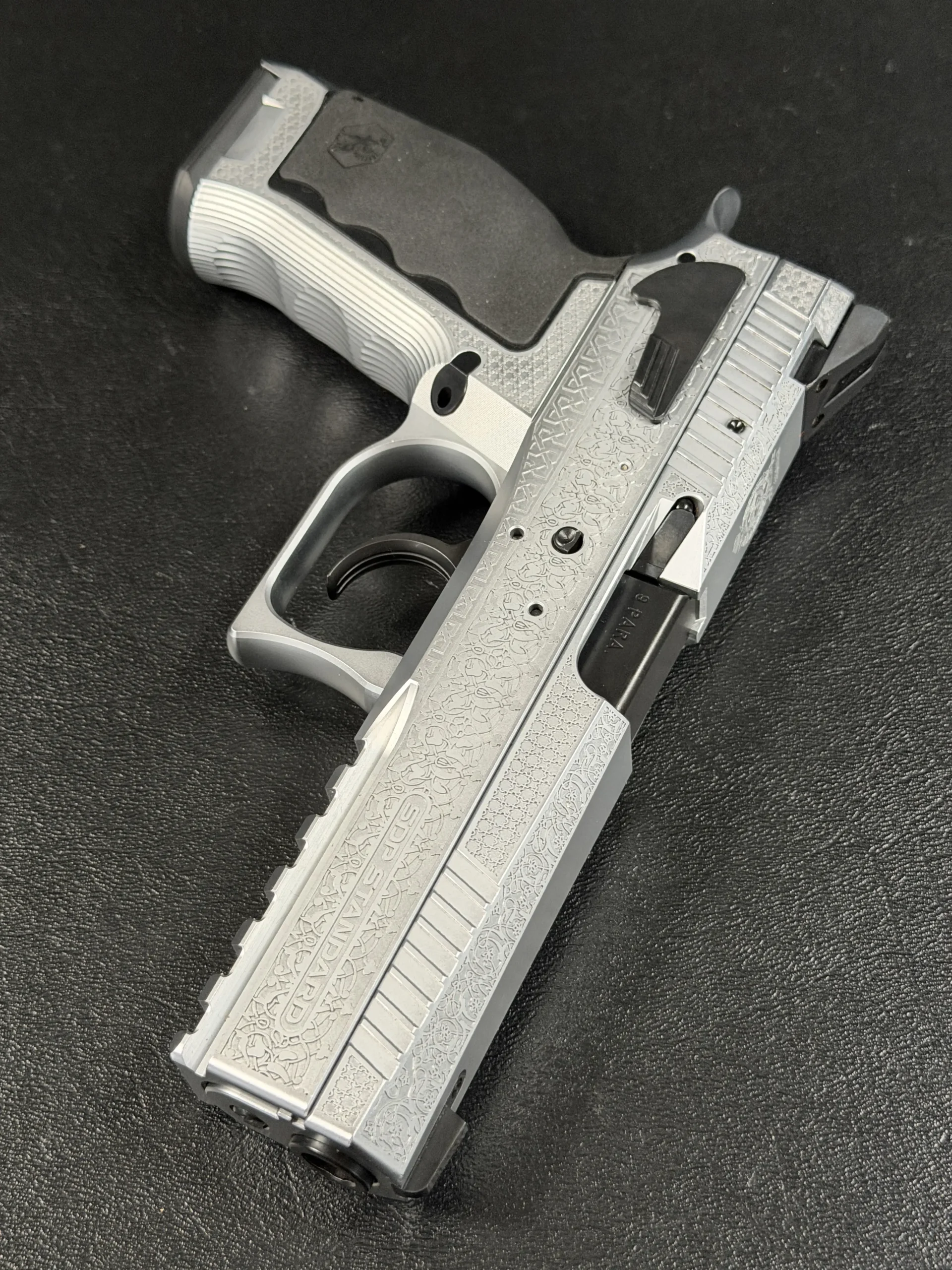The Engraved Sphinx SDP Standard Inox is a stainless steel pre-series presentation example built on the SDP platform and chambered in 9mm Parabellum. Developed for the Jordanian Intelligence Service and intended for presentation to King Abdullah II of Jordan, this pistol reflects the refined mechanical design and visual restraint associated with Sphinx.