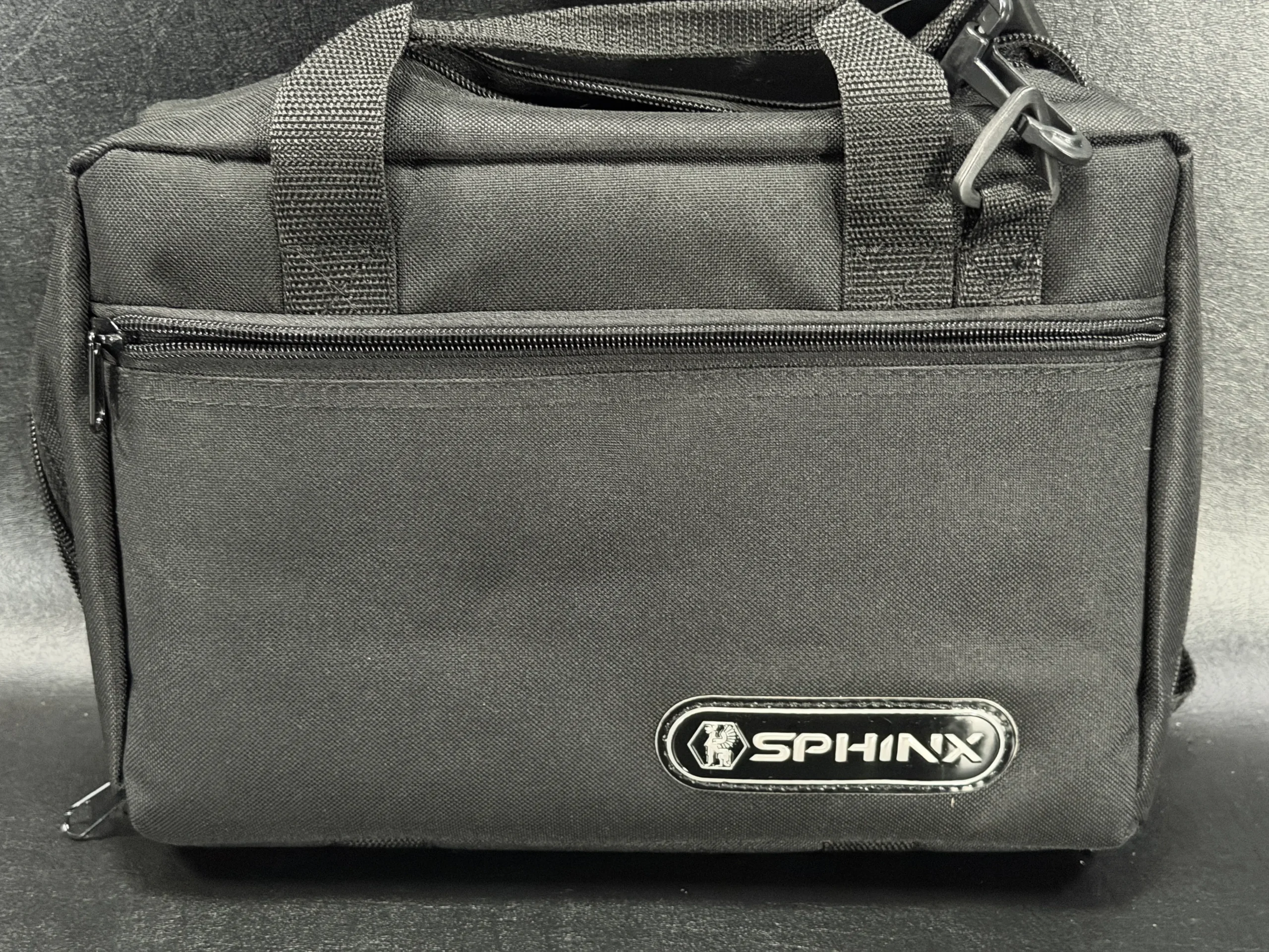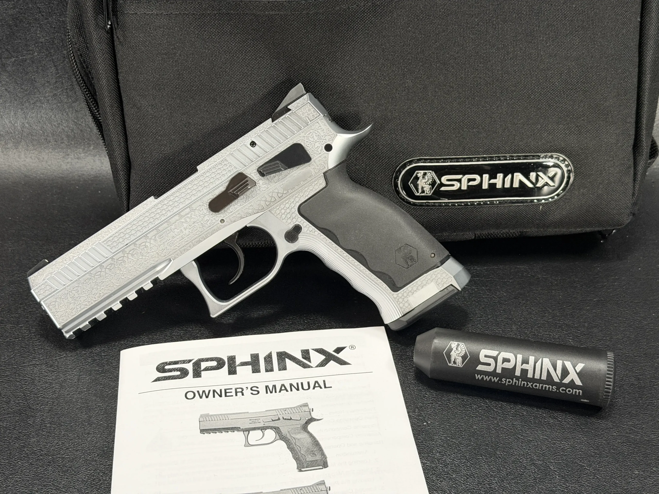 Built in full stainless steel, the pistol features an SA/DA trigger system, an ambidextrous decocking lever, front and rear slide serrations, and a Picatinny accessory rail milled into the frame. The controls and magazine are finished in a contrasting blued tone, while black polymer grip panels with Kraton inserts and the Sphinx logo complete the overall presentation.