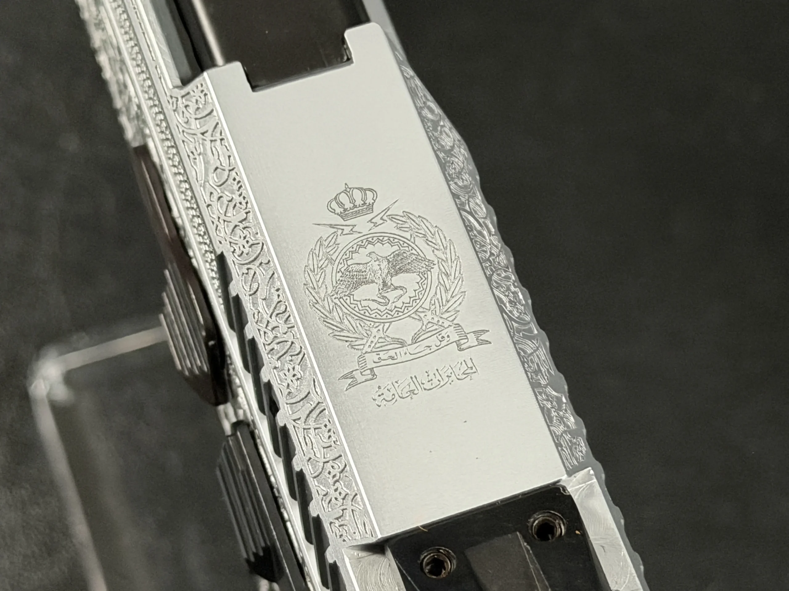 The slide and frame are engraved with flowing Arabic ornamental motifs that complement the clean lines of the pistol. Along the top of the slide, the emblem of the Jordanian Intelligence Service is engraved, reinforcing the purpose of this presentation piece.