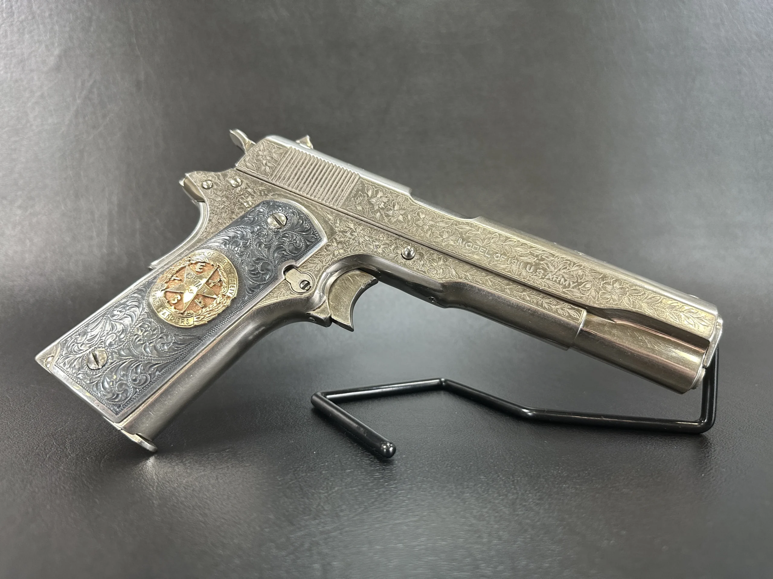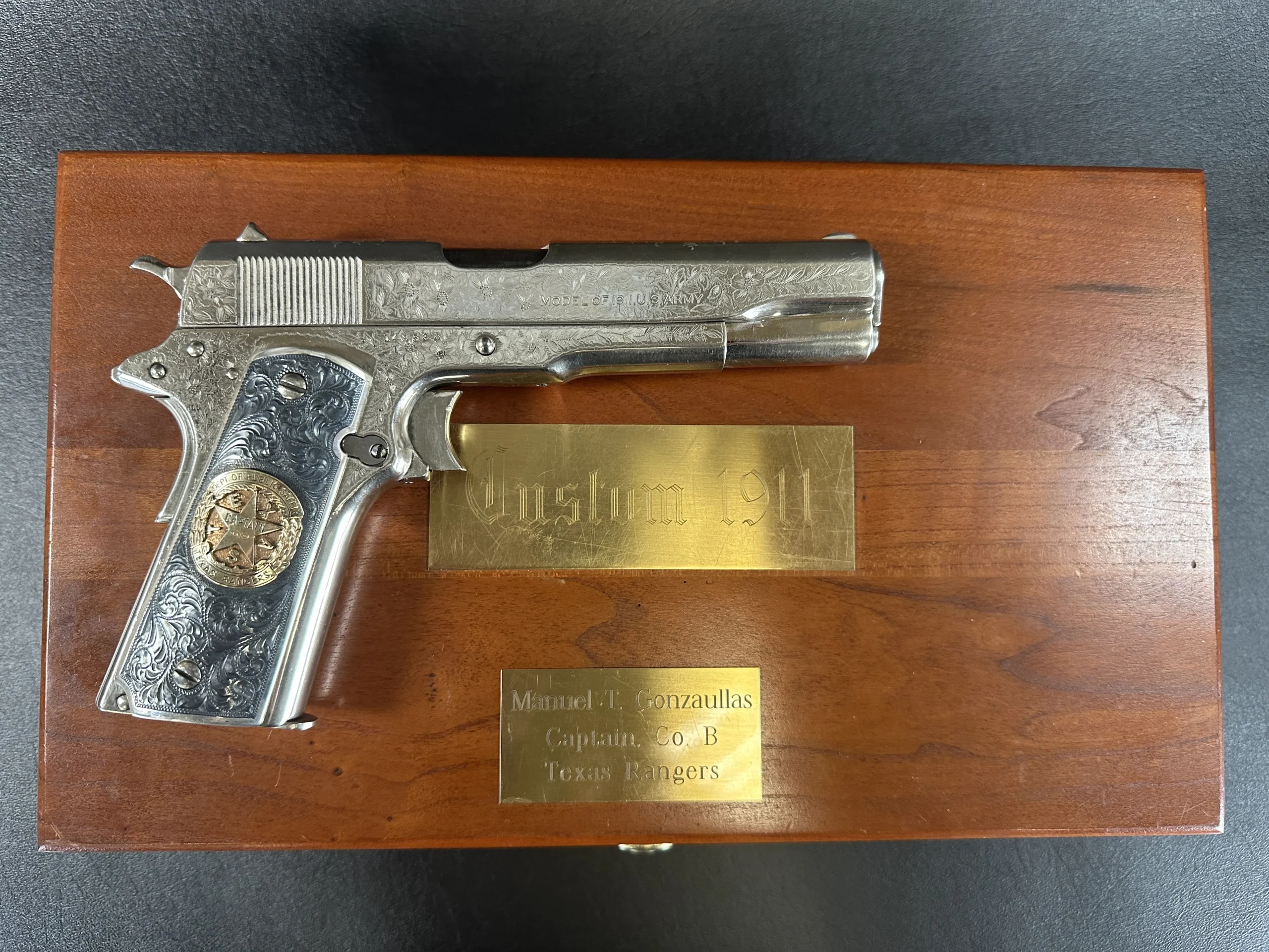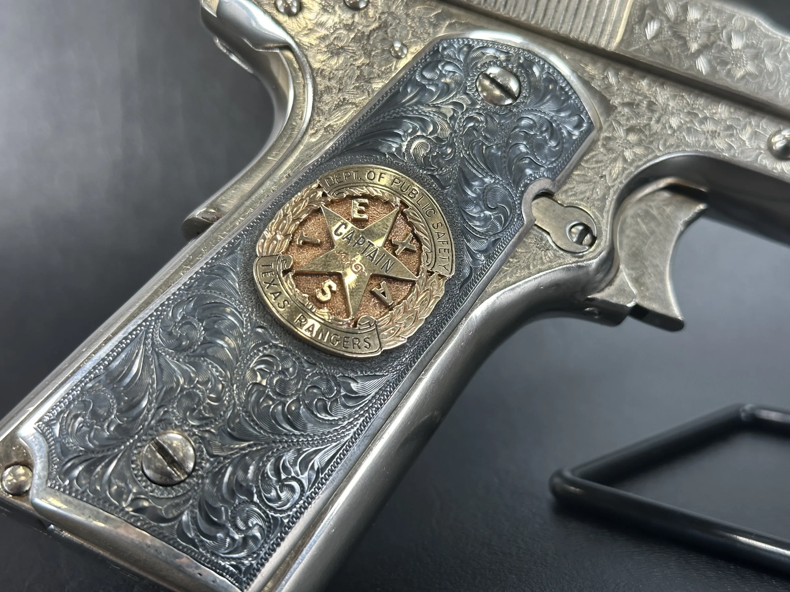 The grips were made by Lopez Engraving in sterling silver with darkened engraved fields. The left panel features gold inlaid initials “M/T/G,” and the right panel is fitted with a Texas Ranger Captain’s badge.