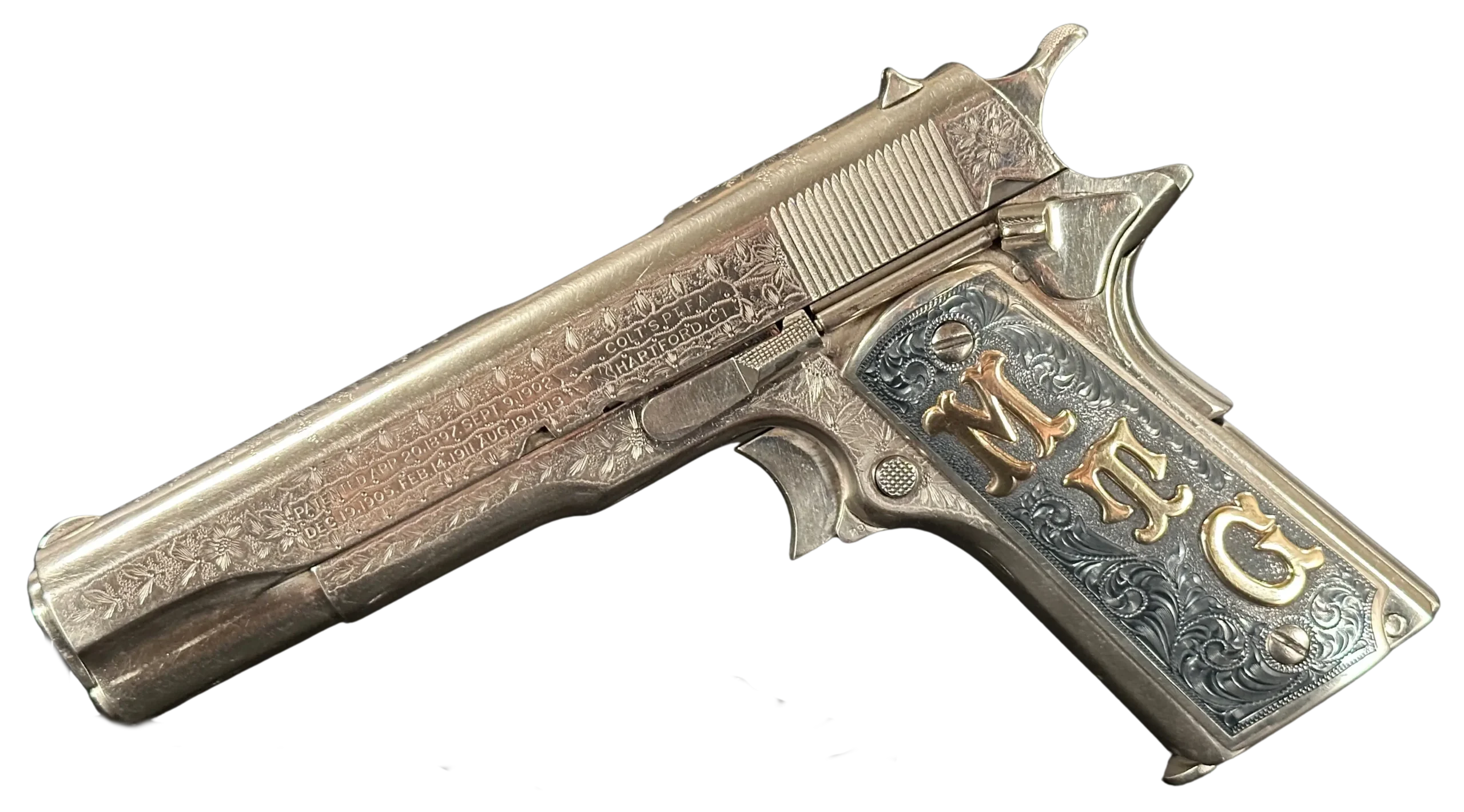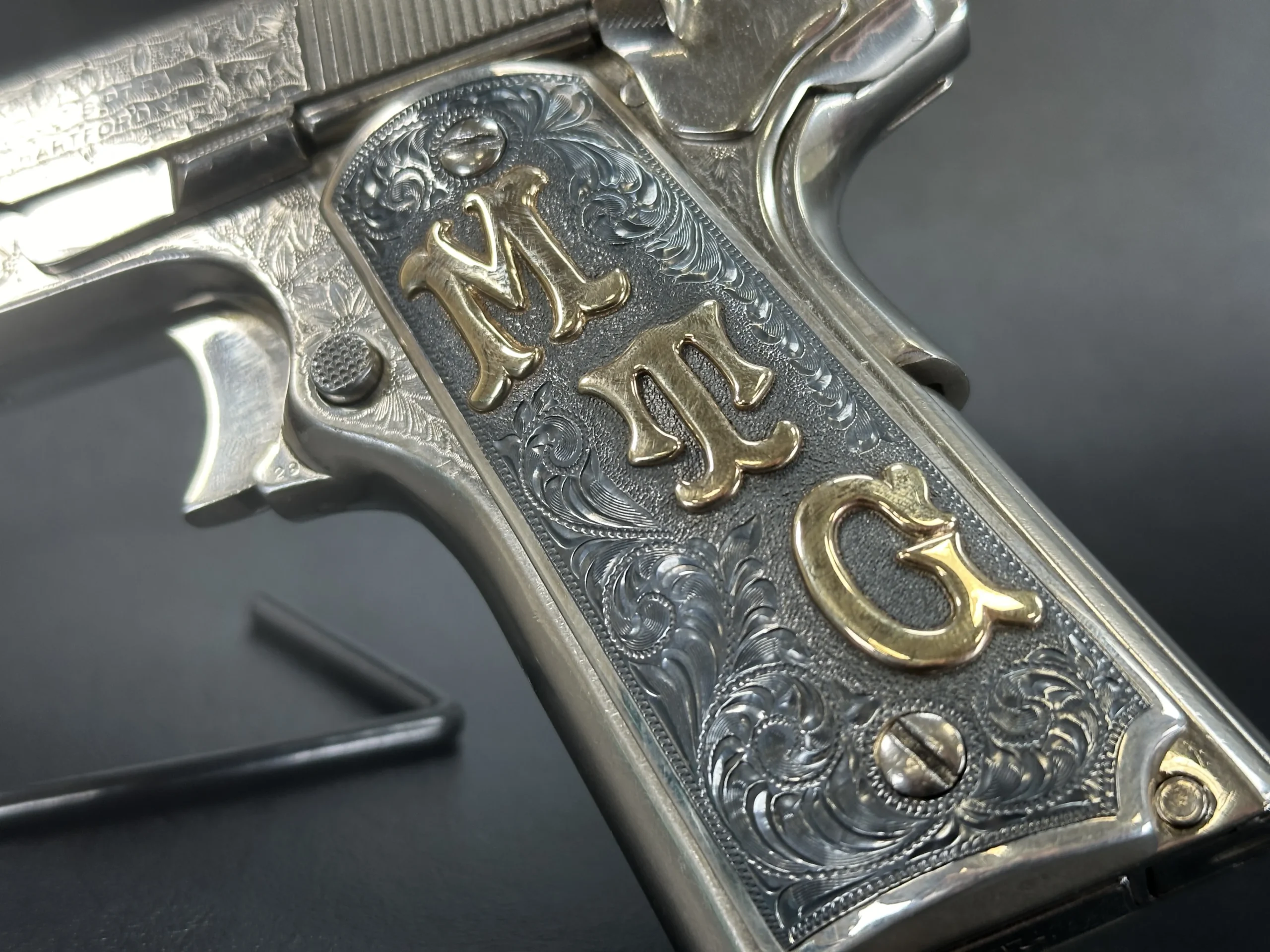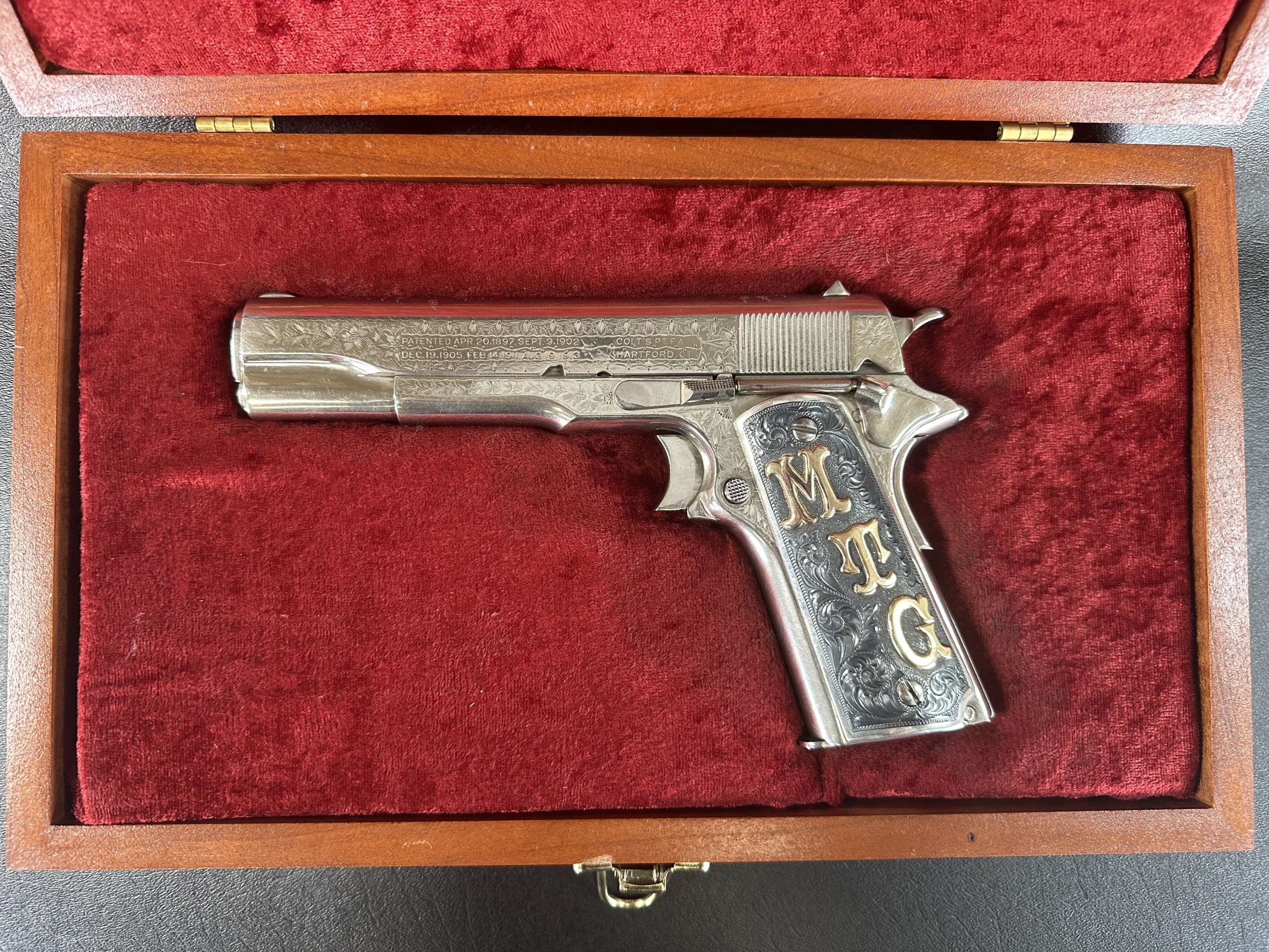 The grips were made by Lopez Engraving in sterling silver with darkened engraved fields. The left panel features gold inlaid initials “M/T/G,” and the right panel is fitted with a Texas Ranger Captain’s badge.
