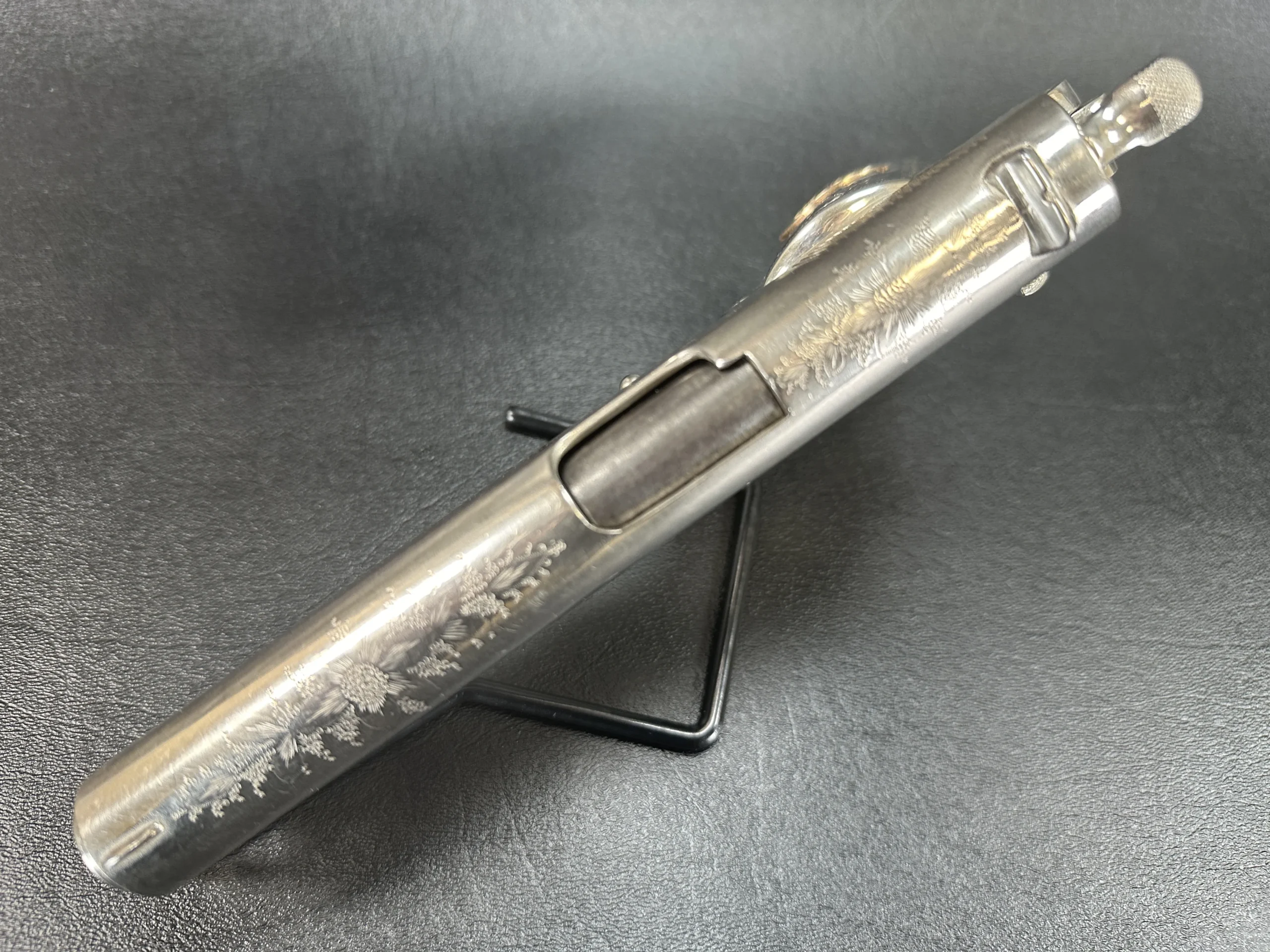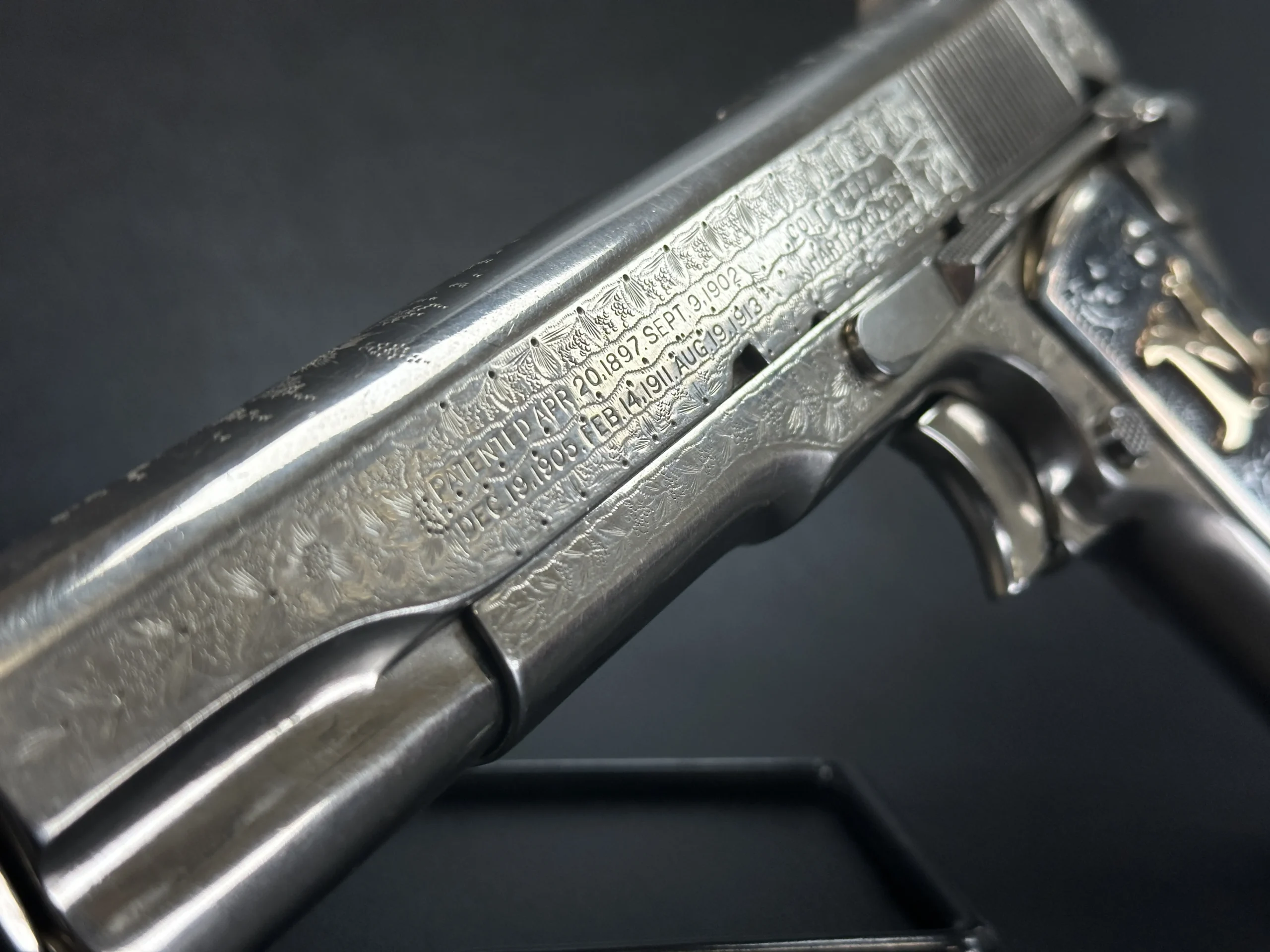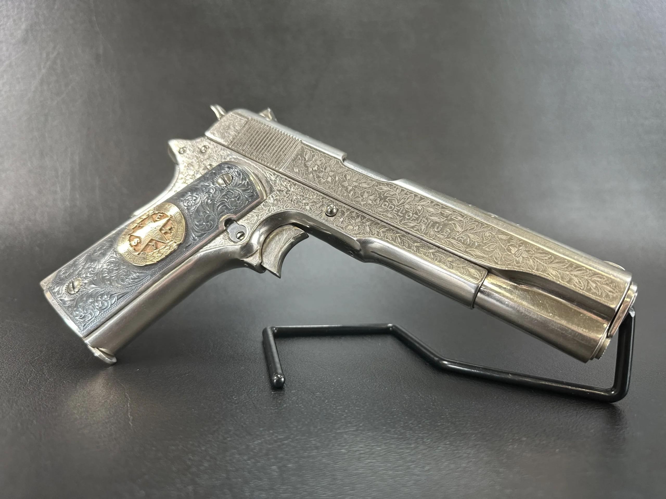 Originally manufactured in 1917 under U.S. military contract, this U.S. Colt Model 1911 has been extensively customized with floral motif engraving across much of the pistol. The engraving uses a punch-dot-backed style that gives the surface a bold, highly textured look, while the original barrel address and model markings remain present.