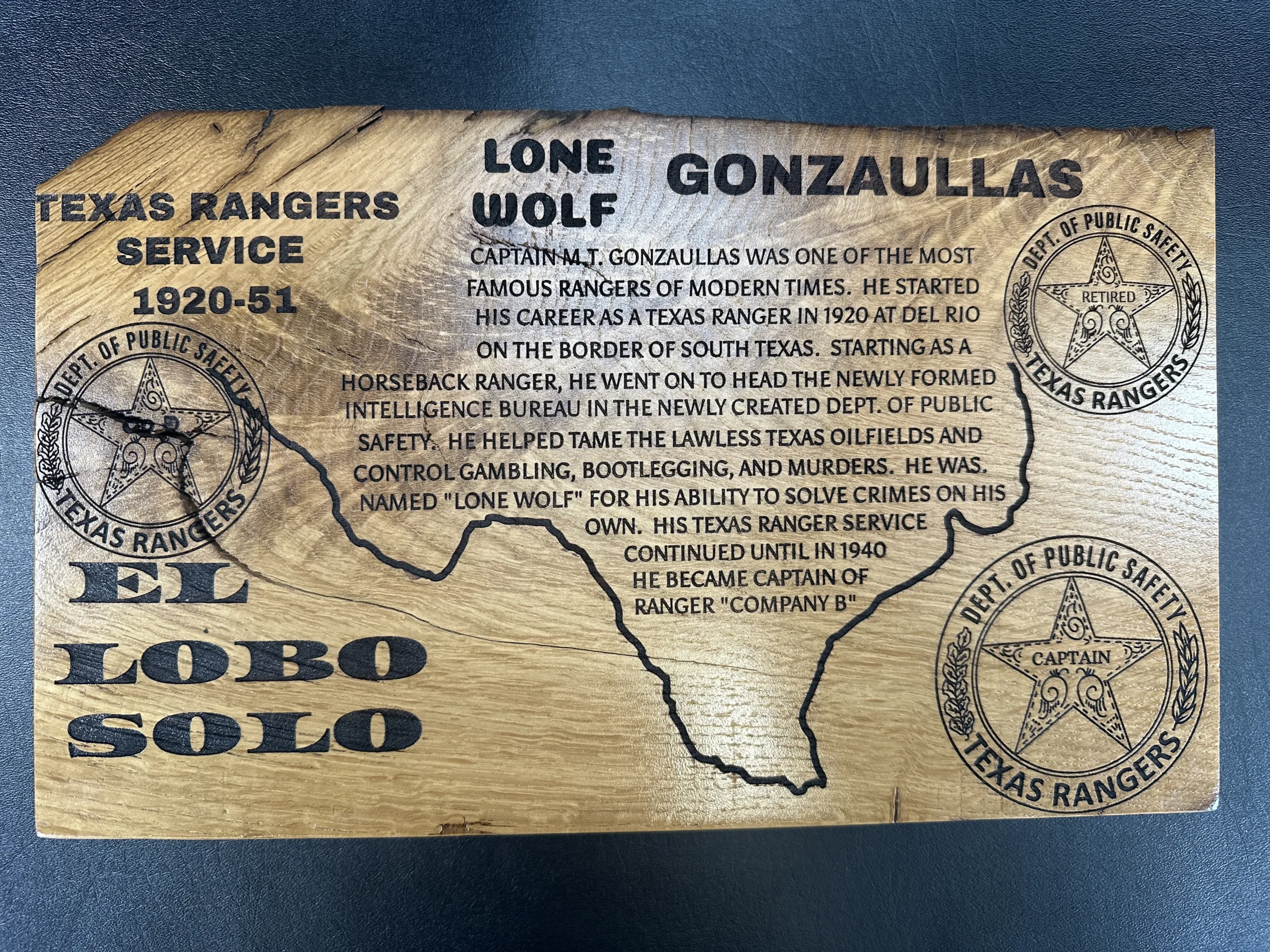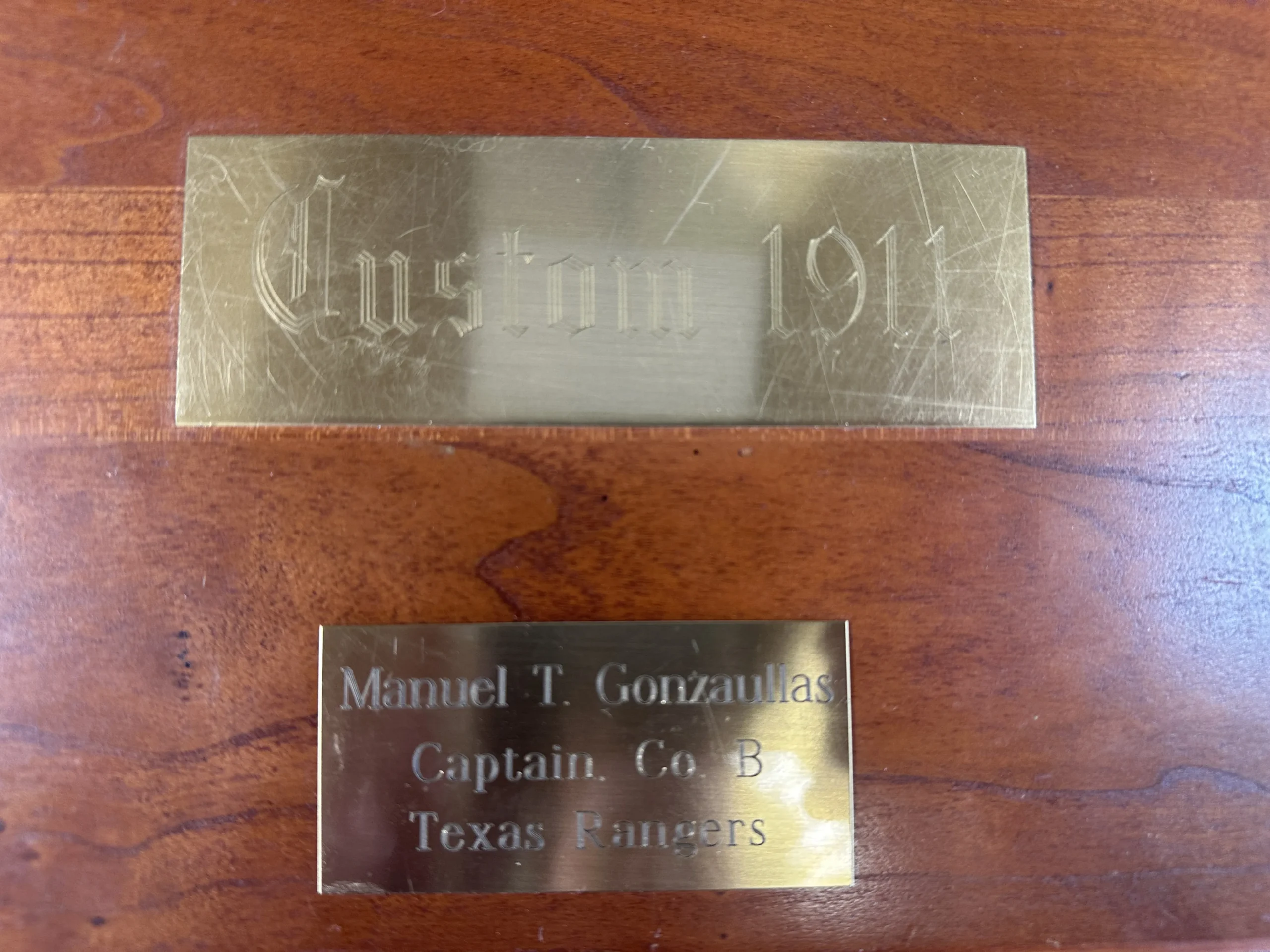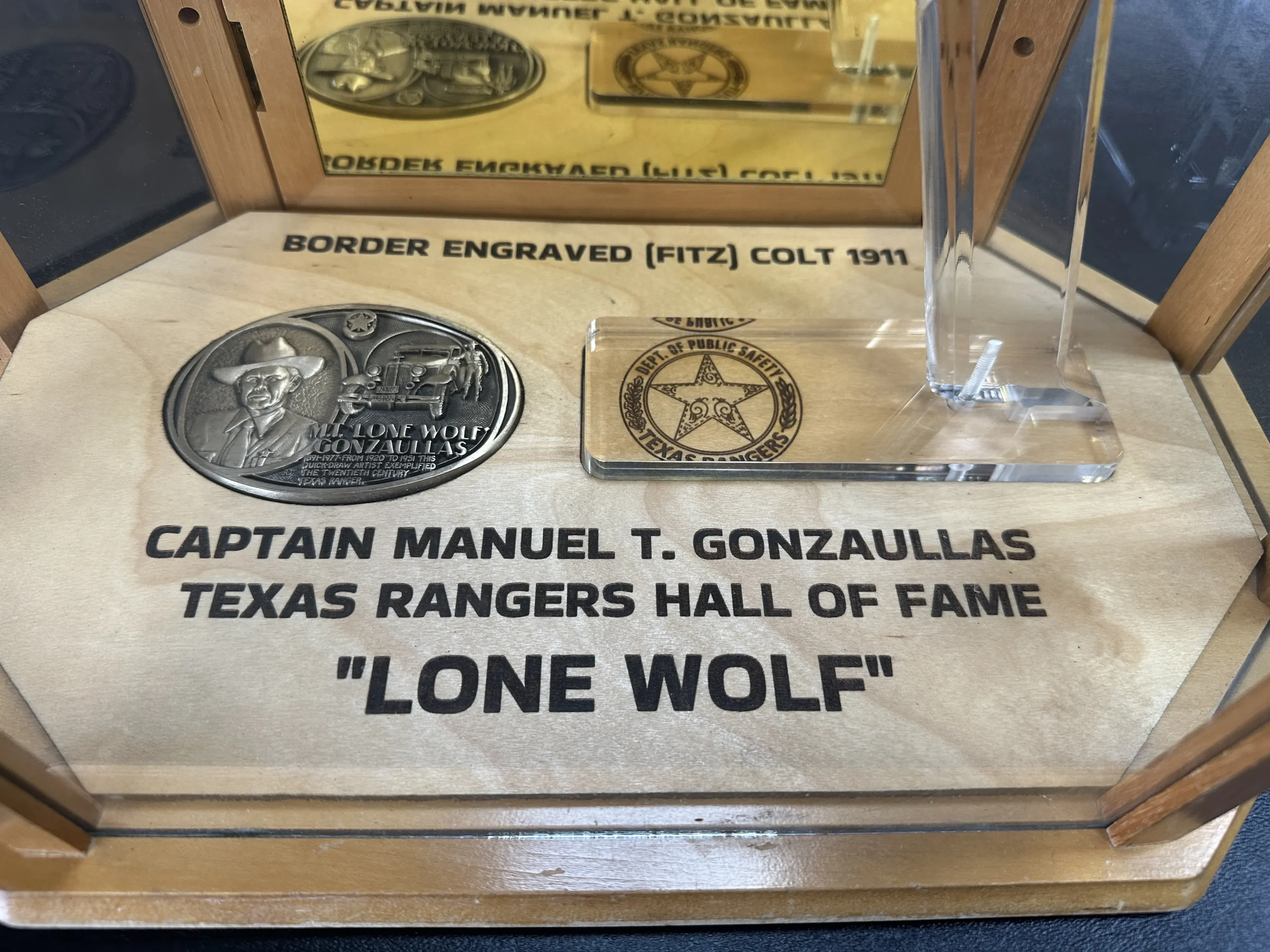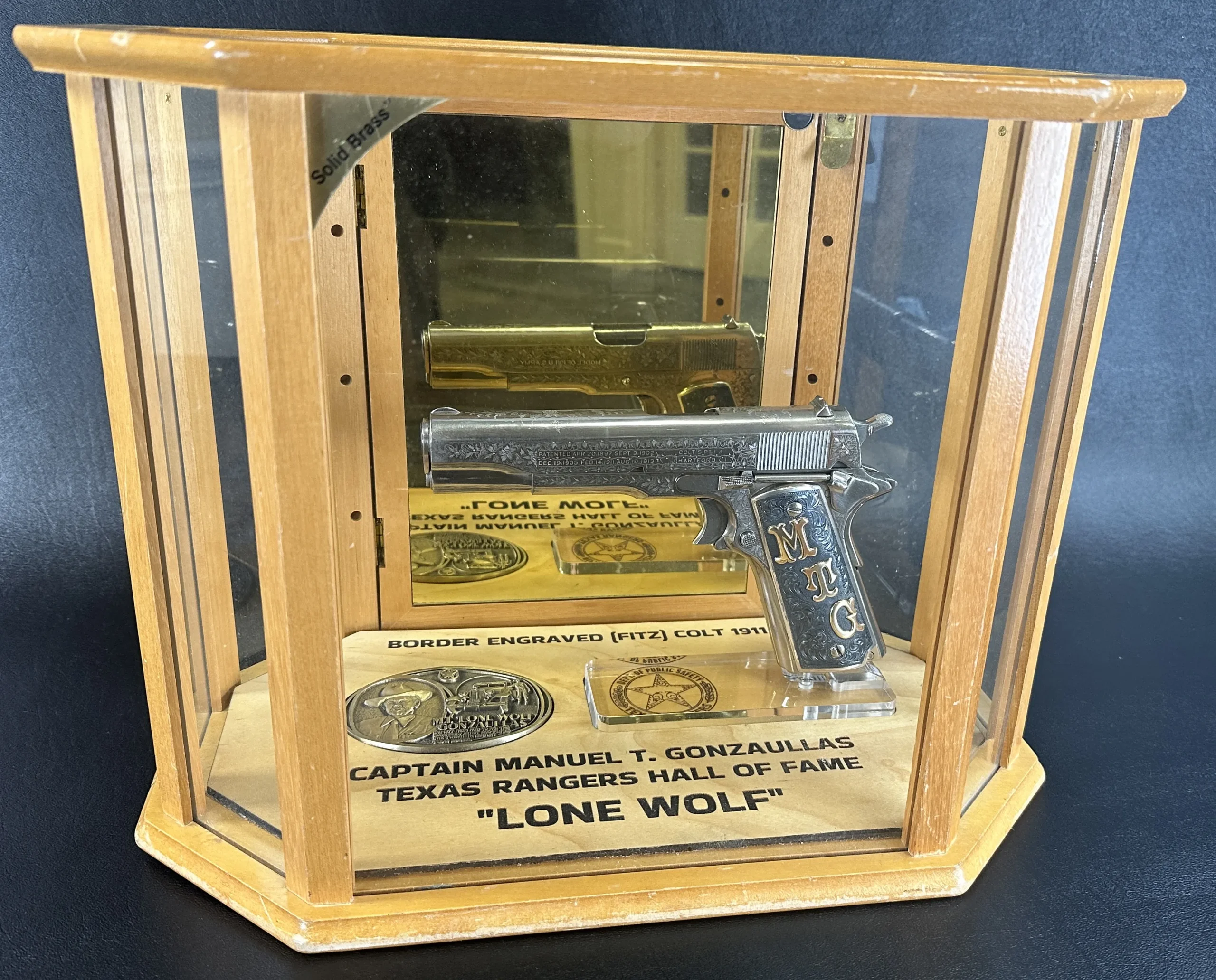 Included with the pistol are a padded hardwood case, a custom hardwood and glass display stand with Texas Ranger carvings, a large hardwood plaque detailing Gonzaullas’ life and career, and a copy of Captain M.T. Gonzaullas: Lone Wolf by Brownson Malsch.