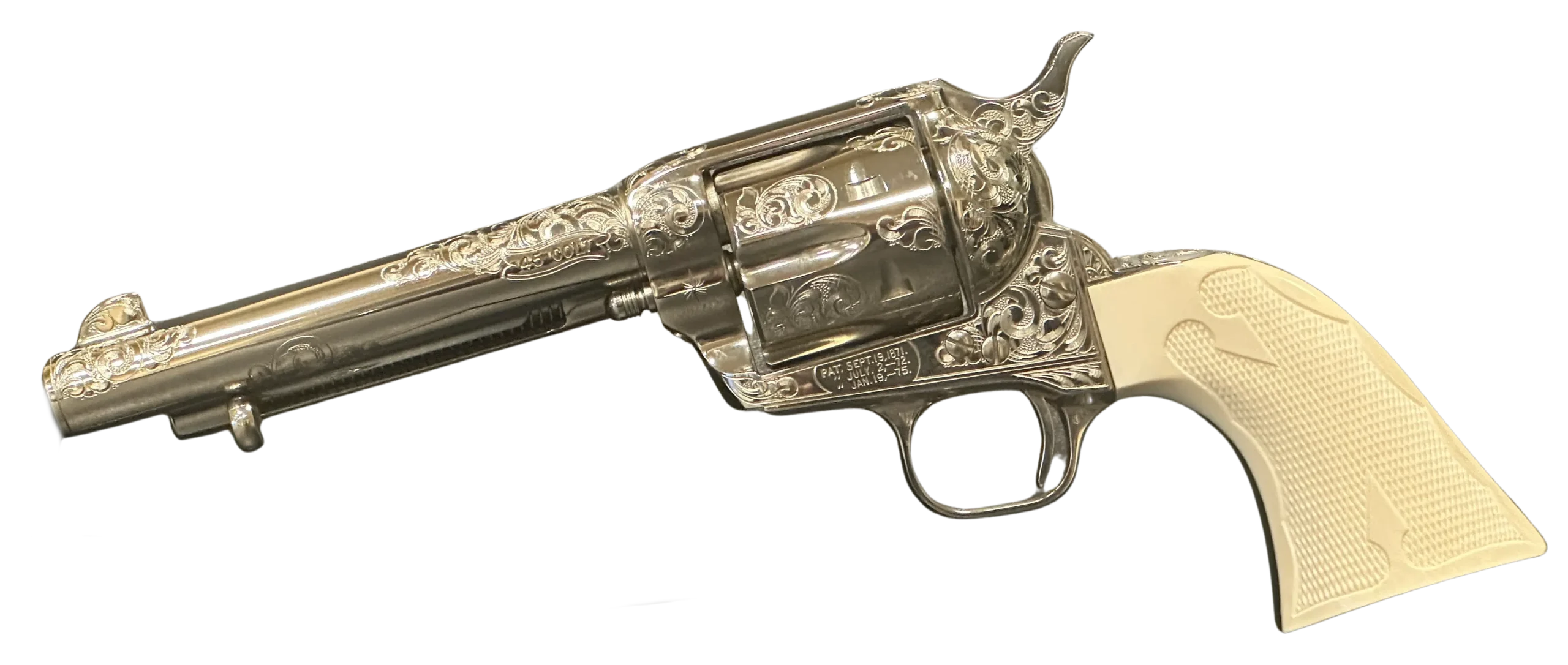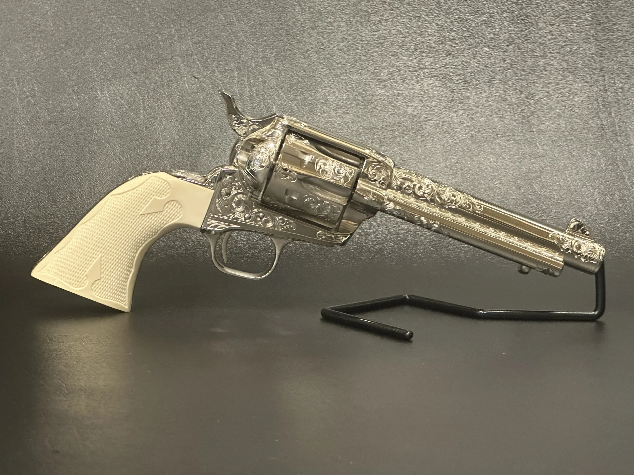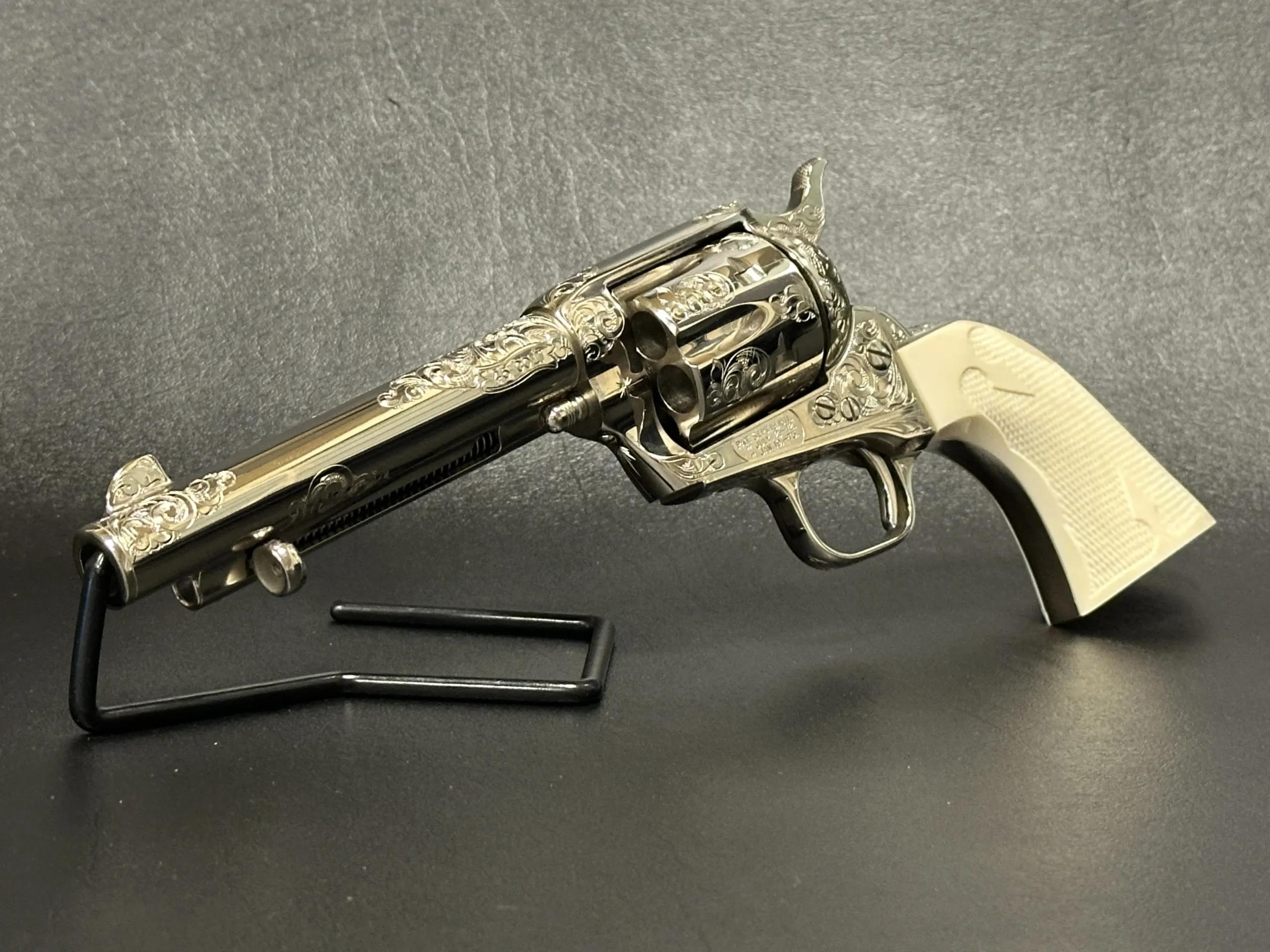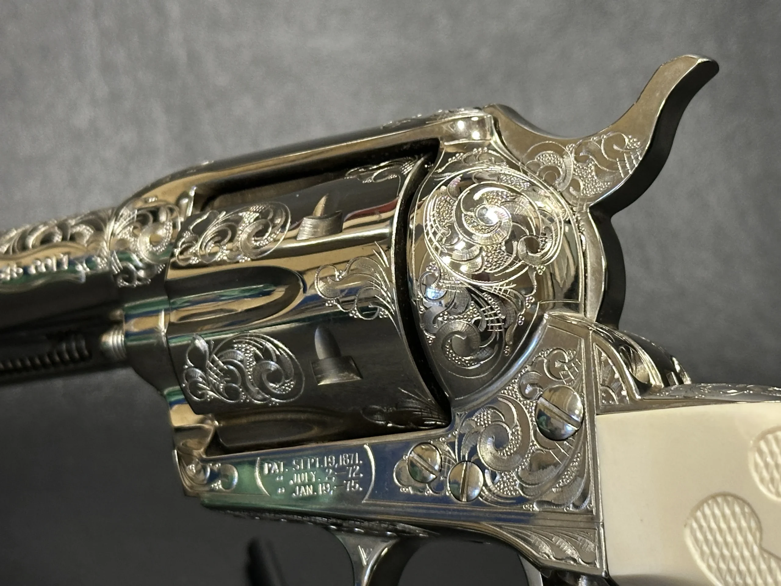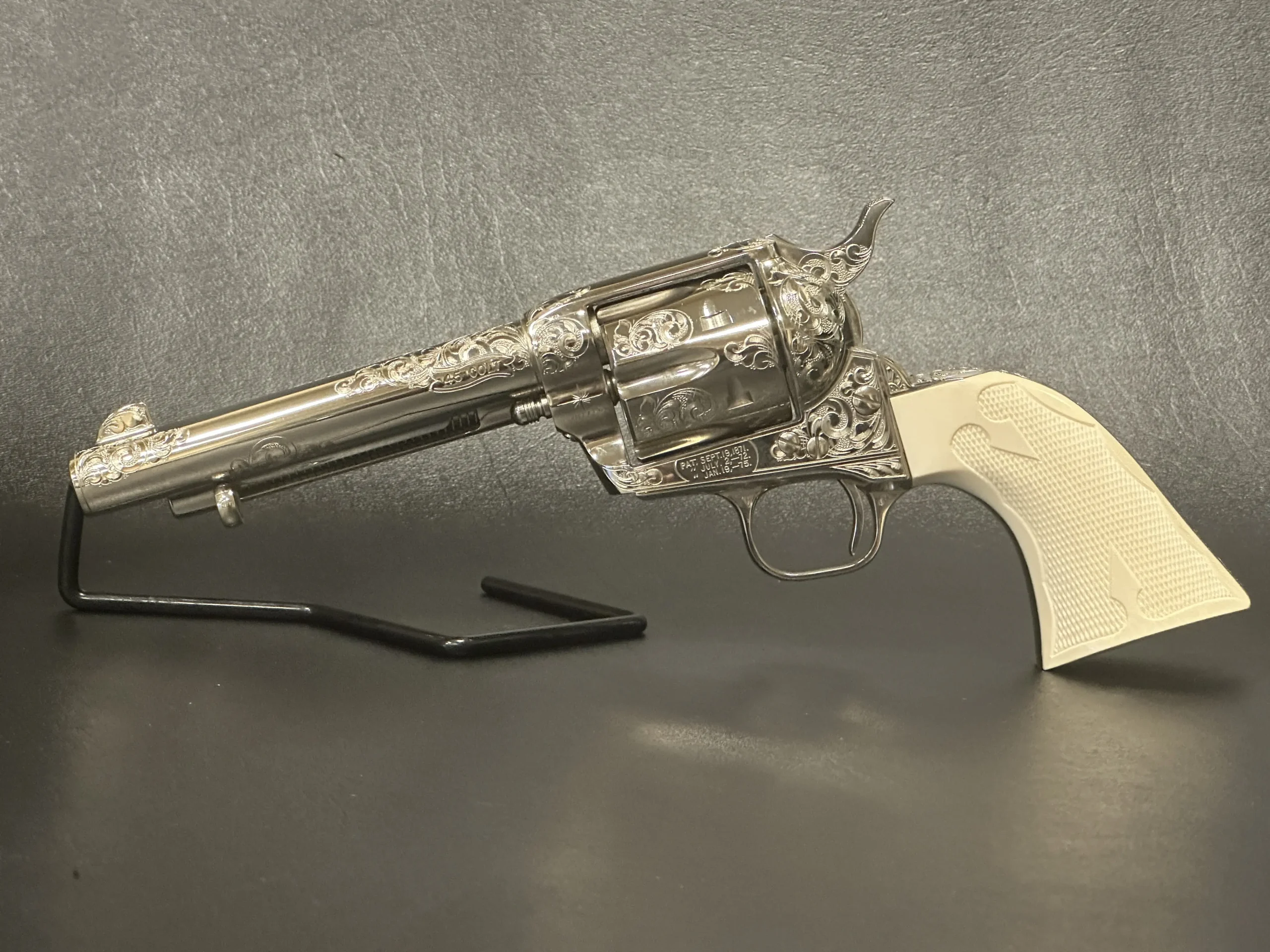 Made in 1995, this Colt 3rd Gen Single Action Army Revolver pairs classic Colt styling with factory engraving and a bright nickel finish. Its traditional single-action design is complemented by a blade front sight and frame-notch rear sight, keeping the profile true to the iconic Single Action Army format.