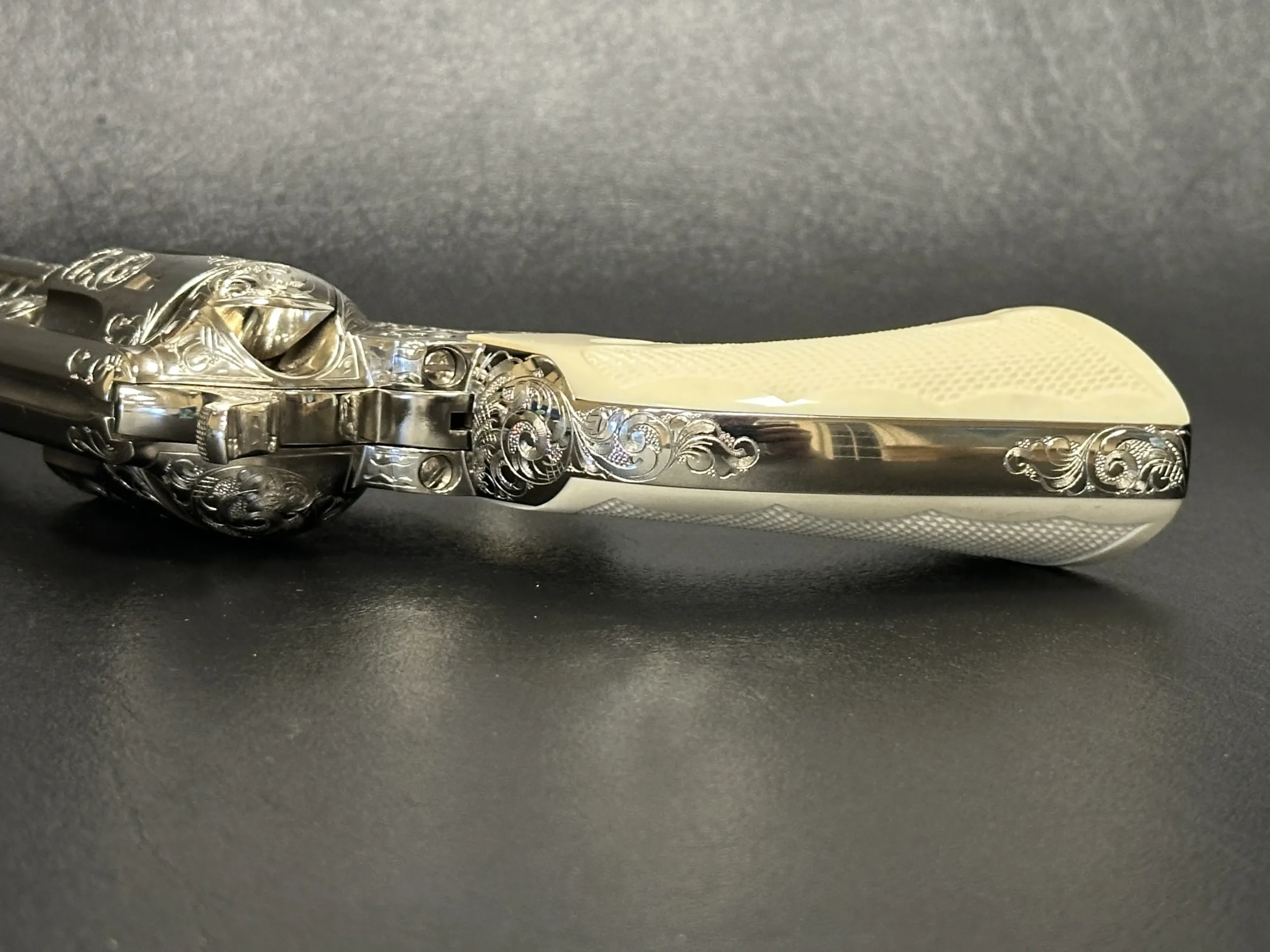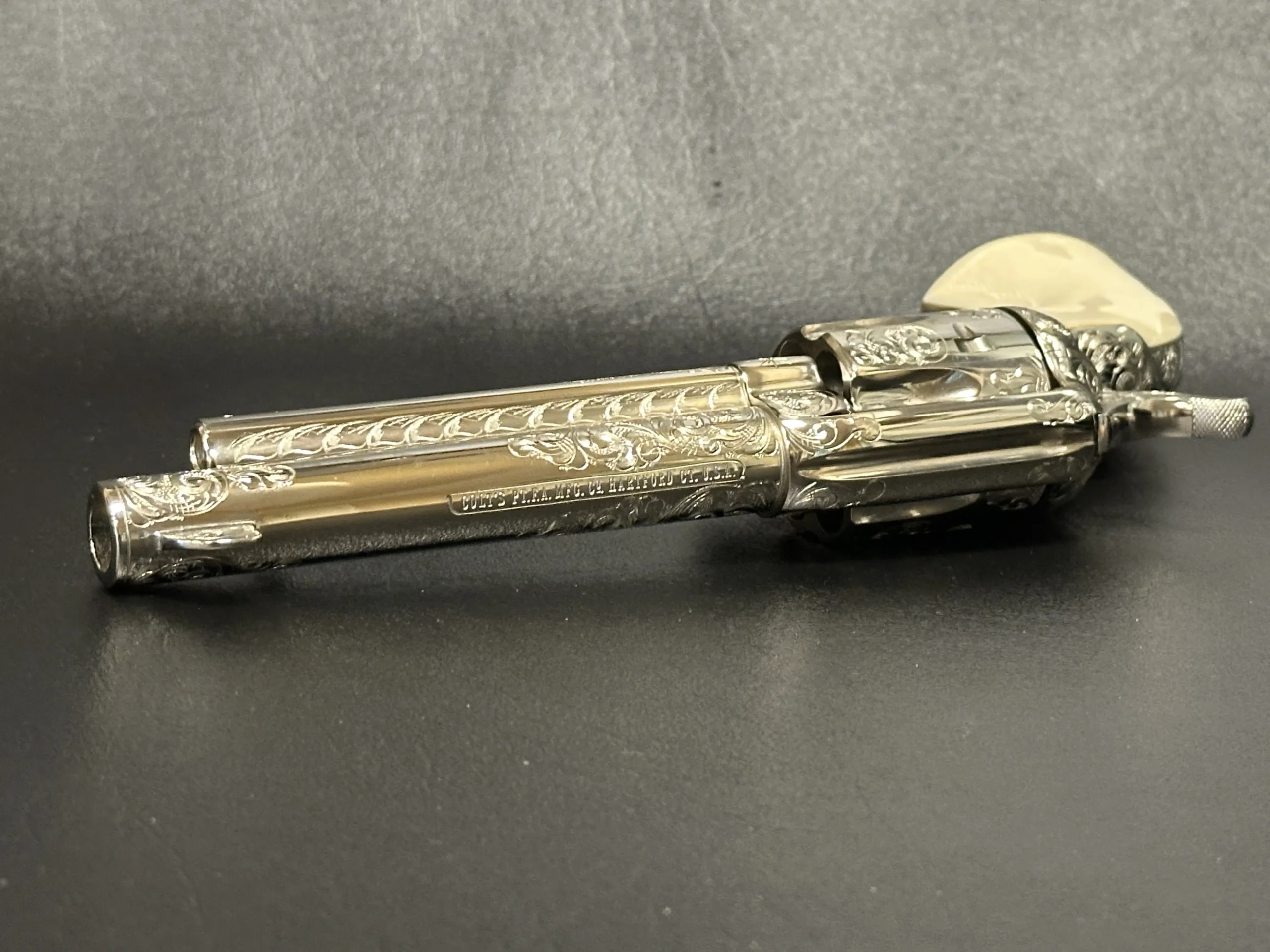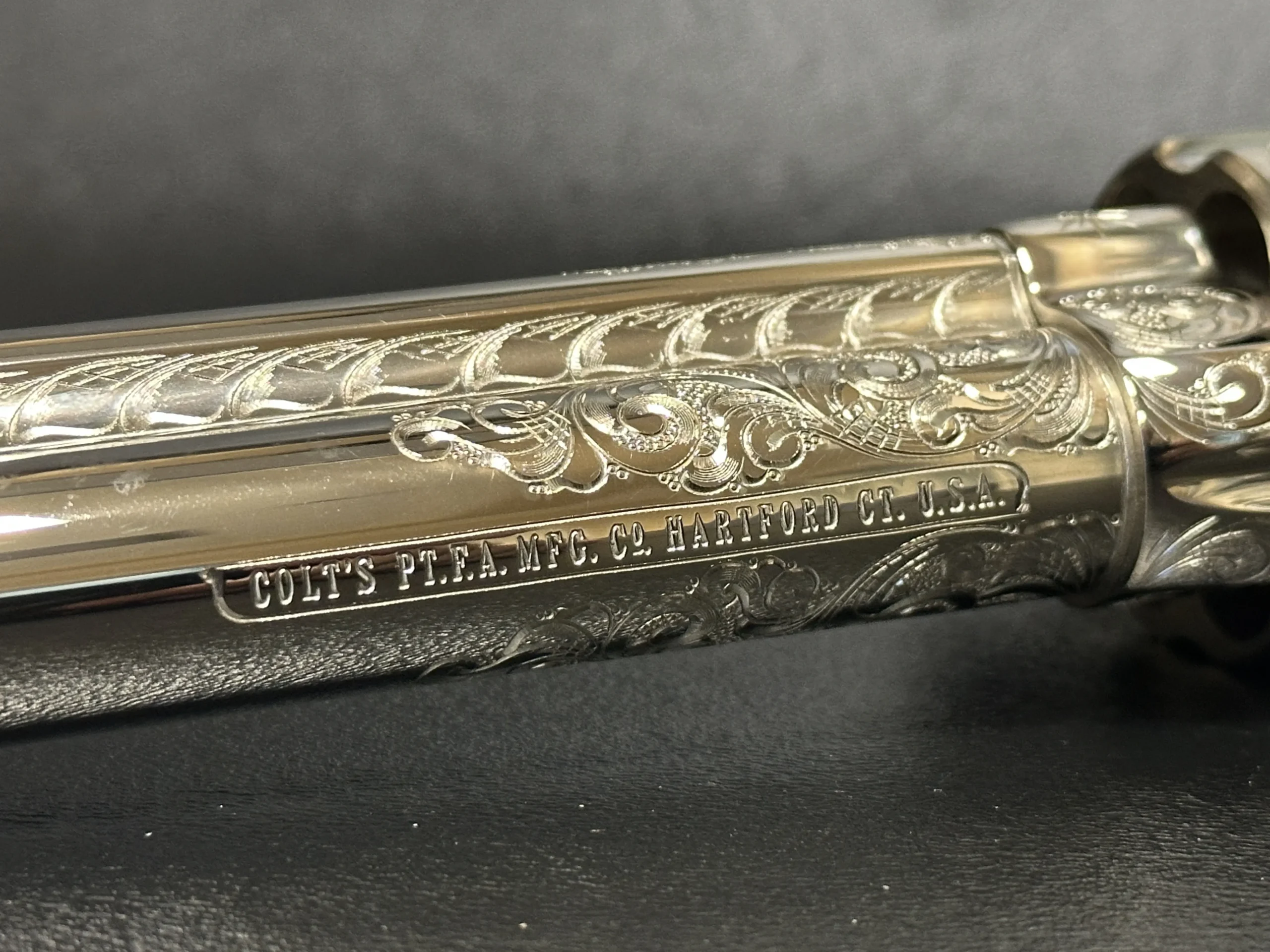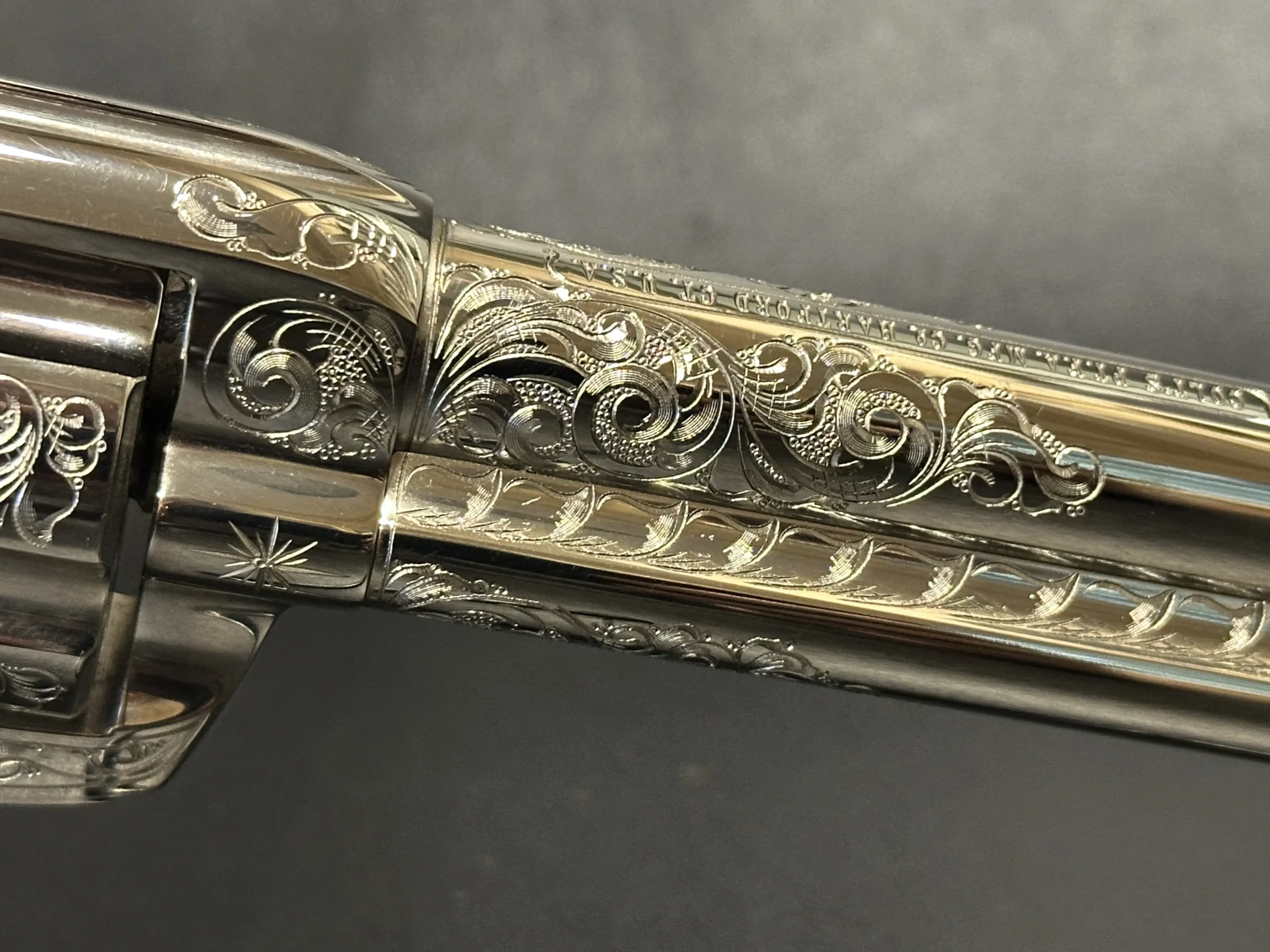 The revolver features “C” grade floral scroll engraving over a punch dot background, giving the metalwork a decorative, hand-finished look. The barrel is further detailed with engraved address markings and caliber specifications within a ribbon motif, adding to the factory presentation.
