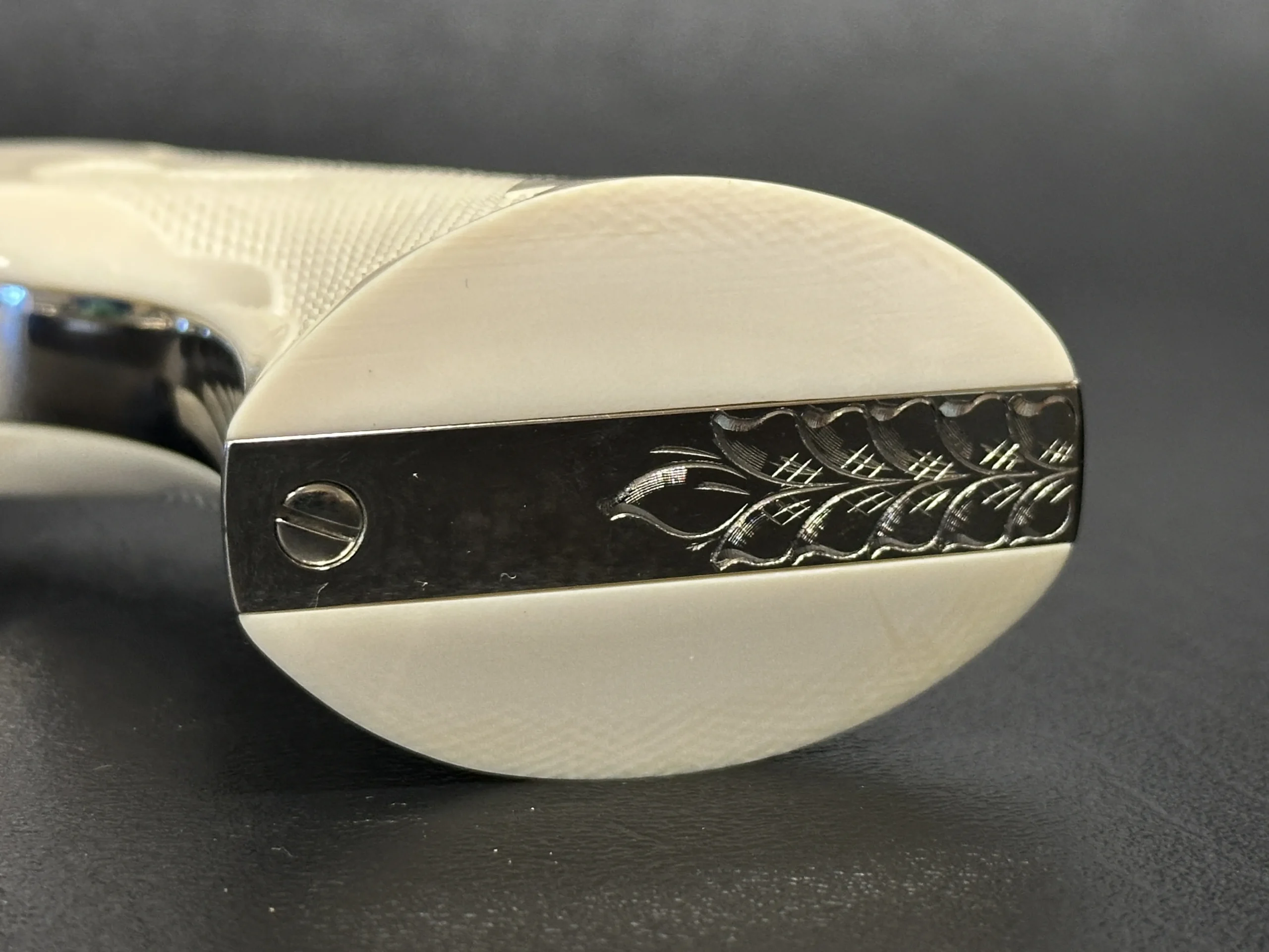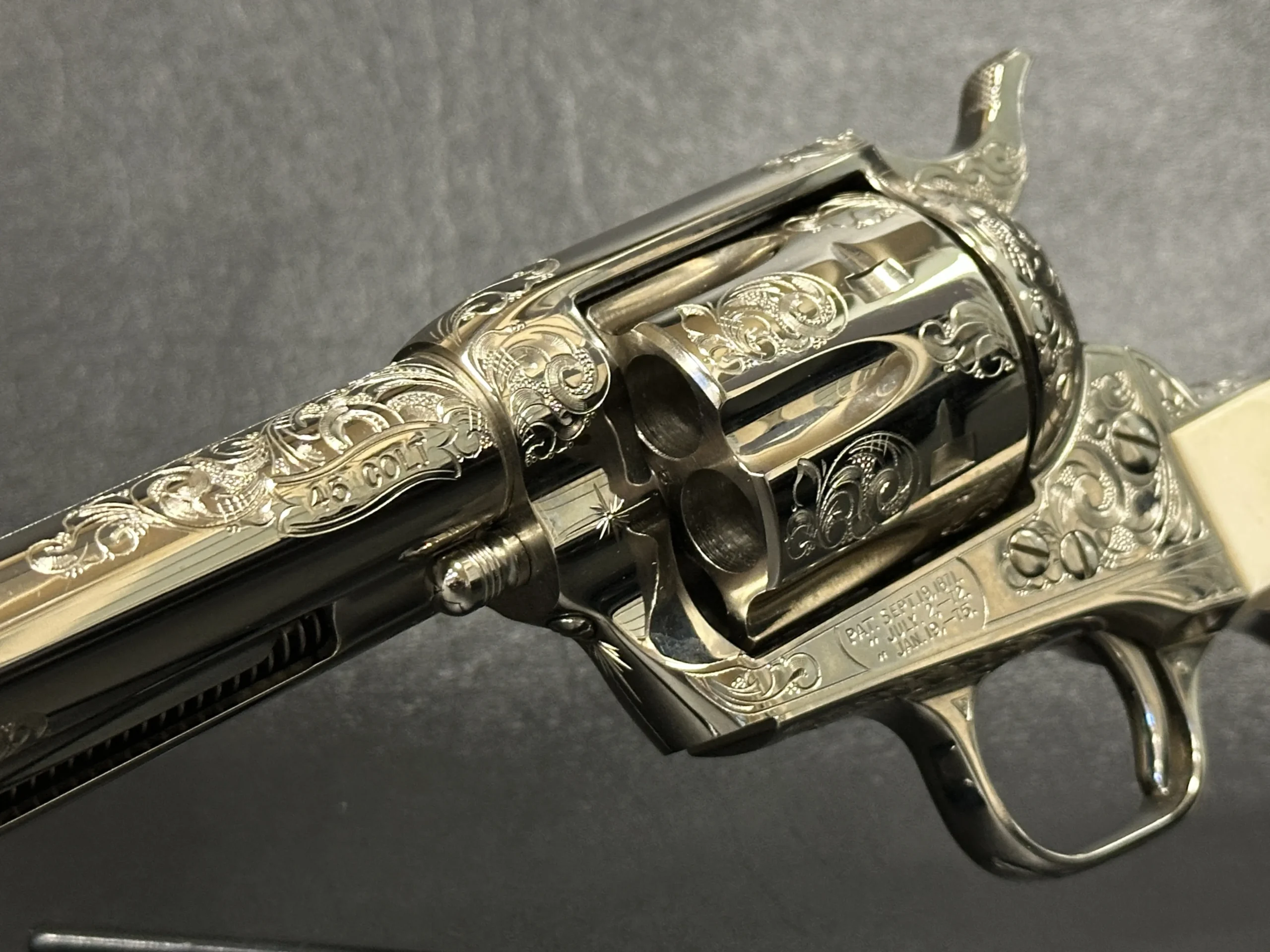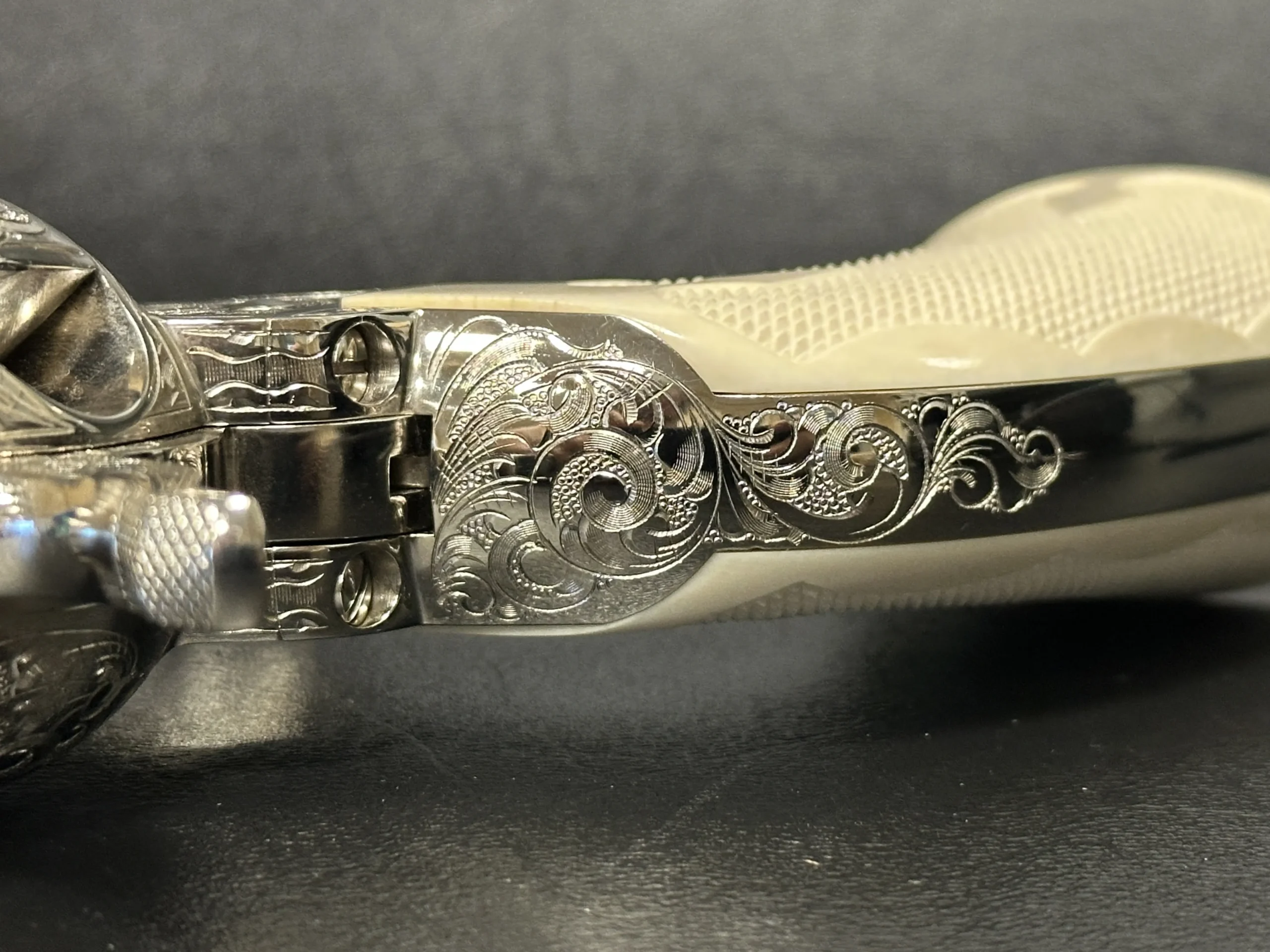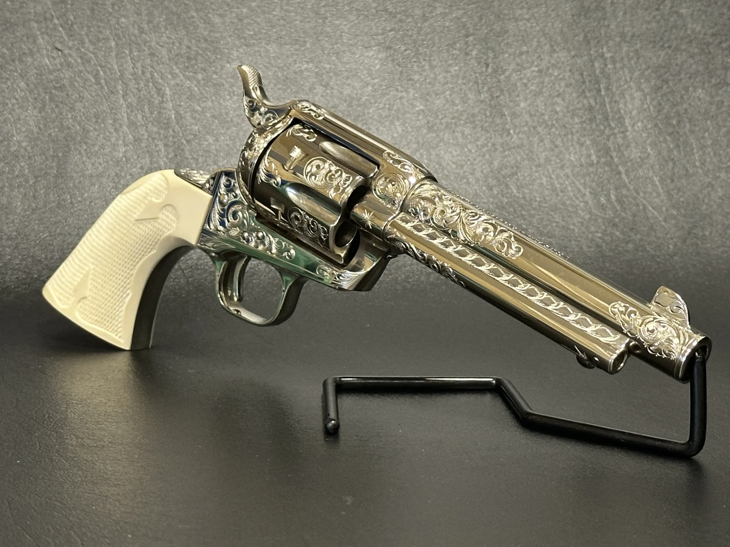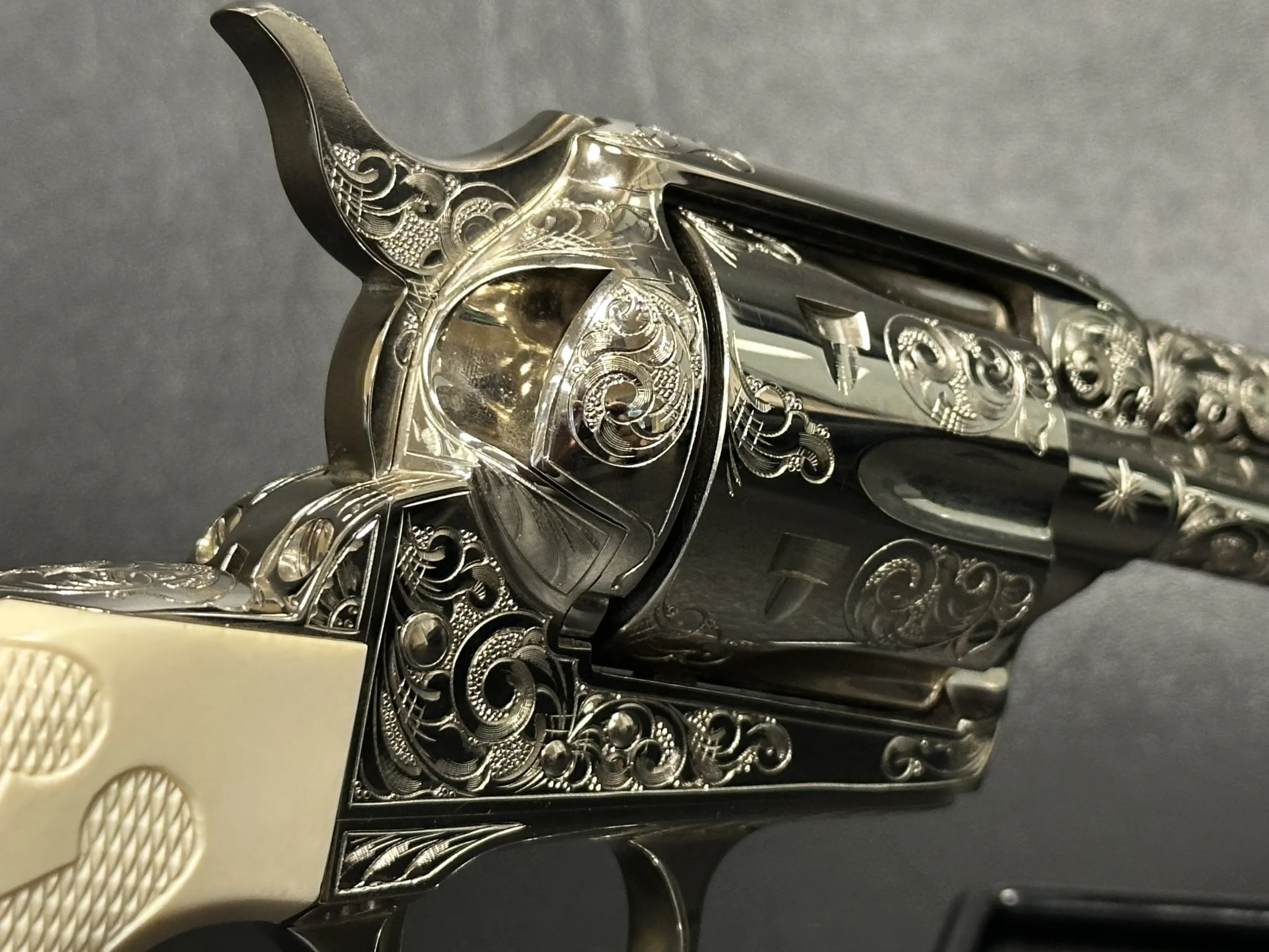 The revolver features “C” grade floral scroll engraving over a punch dot background, giving the metalwork a decorative, hand-finished look. The barrel is further detailed with engraved address markings and caliber specifications within a ribbon motif, adding to the factory presentation.