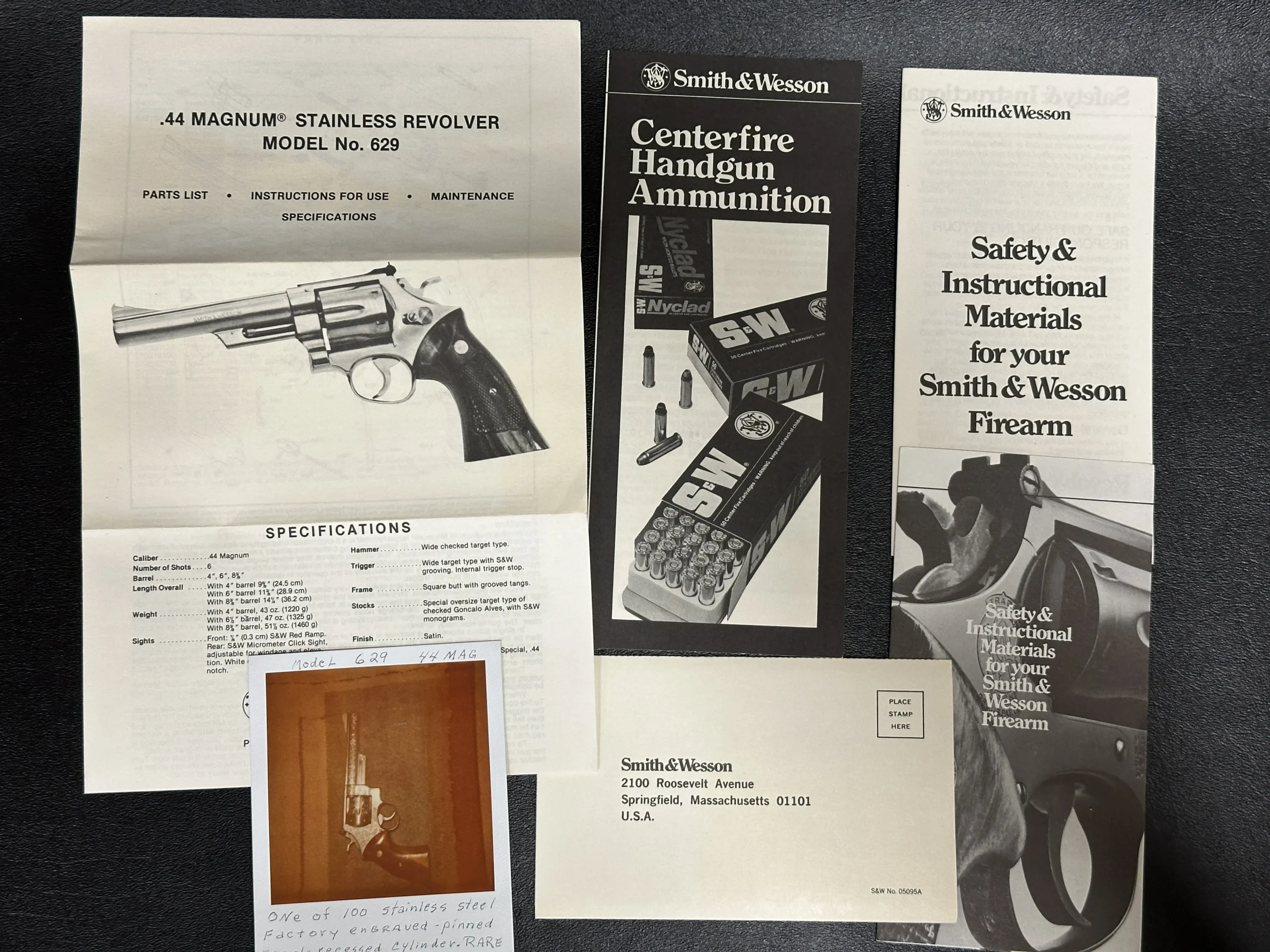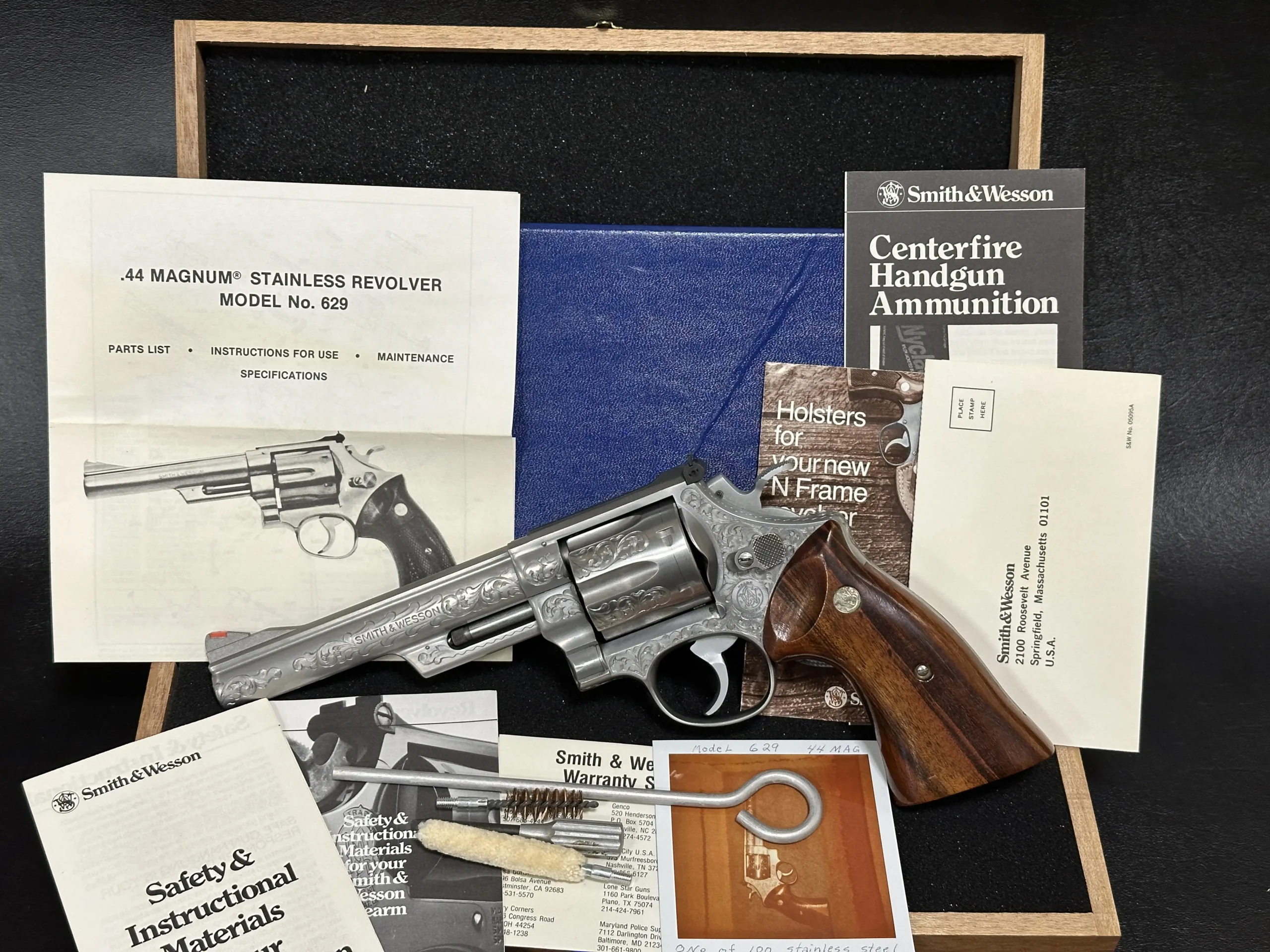 A 1980 Smith & Wesson Model 629 with factory engraving, presented with its original accessories and case. This early production stainless steel revolver features a pinned barrel and counterbored cylinder, along with a fixed orange ramp front sight, adjustable rear sight, and a matted top strap and rib.