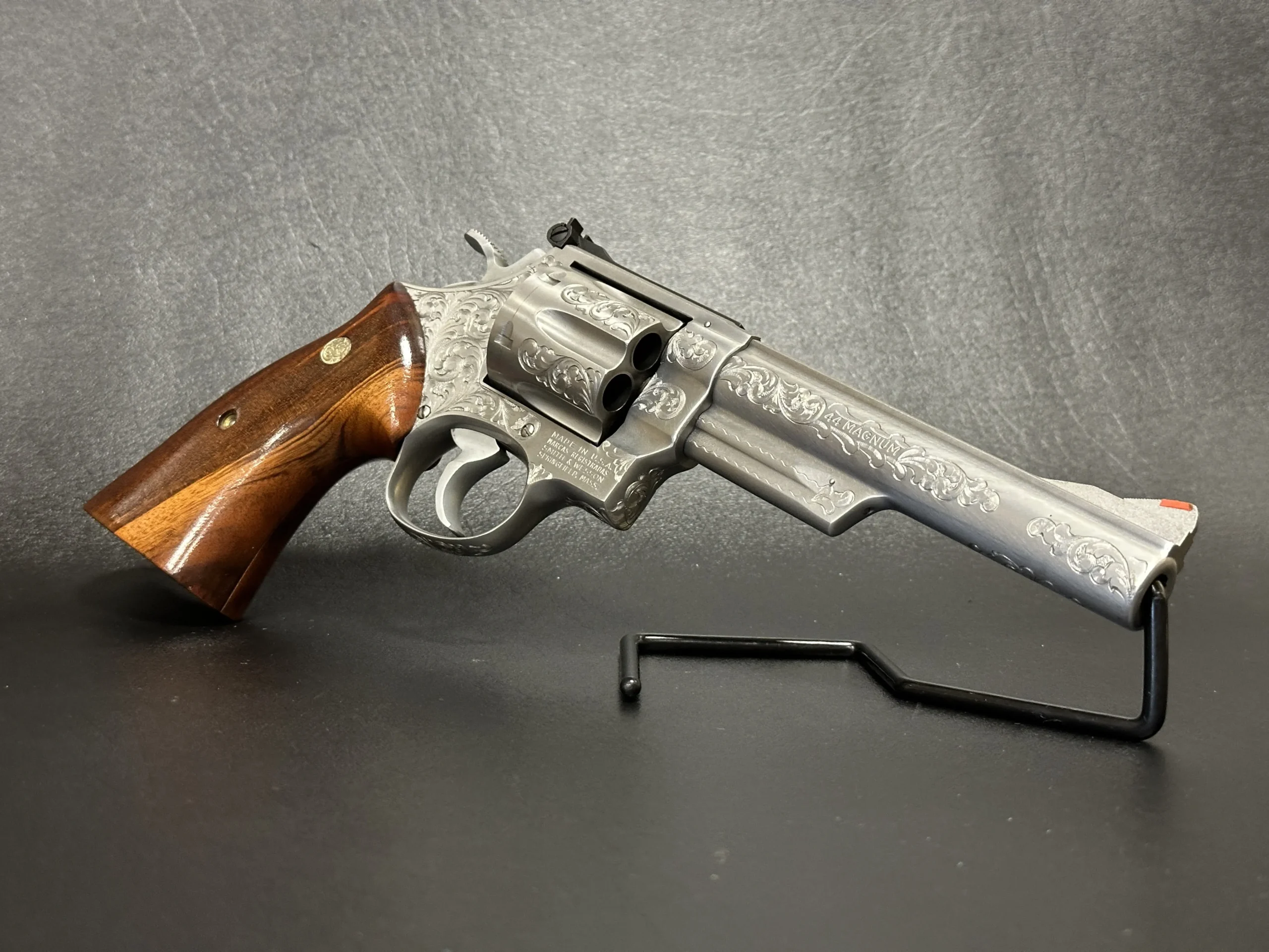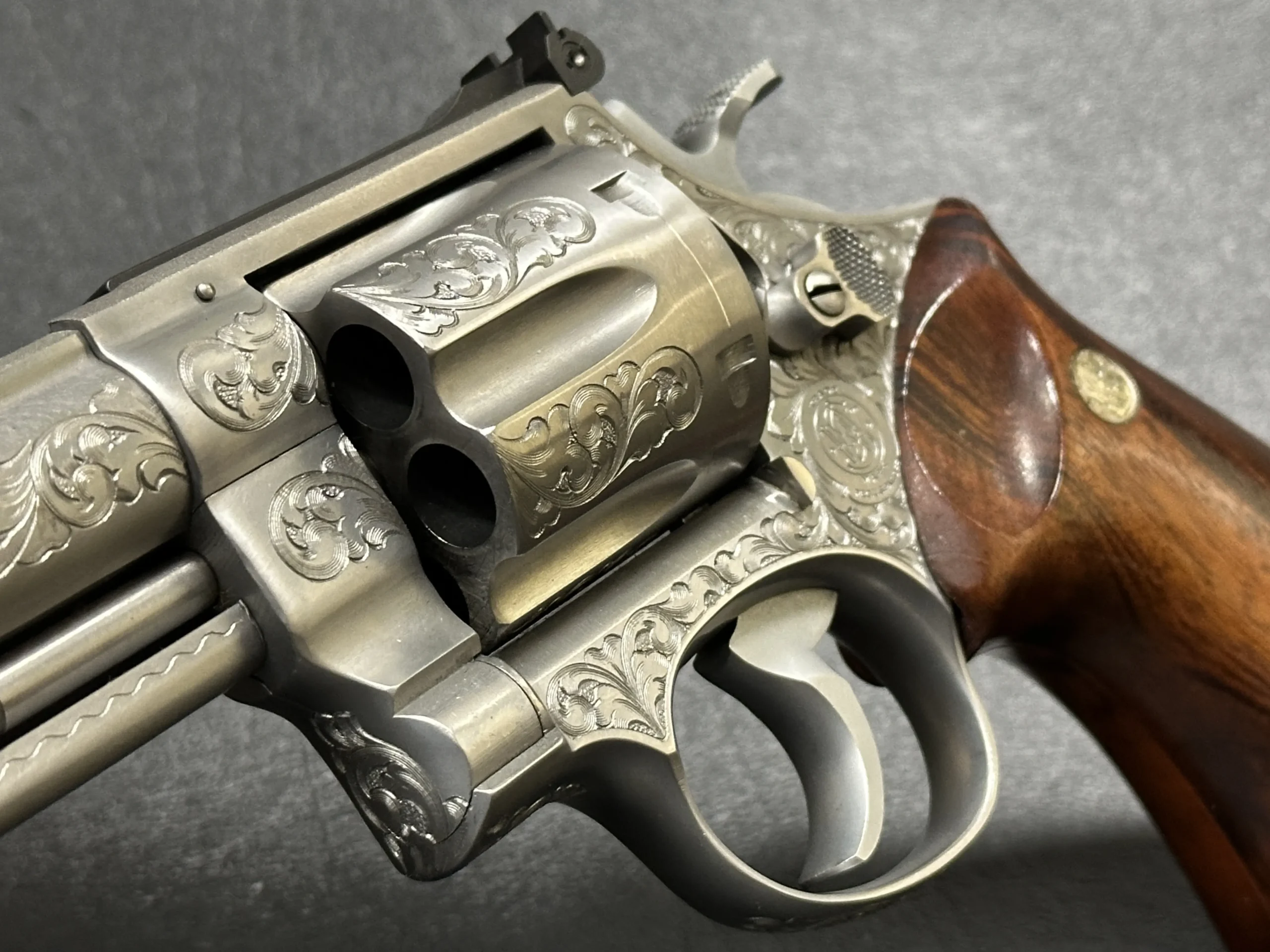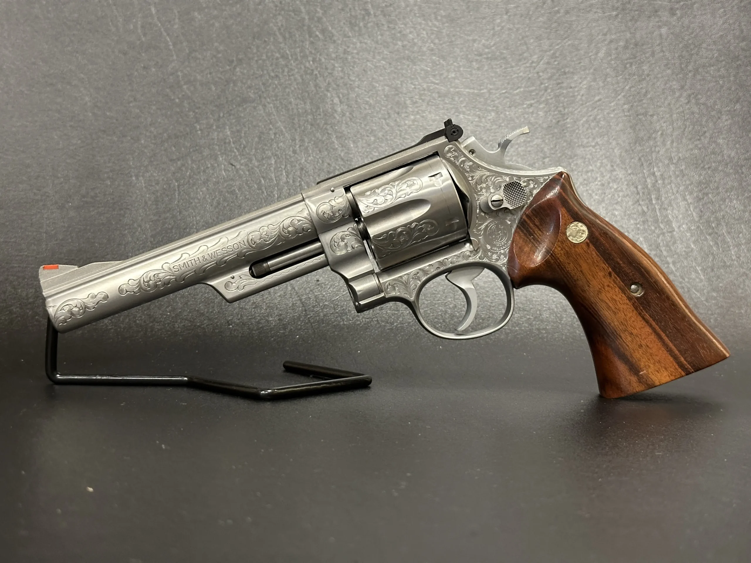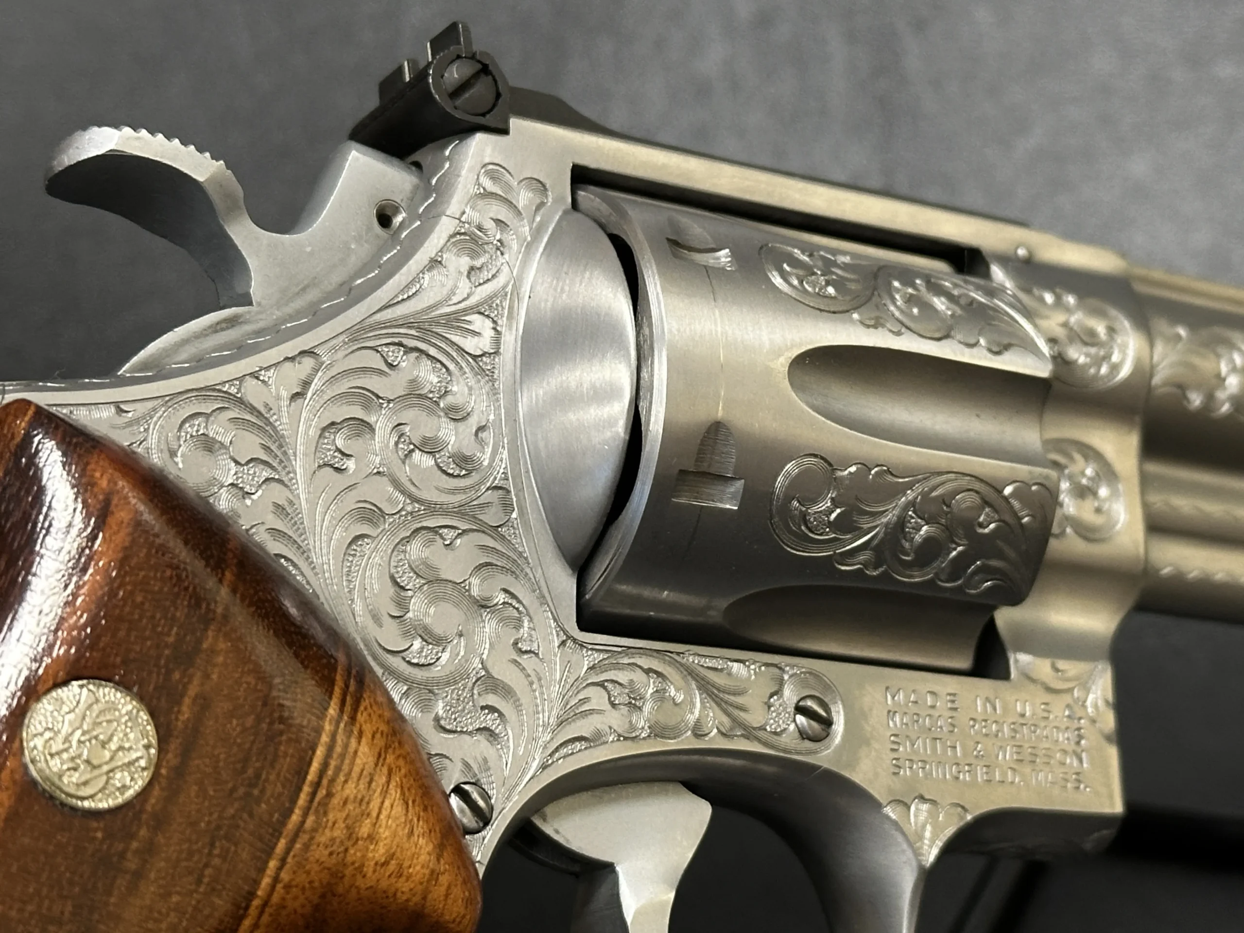The revolver is engraved with approximately 70% Class A floral scroll coverage, giving the stainless steel surfaces a detailed, period look while retaining the Model 629’s distinctive profile. It is fitted with Goncalo Alves wood grips, each inset with a silver S&W medallion.
