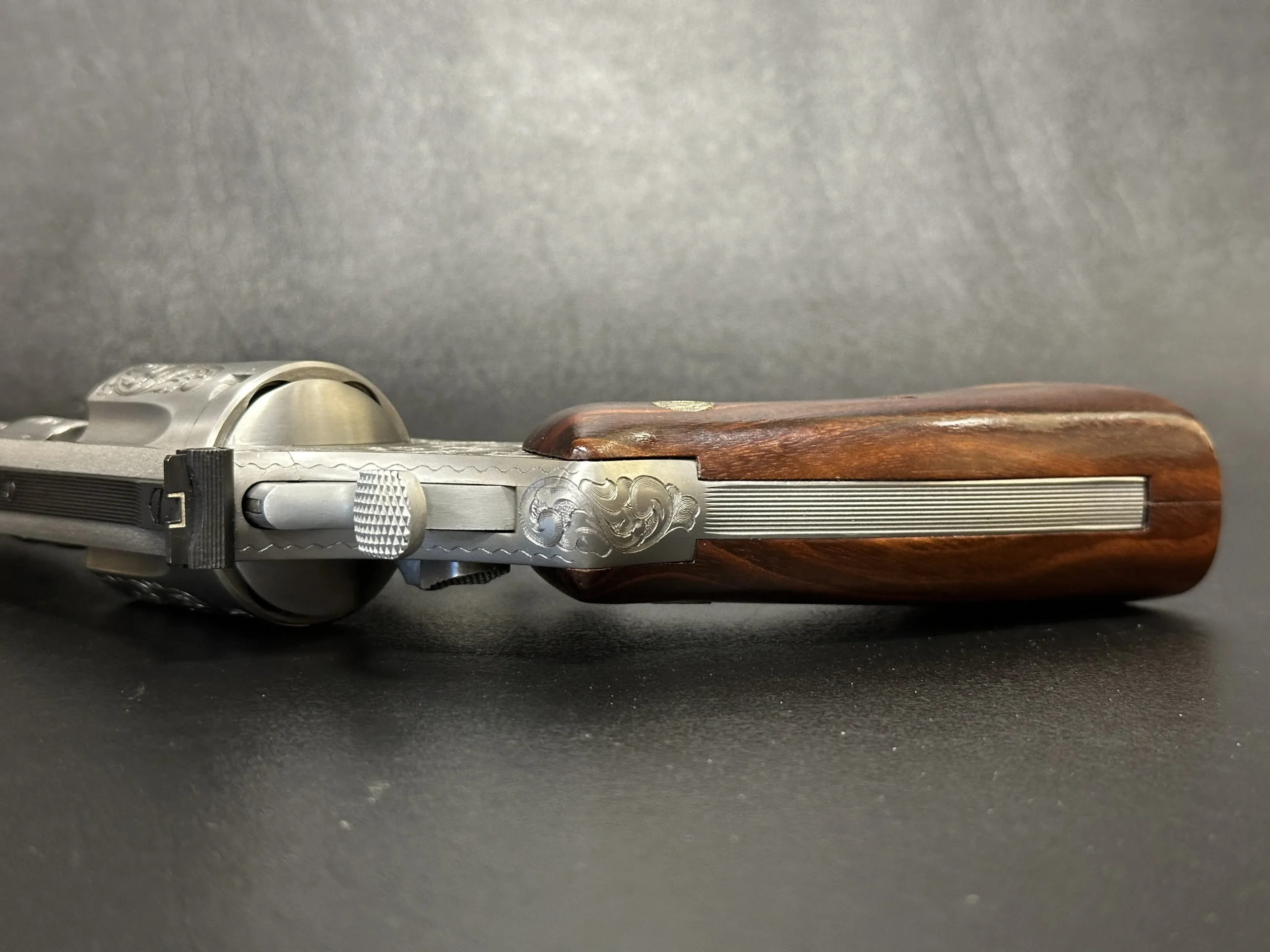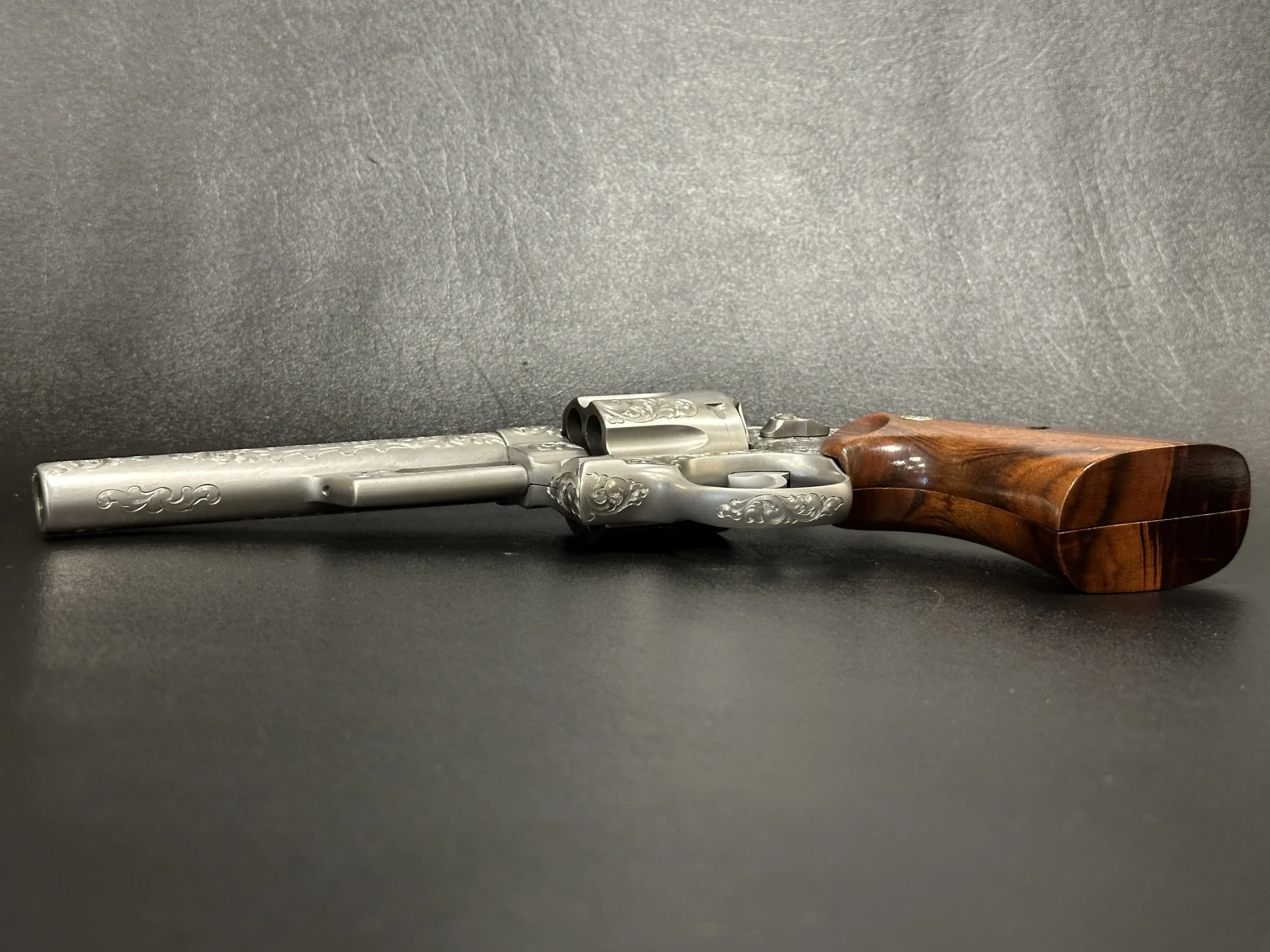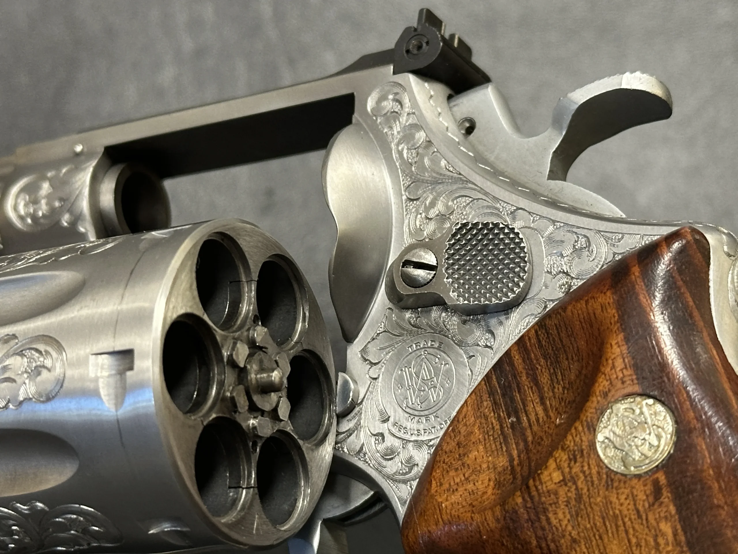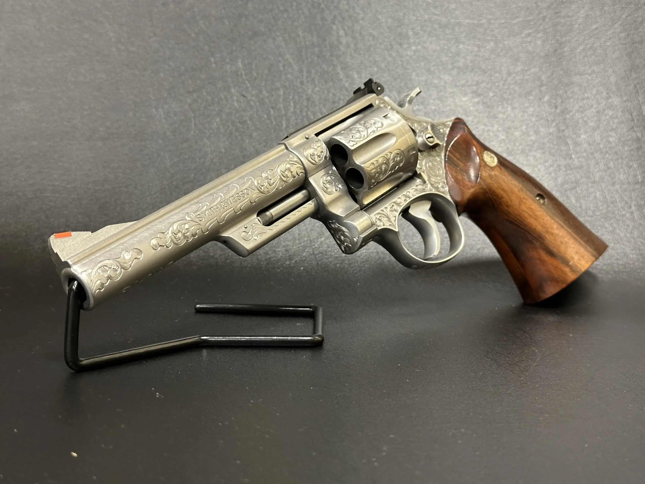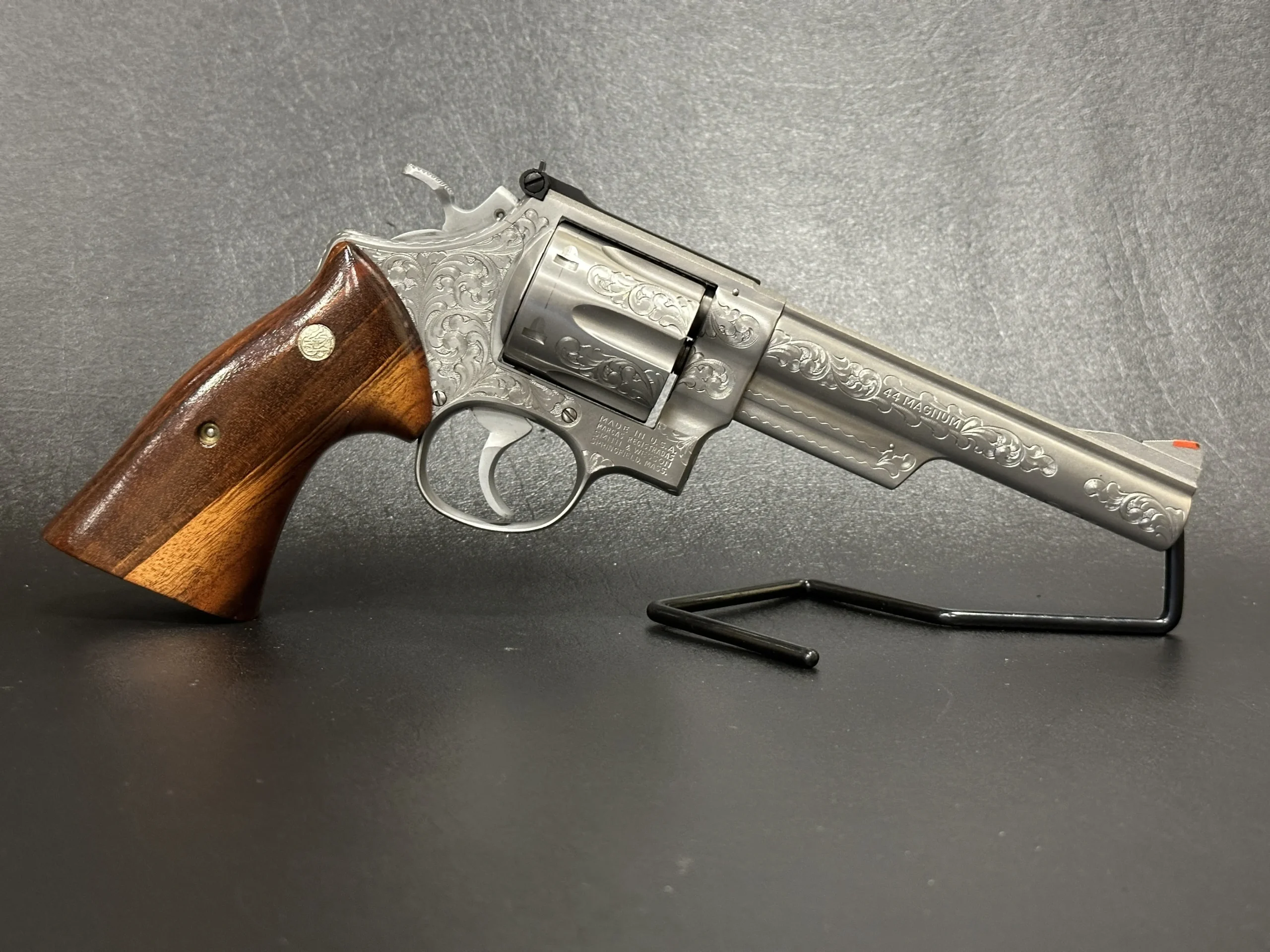 The revolver is engraved with approximately 70% Class A floral scroll coverage, giving the stainless steel surfaces a detailed, period look while retaining the Model 629’s distinctive profile. It is fitted with Goncalo Alves wood grips, each inset with a silver S&W medallion.
