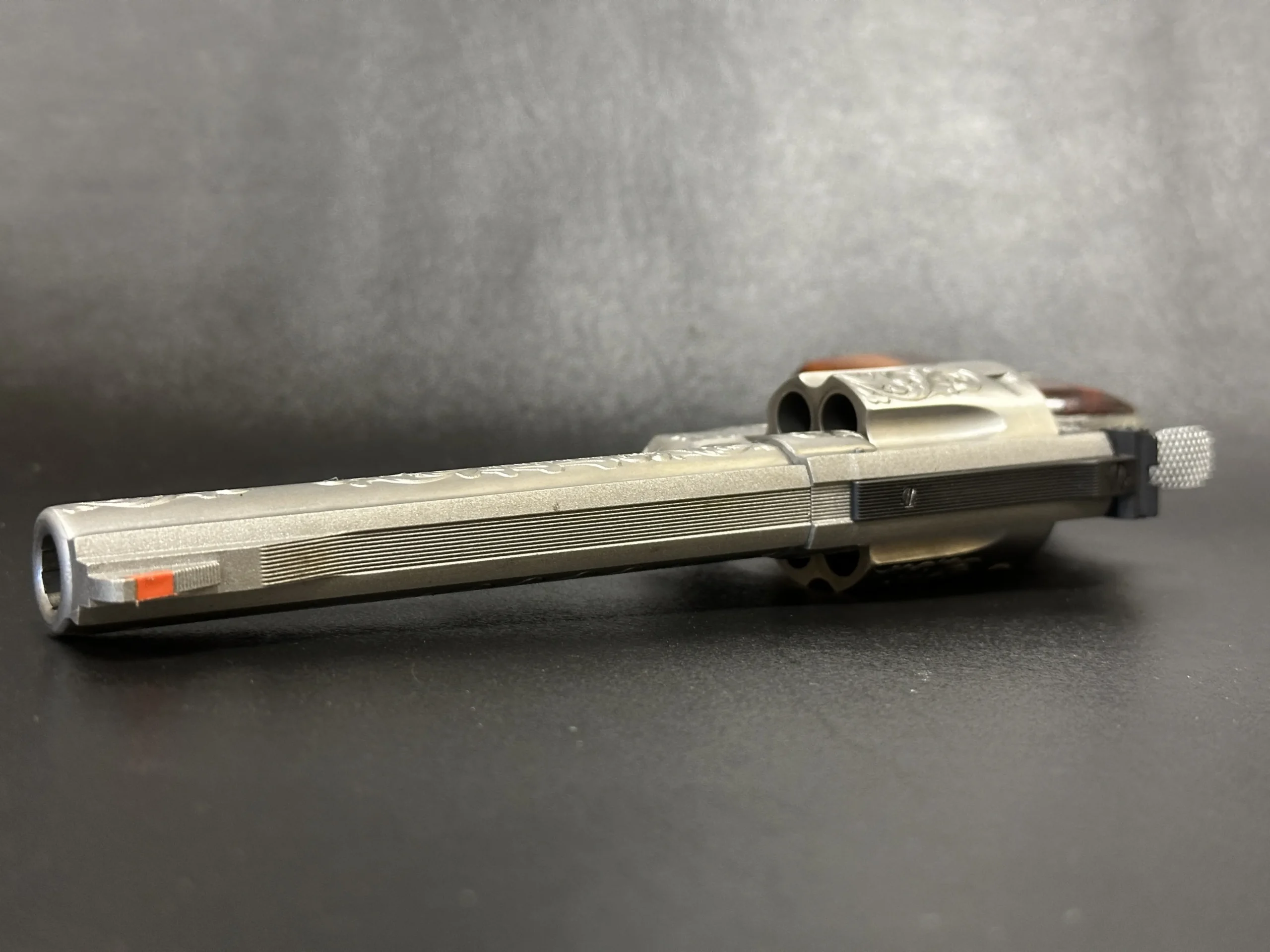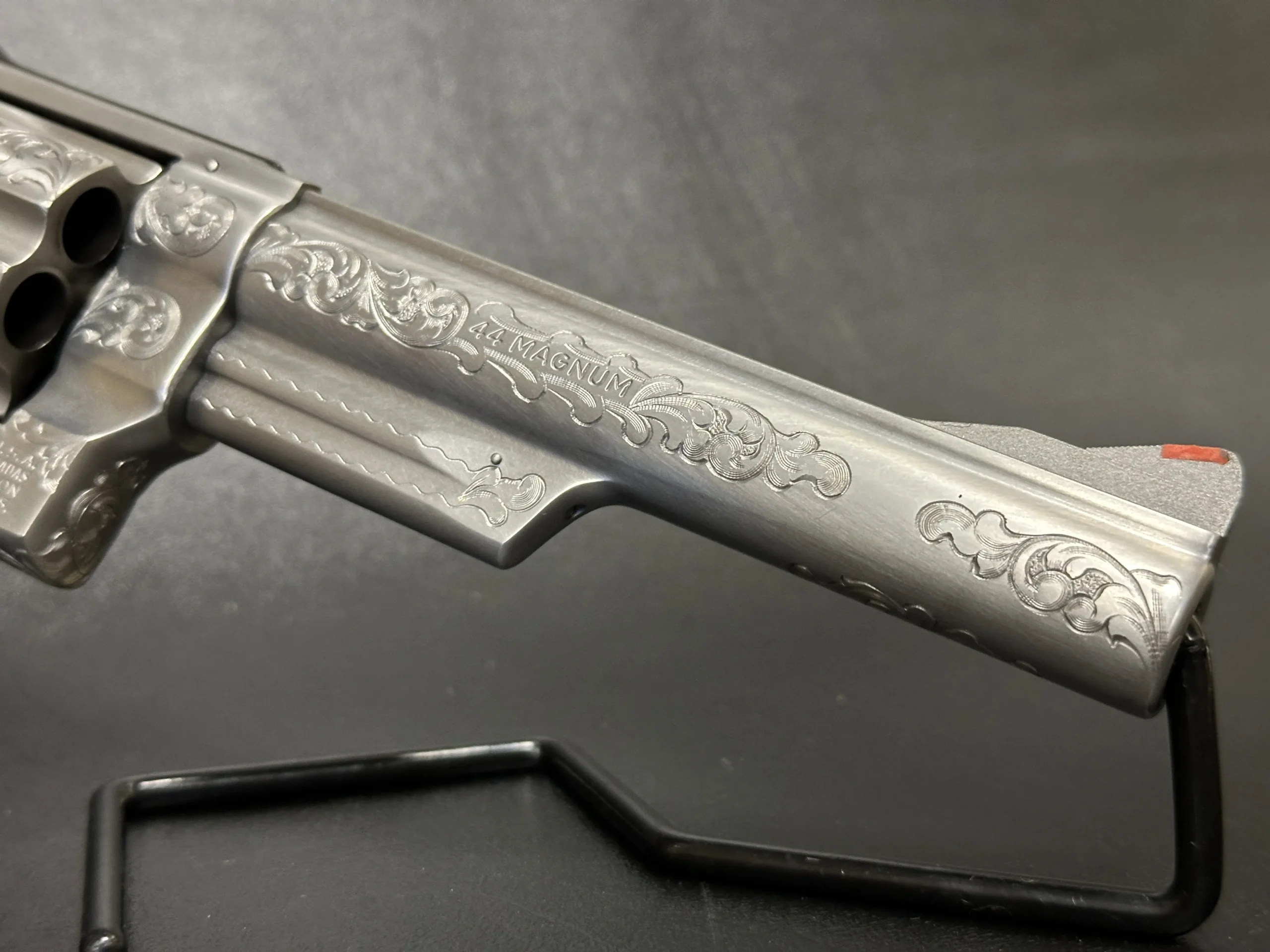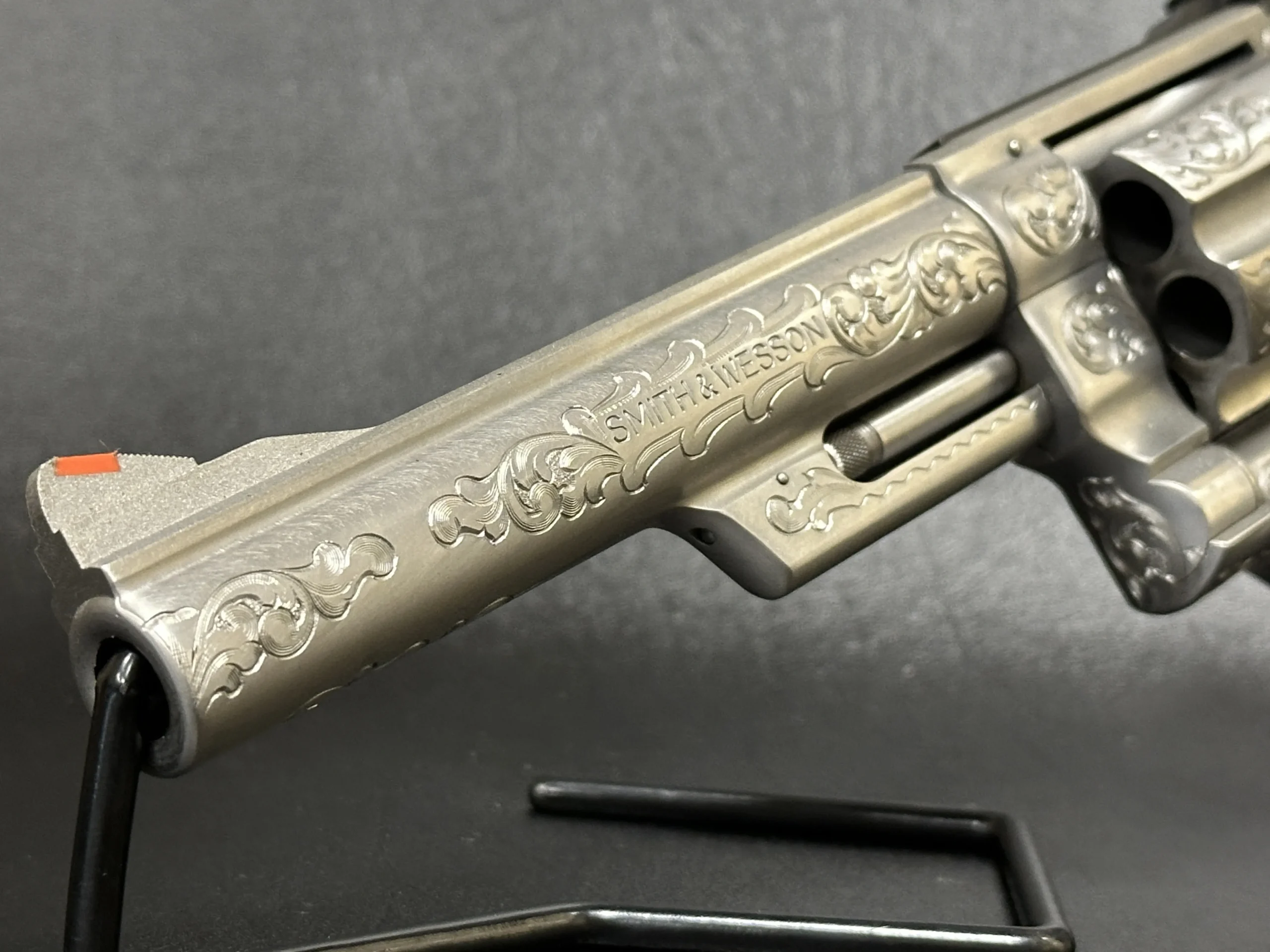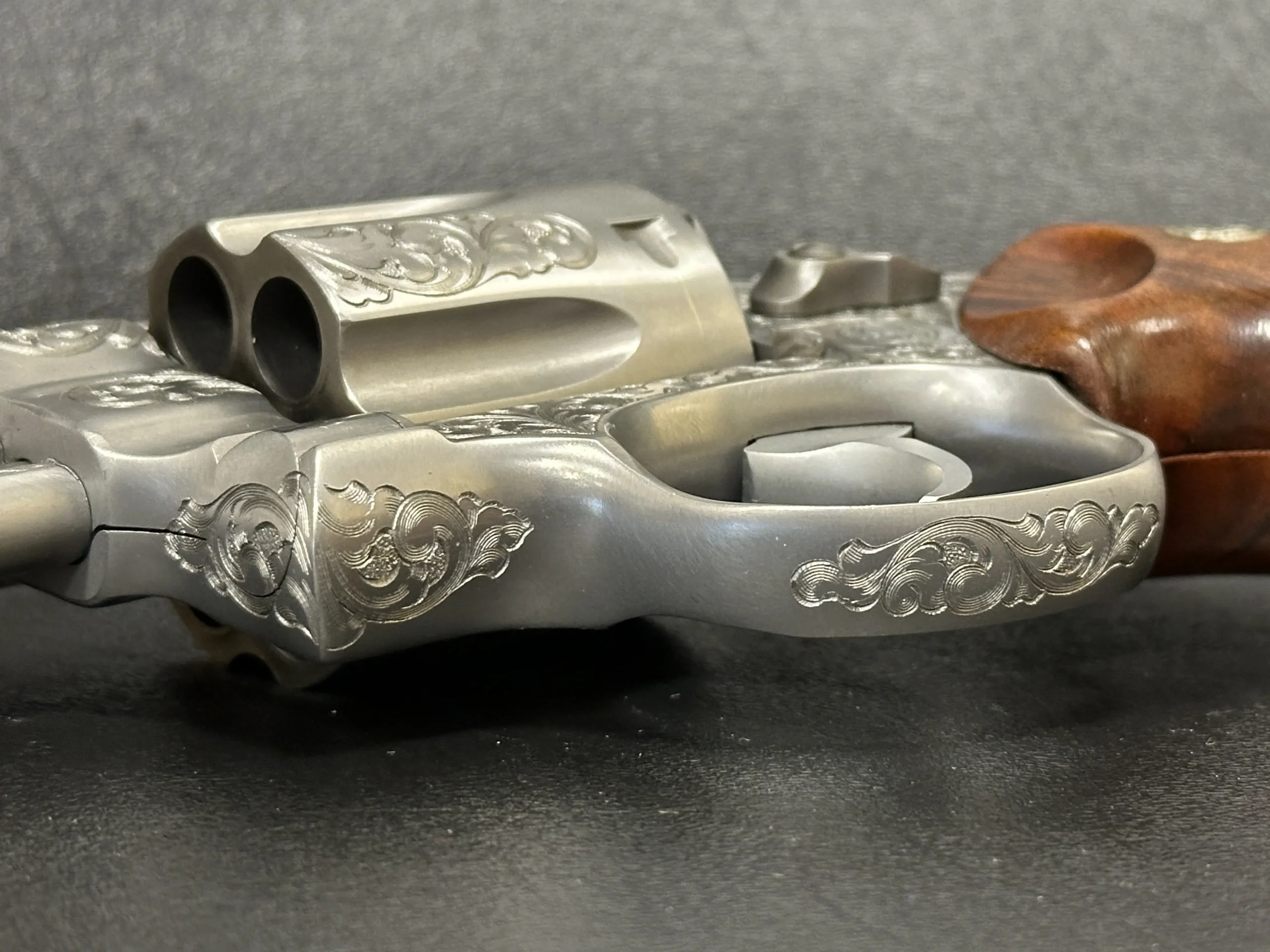 The revolver is engraved with approximately 70% Class A floral scroll coverage, giving the stainless steel surfaces a detailed, period look while retaining the Model 629’s distinctive profile. It is fitted with Goncalo Alves wood grips, each inset with a silver S&W medallion.