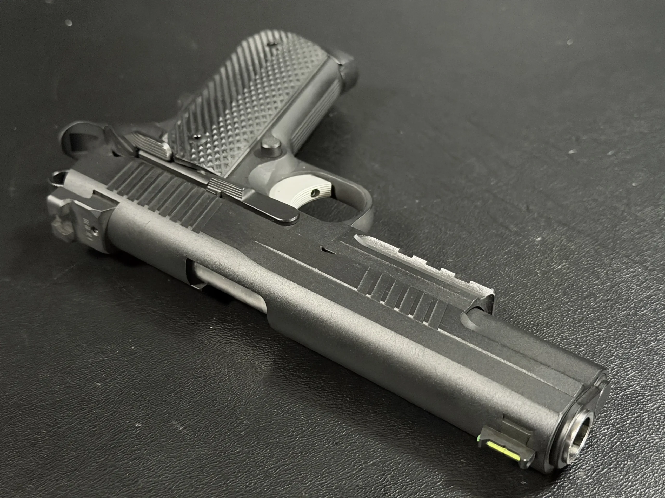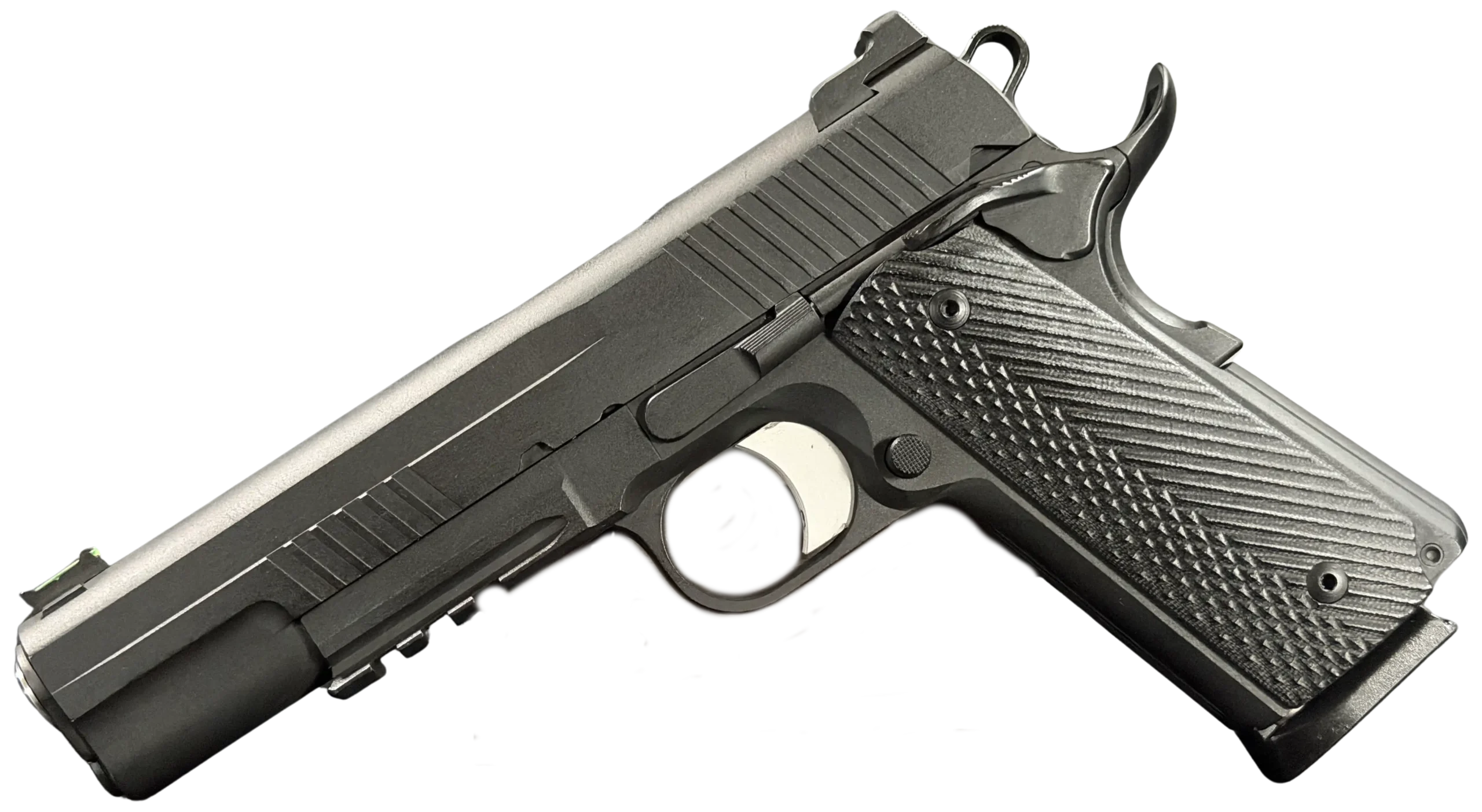 A matte tactical finish gives the pistol a subdued, non-reflective look and complements the carefully machined contours of the slide and frame. The overall presentation is understated and functional, with a balanced profile that stays true to the 1911’s recognizable silhouette.