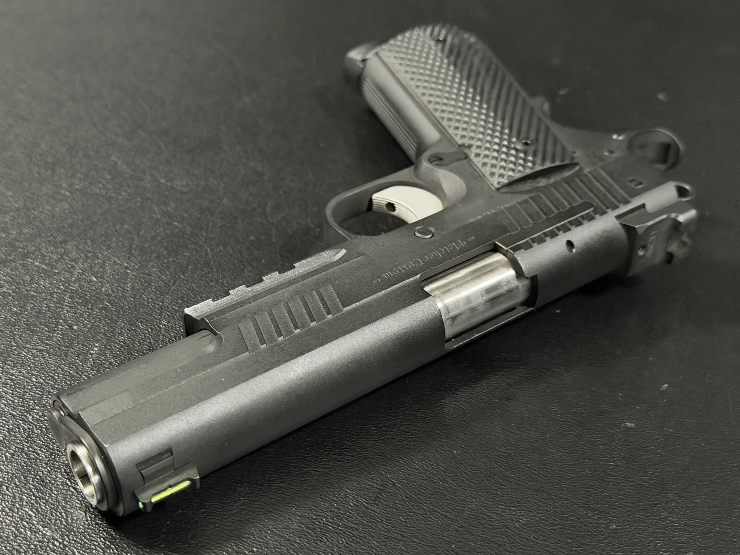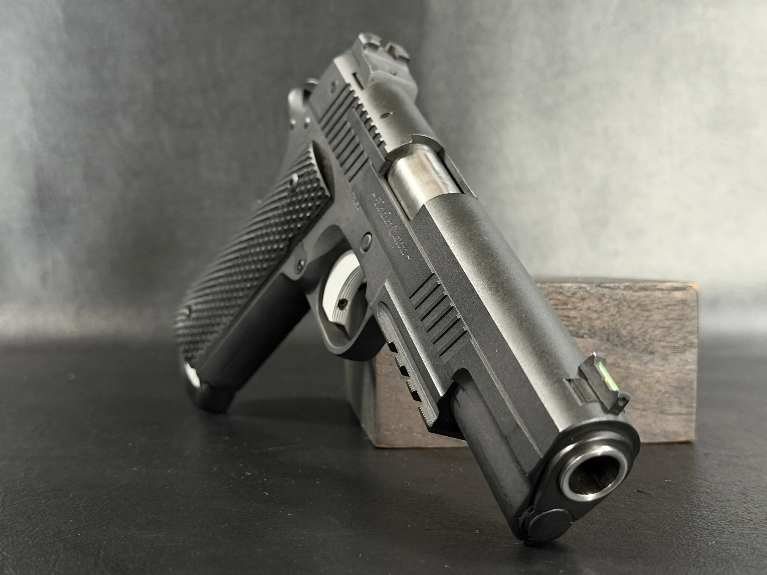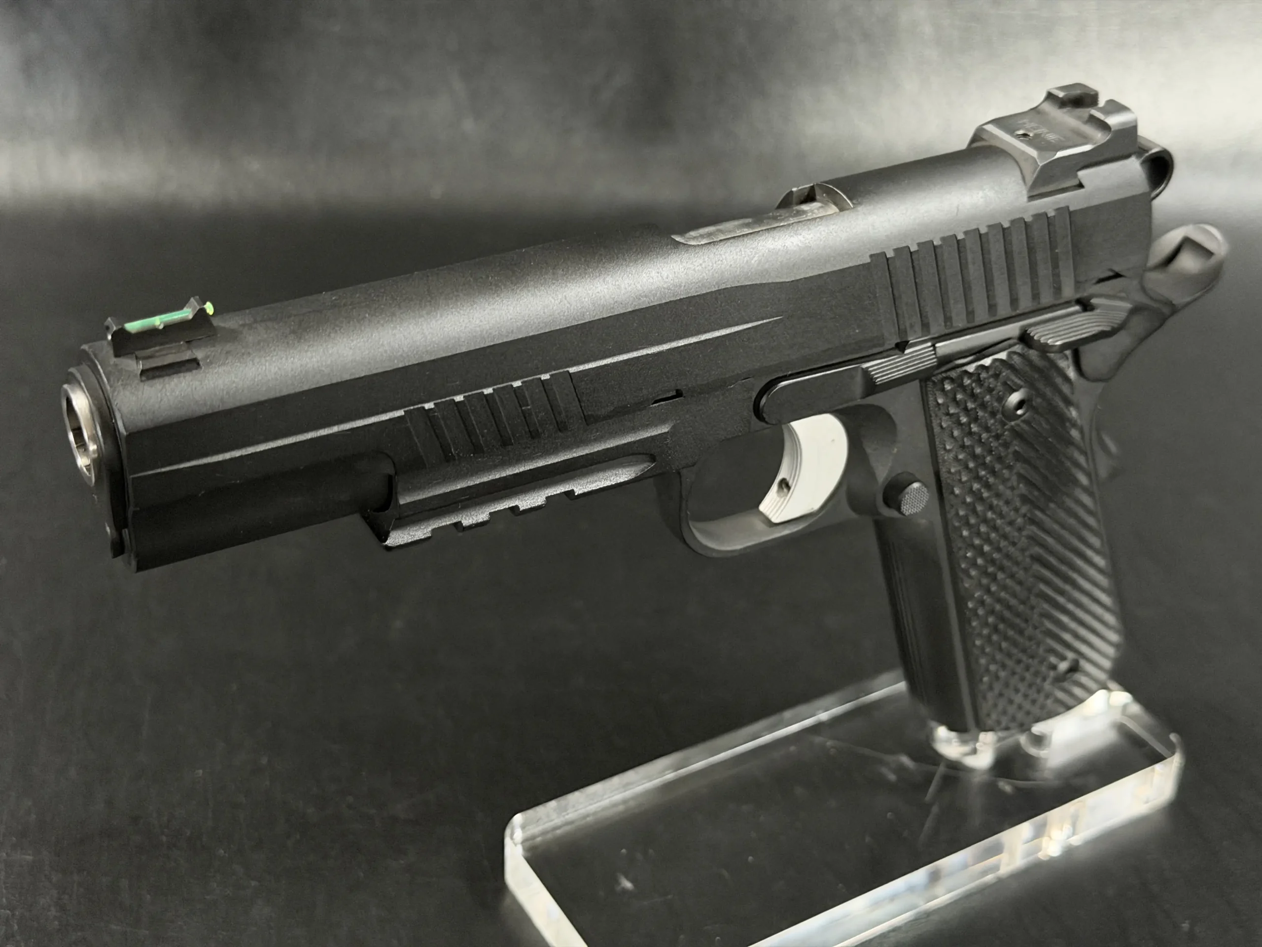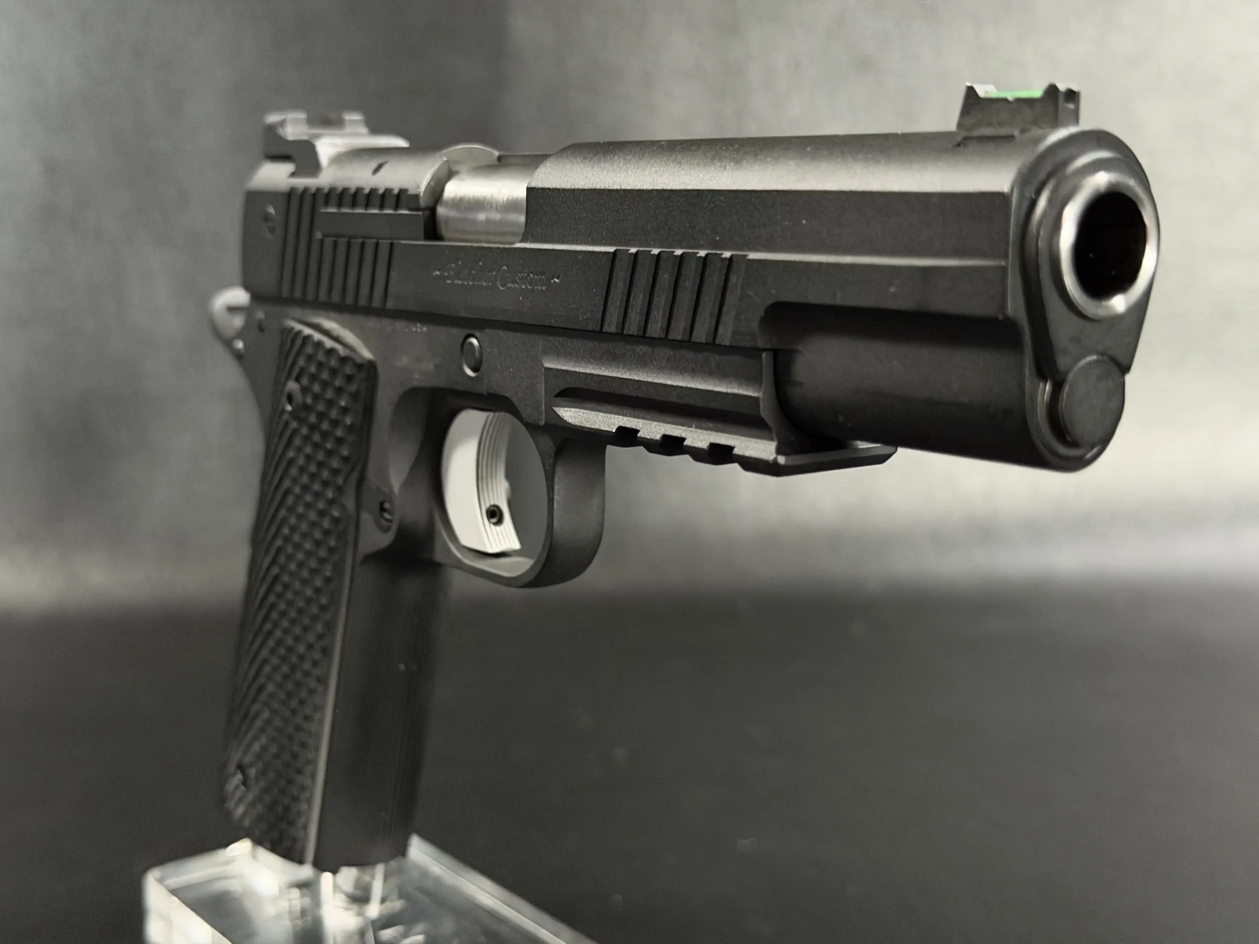 Up top, high-visibility sights include a fiber-optic front sight paired with a clean rear sight profile for quick sight acquisition. Chambered in 9mm, this Fletcher Customs 1911 offers a modern configuration with refined handling and thoughtful custom detail throughout.