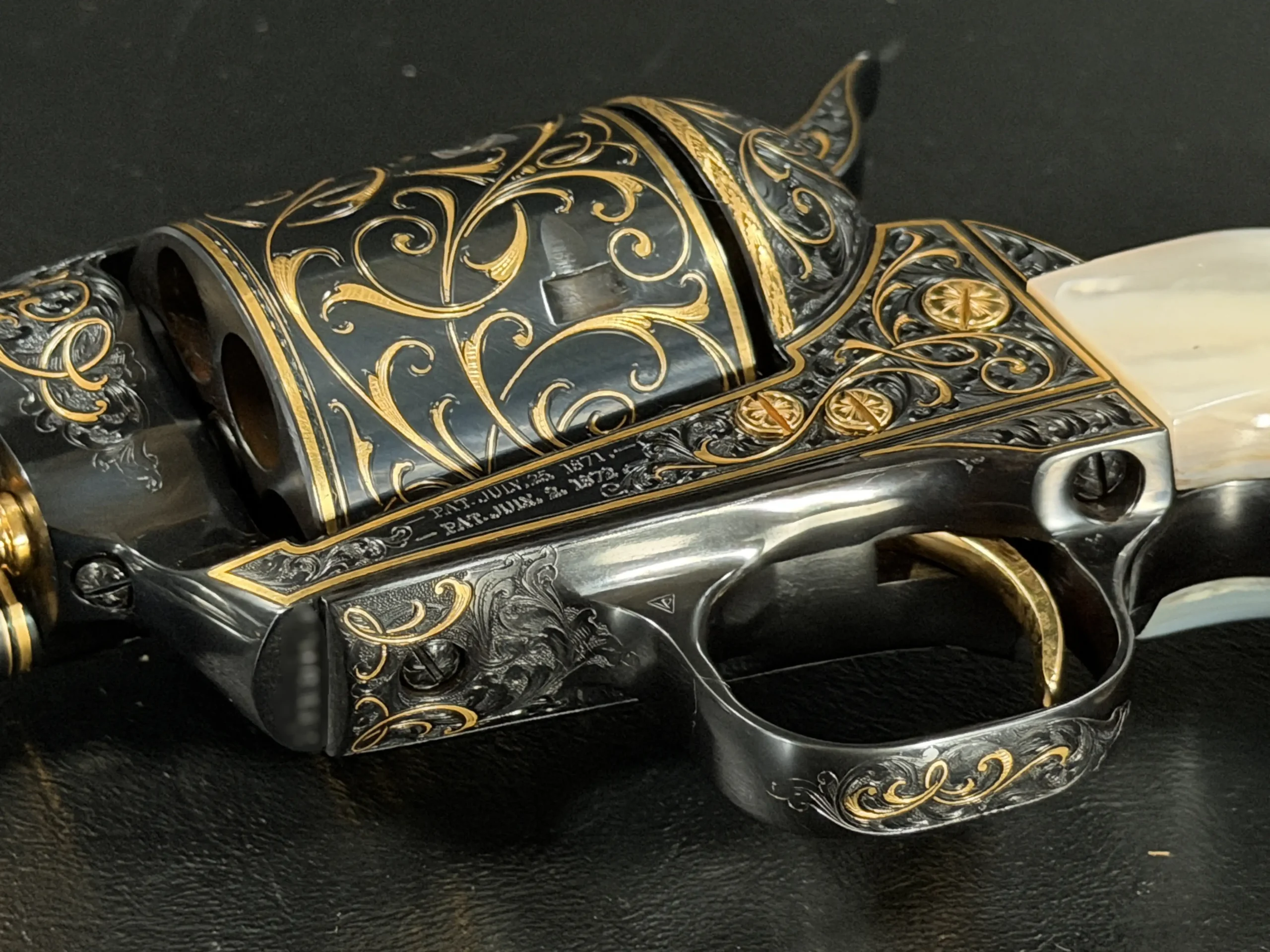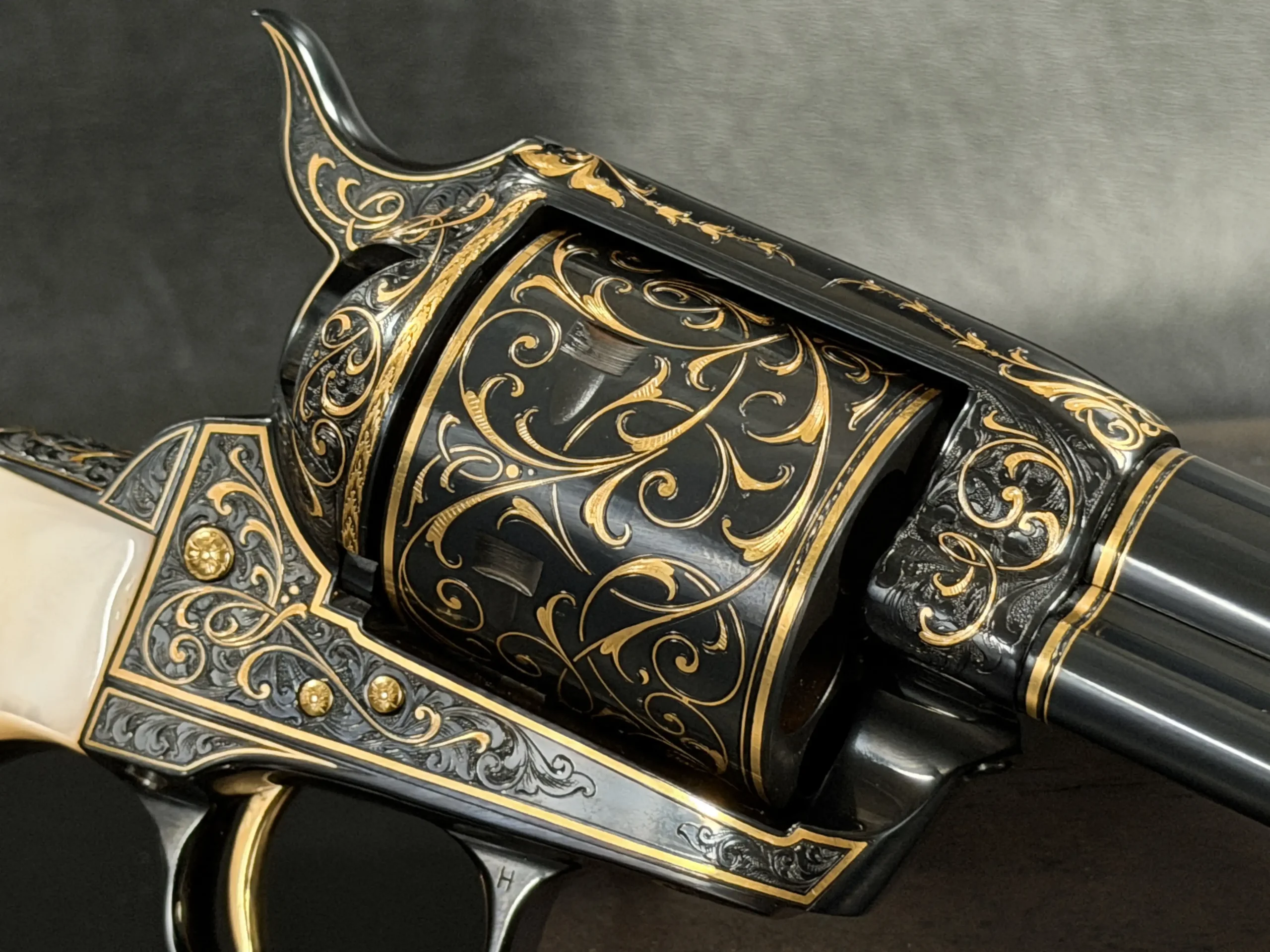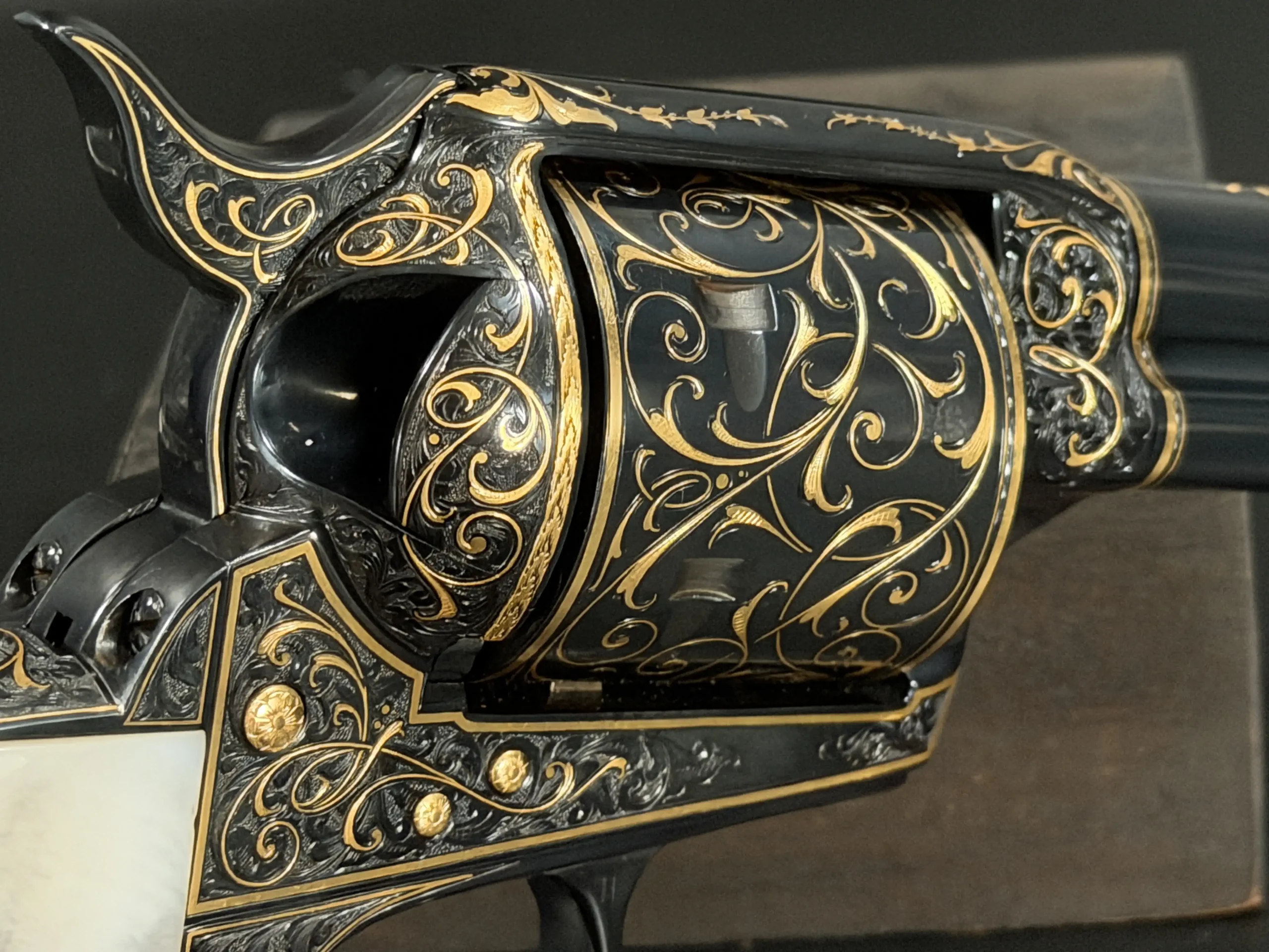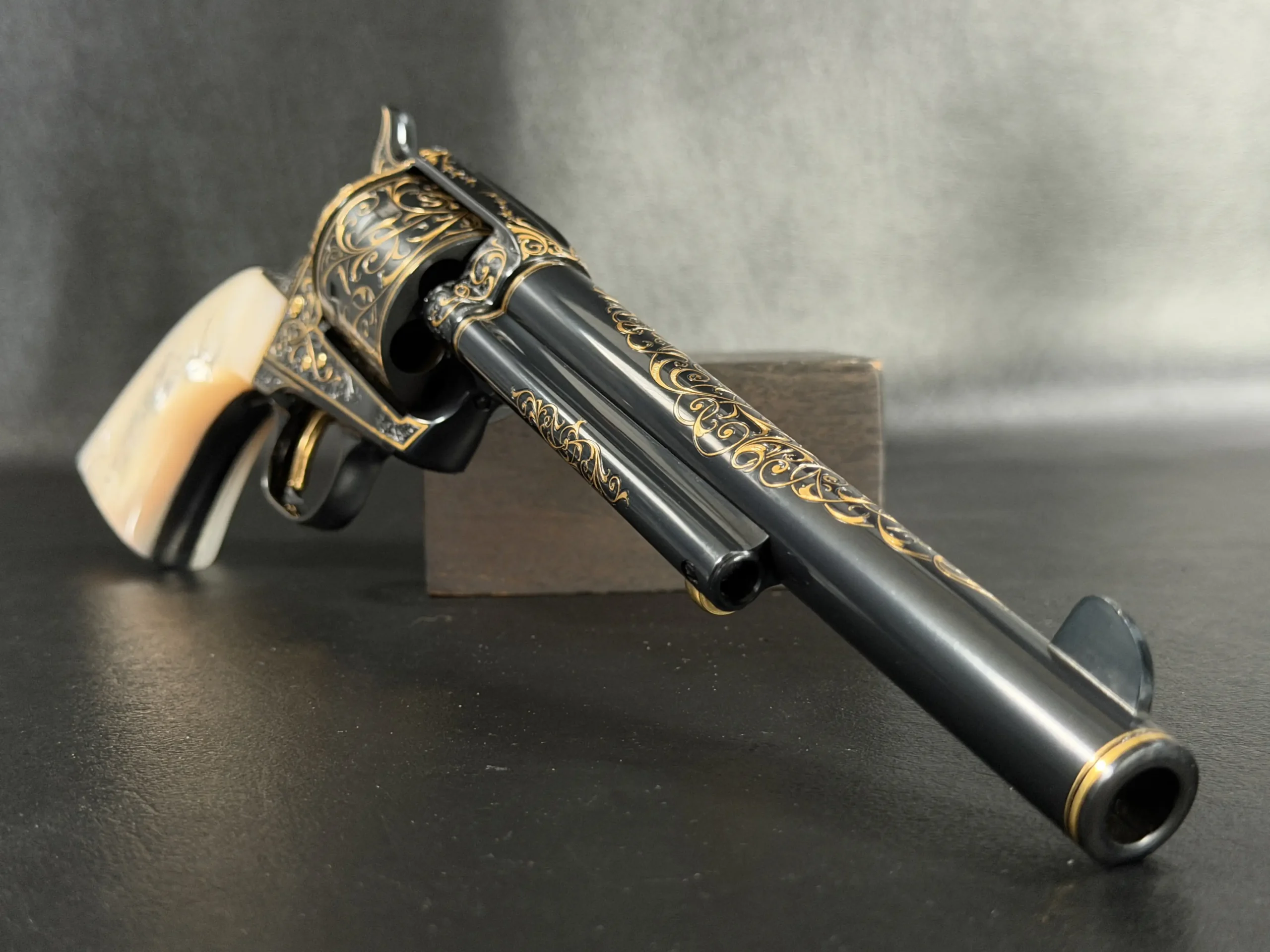 George B. Spring engraved Colts occupy a distinctive place in modern Colt craftsmanship, and this 3rd Generation Colt Single Action Army is a striking example of that work. Finished in Colt Royal Blue and chambered in .45 Colt, the revolver was factory-supplied and later engraved and gold-inlaid by George B. Spring.