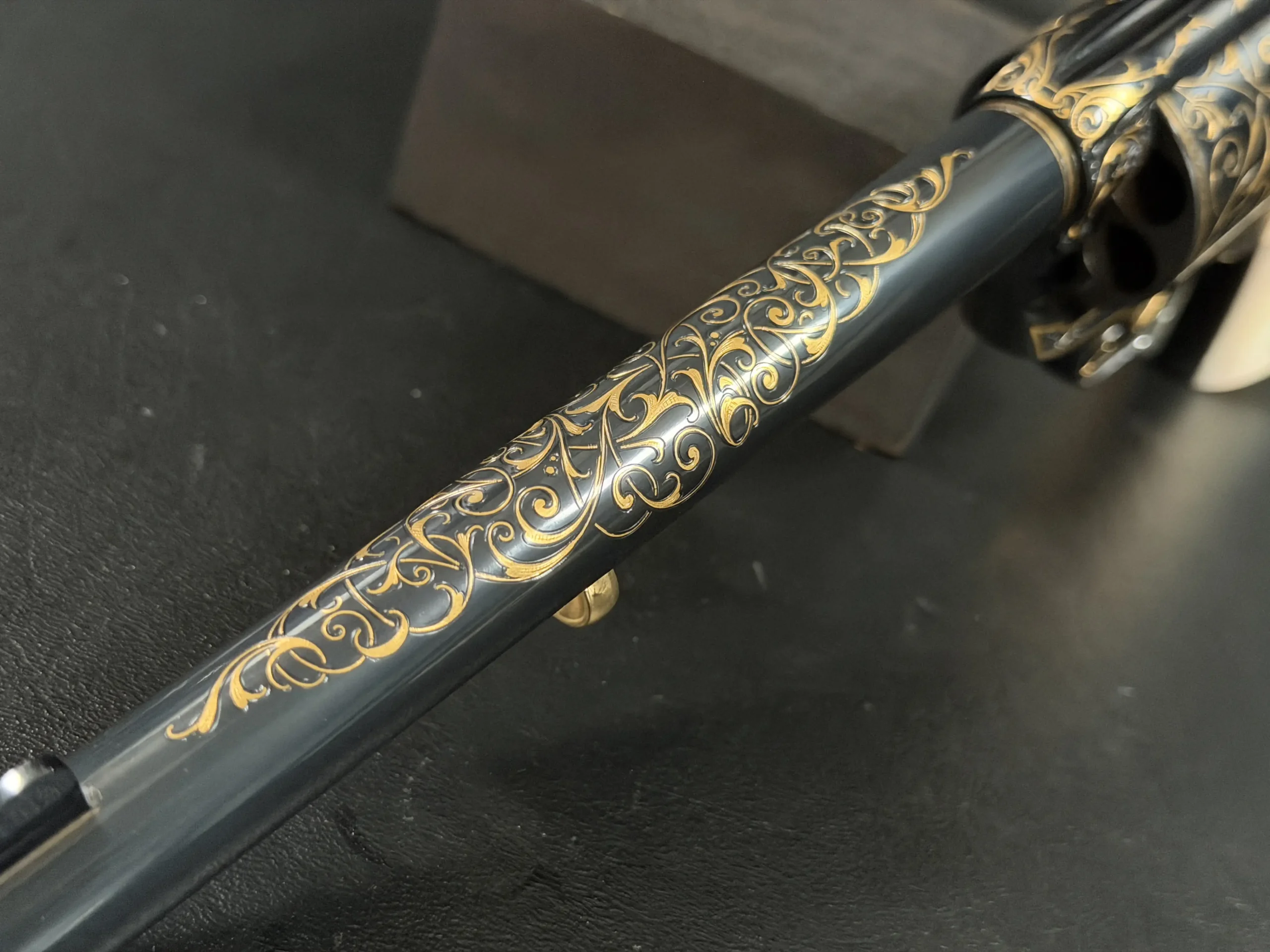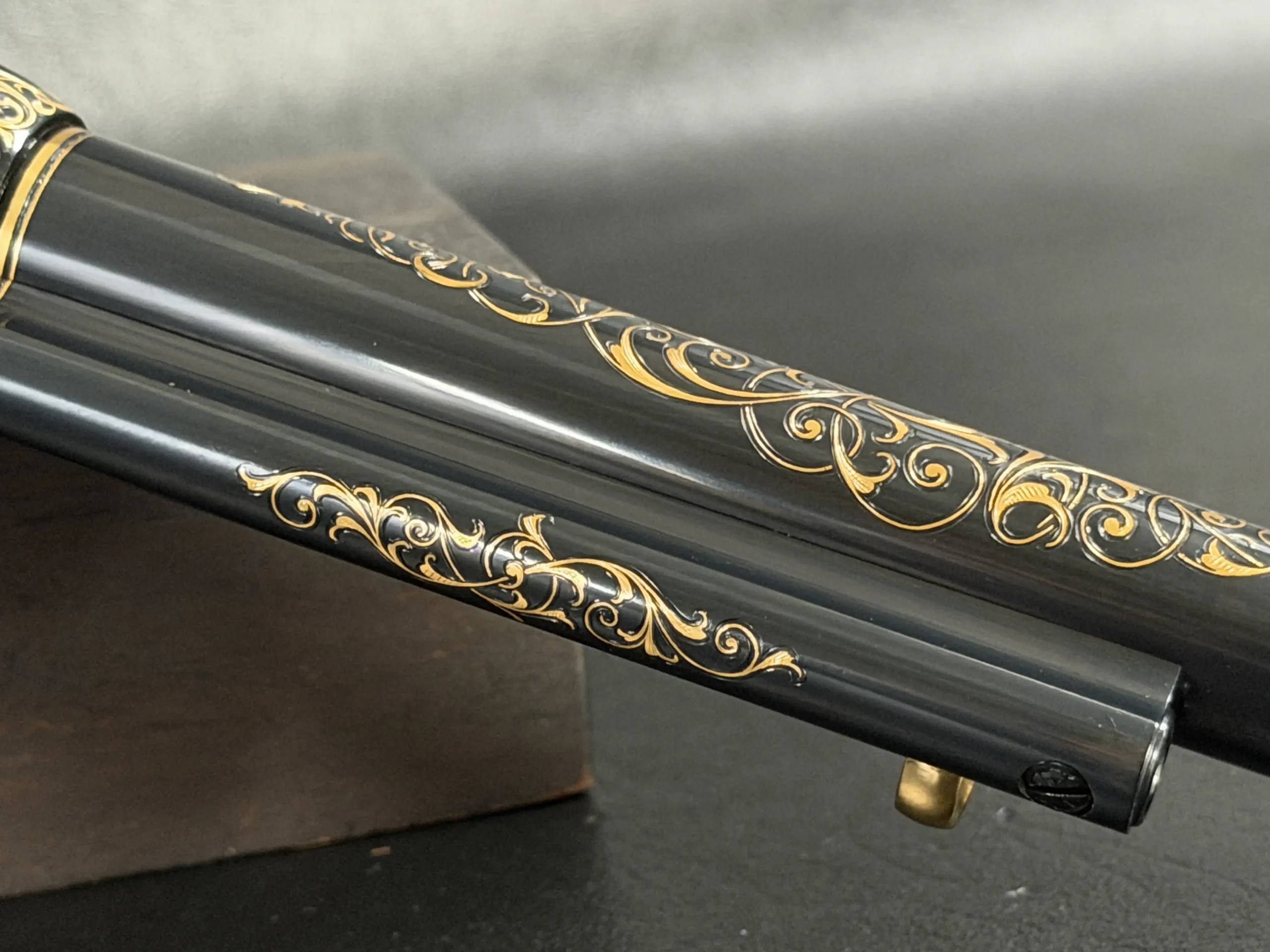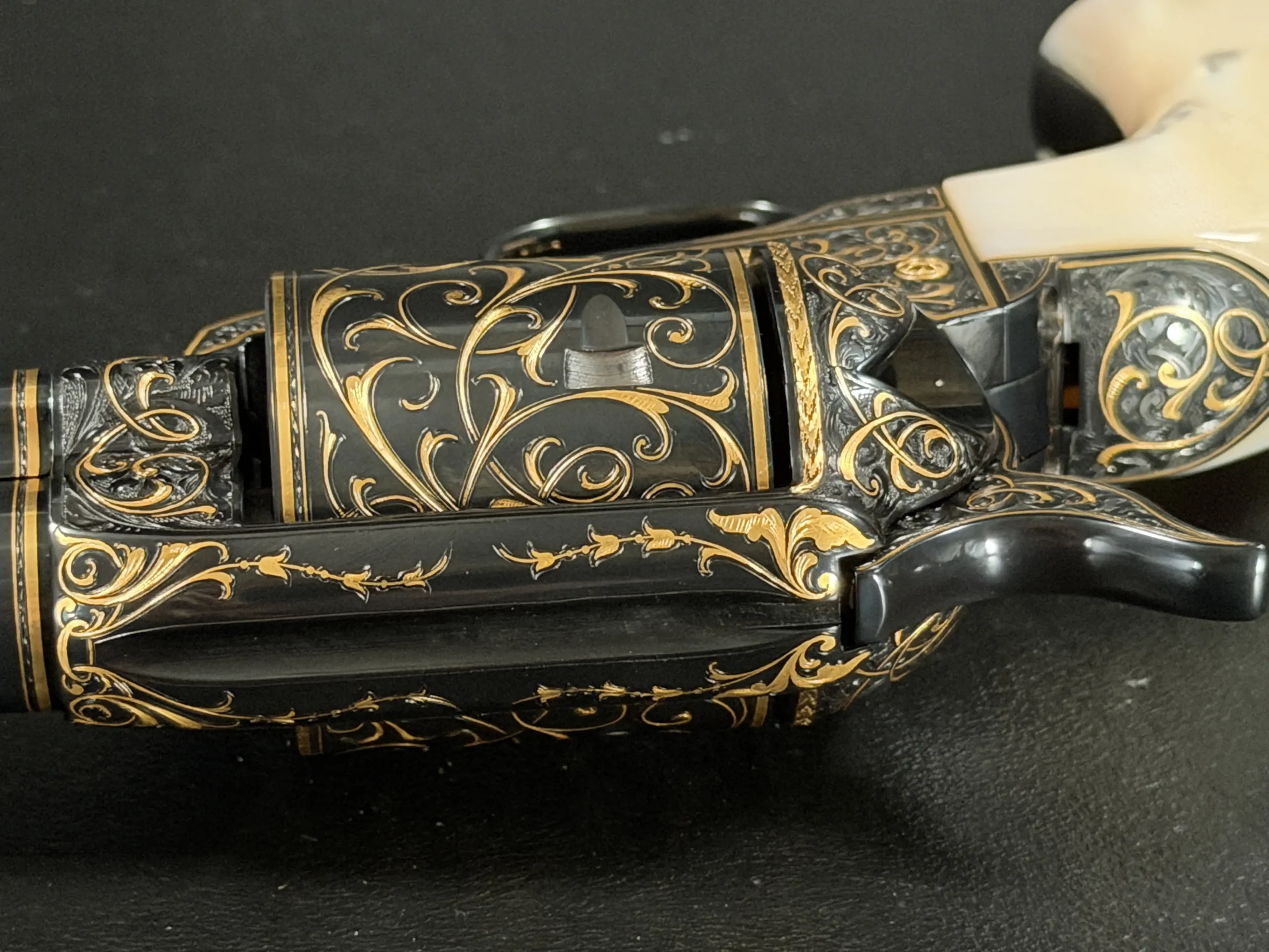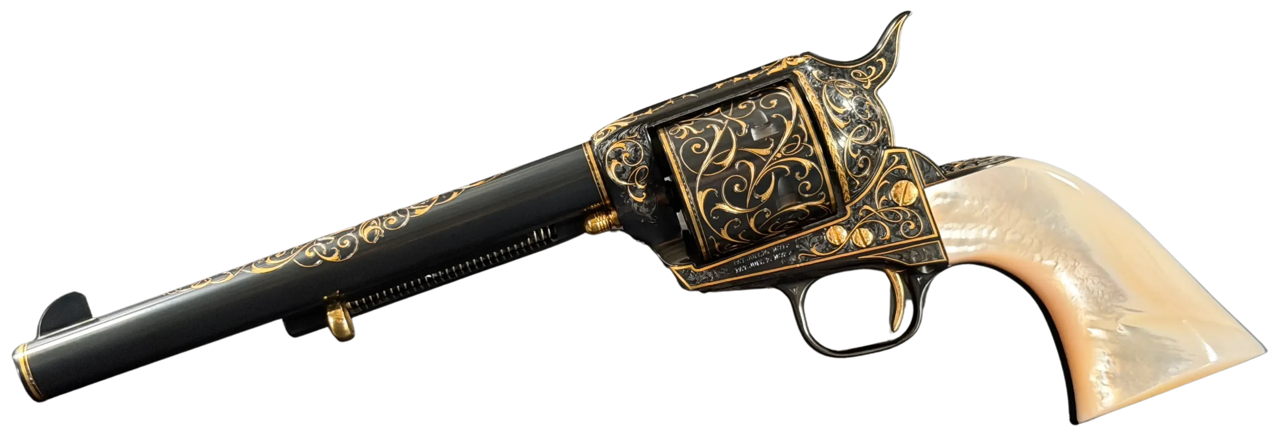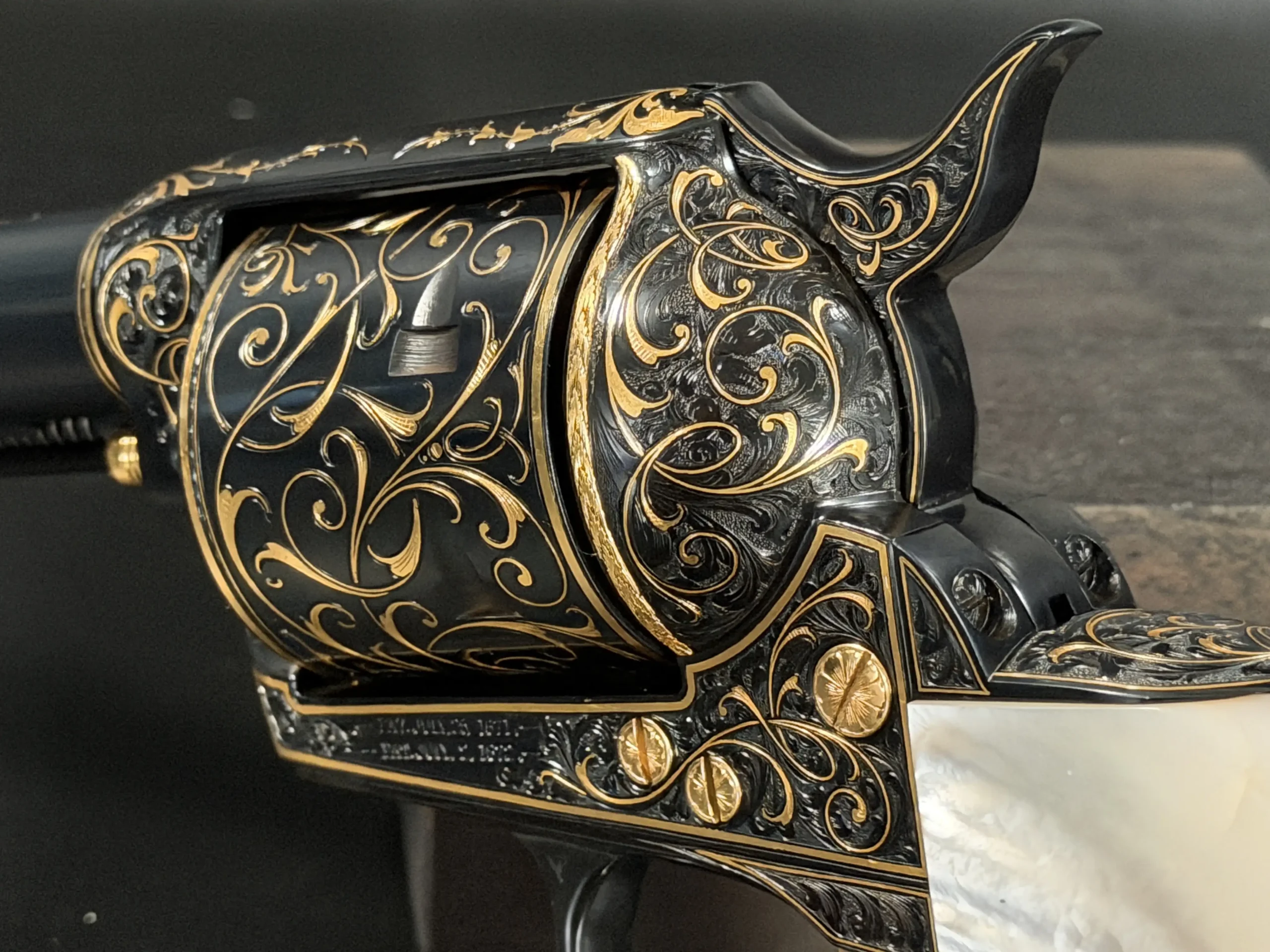 George B. Spring engraved Colts occupy a distinctive place in modern Colt craftsmanship, and this 3rd Generation Colt Single Action Army is a striking example of that work. Finished in Colt Royal Blue and chambered in .45 Colt, the revolver was factory-supplied and later engraved and gold-inlaid by George B. Spring.