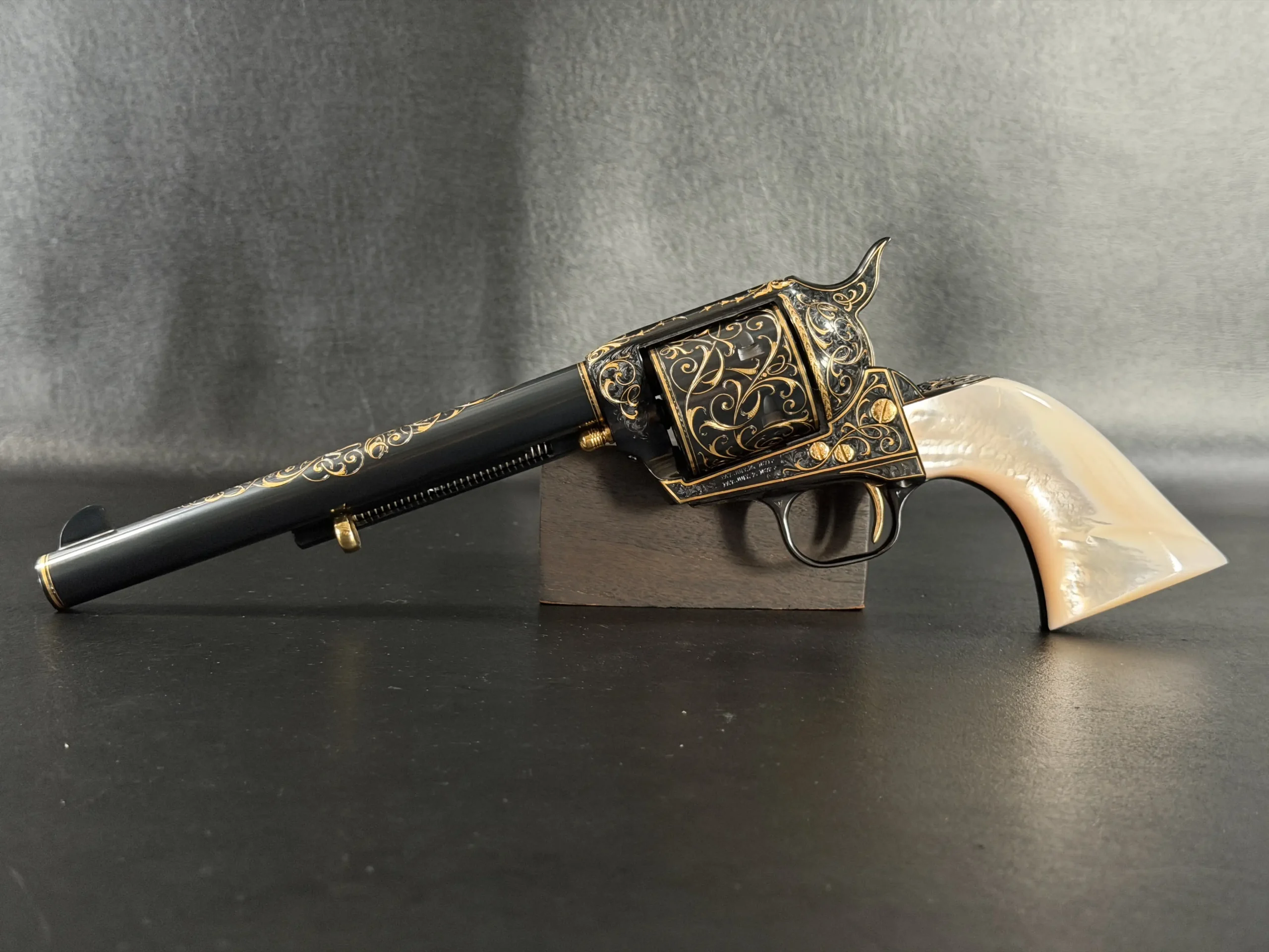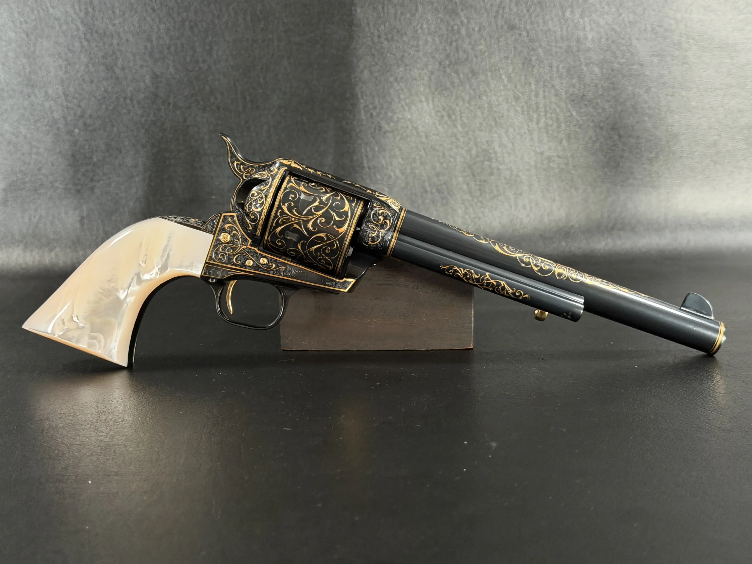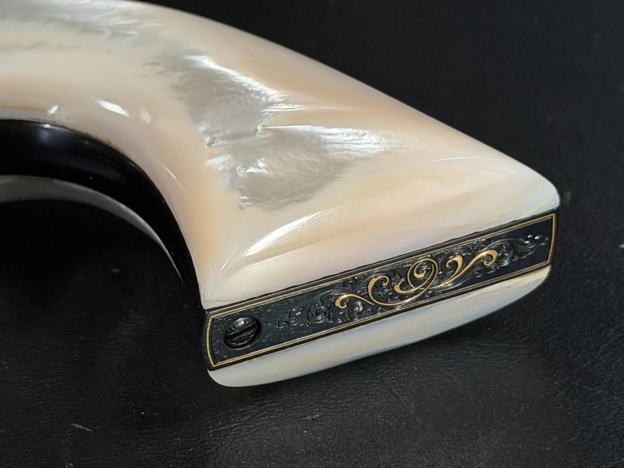 A one-piece smooth Mother-of-Pearl grip complements the overall presentation, and gold-finished screws and accents tie the design together throughout the revolver.