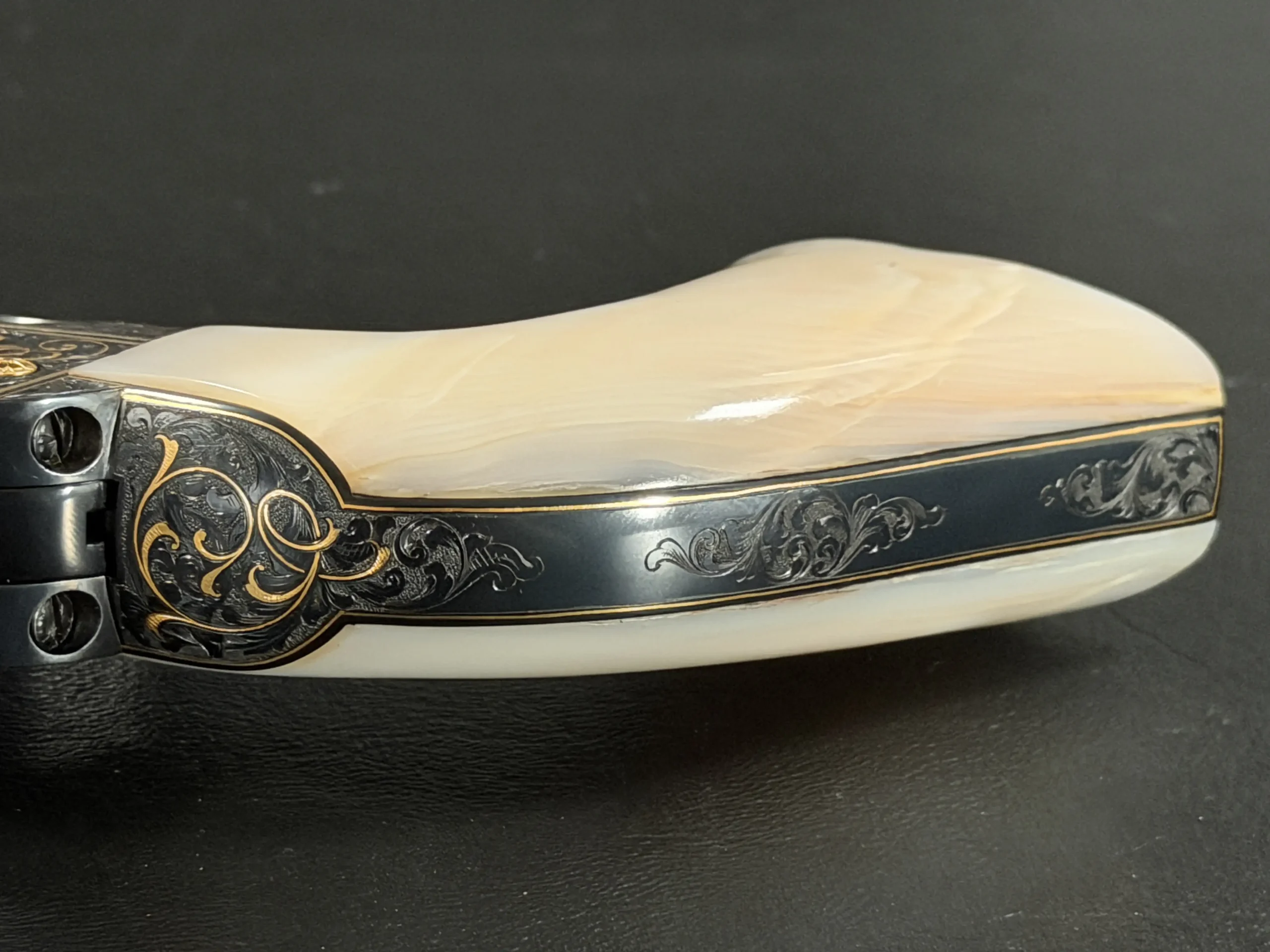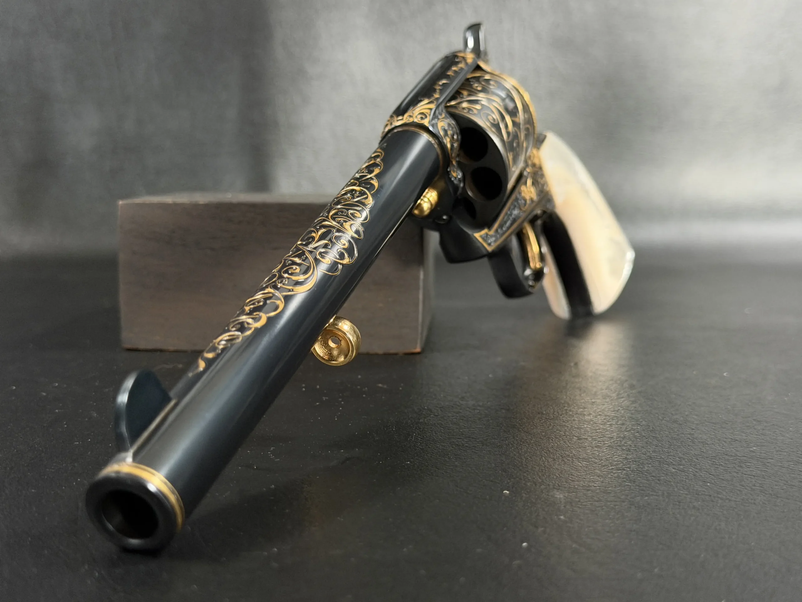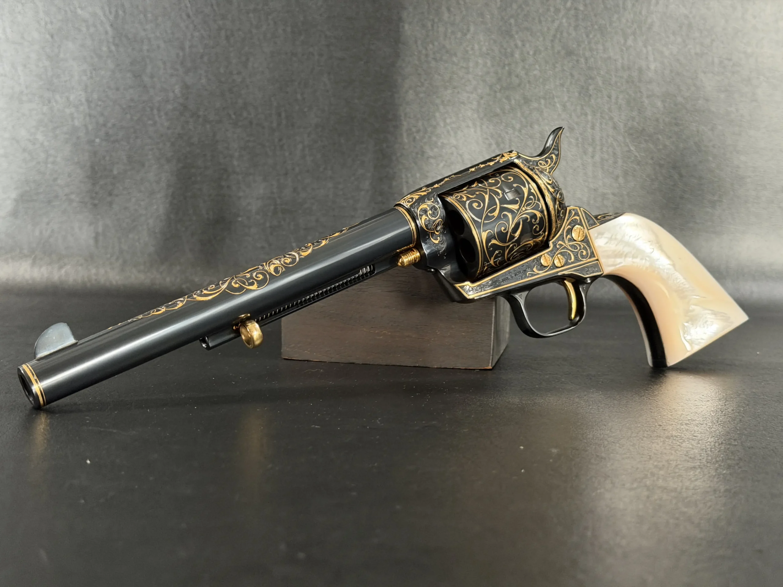 A one-piece smooth Mother-of-Pearl grip complements the overall presentation, and gold-finished screws and accents tie the design together throughout the revolver.