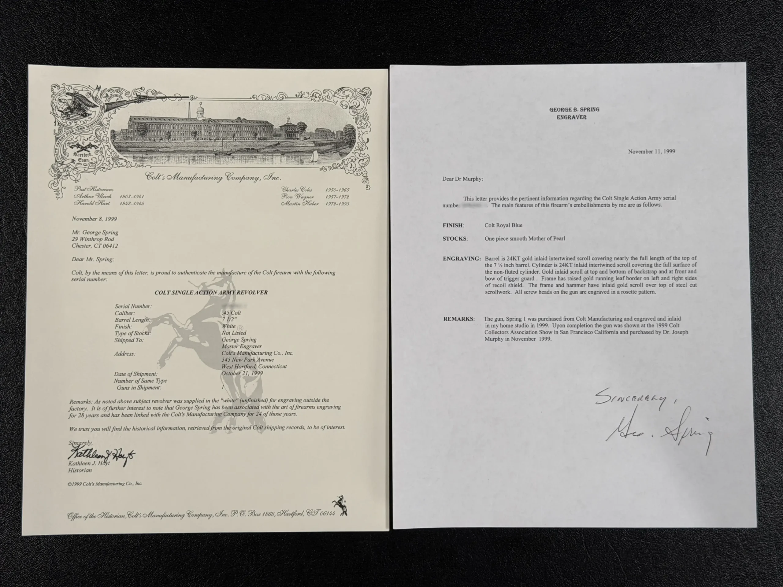 For collectors of Colt Single Action Army revolvers, this is a well-documented George B. Spring engraved 3rd Generation example that brings together Colt Custom Shop presentation, gold inlay, and accompanying factory and engraver documentation.